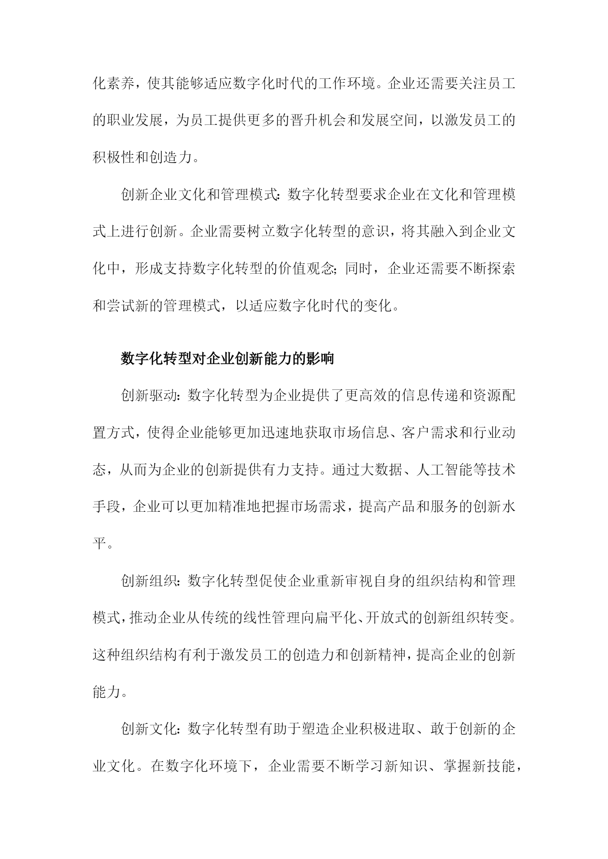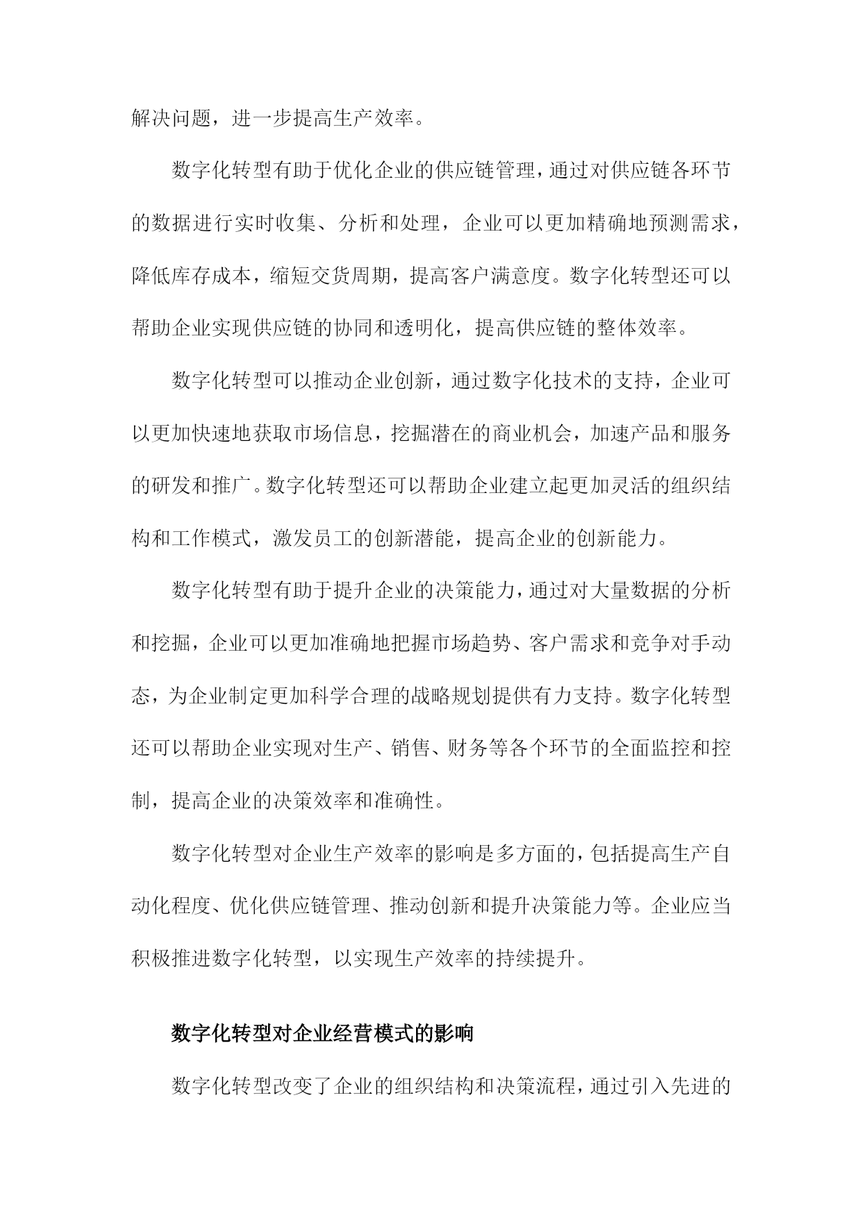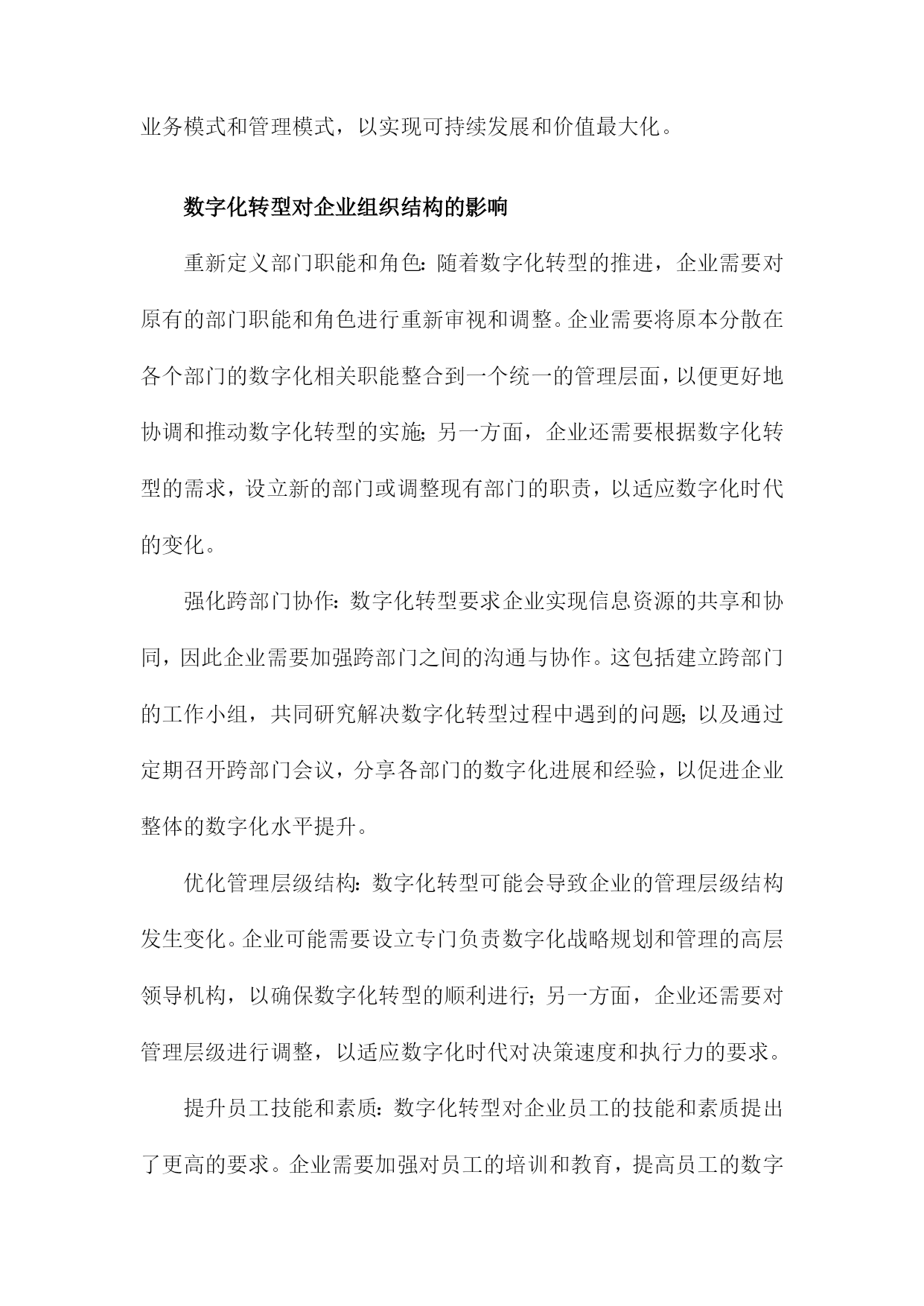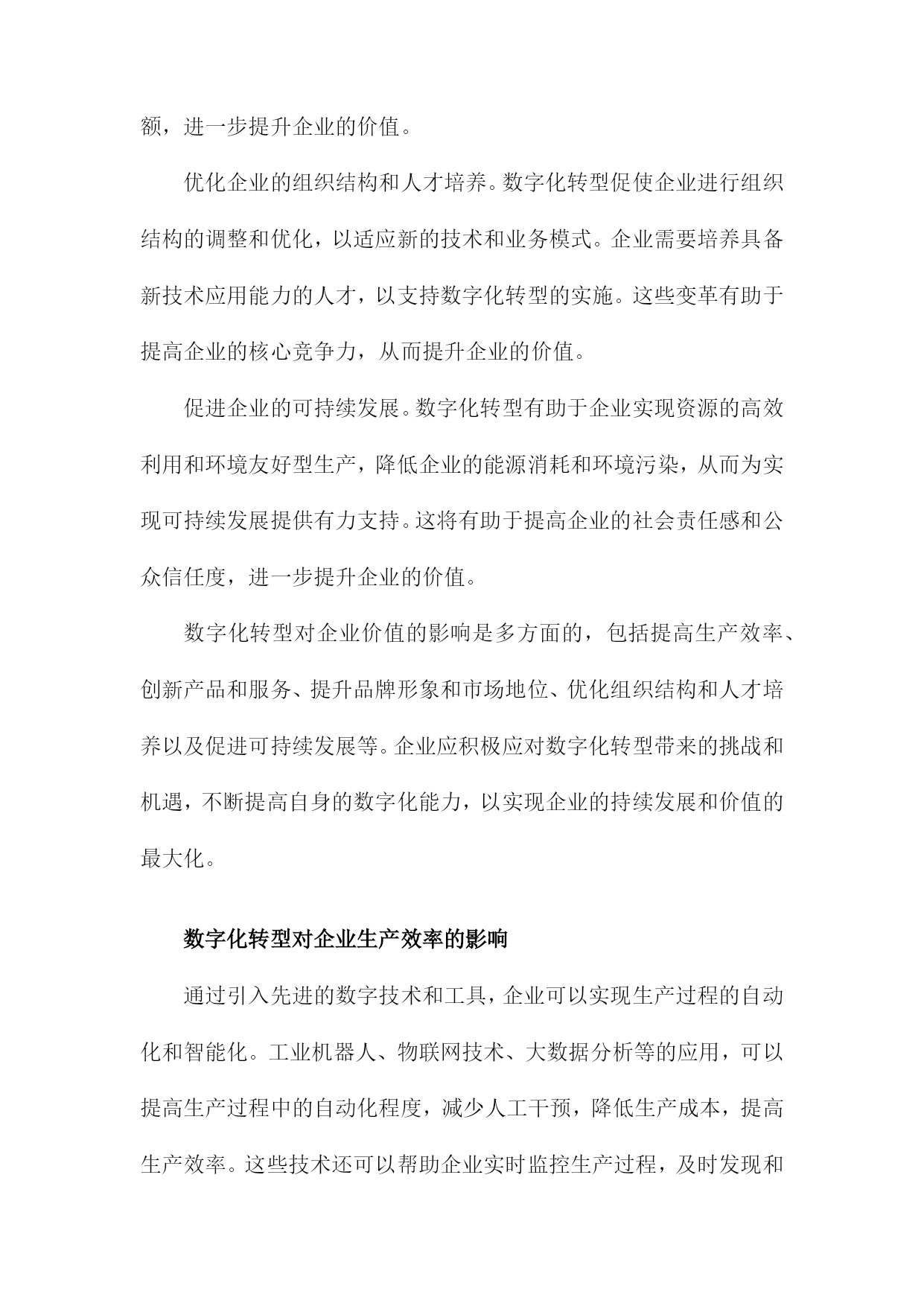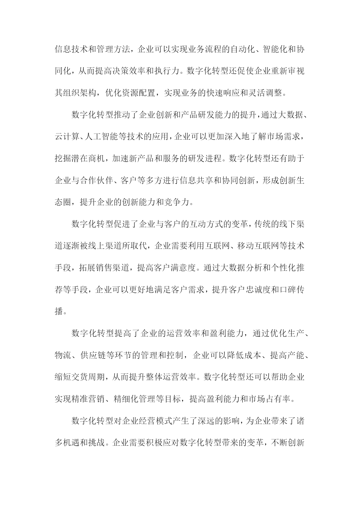 数字化转型对企业价值的影响及提升机制一、数字化转型的概念和意义随着科技的飞速发展,数字化已经成为企业发展的重要驱动力。数字化转型是指企业通过运用数字技术,对企业的组织结构、业务流程、产品和服务进行全面升级和改造,以提高企业的竞争力和市场地位。数字化转型不仅仅是技术的变革,更是一种深刻的组织变革和创新,它将对企业的价值创造、运营效率、客户体验等方面产生深远的影响。数字化转型有助于企业实现从传统价值创造模式向数字化价值创造模式的转变。通过运用大数据、人工智能等先进技术,企业可以更好地挖掘潜在客户需求,优化产品设计和生产过程,提高产品质量和性能,从而实现更高的价值创造。数字化转型可以帮助企业实现业务流程的自动化和智能化,降低人力成本,提高工作效率。通过引入物联网技术,企业可以实现设备的远程监控和管理,减少设备故障率;通过采用云计算和边缘计算技术,企业可以实现数据存储和处理的高效化,缩短决策时间。数字化转型使企业能够更加精准地了解客户需求,提供个性化的产品和服务。通过大数据分析和人工智能技术,企业可以实时收集和分析客户行为数据,为客户提供更加精准的推荐服务;通过移动互联网技术和社交媒体平台,企业可以与客户建立更加紧密的互动关系,提高客户满意度和忠诚度。数字化转型有助于企业形成以数据为核心的创新文化,激发员工的创新潜能。通过建立创新实验室和孵化器,企业可以吸引更多的创新人才,推动新技术、新产品的研发和应用;通过与其他企业和研究机构的合作,企业可以加速技术创新和市场拓展,提高企业的竞争力。数字化转型对企业的价值创造具有重要的意义,企业需要紧跟科技发展的步伐,积极推动数字化转型,以实现可持续发展和竞争优势。数字化转型的定义和背景数字化转型是指企业利用数字技术和创新的业务模式,对组织、业务流程和价值创造方式进行深刻变革的过程。随着信息技术的飞速发展,特别是互联网、大数据、人工智能等新兴技术的广泛应用,企业面临着巨大的竞争压力和市场机遇。为了应对这些挑战,实现持续创新和竞争优势,越来越多的企业开始关注并积极推进数字化转型。数字化转型是企业在新时代背景下,利用数字技术和创新业务模式实现自身价值创造的重要途径。通过深入研究数字化转型的定义和背景,企业可以更好地把握发展趋势,制定合适的战略规划和实施措施,从而实现可持续发展和竞争优势。数字化转型的意义和影响随着科技的飞速发展,数字化转型已经成为企业发展的必然趋势。数字化转型不仅意味着企业利用数字技术和信息系统来改进业务流程、提高生产效率和创新能力,而且还涉及到企业文化、组织结构和管理方式的全面变革。在当前的市场环境中,成功的企业往往能够迅速适应这一变革,实现数字化转型,从而获得持续的竞争优势。数字化转型有助于提高企业的运营效率,通过引入先进的信息技术和管理方法,企业可以实现生产、销售、供应链等各个环节的自动化和智能化,从而降低成本、缩短周期、提高质量。数字化转型还可以帮助企业更好地分析和预测市场变化,以便及时调整战略和资源配置,确保企业在市场竞争中始终保持领先地位。数字化转型有助于提升企业的创新能力,通过数字技术的应用,企业可以更加方便地获取和分析海量的数据,从而为产品研发、市场营销、客户服务等各个环节提供有力支持。数字化转型还可以促进企业内部知识的共享和传播,激发员工的创新意识和能力,为企业创造更多的价值。数字化转型有助于优化企业的组织结构和管理模式,在数字化转型的过程中,企业需要对传统的组织架构进行调整和优化,以适应新的业务需求和技术环境。这不仅可以提高企业的决策效率和执行力,还可以激发员工的工作积极性和创造力,从而提升整体的企业竞争力。数字化转型有助于塑造企业的新型文化,在数字化时代,企业需要树立一种以创新、协作、开放为核心价值的企业文化,以便吸引和留住优秀的人才,激发团队的凝聚力和战斗力。企业还需要不断学习和掌握新的数字技能,以便更好地应对未来的挑战和机遇。数字化转型对于企业具有重要的意义和深远的影响,企业应当抓住这一历史性的机遇,积极推进数字化转型,以实现可持续发展和竞争优势的不断提升。二、数字化转型对企业价值的影响提高企业的生产效率和运营效率。通过引入先进的信息技术和管理方法,企业可以实现生产过程的自动化和智能化,从而提高生产效率。数字化转型可以帮助企业优化管理流程,降低运营成本,提高企业的运营效率。创新产品和服务。数字化转型使企业能够更好地了解客户需求,通过大数据分析和人工智能等技术手段,不断创新产品和服务,提升企业的竞争力,从而提高企业的价值。提升企业的品牌形象和市场地位。数字化转型可以帮助企业建立更加现代化、专业化的形象,提升企业在市场上的品牌知名度和美誉度。通过线上线下的融合,企业可以拓展更广泛的市场,提高市场份额,进一步提升企业的价值。