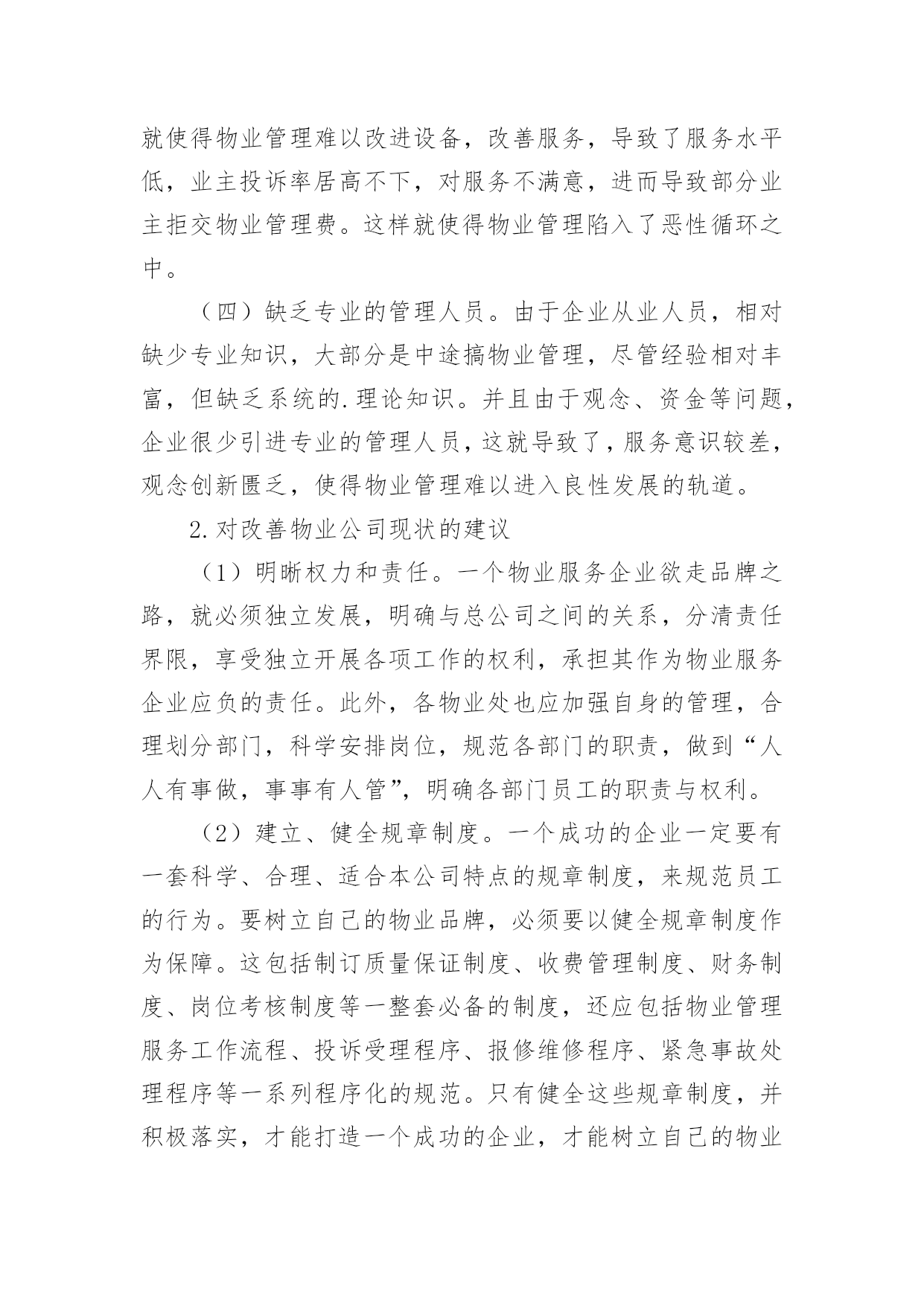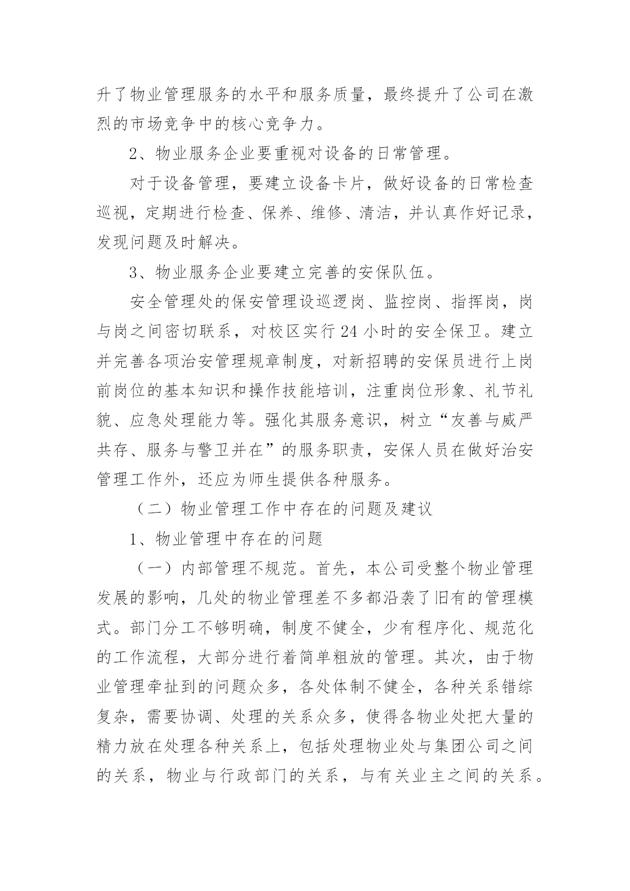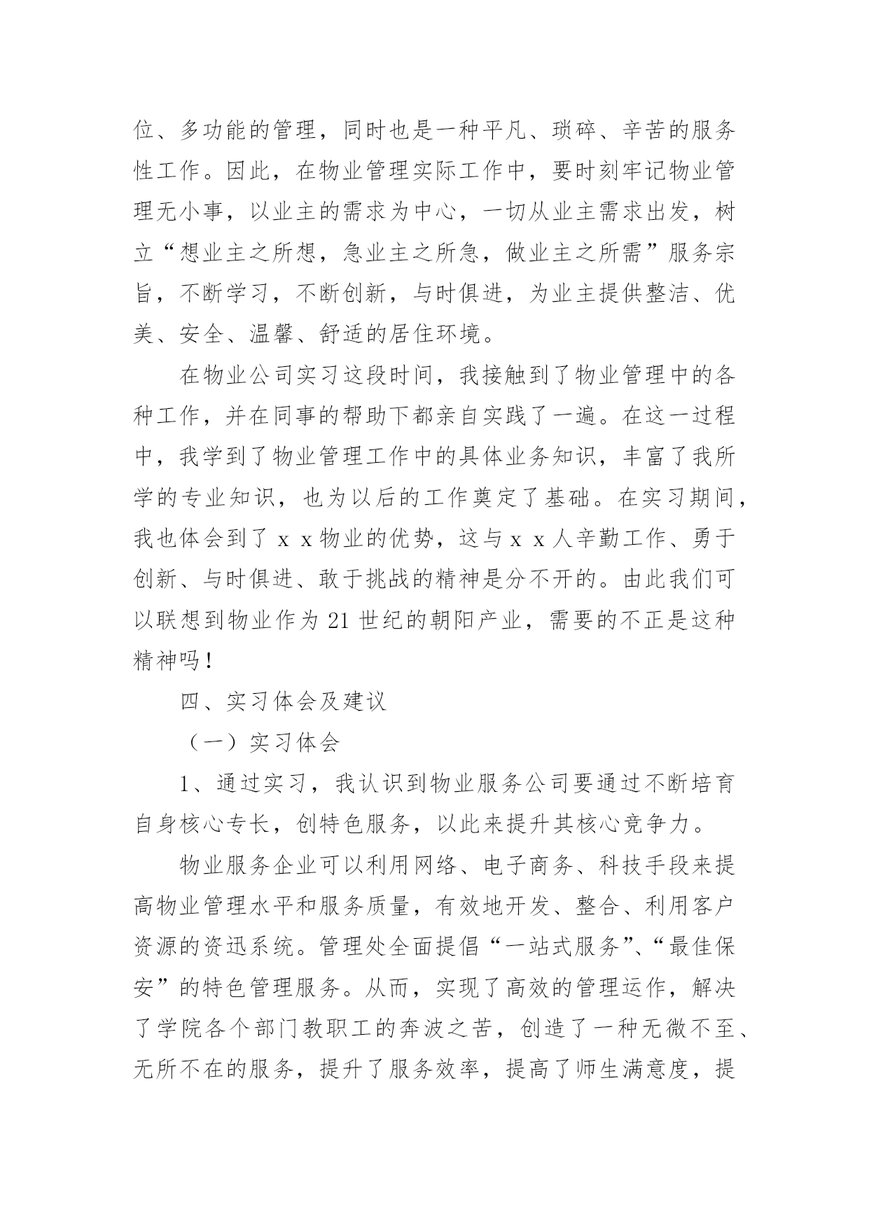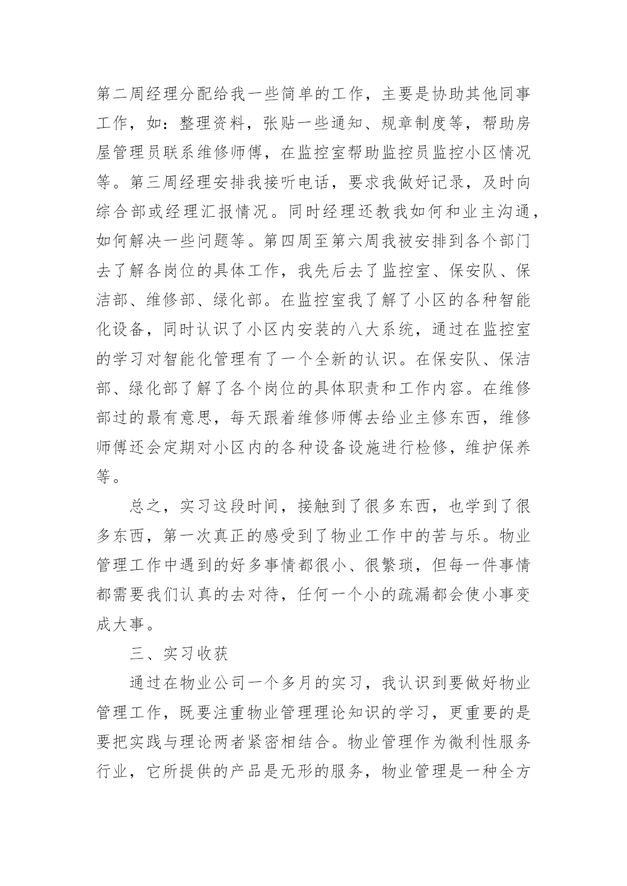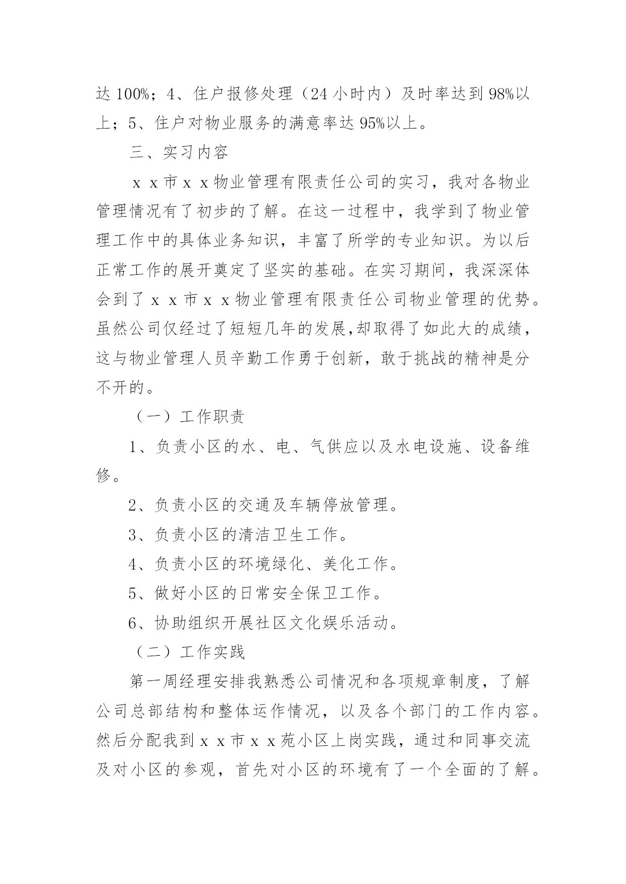 工商管理实习报告工商管理实习报告在人们越来越注重自身素养的今天,报告使用的频率越来越高,多数报告都是在事情做完或发生后撰写的。一听到写报告就拖延症懒癌齐复发?以下是小编帮大家整理的工商管理实习报告,欢迎大家分享。工商管理实习报告1一、实习目的毕业实习是每个学生必须拥有的一段经历,它使我们在实践中了解社会,让我们学到了很多在课堂上根本就学不到的知识,受益匪浅,也打开了视野,增长了见识,使我认识到将所学的知识具体应用到工作中去,就会为我们以后进一步走向社会打下坚实的基础,只有在实习期间尽快调整好自己的学习方式,适应社会,才能被这个社会所接纳,进而生存发展。通过本次实习,我正确认识了单位和个人的地位以及发展方向,我相信只要我们立足于现实,改变和调整看问题的角度,锐意进取,在成才的道路上不断攀登,有朝一日,那些成才的机遇就会纷至沓来,促使我们成为世界公认的人才。二、实习单位简介xx市xx物业管理有限责任公司成立于20xx年,注册资金50万元人民币,具有三级物业管理资质的企业。经营范围以物业管理服务为主,兼营房屋楼宇代理租售及其它各种有偿管理服务。xx市物业管理有限责任公司始终坚持以“三服务、四育人”为宗旨,树立“勤奋务实,开拓创新,以人为本,规范服务”的管理经营理念,培养了一支精业务、高效率的服务队伍,建立了规范运行、优质服务的管理机制。公司设有办公室、财务部、工程修维部、保安部、清洁绿化部、市场开发部等七个工作部,现有人工88人,其中:有中级以上技术职称人员5人,持有全国物业管理岗位证书人员5人,其他管理人员均有初级以上技术职称。xx市xx物业管理有限责任公司是一个观念新、机制灵、有实力、操作规范、管理模式先进、追求企业文化内涵的现代化物业管理公司,公司着重塑造时代精神,培养和造就一个团结、自律、向上、富有战斗力的一流员工队伍。公司现已管理服务xx市内十几个小区:迎龙广场、福兴苑、桃源苑、金鼎世家小区等,管理面积达二十余万平方米,经过不断的摸索形成了一套行之有效物业管理规模式。公司现正在努力开发新市场,延伸服务广西各县市小区的物业管理。公司宗旨:开发商的好帮手,业主的好管家。质量方针:优质服务、规范管理、开拓创新、树立品牌。公司理念:贴心服务每一天。公司目标:1、管辖区内不发生重大安全责任事故(失职或玩忽职守引发火灾、水浸、员工工作中的伤亡事故);2、管理人员持证上岗率达到100%;3、员工上岗培训合格率达100%;4、住户报修处理(24小时内)及时率达到98%以上;5、住户对物业服务的满意率达95%以上。三、实习内容xx市xx物业管理有限责任公司的实习,我对各物业管理情况有了初步的了解。在这一过程中,我学到了物业管理工作中的具体业务知识,丰富了所学的专业知识。为以后正常工作的展开奠定了坚实的基础。在实习期间,我深深体会到了xx市xx物业管理有限责任公司物业管理的优势。虽然公司仅经过了短短几年的发展,却取得了如此大的成绩,这与物业管理人员辛勤工作勇于创新,敢于挑战的精神是分不开的。(一)工作职责1、负责小区的水、电、气供应以及水电设施、设备维修。2、负责小区的交通及车辆停放管理。3、负责小区的清洁卫生工作。4、负责小区的环境绿化、美化工作。5、做好小区的日常安全保卫工作。6、协助组织开展社区文化娱乐活动。(二)工作实践第一周经理安排我熟悉公司情况和各项规章制度,了解公司总部结构和整体运作情况,以及各个部门的工作内容。然后分配我到xx市xx苑小区上岗实践,通过和同事交流及对小区的参观,首先对小区的环境有了一个全面的了解。第二周经理分配给我一些简单的工作,主要是协助其他同事工作,如:整理资料,张贴一些通知、规章制度等,帮助房屋管理员联系维修师傅,在监控室帮助监控员监控小区情况等。第三周经理安排我接听电话,要求我做好记录,及时向综合部或经理汇报情况。同时经理还教我如何和业主沟通,如何解决一些问题等。第四周至第六周我被安排到各个部门去了解各岗位的具体工作,我先后去了监控室、保安队、保洁部、维修部、绿化部。在监控室我了解了小区的各种智能化设备,同时认识了小区内安装的八大系统,通过在监控室的学习对智能化管理有了一个全新的认识。在保安队、保洁部、绿化部了解了各个岗位的具体职责和工作内容。在维修部过的最有意思,每天跟着维修师傅去给业主修东西,维修师傅还会定期对小区内的各种设备设施进行检修,维护保养等。总之,实习这段时间,接触到了很多东西,也学到了很多东西,第一次真正的感受到了物业工作中的苦与乐。物业管理工作中遇到的好多事情都很小、很繁琐,但每一件事情都需要我们认真的去对待,任何一个小的疏漏都会使小事变成大事。三、实习收获通过在物业公司一个多月的实习,我认识到要做好物业管理工作,既要注重物业管理理论知识的学习,更重要的是要把实践与理论两者紧密相结
