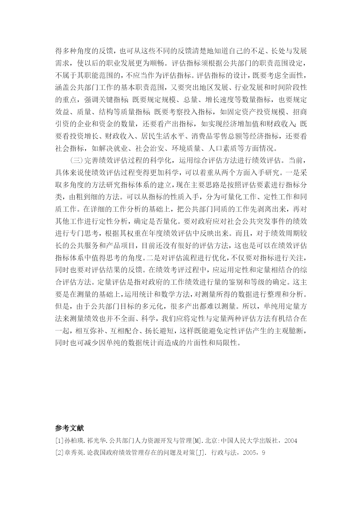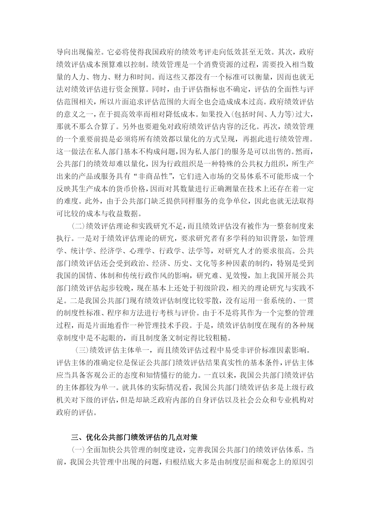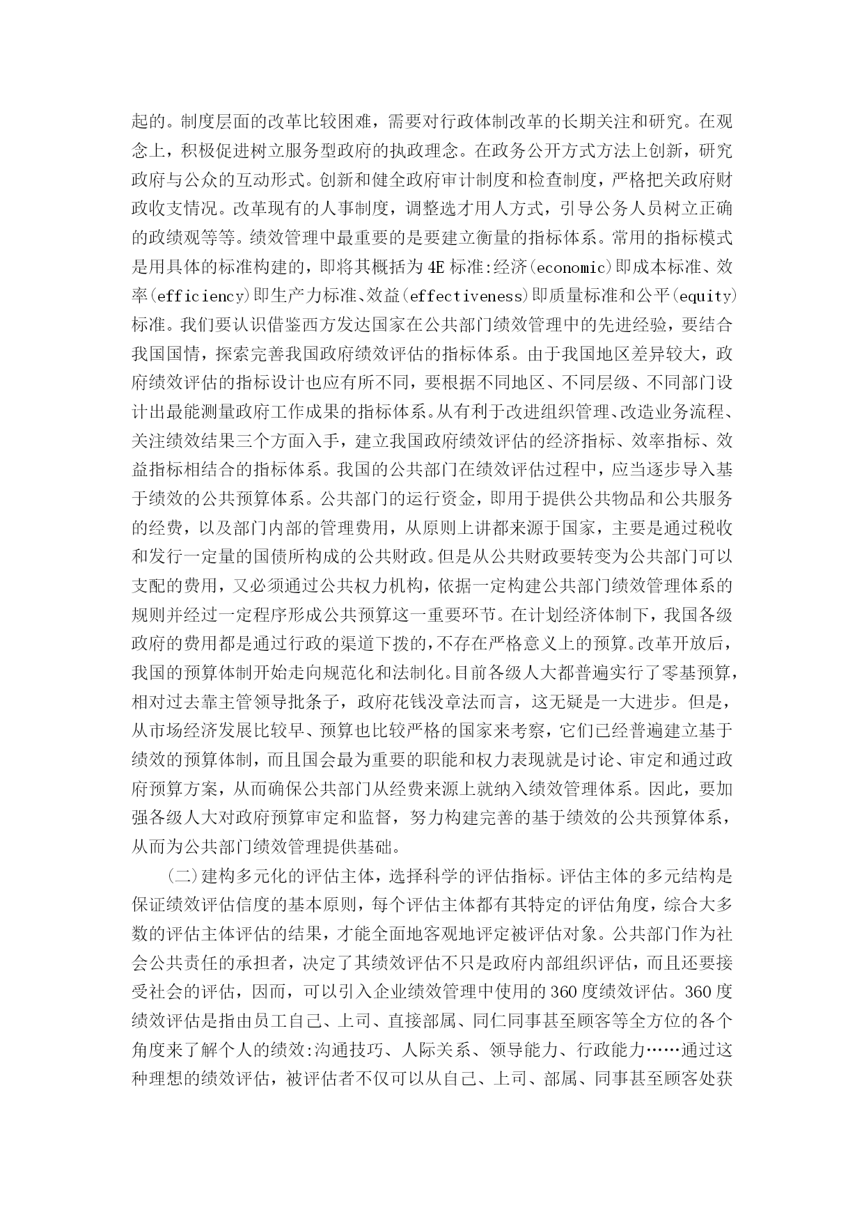 问题与对策,论我国公共部门绩效评估摘要:我国的公共部门绩效评估,是在改革开放以后正式引进的评估体系。随着公共部门绩效评估在我国的深入研究和运用,以及政府部门绩效评估框架的建立,我国的公共部门绩效评估无论在理论上还是实践中都取得了不少成果。但是仍然有很多问题需要我们去研究解决。从理论对实践的指导作用出发,本文对公共部门绩效评估目前亟需解决的几个大的问题进行研究,并提出了相应的解决思路,以期对绩效评估的研究有所帮助。关键词:公共部门;绩效评估;评估指标一、公共部门绩效评估的发展及趋势公共部门的绩效评估和绩效管理始于20世纪50年代美国的绩效预算制度。20世纪70年代以来,西方国家普遍开展的“新公共管理运动”使绩效管理在政府管理中得到广泛的应用。20世纪80年代中期,西方国家为应对科学技术的迅速发展、全球化和国际竞争日益加剧的环境条件,为解决财政赤字,树立公共部门为公众服务的形象,普遍采取了以公共责任和顾客至上为理念的公共部门绩效评估改革措施。20世纪90年代公共部门的绩效评估得到较为全面的发展。我国自改革开放以来,行政管理体制改革也逐步展开。为了建设廉洁高效的政府管理模式,绩效评估也引起了公共部门的高度重视。简单地说,政府绩效评估就是某评估主体对某政府或政府机构工作成绩效率的基本评价和判断。它是一种有效的政府管理方法。随着绩效评估理念的不断完善,公共部门绩效评估内容呈现出如下发展趋势:(1)坚持公民导向;(2)逐步走向制度化、法制化;(3)主体多元化、技术不断成熟;(4)评估的理念、方法和技术向世界各主要发达国家扩展。二、公共部门绩效评估存在的问题我国公共部门绩效管理在理论和实践上取得了一定的成绩,但也显露出一些问题,值得我们关注与思考。(一)公共部门绩效评估标准和绩效评估成本、产出难以量化。首先,反映行政官员自身素质和自我修养的一些因素,是定性程度较高、相对难以量化的内容,需要细分到一定的程度,才可能较为客观地反映实际情况。如果行政官员注重组织内部“团结”,那么即使他在各个方面都表现平平甚至不合格,他还是会得高分;而如果他在这方面做得不好,那么即使他在实质上各方面都非常优秀,他还是无法得到相应的分数,甚至可能成为利益角逐的牺牲品。可见,这种难以量化的特征产生了两个重要的具体问题:(1)高度的主观随意性;(2)行政官员的行为导向出现偏差。它必将使得我国政府的绩效考评走向低效甚至无效。其次,政府绩效评估成本预算难以控制。绩效管理是一个消费资源的过程,需要投入相当数量的人力、物力、财力和时间。而这些又都没有一个标准可以衡量,因而也就无法对绩效评估进行资金预算。同时,由于评估指标也不确定,评估的全面性与评估范围相关,所以片面追求评估范围的大而全也会造成成本过高。政府绩效评估的意义之一,在于提高效率而相对降低成本。如果投入(包括时间、人力等)过大,那就不那么合算了。另外也要避免对政府绩效评估内容的泛化。再次,绩效管理的一个重要前提是必须将所有绩效都以量化的方式呈现,再据此进行绩效管理。这一做法在私人部门基本不构成问题,因为私人部门的服务是可以出售的。然而,公共部门的绩效却难以量化,因为行政组织是一种特殊的公共权力组织,所生产出来的产品或服务具有“非商品性”,它们进入市场的交易体系不可能形成一个反映其生产成本的货币价格,因而对其数量进行正确测量在技术上还存在着一定的难度。此外,由于公共部门缺乏提供同样服务的竞争单位,因此也就无法取得可比较的成本与收益数据。(二)绩效评估理论和实践研究不足,而且绩效评估没有被作为一整套制度来执行。一是对于绩效评估理论的研究,要求研究者有多学科的知识背景,如管理学、统计学、经济学、心理学、行政学、法学等,对研究人才的要求很高。公共部门绩效评估还会受到政治、经济、历史、文化等多种因素的制约,特别是受到我国的国情、体制和传统行政作风的影响,研究难、见效慢,加上我国开展公共部门绩效评估起步较晚,现在基本上还处于初级阶段,相关的理论研究与实践不足。二是我国公共部门现有绩效评估制度比较零散,没有运用一套系统的、一贯的制度性标准、程序和方法进行考核与评价。由于不是将其作为一个完整的管理过程,而是片面地看作一种管理技术手段。于是,绩效评估制度在现有的各种规章制度中是不起眼的,而且制度条文制定得比较粗糙。(三)绩效评估主体单一,而且绩效评估过程中易受非评价标准因素影响。评估主体的准确定位是保证公共部门绩效评估结果真实性的基本条件,评估主体应当具备客观公正的态度和知情懂行的能力。一直以来,我国公共部门绩效评估的主体都较为单一。就具体的实际情况看,我国公共部门绩效评估多是上级行政机关对下级的评估,但是却缺乏政府内部的自身评估以及社会公众和专业机构对政府的评估。三、优化公共部门绩效评估的几点对策(一)全