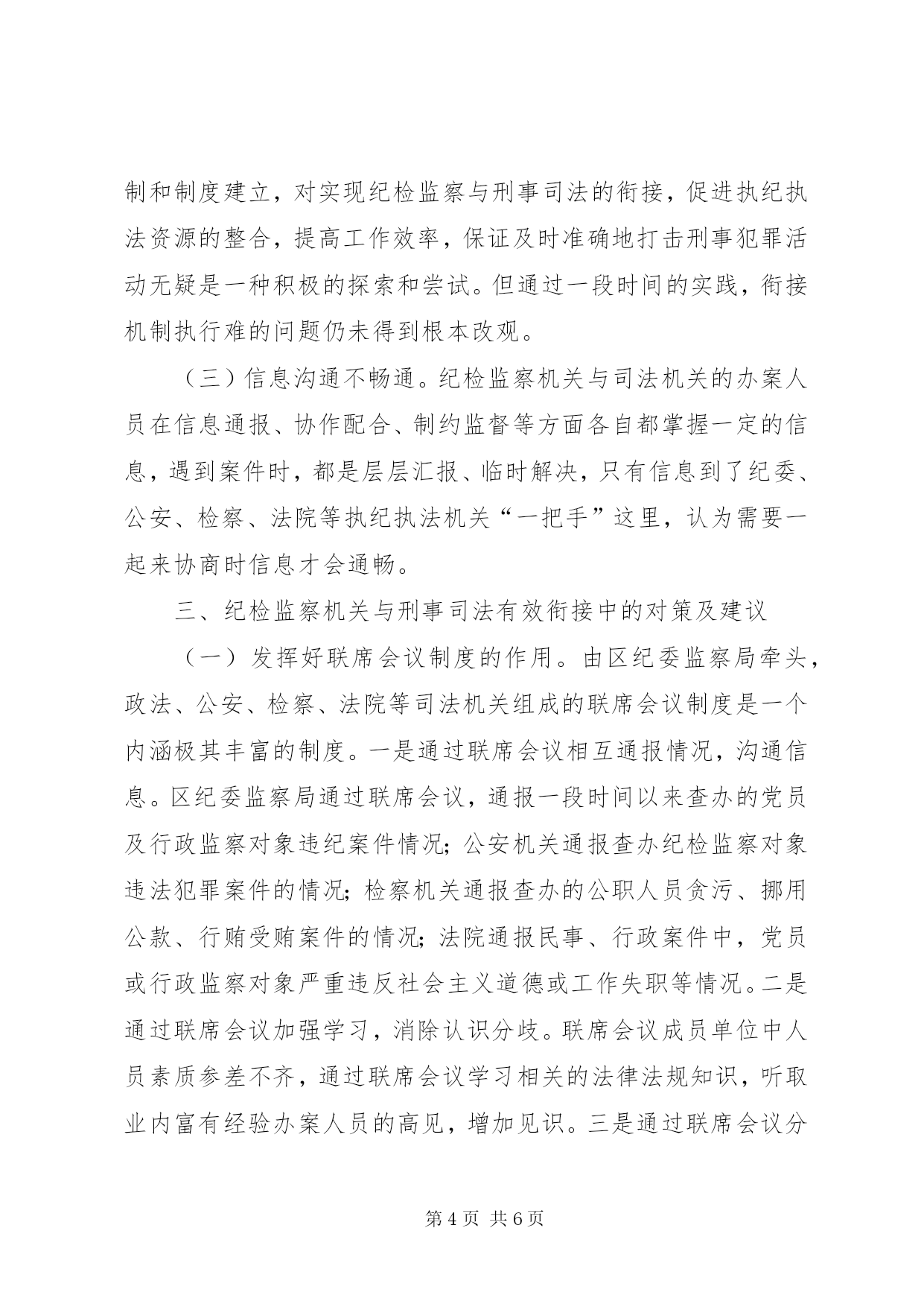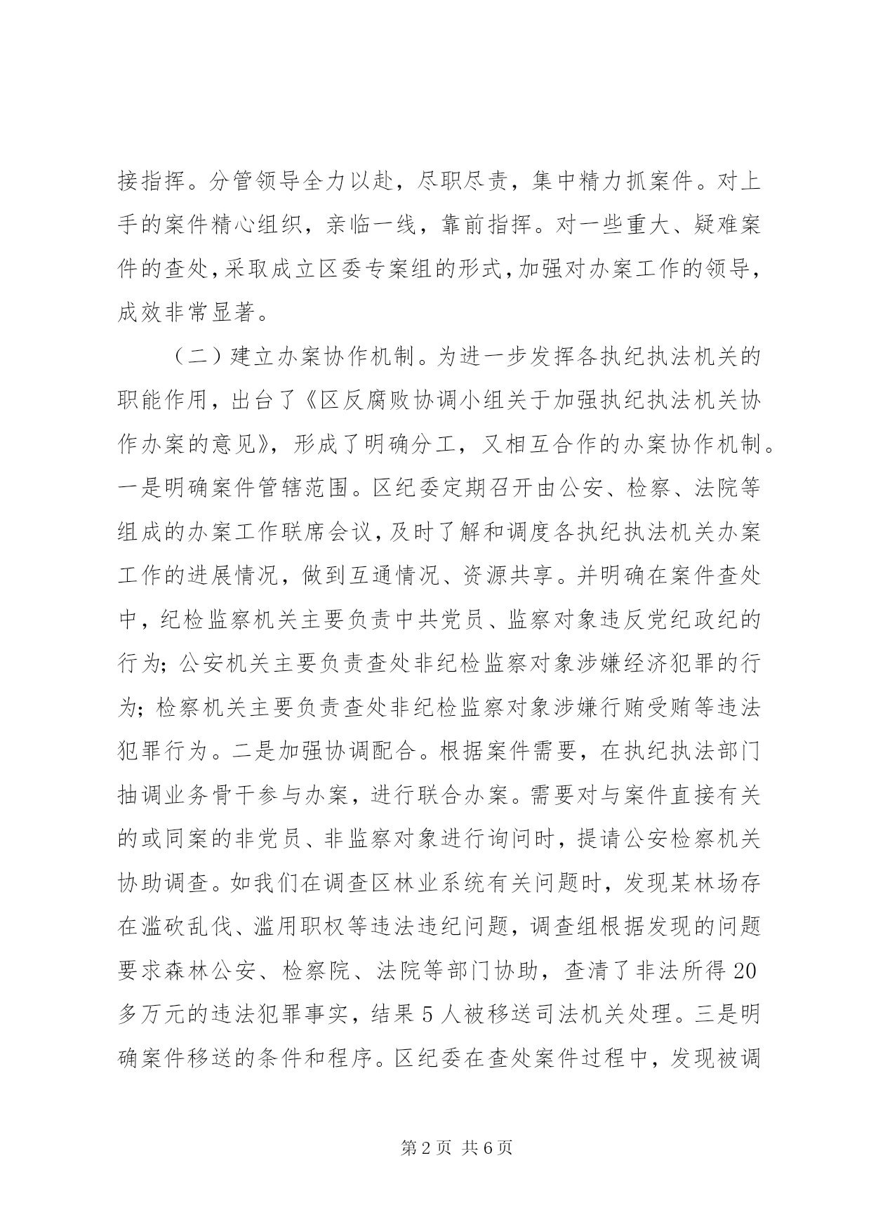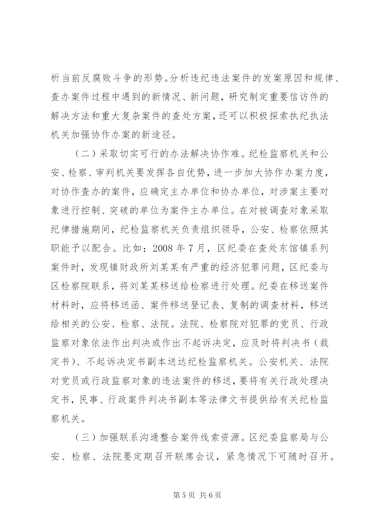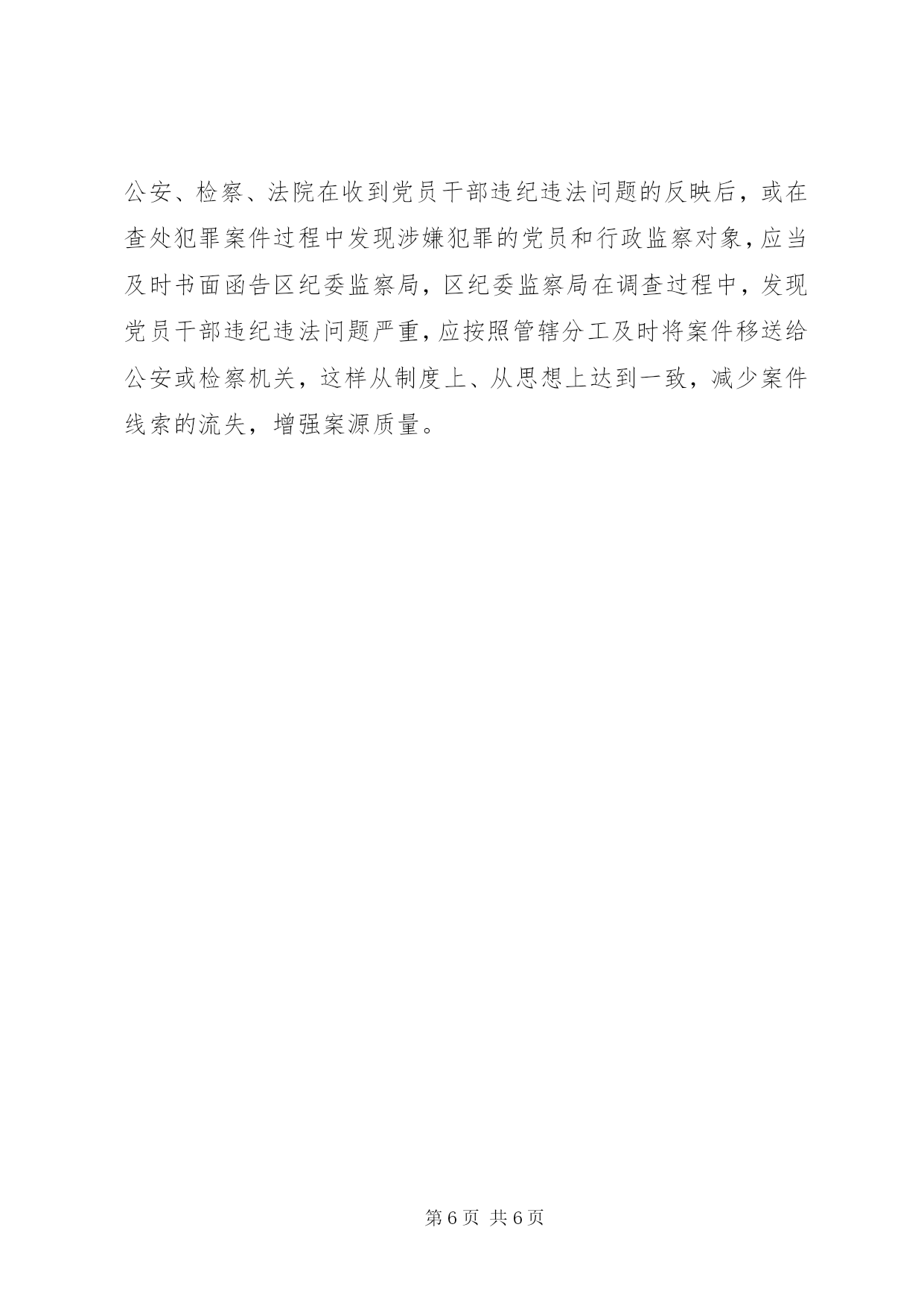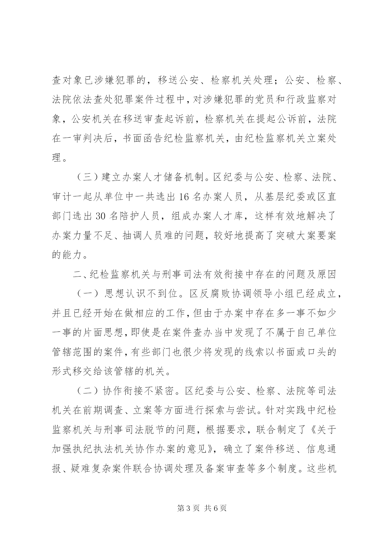 第PAGE\*Arabic\*MERGEFORMAT6页共NUMPAGES\*MERGEFORMAT6页刑事司法与纪检监察情况报告近年来,我区纪检监察机关按照中央纪委、省市纪委的有关要求,进一步加大了与公安、检察、法院的衔接力度,查办了一批有影响的大案要案,并与公安、检察、法院等部门联合制定了有关联合办案的制度,可以说已经初步构成了纪检监察机关执纪与刑事司法相衔接的机制,增强了查办违纪违法犯罪的力度和效果。但是,我们也清醒地认识到,当前纪检监察与刑事司法衔接过程中仍存在诸多问题,我们应该积极研究有效措施,不断完善纪检监察与司法机关的协作机制。下面分三个方面内容来谈点个人的见解:一、纪检监察机关与刑事司法有效衔接中的主要做法(一)建立办案领导机制。近年来,我区在查办大要案过程中,及时向区委、区政府汇报办案工作情况,主动争取党委、政府的重视和支持。成立了以区委书记叶建青任组长、区委常委、纪委书记吴勇为副组长,公安、检察、法院、政法、审计、司法等相关单位为成员的区党风廉政建设及反腐败工作领导小组和以区委常委、纪委书记吴勇任组长、区委常委、组织部长吴茂发、区委常委、政法委书记邹裕明,区委常委、公安分局长刘向东三人为副组长,法院、检察、区纪委分管案件的领导为成员的区反腐败协调小组。纪委、公安、检察、法院主要领导亲自抓办案,定期分析办案工作情况,对一些重点案件的查处,亲自组织,直接指挥。分管领导全力以赴,尽职尽责,集中精力抓案件。对上手的案件精心组织,亲临一线,靠前指挥。对一些重大、疑难案件的查处,采取成立区委专案组的形式,加强对办案工作的领导,成效非常显著。(二)建立办案协作机制。为进一步发挥各执纪执法机关的职能作用,出台了《区反腐败协调小组关于加强执纪执法机关协作办案的意见》,形成了明确分工,又相互合作的办案协作机制。一是明确案件管辖范围。区纪委定期召开由公安、检察、法院等组成的办案工作联席会议,及时了解和调度各执纪执法机关办案工作的进展情况,做到互通情况、资源共享。并明确在案件查处中,纪检监察机关主要负责中共党员、监察对象违反党纪政纪的行为;公安机关主要负责查处非纪检监察对象涉嫌经济犯罪的行为;检察机关主要负责查处非纪检监察对象涉嫌行贿受贿等违法犯罪行为。二是加强协调配合。根据案件需要,在执纪执法部门抽调业务骨干参与办案,进行联合办案。需要对与案件直接有关的或同案的非党员、非监察对象进行询问时,提请公安检察机关协助调查。如我们在调查区林业系统有关问题时,发现某林场存在滥砍乱伐、滥用职权等违法违纪问题,调查组根据发现的问题要求森林公安、检察院、法院等部门协助,查清了非法所得20多万元的违法犯罪事实,结果5人被移送司法机关处理。三是明确案件移送的条件和程序。区纪委在查处案件过程中,发现被调查对象已涉嫌犯罪的,移送公安、检察机关处理;公安、检察、法院依法查处犯罪案件过程中,对涉嫌犯罪的党员和行政监察对象,公安机关在移送审查起诉前,检察机关在提起公诉前,法院在一审判决后,书面函告纪检监察机关,由纪检监察机关立案处理。(三)建立办案人才储备机制。区纪委与公安、检察、法院、审计一起从单位中一共选出16名办案人员,从基层纪委或区直部门选出30名陪护人员,组成办案人才库,这样有效地解决了办案力量不足、抽调人员难的问题,较好地提高了突破大案要案的能力。二、纪检监察机关与刑事司法有效衔接中存在的问题及原因(一)思想认识不到位。区反腐败协调领导小组已经成立,并且已经开始在做相应的工作,但由于办案中存在多一事不如少一事的片面思想,即使是在案件查办当中发现了不属于自己单位管辖范围的案件,有些部门也很少将发现的线索以书面或口头的形式移交给该管辖的机关。(二)协作衔接不紧密。区纪委与公安、检察、法院等司法机关在前期调查、立案等方面进行探索与尝试。针对实践中纪检监察机关与刑事司法脱节的问题,根据要求,联合制定了《关于加强执纪执法机关协作办案的意见》,确立了案件移送、信息通报、疑难复杂案件联合协调处理及备案审查等多个制度。这些机制和制度建立,对实现纪检监察与刑事司法的衔接,促进执纪执法资源的整合,提高工作效率,保证及时准确地打击刑事犯罪活动无疑是一种积极的探索和尝试。但通过一段时间的实践,衔接机制执行难的问题仍未得到根本改观。(三)信息沟通不畅通。纪检监察机关与司法机关的办案人员在信息通报、协作配合、制约监督等方面各自都掌握一定的信息,遇到案件时,都是层层汇报、临时解决,只有信息到了纪委、公安、检察、法院等执纪执法机关“一把手”这里,认为需要一起来协商时信息才会通畅。三、纪检监察机关与刑事司法有效衔接中的对策及建议(一)发挥好联席会议制度的作用。由区纪委监察局牵头,政法、公安、检察、法院等司法机关组成的联席会议制度是一个内涵极其丰富的制度。