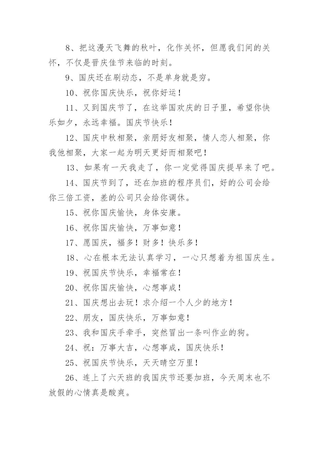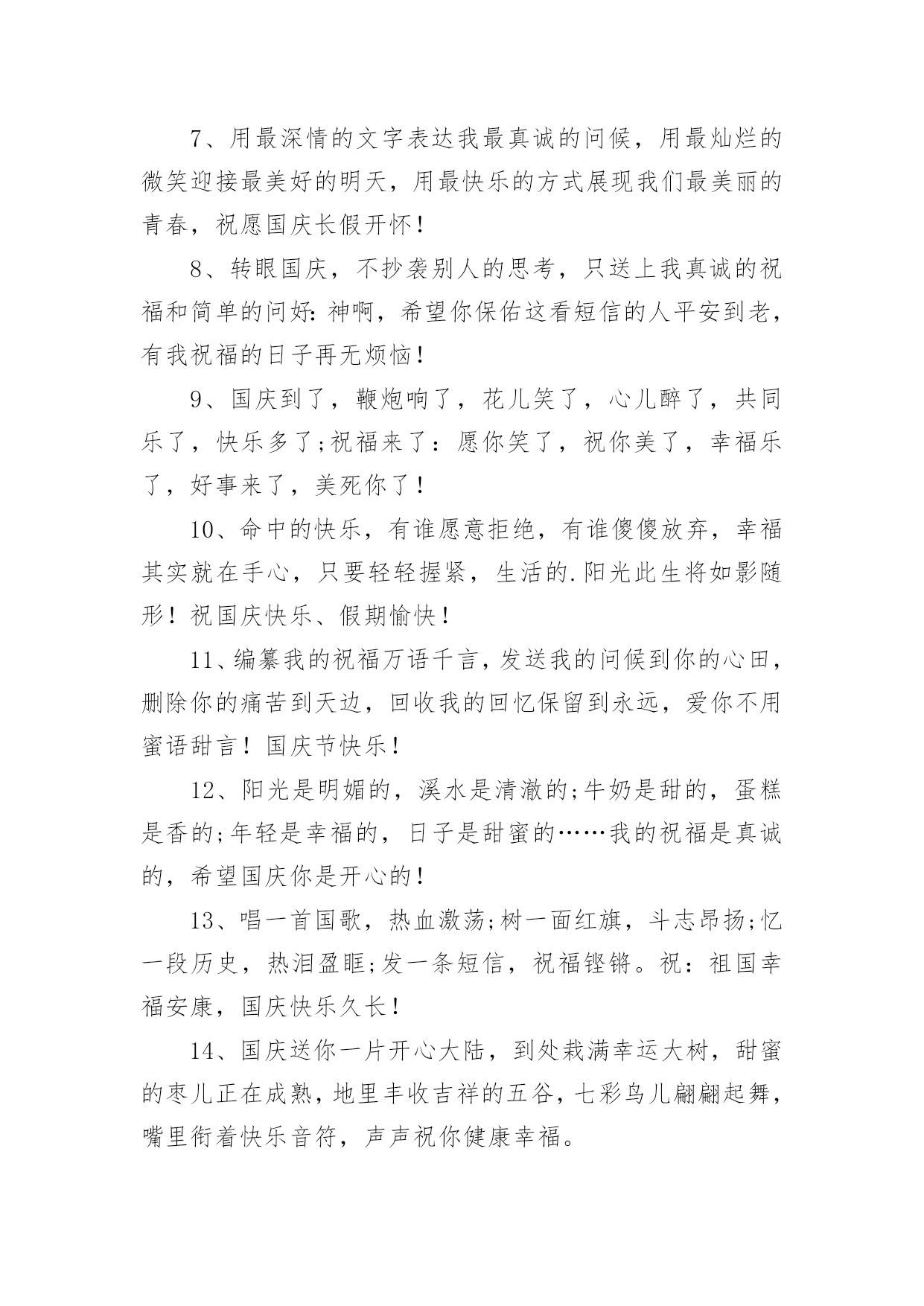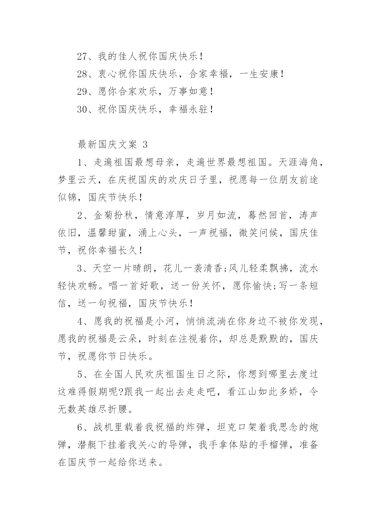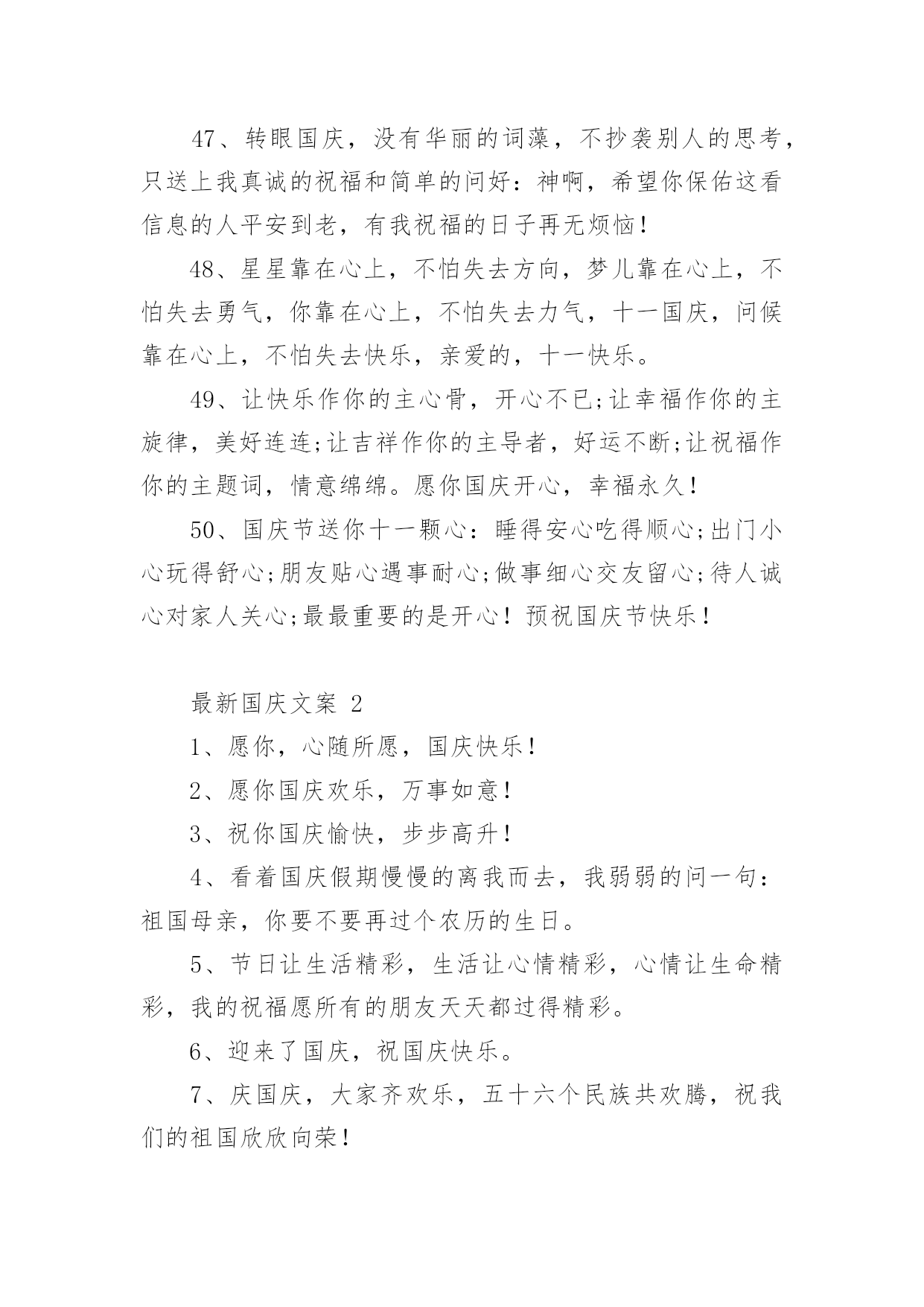 最新国庆文案最新国庆文案(精选205句)随着社交网络的普遍使用,越来越多人钟情于在朋友圈发布文案,文案用于跟亲朋好友分享个人生活情况。那什么样的文案才是新颖独特的呢?以下是小编整理的最新国庆文案,仅供参考,欢迎大家阅读。最新国庆文案11、国庆到,送你一张吉祥信用卡:存入耕耘,提取收获;存入微笑,提取快乐;存入努力,提取成功;存入善良,提取好运;存入运动,提取健康;存入真心,提取友情。随你提取福运佳,信用额度无限大,愿你心情乐哈哈,一生绽放幸福花!祝大家国庆快乐!2、十月一日,庄严的国旗升起,十月一日,你我共庆祖国华诞,带上一份心愿,带上一份祝福,让国庆之日带给你喜悦,带给你幸福和快乐!3、自己开心是一种快乐,让别人开心是一种幸福。说服自己是一种快乐,感染别人是一种幸福。收到祝福是一种快乐,传递祝福是一种幸福。[2022]国庆快乐!4、国庆节假期八天长,应到户外去逛一逛;调整心态快乐无束,大自然中感受清风;吃吃美食来个几盅,快乐国庆无比轻松。5、特大喜讯,您的手机号码在我的通讯录名单国庆节特别抽奖活动中获得大奖,奖品是一份价值无限,举世无双,深情厚谊的祝福:国庆快乐,吃好玩好休息好!6、二十一世纪重要的是人才,国庆节最重要的是开怀,写给你的短信最重要是你能明白,我对你最深切的关爱。节日愉快。7、国庆到了,开心的锣鼓敲起来了,欢快的秧歌扭起来了;庄严的国旗升起来了,雄壮的国歌唱起来了;幸福的嘴角翘起来,喜庆的礼炮响起来了;欢聚的酒杯端起来,真挚的祝福发出来了:祝你国庆乐开怀,自在舒爽福无边!8、国庆长假眼看就要结束,挎上背包踏上返程之路,背包沉沉装满爸妈的嘱咐,离家的双脚沉重迈不开步,临行之前不忘祝福父母,愿爸妈身体健康快乐常驻!9、国庆天乐,天天都快乐,将这一个星期的快乐凝聚成力量与激情,投入到工作当中吧,适当的放松,是为了更好的劳动。愿你天天都快乐,我的朋友。10、淡照霜飞的是那一丝银菊,书写秋空的是那一片月华,温润心田的是那一抹恩爱,缘系今生的是那一世情缘。国庆佳节,盼望与你相聚!国庆快乐!11、喜迎国庆节,欢乐多一些,烦恼须告别,幸福来打劫,陪你逛大街,好运把脚捏,如意不松懈,争相讨好你。十一快乐!12、金秋时节,一片落叶代表健康,两片落叶代表快乐,三片落叶代表幸福,无数的落叶包围着你那是朋友无数的祝福,祝灿烂的笑容永远伴着你,国庆节快乐!13、秋风喜迎国庆节,舒展眉头度十一繁忙工作终得歇,劳累之余开心些出外走走散散心,在家休息换心情我用短信祝福你,天天快乐好心情!14、国庆长假共8天,祝你事业"发"达,爱情"发"达,人际"发"达,处处都"发"达,祝愿你心情8错,身体8错,运气8错,事事都8错!15、你听见了那首来自东方的歌了吗?庆国庆,大家齐欢乐,五十六个民族共欢腾,愿我们的祖国欣欣向荣!16、国庆节的号角吹响了,声声都带着我诚心的祝福。萦绕在你身边,祝您:日日平安,时时开心,分分快乐,秒秒幸福。欢度国庆节!17、骄傲的是,祖国65华诞之际,我们变强大了,经济在高速腾飞,生活在日益提高,和平在周围环绕,安居乐业,国泰民安,国庆节,我们有美好的理由欢笑!18、山河壮丽,岁月峥嵘!祝福我们的国家繁荣富强,祝福我们的生活步入小康,国庆节快乐。19、五星红旗迎风飘,十一国庆吉祥绕;真心祝福不能少,开心快乐打成包;幸福日子天天好,成功事业步步高;甜蜜爱情永到老,财运鸿运跟你跑。20、风往哪里吹,云就往哪里跑。叶往哪里落,树就往哪里望。你在哪里走,祝福就往哪里飘,今天是十一国庆节,愿祝福早日飘到你的身边,国庆快乐!21、最近好吗?还记得我们当初的约定吧?当时我们背靠背的坐在江边,而且还对天发誓:十一你请我吃饭。今天就是国庆节了,你不会想反悔吧?22、让烦恼,垂头丧气离去;让喜庆,春风和气绕你;让快乐,分形共气祝你;国庆节,舒心惬意无比,幸福甜蜜伴你!23、国庆已至,以粗茶淡饭养养胃,用清新空气洗洗肺,让灿烂阳光晒晒背,找群朋友喝个小醉,像小猪那个睡一睡,忘却辗转尘世的累,国庆节快乐!24、坐安卧稳过国庆,倚杖披衫访亲朋。空腹三杯卯后酒,曲肱一觉醉中眠。更无忙苦吟闲乐,恐是人间自在天。国庆节来了,祝各你国庆快乐,好好去游玩休闲一番。25、过国庆有五愿:国富民强少涨价,太平盛世多加薪,人心愉快身康健,风调雨顺皆祥泰,收到短信的人天天好事连连,家和万事兴!26、喜迎国庆十一来,笑看山河风雨过,回忆人生多曲折,畅想未来满欢乐,愿望终究会实现,梦想一定能成真,祝你十一欢欢乐乐过,幸幸福福一辈子。27、国庆长假未到,关怀提醒先来。记住三个少:酒少肉少熬夜要少;记住三个动:走动运动参加流动;记住三个多:笑多睡多轻松更多。愿假期舒服,节后见!28、国庆佳节,天高气爽