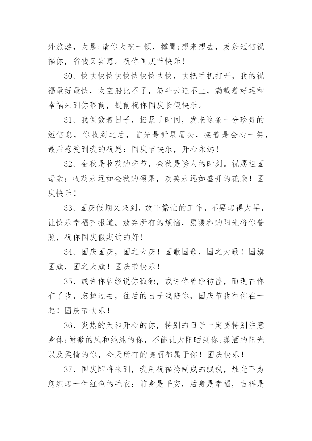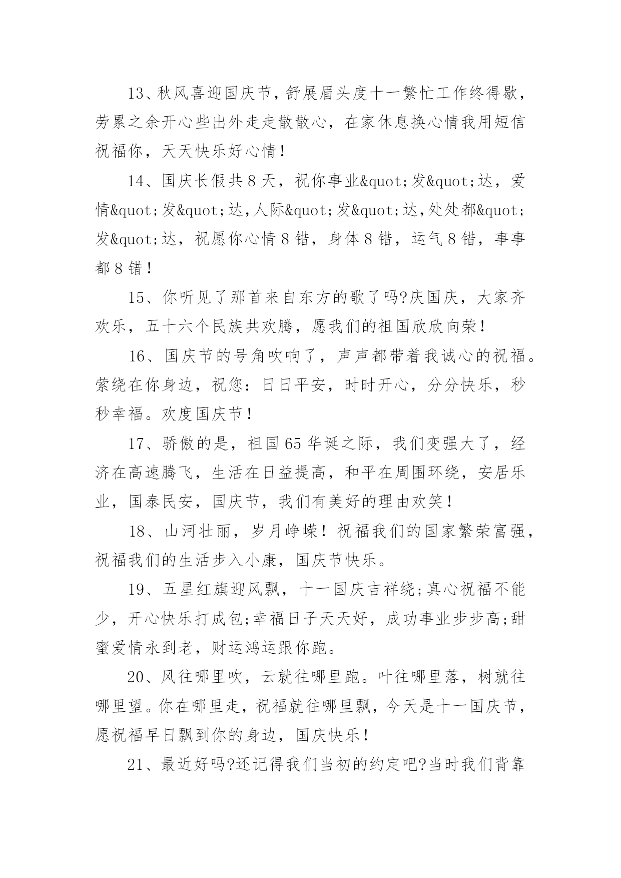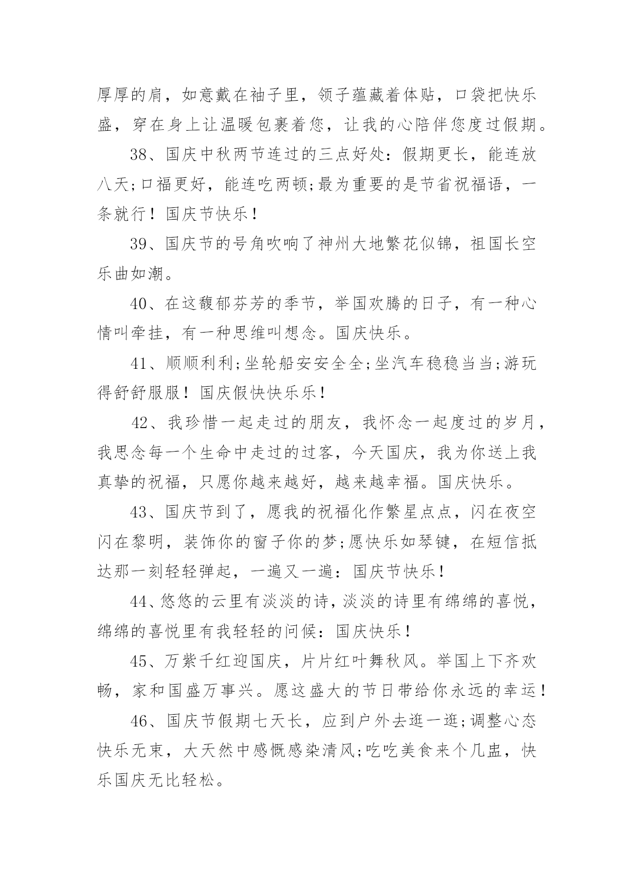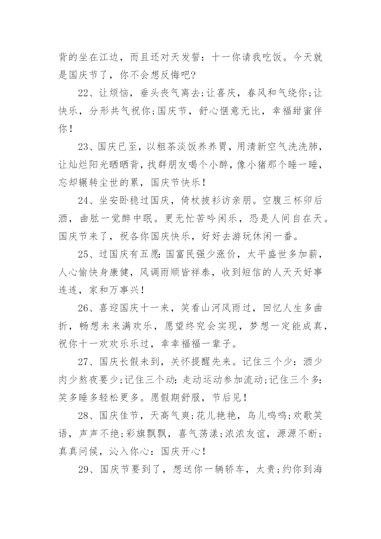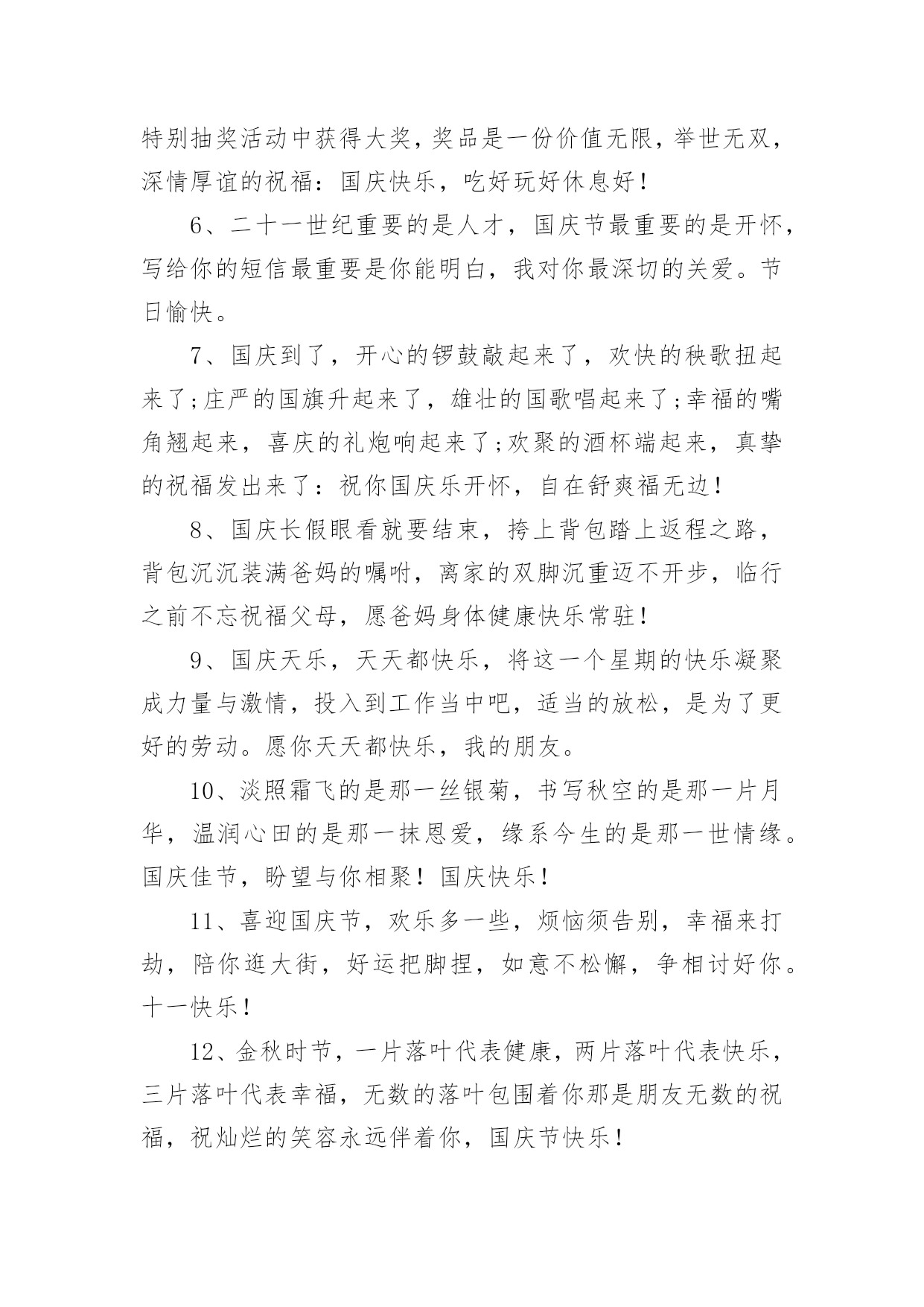 最新国庆文案最新国庆文案(精选205句)随着社交网络的普遍使用,越来越多人钟情于在朋友圈发布文案,文案用于跟亲朋好友分享个人生活情况。那什么样的文案才是新颖独特的呢?以下是小编整理的最新国庆文案,仅供参考,欢迎大家阅读。最新国庆文案11、国庆到,送你一张吉祥信用卡:存入耕耘,提取收获;存入微笑,提取快乐;存入努力,提取成功;存入善良,提取好运;存入运动,提取健康;存入真心,提取友情。随你提取福运佳,信用额度无限大,愿你心情乐哈哈,一生绽放幸福花!祝大家国庆快乐!2、十月一日,庄严的国旗升起,十月一日,你我共庆祖国华诞,带上一份心愿,带上一份祝福,让国庆之日带给你喜悦,带给你幸福和快乐!3、自己开心是一种快乐,让别人开心是一种幸福。说服自己是一种快乐,感染别人是一种幸福。收到祝福是一种快乐,传递祝福是一种幸福。[2022]国庆快乐!4、国庆节假期八天长,应到户外去逛一逛;调整心态快乐无束,大自然中感受清风;吃吃美食来个几盅,快乐国庆无比轻松。5、特大喜讯,您的手机号码在我的通讯录名单国庆节特别抽奖活动中获得大奖,奖品是一份价值无限,举世无双,深情厚谊的祝福:国庆快乐,吃好玩好休息好!6、二十一世纪重要的是人才,国庆节最重要的是开怀,写给你的短信最重要是你能明白,我对你最深切的关爱。节日愉快。7、国庆到了,开心的锣鼓敲起来了,欢快的秧歌扭起来了;庄严的国旗升起来了,雄壮的国歌唱起来了;幸福的嘴角翘起来,喜庆的礼炮响起来了;欢聚的酒杯端起来,真挚的祝福发出来了:祝你国庆乐开怀,自在舒爽福无边!8、国庆长假眼看就要结束,挎上背包踏上返程之路,背包沉沉装满爸妈的嘱咐,离家的双脚沉重迈不开步,临行之前不忘祝福父母,愿爸妈身体健康快乐常驻!9、国庆天乐,天天都快乐,将这一个星期的快乐凝聚成力量与激情,投入到工作当中吧,适当的放松,是为了更好的劳动。愿你天天都快乐,我的朋友。10、淡照霜飞的是那一丝银菊,书写秋空的是那一片月华,温润心田的是那一抹恩爱,缘系今生的是那一世情缘。国庆佳节,盼望与你相聚!国庆快乐!11、喜迎国庆节,欢乐多一些,烦恼须告别,幸福来打劫,陪你逛大街,好运把脚捏,如意不松懈,争相讨好你。十一快乐!12、金秋时节,一片落叶代表健康,两片落叶代表快乐,三片落叶代表幸福,无数的落叶包围着你那是朋友无数的祝福,祝灿烂的笑容永远伴着你,国庆节快乐!13、秋风喜迎国庆节,舒展眉头度十一繁忙工作终得歇,劳累之余开心些出外走走散散心,在家休息换心情我用短信祝福你,天天快乐好心情!14、国庆长假共8天,祝你事业"发"达,爱情"发"达,人际"发"达,处处都"发"达,祝愿你心情8错,身体8错,运气8错,事事都8错!15、你听见了那首来自东方的歌了吗?庆国庆,大家齐欢乐,五十六个民族共欢腾,愿我们的祖国欣欣向荣!16、国庆节的号角吹响了,声声都带着我诚心的祝福。萦绕在你身边,祝您:日日平安,时时开心,分分快乐,秒秒幸福。欢度国庆节!17、骄傲的是,祖国65华诞之际,我们变强大了,经济在高速腾飞,生活在日益提高,和平在周围环绕,安居乐业,国泰民安,国庆节,我们有美好的理由欢笑!18、山河壮丽,岁月峥嵘!祝福我们的国家繁荣富强,祝福我们的生活步入小康,国庆节快乐。19、五星红旗迎风飘,十一国庆吉祥绕;真心祝福不能少,开心快乐打成包;幸福日子天天好,成功事业步步高;甜蜜爱情永到老,财运鸿运跟你跑。20、风往哪里吹,云就往哪里跑。叶往哪里落,树就往哪里望。你在哪里走,祝福就往哪里飘,今天是十一国庆节,愿祝福早日飘到你的身边,国庆快乐!21、最近好吗?还记得我们当初的约定吧?当时我们背靠背的坐在江边,而且还对天发誓:十一你请我吃饭。今天就是国庆节了,你不会想反悔吧?22、让烦恼,垂头丧气离去;让喜庆,春风和气绕你;让快乐,分形共气祝你;国庆节,舒心惬意无比,幸福甜蜜伴你!23、国庆已至,以粗茶淡饭养养胃,用清新空气洗洗肺,让灿烂阳光晒晒背,找群朋友喝个小醉,像小猪那个睡一睡,忘却辗转尘世的累,国庆节快乐!24、坐安卧稳过国庆,倚杖披衫访亲朋。空腹三杯卯后酒,曲肱一觉醉中眠。更无忙苦吟闲乐,恐是人间自在天。国庆节来了,祝各你国庆快乐,好好去游玩休闲一番。25、过国庆有五愿:国富民强少涨价,太平盛世多加薪,人心愉快身康健,风调雨顺皆祥泰,收到短信的人天天好事连连,家和万事兴!26、喜迎国庆十一来,笑看山河风雨过,回忆人生多曲折,畅想未来满欢乐,愿望终究会实现,梦想一定能成真,祝你十一欢欢乐乐过,幸幸福福一辈子。27、国庆长假未到,关怀提醒先来。记住三个少:酒少肉少熬夜要少;记住三个动:走动运动参加流动;记住三个多:笑多睡多轻松更多。愿假期舒服,节后见!28、国庆佳节,天高气爽