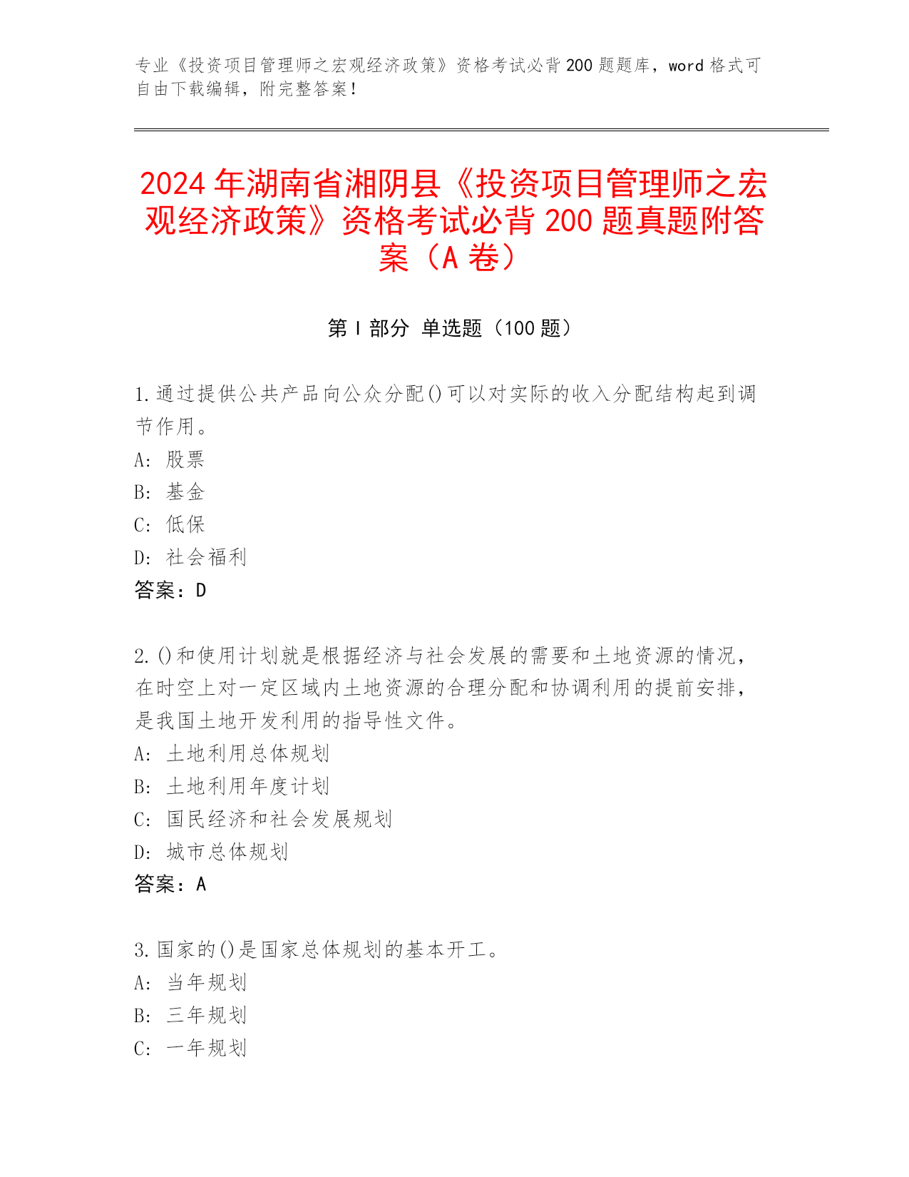 2024年湖南省湘阴县《投资项目管理师之宏观经济政策》资格考试必背200题真题附答案(A卷)