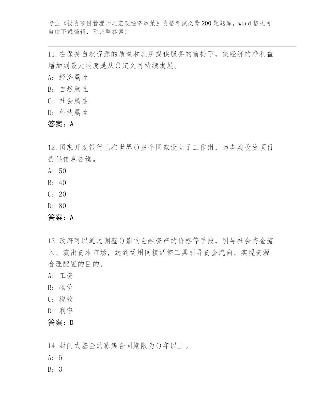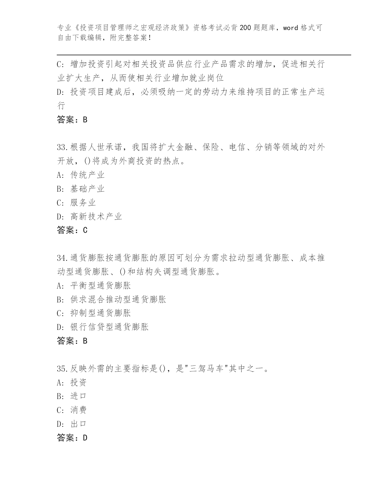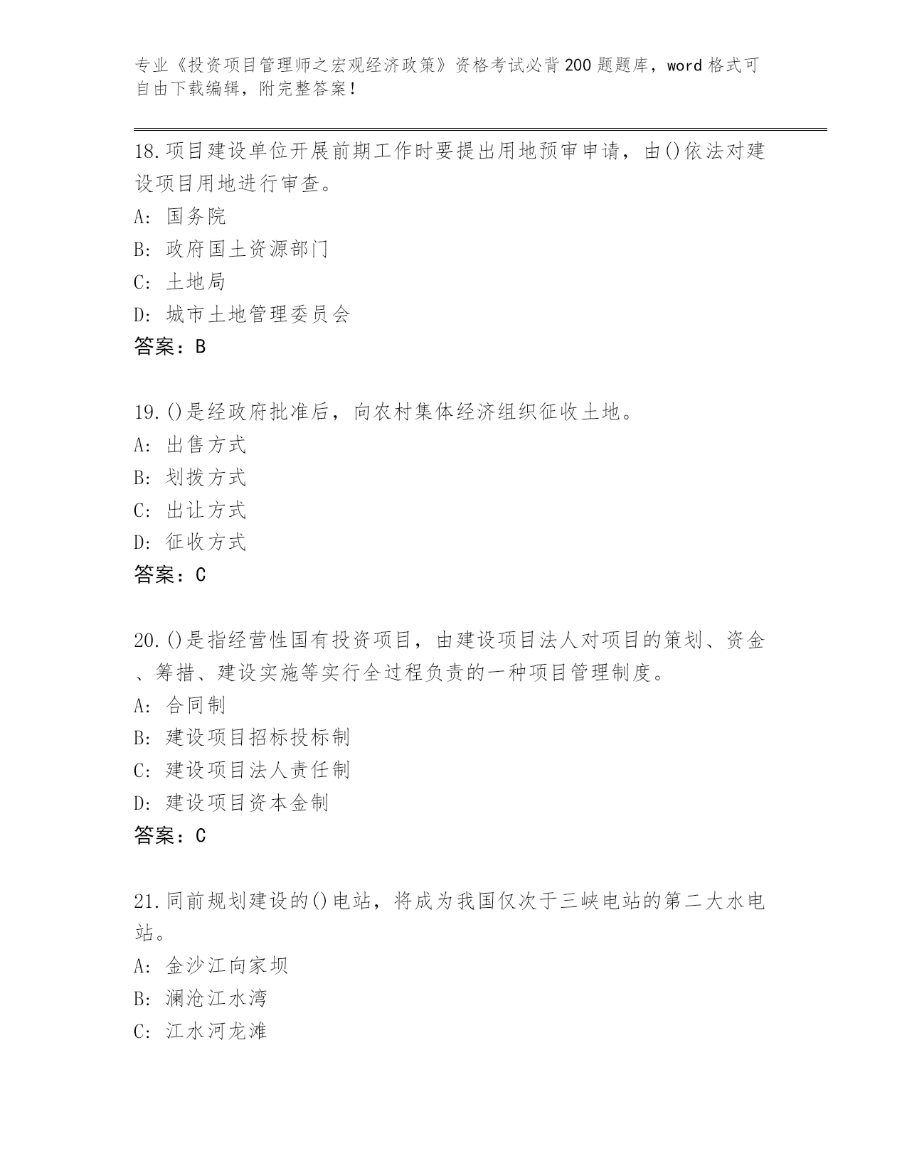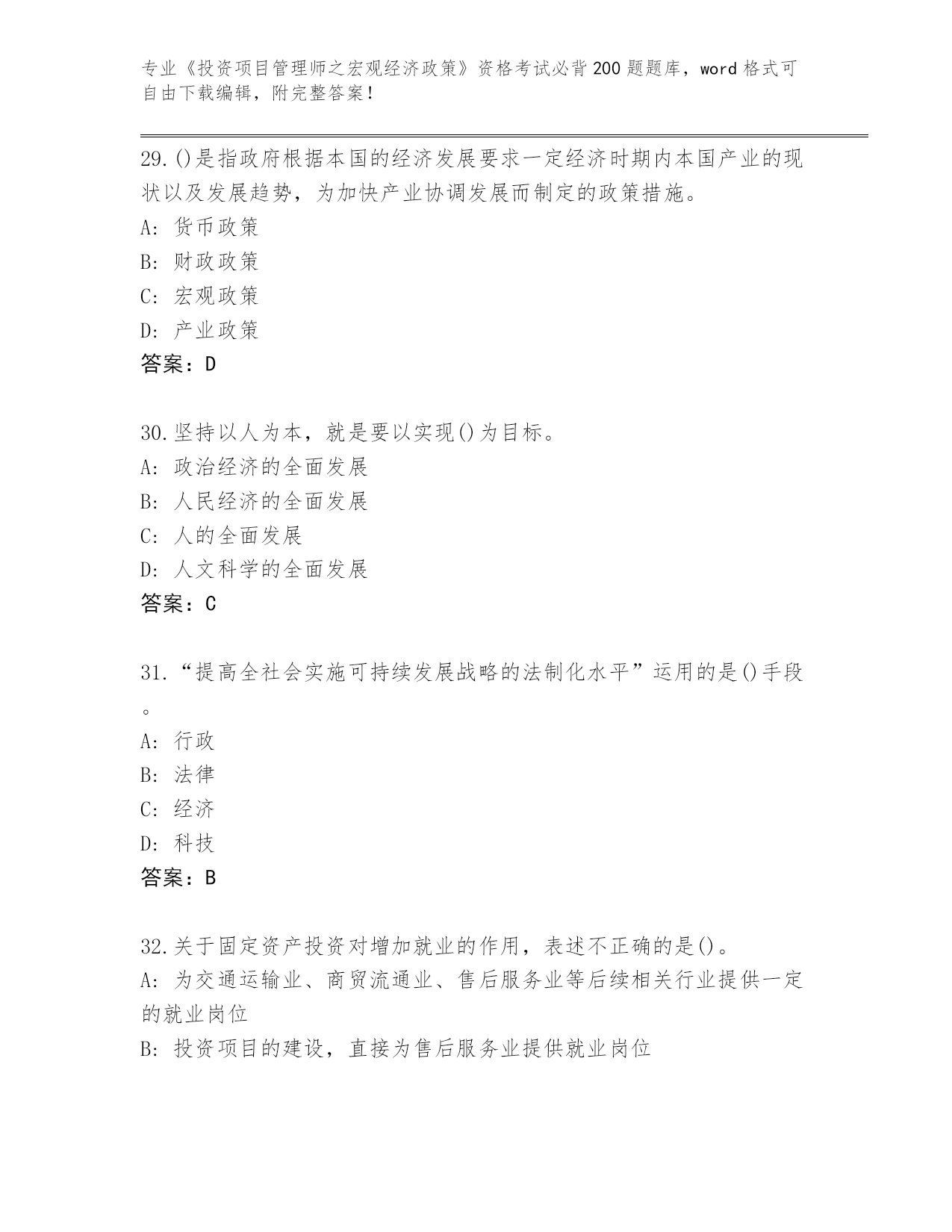 内部使用湖南省蒸湘区《投资项目管理师之宏观经济政策》资格考试必背200题真题答案