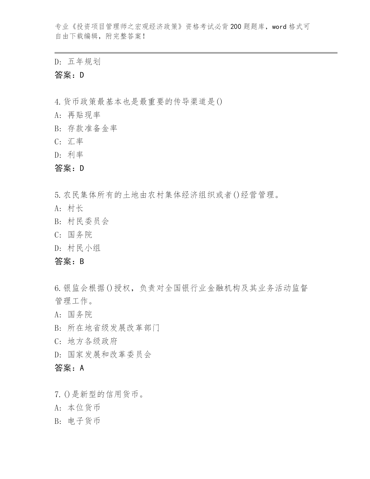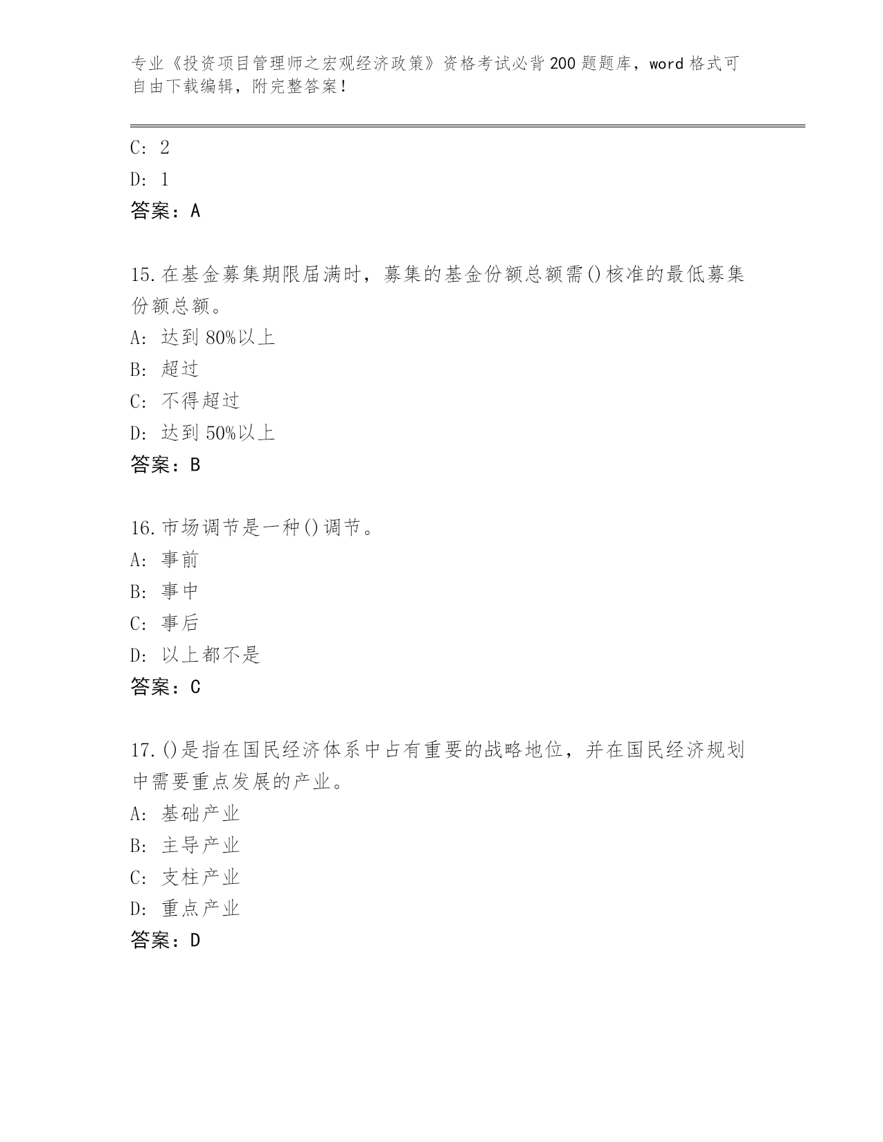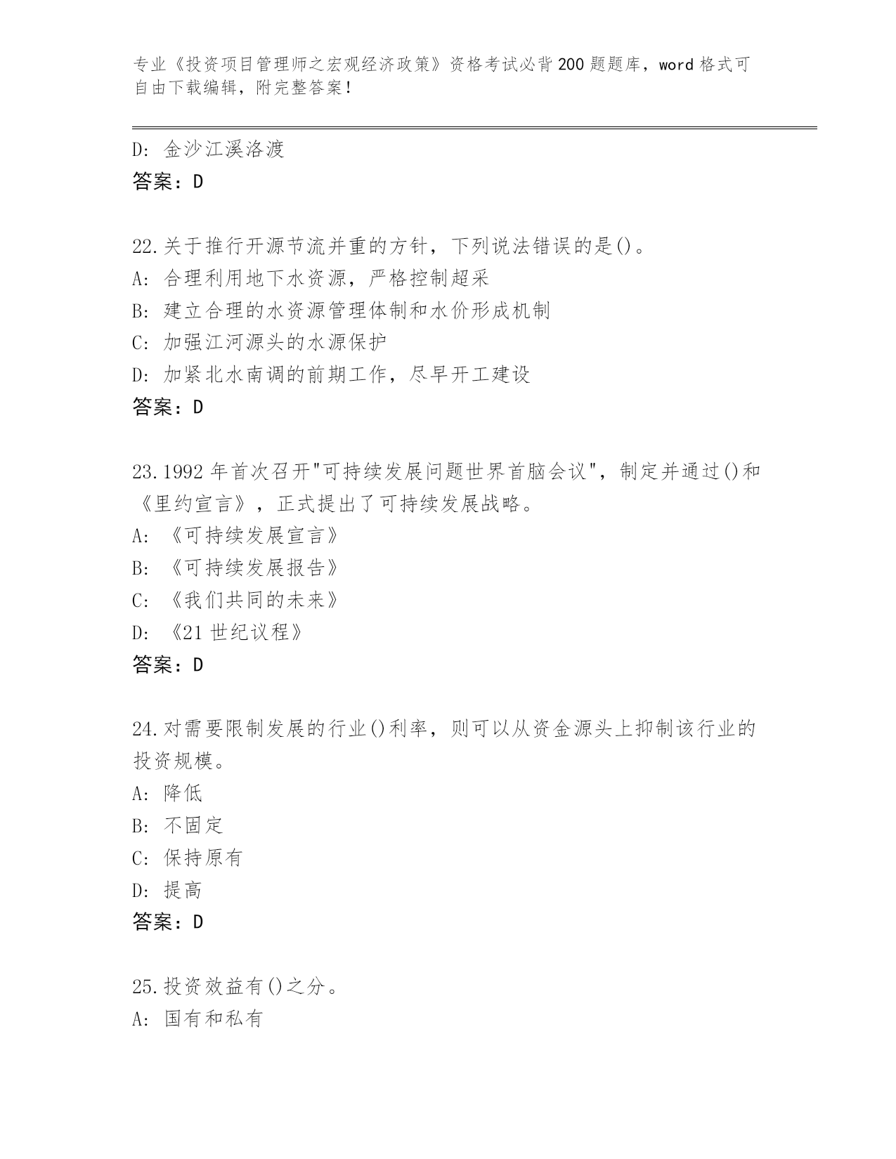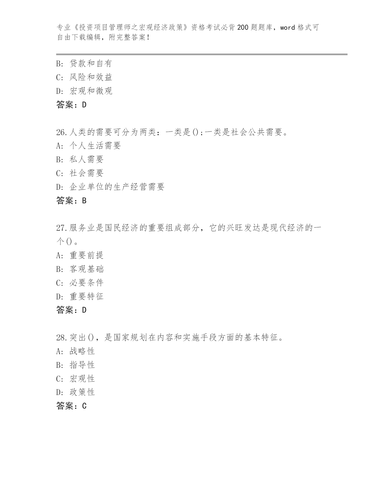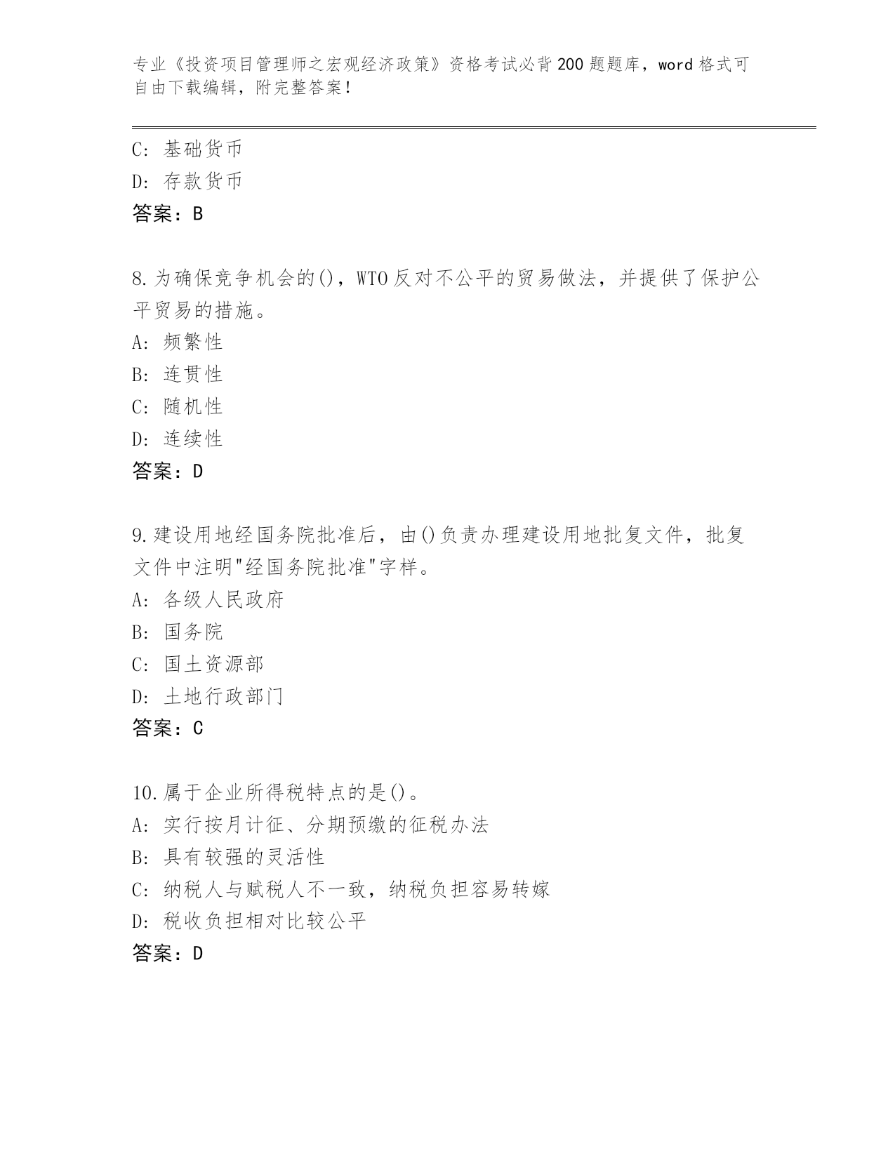 内部使用湖南省蒸湘区《投资项目管理师之宏观经济政策》资格考试必背200题真题答案