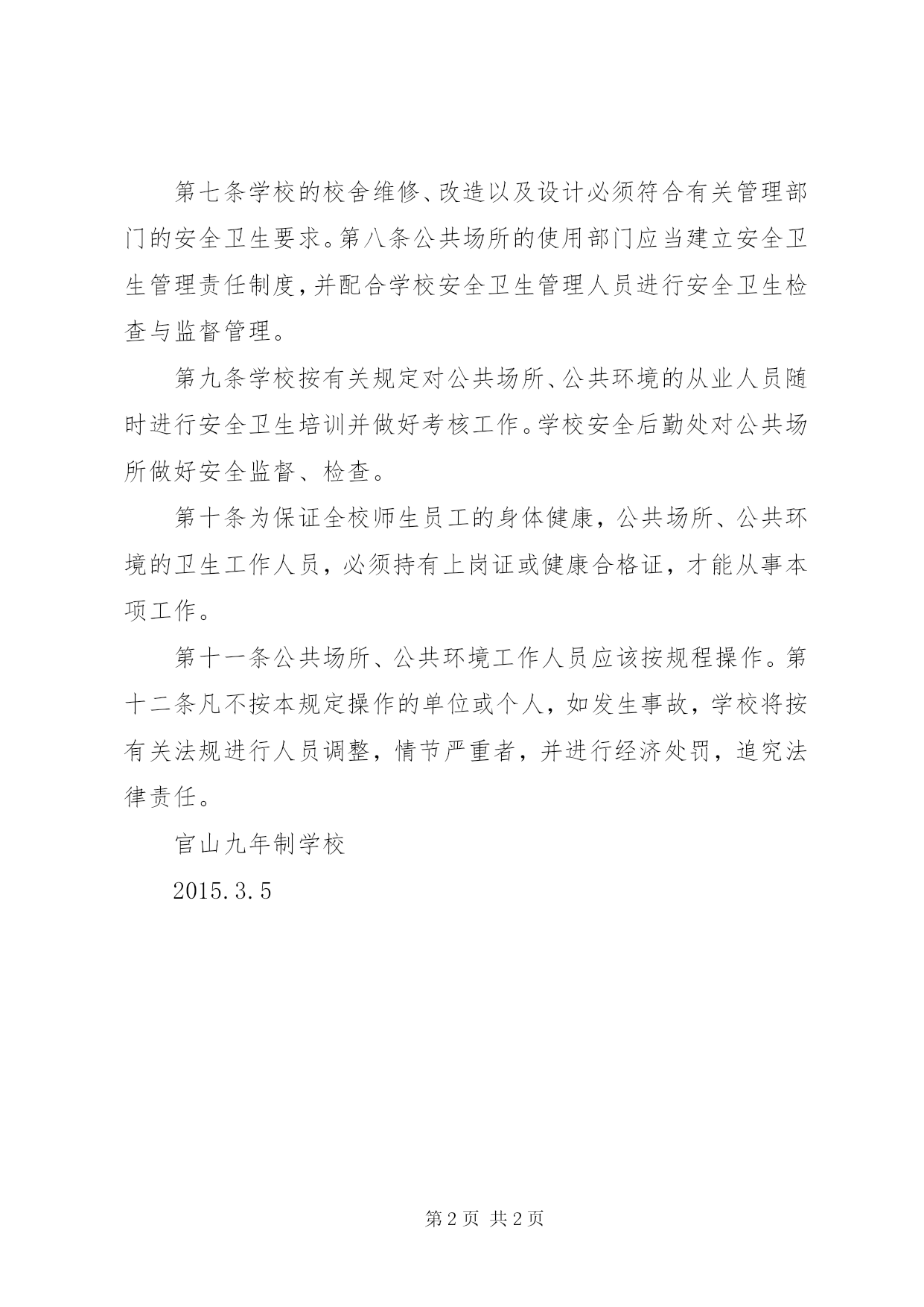 第PAGE\*Arabic\*MERGEFORMAT2页共NUMPAGES\*MERGEFORMAT2页学校公共场所卫生消毒制度学校公共场所卫生制度为搞好公共场所、公共环境的安全和卫生管理,创造良好的公共场所卫生条件,预防疾病,保障全校师生员工的身体健康,创造良好的学习、生活、工作环境。特制定本公共场所、公共环境安全卫生管理细则。第一条本规定适用范围。办公室、教室、会议室,多媒体室、阅览室、实验室、运动场、活动室、食堂、厕所等。第二条教室、阅览室内采光、照明必须符合国家教育部的有关要求。第三条必须并保持教室、阅览室等的空气流通,做好通风设备设施的管理。第四条做好周边环境、场所的安全卫生管理工作,减少或禁止噪音,保证教学、工作、生活的正常开展。第五条严格按照国家有关规定处理实验室的废弃物,随时清除生活垃圾,营造良好的生活工作环境。第六条体育场地要经常检查场地设施,发现设施损坏,应及时维修,保证使用安全。严禁一切车辆进入体育场地内。体育场地只提供校内学生及教职工活动,校外人员必须办理租借手续,方准提供使用。学校举行各种比赛,要经常打扫体育场地内外以及周边环境卫生。第七条学校的校舍维修、改造以及设计必须符合有关管理部门的安全卫生要求。第八条公共场所的使用部门应当建立安全卫生管理责任制度,并配合学校安全卫生管理人员进行安全卫生检查与监督管理。第九条学校按有关规定对公共场所、公共环境的从业人员随时进行安全卫生培训并做好考核工作。学校安全后勤处对公共场所做好安全监督、检查。第十条为保证全校师生员工的身体健康,公共场所、公共环境的卫生工作人员,必须持有上岗证或健康合格证,才能从事本项工作。第十一条公共场所、公共环境工作人员应该按规程操作。第十二条凡不按本规定操作的单位或个人,如发生事故,学校将按有关法规进行人员调整,情节严重者,并进行经济处罚,追究法律责任。官山九年制学校2015.3.5