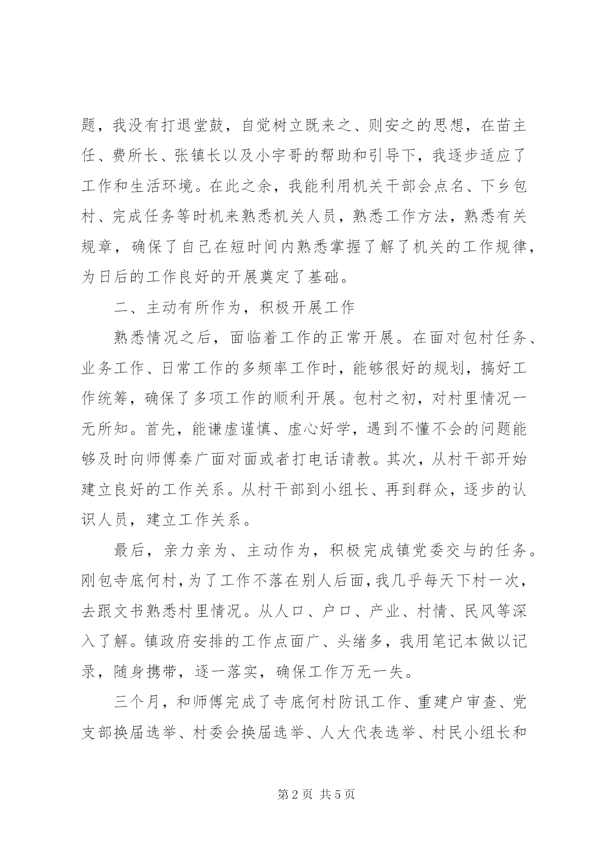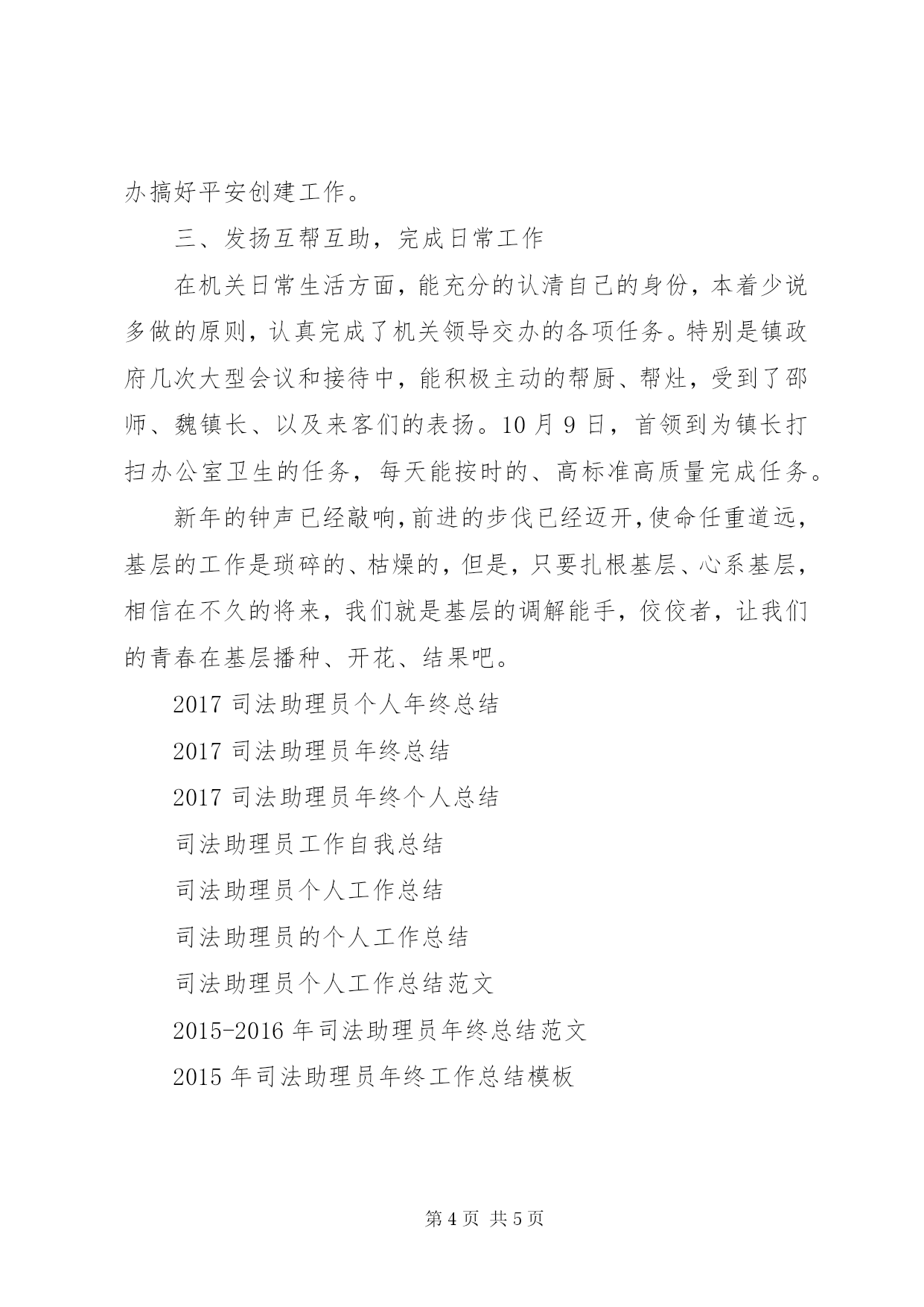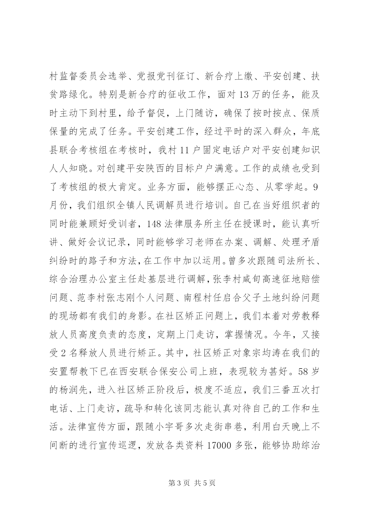 第PAGE\*Arabic\*MERGEFORMAT5页共NUMPAGES\*MERGEFORMAT5页司法助理员年终工作总结范本时光荏苒,岁月流逝,转眼间步入机关已整整三个月。三个月看似不长,但是确让我完成了许多个身份的转变,而就在这些不经意的身份转变中,我学会了适应、学会了投入、更学会了付出。这些转变让我更加珍惜这短暂而又悠长的上班生活。回顾上班以来的生活、工作、学习、业务等方面的开展情况,应该说:有得有失、喜忧参半。得:通过短短三个月的机关工作和生活,我得到了许多在书本、在校园里学不到的知识,让我将先前的理论和如今的实际结合的更加紧密。失:三个月里,也曾无数次牺牲自己的休息时间,加班加点的在忙工作,也曾在个人事务、家庭事务、和机关事务面前,毅然决然的选择了后者。喜:三个月,在各级领导的帮助和关心下,我对机关日常工作已经有所了解。在平时的业务方面、包村下乡方面有所建树。在村、镇以及县司法局部门有所印象。忧:由于时间短,自身素质不高等原因,导致自身的能力还不强,业务水平还不高。在工作中,时常会出现这样那样的小问题、小疏忽。2017年度的工作即将落下帷幕。2017年的工作也随之而来。为了总结经验,查找不足,更为了来年工作的更好开展,下面就上班以来的工作做以总结:基本情况一、自觉稳定思想,积极适应环境初来乍到,面对陌生的工作伙伴、生疏的工作环境,以及住宿、办公条件反差大的现实问题,我没有打退堂鼓,自觉树立既来之、则安之的思想,在苗主任、费所长、张镇长以及小宇哥的帮助和引导下,我逐步适应了工作和生活环境。在此之余,我能利用机关干部会点名、下乡包村、完成任务等时机来熟悉机关人员,熟悉工作方法,熟悉有关规章,确保了自己在短时间内熟悉掌握了解了机关的工作规律,为日后的工作良好的开展奠定了基础。二、主动有所作为,积极开展工作熟悉情况之后,面临着工作的正常开展。在面对包村任务、业务工作、日常工作的多频率工作时,能够很好的规划,搞好工作统筹,确保了多项工作的顺利开展。包村之初,对村里情况一无所知。首先,能谦虚谨慎、虚心好学,遇到不懂不会的问题能够及时向师傅秦广面对面或者打电话请教。其次,从村干部开始建立良好的工作关系。从村干部到小组长、再到群众,逐步的认识人员,建立工作关系。最后,亲力亲为、主动作为,积极完成镇党委交与的任务。刚包寺底何村,为了工作不落在别人后面,我几乎每天下村一次,去跟文书熟悉村里情况。从人口、户口、产业、村情、民风等深入了解。镇政府安排的工作点面广、头绪多,我用笔记本做以记录,随身携带,逐一落实,确保工作万无一失。三个月,和师傅完成了寺底何村防讯工作、重建户审查、党支部换届选举、村委会换届选举、人大代表选举、村民小组长和村监督委员会选举、党报党刊征订、新合疗上缴、平安创建、扶贫路绿化。特别是新合疗的征收工作,面对13万的任务,能及时主动下到村里,给予督促,上门随访,确保了按时按点、保质保量的完成了任务。平安创建工作,经过平时的深入群众,年底县联合考核组在考核时,我村11户固定电话户对平安创建知识人人知晓。对创建平安陕西的目标户户满意。工作的成绩也受到了考核组的极大肯定。业务方面,能够摆正心态、从零学起。9月份,我们组织全镇人民调解员进行培训。自己在当好组织者的同时能兼顾好受训者,148法律服务所主任在授课时,能认真听讲、做好会议记录,同时能够学习老师在办案、调解、处理矛盾纠纷时的路子和方法,在工作中加以运用。曾多次跟随司法所长、综合治理办公室主任赴基层进行调解,张李村咸旬高速征地赔偿问题、范李村张志刚个人问题、南程村任启合父子土地纠纷问题的现场都有我们的身影。在社区矫正问题上,我们本着对劳教释放人员高度负责的态度,定期上门走访,掌握情况。今年,又接受2名释放人员进行矫正。其中,社区矫正对象宗均涛在我们的安置帮教下已在西安联合保安公司上班,表现较为甚好。58岁的杨润先,进入社区矫正阶段后,极度不适应,我们三番五次打电话、上门走访,疏导和转化该同志能认真对待自己的工作和生活。法律宣传方面,跟随小宇哥多次走街串巷,利用白天晚上不间断的进行宣传巡逻,发放各类资料17000多张,能够协助综治办搞好平安创建工作。三、发扬互帮互助,完成日常工作在机关日常生活方面,能充分的认清自己的身份,本着少说多做的原则,认真完成了机关领导交办的各项任务。特别是镇政府几次大型会议和接待中,能积极主动的帮厨、帮灶,受到了邵师、魏镇长、以及来客们的表扬。10月9日,首领到为镇长打扫办公室卫生的任务,每天能按时的、高标准高质量完成任务。新年的钟声已经敲响,前进的步伐已经迈开,使命任重道远,基层的工作是琐碎的、枯燥的,但是,只要扎根基层、心系基层,相信在不久的将来,我们就是基层的调解能手,佼佼者,让我们的青春在基层播种、开花、结果吧。