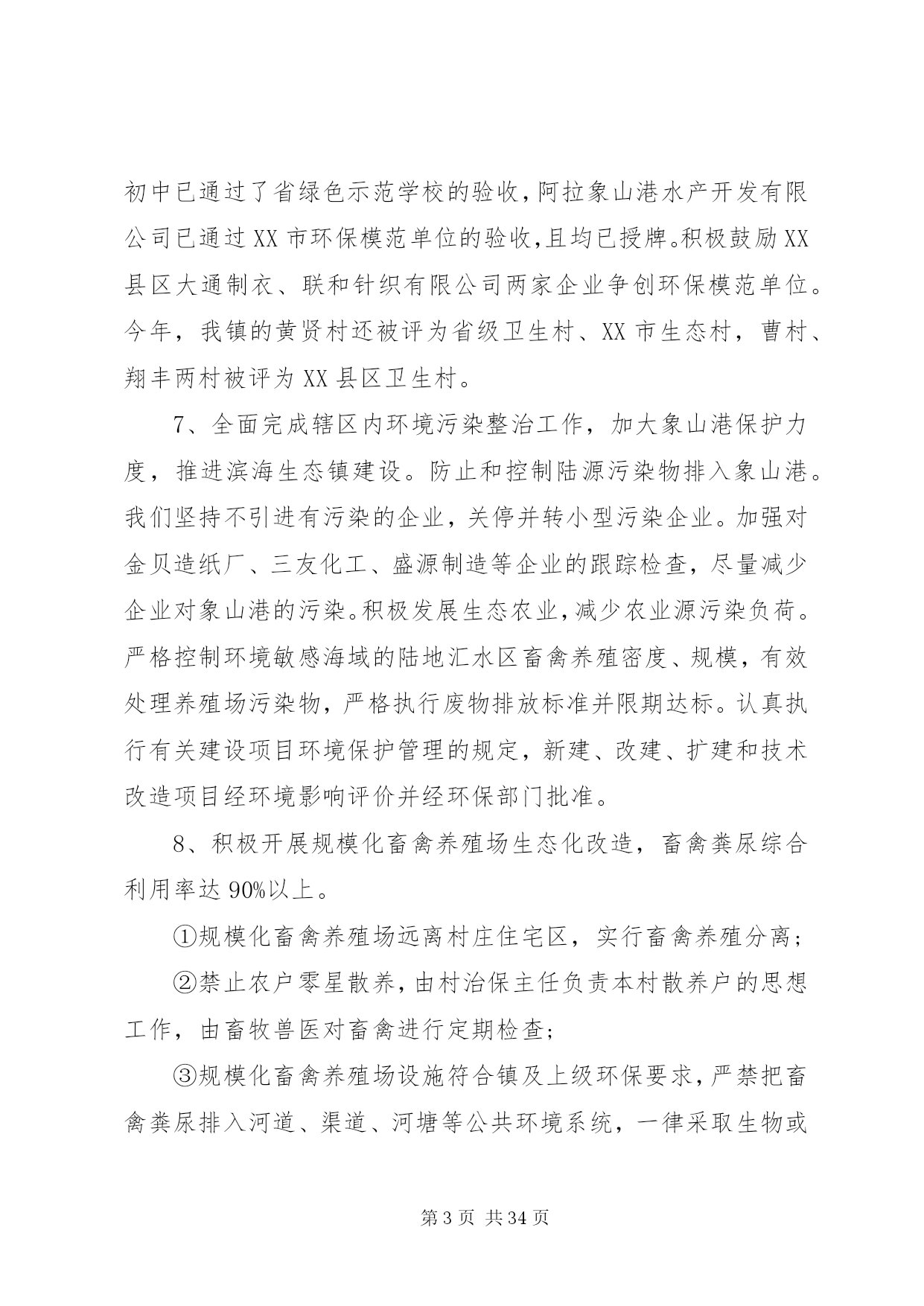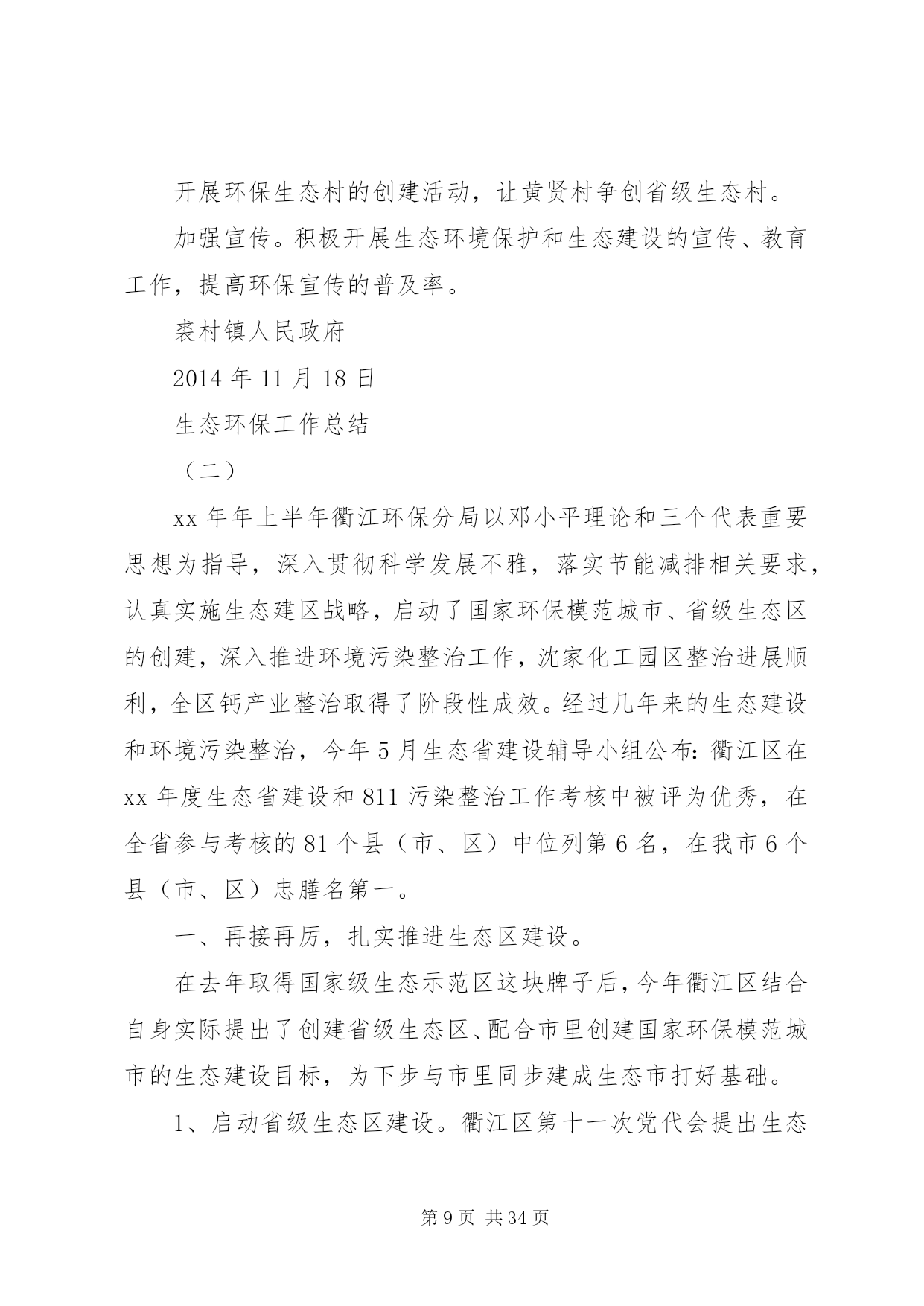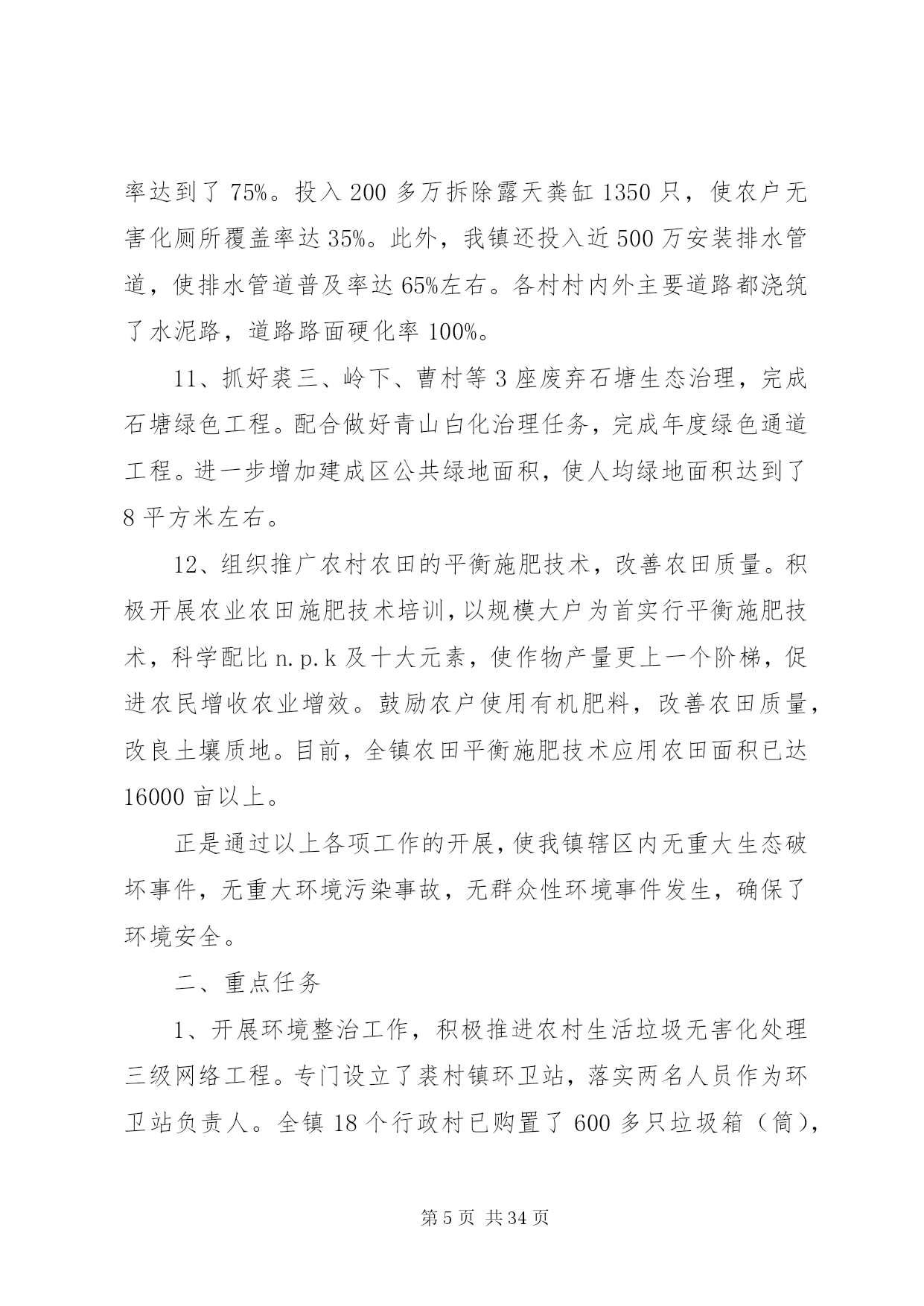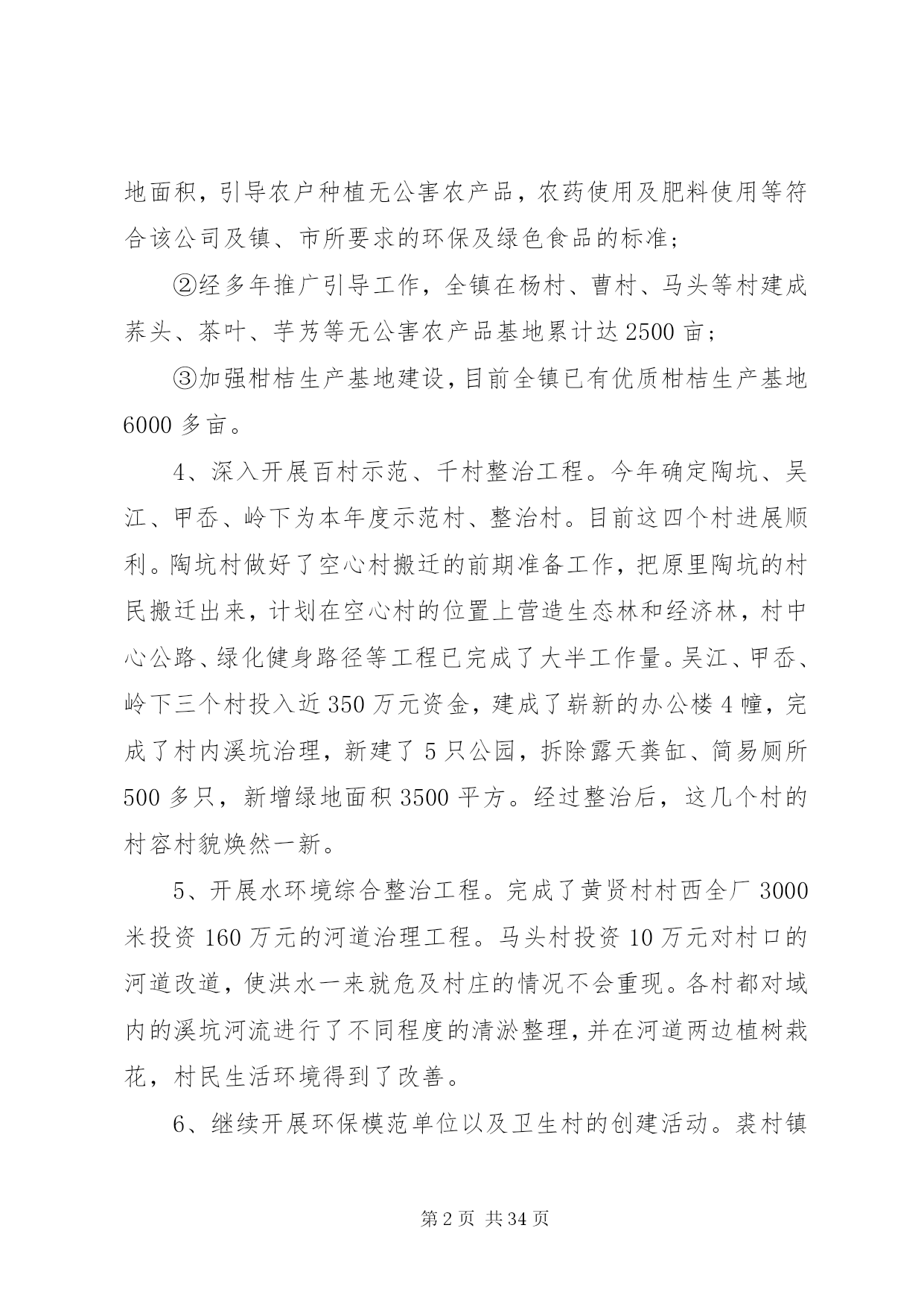 第PAGE\*Arabic\*MERGEFORMAT34页共NUMPAGES\*MERGEFORMAT34页生态环保工作总结(一)根据《XX县区2014年度生态环境保护任务书》关于裘村镇工作任务书的内容要求,我镇领导重视,措施得力,对照《任务书》提出的工作目标以及生态杯竞赛活动考核办法,逐条逐项付诸实施。现将具体情况总结如下:一、基本任务完成情况1、完善制度,明确责任。按照生态环境保护任务书的总体要求,通过了裘村镇生态镇建设规划的编制工作,并以文件形式颁布实施。按照规划要求,制订了2015年生态环境保护年度计划。切实加强对生态环境保护工作的领导,做到落实机构、落实人员,落实资金,将计划内容分解至各职能部门。2、广泛宣传,意识到位。积极开展生态环境保护的宣传教育工作,在全镇人口较为密集的车站、市场等处悬挂宣传横幅15条次,张贴宣传画,刊出宣传窗8期。在各村、学校、工厂采取标语、黑板报等形式宣传生态环境保护的重要性,促使环保意识深入人心。3、开展农村清洁能源利用工作,继续做好绿色(有机)食品和无公害农产品认证及企业iso14000认证工作,使无公害农产品基地累计达2500亩,林产品基地累计达6000亩。①继续推进奉化尚田今果农产品公司订单基地建设,扩大基地面积,引导农户种植无公害农产品,农药使用及肥料使用等符合该公司及镇、市所要求的环保及绿色食品的标准;②经多年推广引导工作,全镇在杨村、曹村、马头等村建成荞头、茶叶、芋艿等无公害农产品基地累计达2500亩;③加强柑桔生产基地建设,目前全镇已有优质柑桔生产基地6000多亩。4、深入开展百村示范、千村整治工程。今年确定陶坑、吴江、甲岙、岭下为本年度示范村、整治村。目前这四个村进展顺利。陶坑村做好了空心村搬迁的前期准备工作,把原里陶坑的村民搬迁出来,计划在空心村的位置上营造生态林和经济林,村中心公路、绿化健身路径等工程已完成了大半工作量。吴江、甲岙、岭下三个村投入近350万元资金,建成了崭新的办公楼4幢,完成了村内溪坑治理,新建了5只公园,拆除露天粪缸、简易厕所500多只,新增绿地面积3500平方。经过整治后,这几个村的村容村貌焕然一新。5、开展水环境综合整治工程。完成了黄贤村村西全厂3000米投资160万元的河道治理工程。马头村投资10万元对村口的河道改道,使洪水一来就危及村庄的情况不会重现。各村都对域内的溪坑河流进行了不同程度的清淤整理,并在河道两边植树栽花,村民生活环境得到了改善。6、继续开展环保模范单位以及卫生村的创建活动。裘村镇初中已通过了省绿色示范学校的验收,阿拉象山港水产开发有限公司已通过XX市环保模范单位的验收,且均已授牌。积极鼓励XX县区大通制衣、联和针织有限公司两家企业争创环保模范单位。今年,我镇的黄贤村还被评为省级卫生村、XX市生态村,曹村、翔丰两村被评为XX县区卫生村。7、全面完成辖区内环境污染整治工作,加大象山港保护力度,推进滨海生态镇建设。防止和控制陆源污染物排入象山港。我们坚持不引进有污染的企业,关停并转小型污染企业。加强对金贝造纸厂、三友化工、盛源制造等企业的跟踪检查,尽量减少企业对象山港的污染。积极发展生态农业,减少农业源污染负荷。严格控制环境敏感海域的陆地汇水区畜禽养殖密度、规模,有效处理养殖场污染物,严格执行废物排放标准并限期达标。认真执行有关建设项目环境保护管理的规定,新建、改建、扩建和技术改造项目经环境影响评价并经环保部门批准。8、积极开展规模化畜禽养殖场生态化改造,畜禽粪尿综合利用率达90%以上。①规模化畜禽养殖场远离村庄住宅区,实行畜禽养殖分离;②禁止农户零星散养,由村治保主任负责本村散养户的思想工作,由畜牧兽医对畜禽进行定期检查;③规模化畜禽养殖场设施符合镇及上级环保要求,严禁把畜禽粪尿排入河道、渠道、河塘等公共环境系统,一律采取生物或化学处理;④各养殖场由专职兽医定期检查(一般半月一次)环境设施及防疫卫生条件处理。要求各场日日清理畜禽排泄物,一周一次消毒场地、设施;⑤积极鼓励养殖户进行畜禽粪尿综合利用,把农业种植业与畜禽饲养业结合起来,资源循环利用,以期达到最环保最良好的经济效益。经实施,综合利用场户已达90%以上。9、开展企业清洁生产试点和强制清洁生产审核工作。我们在宁波银山制衣有限公司、XX县区新科精密铸造公司开展了清洁生产试点工作,并取得了较为满意的效果。对全镇新引进的7个项目实行强制性清洁生产审核工作。工业区块内环保基础设施较为完善,电、路、水基本到位,并积极鼓励银山制衣、蒙达制衣等企业申报iso14000认证。10、进一步完善公共设施。在一年时间内又浇筑了两条公路,分别是投资65万余元、总长1.5公里的枫弄公路和投资500多万、全长4.2公里的裘杨公路,目前两条公路主体工程均已竣工。投资350余万元完成