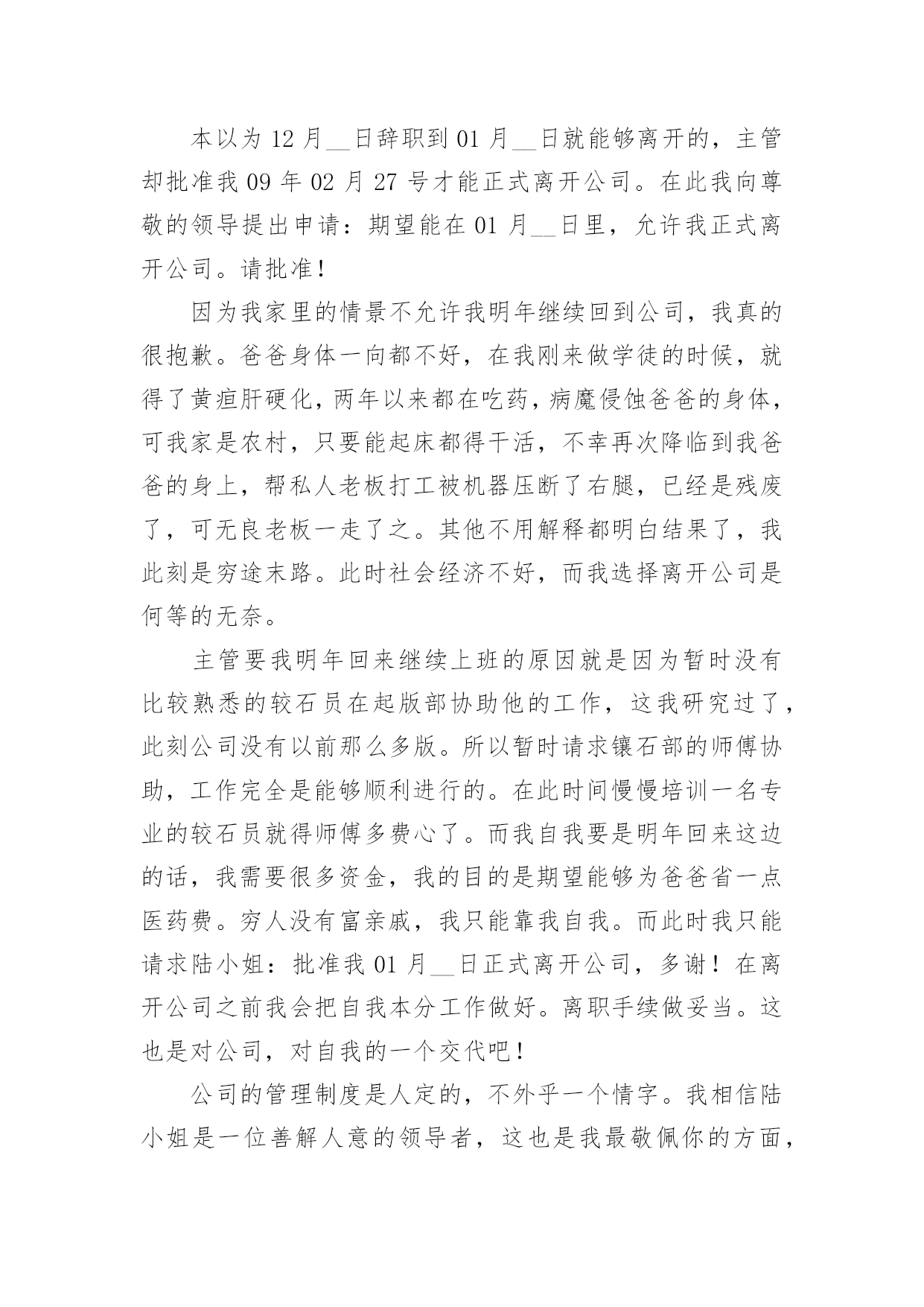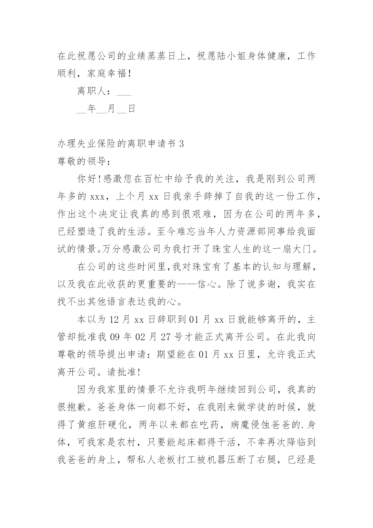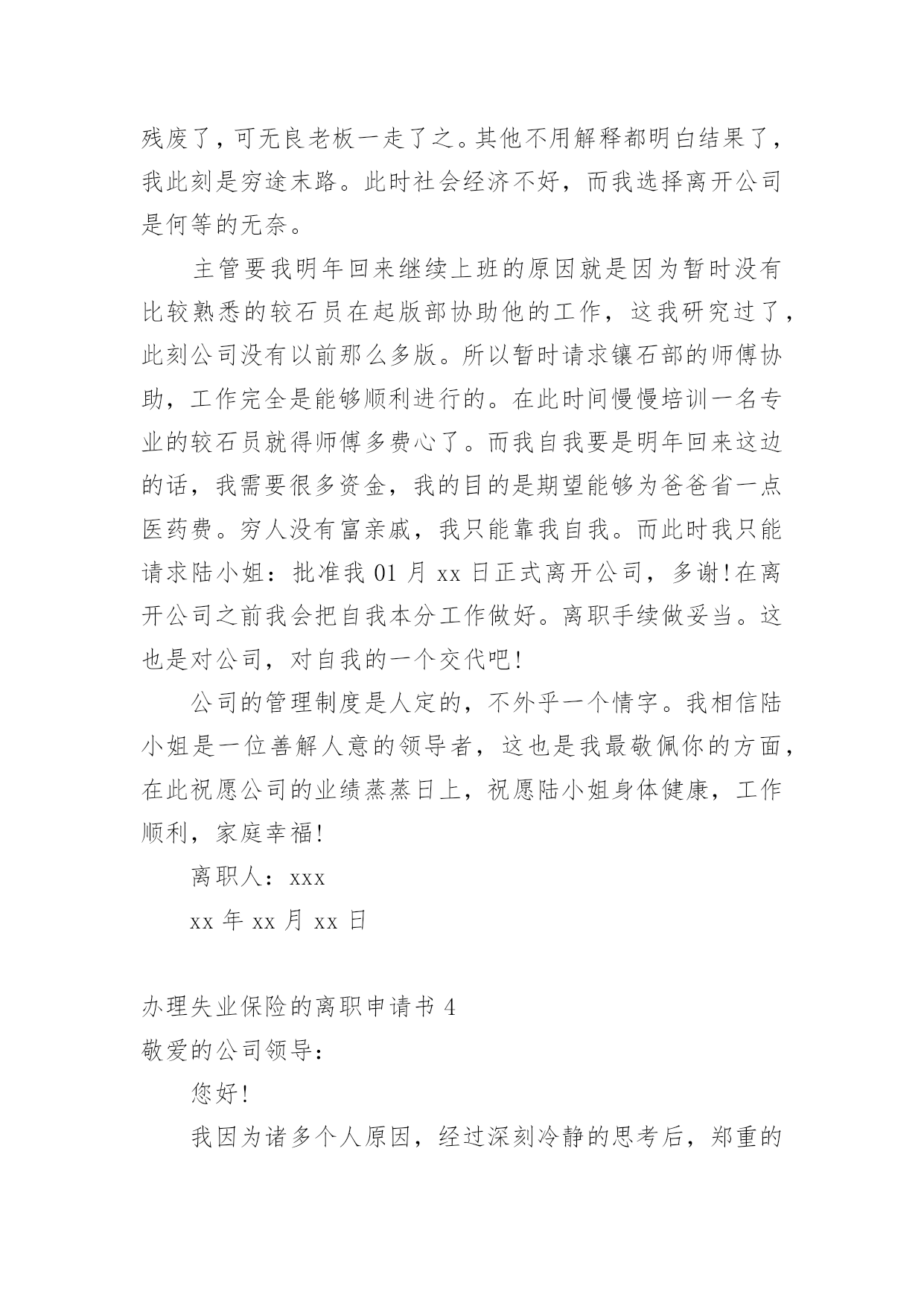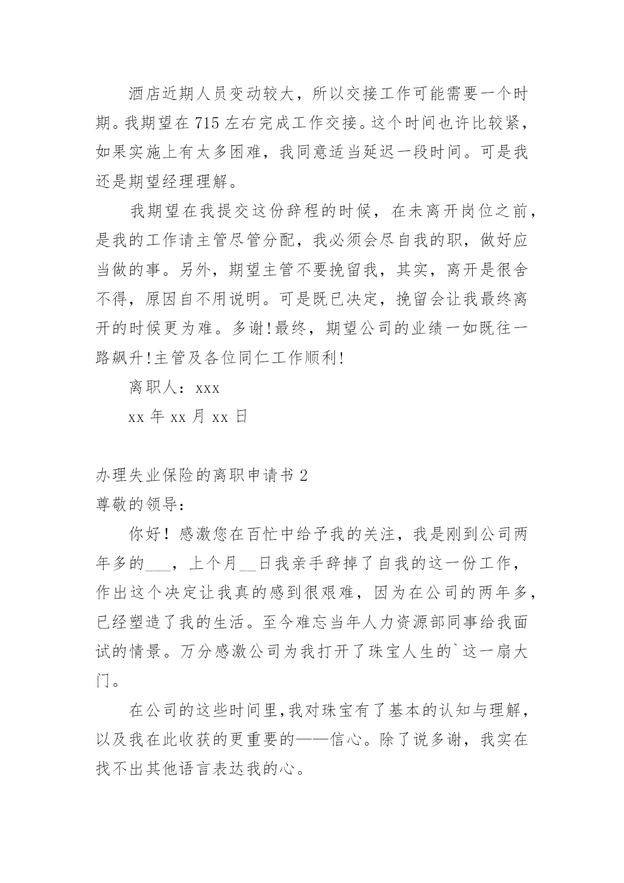 办理失业保险的离职申请书在眼下市场经济活跃的社会,我们会使用上申请书,申请书可以使我们的愿望和请求得到合理表达。大家知道申请书的格式吗?下面是小编为大家整理的办理失业保险的离职申请书,希望能够帮助到大家。办理失业保险的离职申请书1尊敬的主管:你好!在酒店工作一段时间中,学到了很多知识,酒店的营业状态也是一向表现良好态势。十分感激公司给予了我这样的机会在良好的环境工作和学习。虽然在酒店里基础的业务知识及专业知识已经基本掌握,但俗话说“学无止境‘,有很多方面还是需不断学习。提出辞职我想了很久。酒店的.环境对于服务员很照顾很保护。鉴于我的个性要在酒店自我提升及成长为独挡一面的能手,处于保护的环境下可能很难。我自我也意识到了自我个性倾于内向,其实,这不管是对于酒店培育人才或是我自身完善都是突破的难点。虽然我的观念是:人需要不断的发展、提高、完善。我也一向在努力改变,变得适应环境,以便更好的发挥自我的作用。可是我觉得自我一向没什么突破,研究了很久,确定了需要变换环境来磨砺。酒店近期人员变动较大,所以交接工作可能需要一个时期。我期望在715左右完成工作交接。这个时间也许比较紧,如果实施上有太多困难,我同意适当延迟一段时间。可是我还是期望经理理解。我期望在我提交这份辞程的时候,在未离开岗位之前,是我的工作请主管尽管分配,我必须会尽自我的职,做好应当做的事。另外,期望主管不要挽留我,其实,离开是很舍不得,原因自不用说明。可是既已决定,挽留会让我最终离开的时候更为难。多谢!最终,期望公司的业绩一如既往一路飙升!主管及各位同仁工作顺利!离职人:xxxxx年xx月xx日办理失业保险的离职申请书2尊敬的领导:你好!感激您在百忙中给予我的关注,我是刚到公司两年多的___,上个月__日我亲手辞掉了自我的这一份工作,作出这个决定让我真的感到很艰难,因为在公司的两年多,已经塑造了我的生活。至今难忘当年人力资源部同事给我面试的情景。万分感激公司为我打开了珠宝人生的`这一扇大门。在公司的这些时间里,我对珠宝有了基本的认知与理解,以及我在此收获的更重要的——信心。除了说多谢,我实在找不出其他语言表达我的心。本以为12月__日辞职到01月__日就能够离开的,主管却批准我09年02月27号才能正式离开公司。在此我向尊敬的领导提出申请:期望能在01月__日里,允许我正式离开公司。请批准!因为我家里的情景不允许我明年继续回到公司,我真的很抱歉。爸爸身体一向都不好,在我刚来做学徒的时候,就得了黄疸肝硬化,两年以来都在吃药,病魔侵蚀爸爸的身体,可我家是农村,只要能起床都得干活,不幸再次降临到我爸爸的身上,帮私人老板打工被机器压断了右腿,已经是残废了,可无良老板一走了之。其他不用解释都明白结果了,我此刻是穷途末路。此时社会经济不好,而我选择离开公司是何等的无奈。主管要我明年回来继续上班的原因就是因为暂时没有比较熟悉的较石员在起版部协助他的工作,这我研究过了,此刻公司没有以前那么多版。所以暂时请求镶石部的师傅协助,工作完全是能够顺利进行的。在此时间慢慢培训一名专业的较石员就得师傅多费心了。而我自我要是明年回来这边的话,我需要很多资金,我的目的是期望能够为爸爸省一点医药费。穷人没有富亲戚,我只能靠我自我。而此时我只能请求陆小姐:批准我01月__日正式离开公司,多谢!在离开公司之前我会把自我本分工作做好。离职手续做妥当。这也是对公司,对自我的一个交代吧!公司的管理制度是人定的,不外乎一个情字。我相信陆小姐是一位善解人意的领导者,这也是我最敬佩你的方面,在此祝愿公司的业绩蒸蒸日上,祝愿陆小姐身体健康,工作顺利,家庭幸福!离职人:_____年__月__日办理失业保险的离职申请书3尊敬的领导:你好!感激您在百忙中给予我的关注,我是刚到公司两年多的xxx,上个月xx日我亲手辞掉了自我的这一份工作,作出这个决定让我真的感到很艰难,因为在公司的两年多,已经塑造了我的生活。至今难忘当年人力资源部同事给我面试的情景。万分感激公司为我打开了珠宝人生的这一扇大门。在公司的这些时间里,我对珠宝有了基本的认知与理解,以及我在此收获的更重要的——信心。除了说多谢,我实在找不出其他语言表达我的心。本以为12月xx日辞职到01月xx日就能够离开的,主管却批准我09年02月27号才能正式离开公司。在此我向尊敬的领导提出申请:期望能在01月xx日里,允许我正式离开公司。请批准!因为我家里的情景不允许我明年继续回到公司,我真的很抱歉。爸爸身体一向都不好,在我刚来做学徒的时候,就得了黄疸肝硬化,两年以来都在吃药,病魔侵蚀爸爸的.身体,可我家是农村,只要能起床都得干活,不幸再次降临到我爸爸的身上,帮私人老板打工被机器压断了右腿,已经是残废了,可无良老板一走了之。其他不用解释都明白结果了,我此刻是穷途末路。此时社会经济不