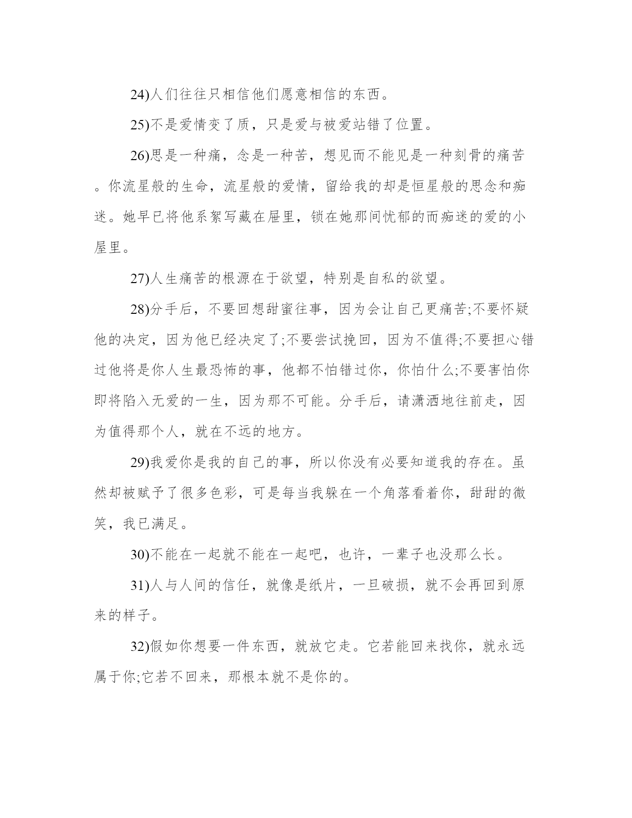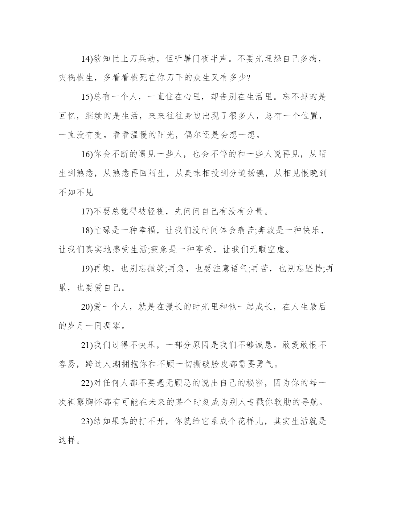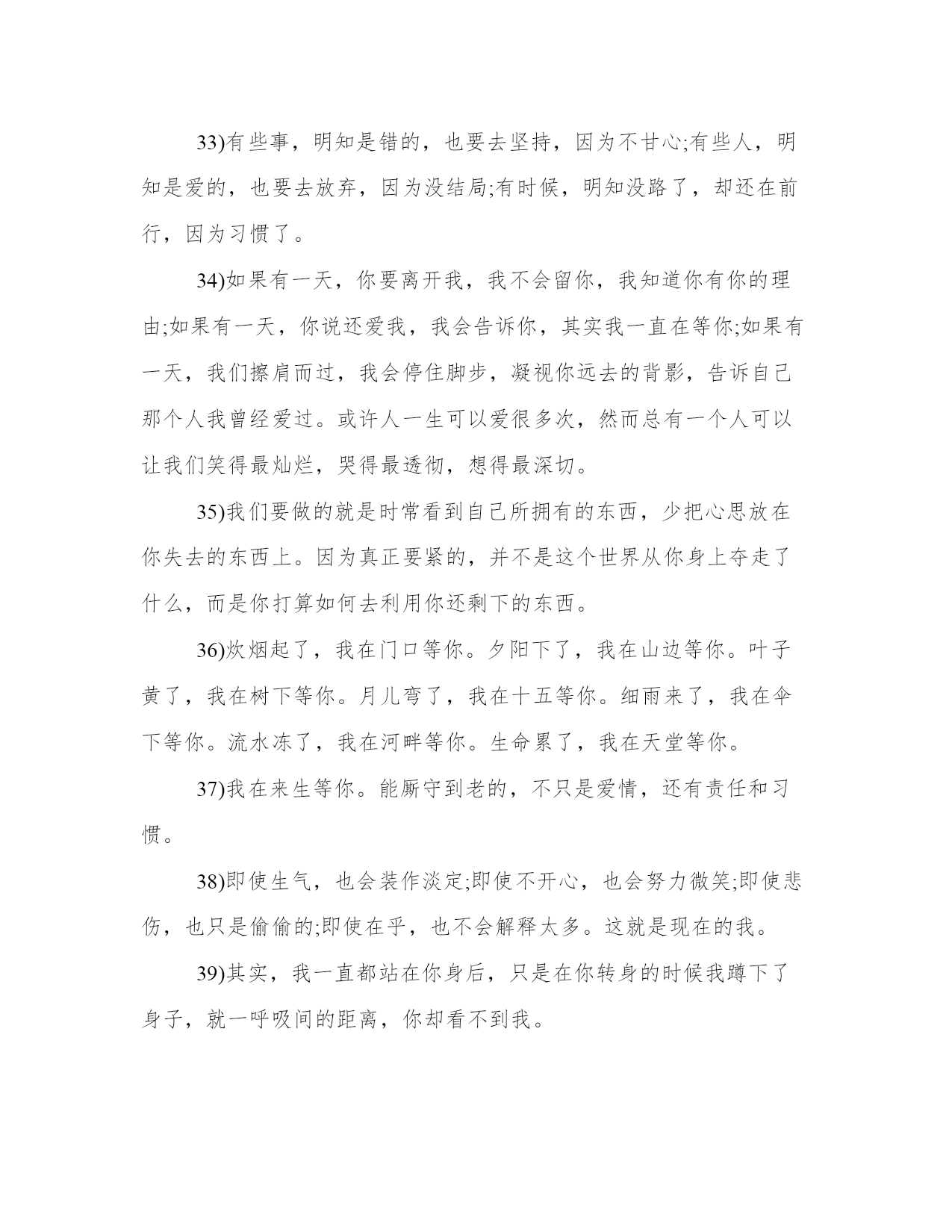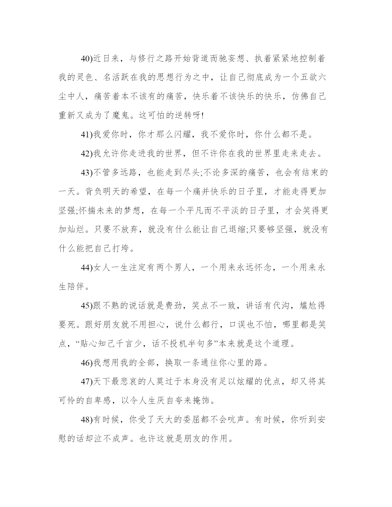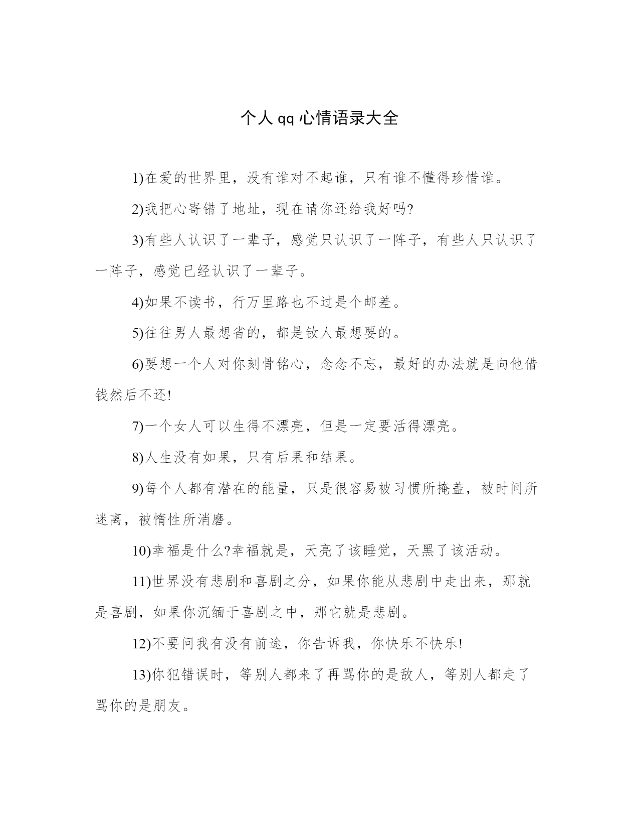 个人qq心情语录大全1)在爱的世界里,没有谁对不起谁,只有谁不懂得珍惜谁。2)我把心寄错了地址,现在请你还给我好吗?3)有些人认识了一辈子,感觉只认识了一阵子,有些人只认识了一阵子,感觉已经认识了一辈子。4)如果不读书,行万里路也不过是个邮差。5)往往男人最想省的,都是钕人最想要的。6)要想一个人对你刻骨铭心,念念不忘,最好的办法就是向他借钱然后不还!7)一个女人可以生得不漂亮,但是一定要活得漂亮。8)人生没有如果,只有后果和结果。9)每个人都有潜在的能量,只是很容易被习惯所掩盖,被时间所迷离,被惰性所消磨。10)幸福是什么?幸福就是,天亮了该睡觉,天黑了该活动。11)世界没有悲剧和喜剧之分,如果你能从悲剧中走出来,那就是喜剧,如果你沉缅于喜剧之中,那它就是悲剧。12)不要问我有没有前途,你告诉我,你快乐不快乐!13)你犯错误时,等别人都来了再骂你的是敌人,等别人都走了骂你的是朋友。14)欲知世上刀兵劫,但听屠门夜半声。不要光埋怨自己多病,灾祸横生,多看看横死在你刀下的众生又有多少?15)总有一个人,一直住在心里,却告别在生活里。忘不掉的是回忆,继续的是生活,来来往往身边出现了很多人,总有一个位置,一直没有变。看看温暖的阳光,偶尔还是会想一想。16)你会不断的遇见一些人,也会不停的和一些人说再见,从陌生到熟悉,从熟悉再回陌生,从臭味相投到分道扬镳,从相见恨晚到不如不见……17)不要总觉得被轻视,先问问自己有没有分量。18)忙碌是一种幸福,让我们没时间体会痛苦;奔波是一种快乐,让我们真实地感受生活;疲惫是一种享受,让我们无暇空虚。19)再烦,也别忘微笑;再急,也要注意语气;再苦,也别忘坚持;再累,也要爱自己。20)爱一个人,就是在漫长的时光里和他一起成长,在人生最后的岁月一同凋零。21)我们过得不快乐,一部分原因是我们不够诚恳。敢爱敢恨不容易,跨过人潮拥抱你和不顾一切撕破脸皮都需要勇气。22)对任何人都不要毫无顾忌的说出自己的秘密,因为你的每一次袒露胸怀都有可能在未来的某个时刻成为别人专戳你软肋的导航。23)结如果真的打不开,你就给它系成个花样儿,其实生活就是这样。24)人们往往只相信他们愿意相信的东西。25)不是爱情变了质,只是爱与被爱站错了位置。26)思是一种痛,念是一种苦,想见而不能见是一种刻骨的痛苦。你流星般的生命,流星般的爱情,留给我的却是恒星般的思念和痴迷。她早已将他系絮写藏在屉里,锁在她那间忧郁的而痴迷的爱的小屋里。27)人生痛苦的根源在于欲望,特别是自私的欲望。28)分手后,不要回想甜蜜往事,因为会让自己更痛苦;不要怀疑他的决定,因为他已经决定了;不要尝试挽回,因为不值得;不要担心错过他将是你人生最恐怖的事,他都不怕错过你,你怕什么;不要害怕你即将陷入无爱的一生,因为那不可能。分手后,请潇洒地往前走,因为值得那个人,就在不远的地方。29)我爱你是我的自己的事,所以你没有必要知道我的存在。虽然却被赋予了很多色彩,可是每当我躲在一个角落看着你,甜甜的微笑,我已满足。30)不能在一起就不能在一起吧,也许,一辈子也没那么长。31)人与人间的信任,就像是纸片,一旦破损,就不会再回到原来的样子。32)假如你想要一件东西,就放它走。它若能回来找你,就永远属于你;它若不回来,那根本就不是你的。33)有些事,明知是错的,也要去坚持,因为不甘心;有些人,明知是爱的,也要去放弃,因为没结局;有时候,明知没路了,却还在前行,因为习惯了。34)如果有一天,你要离开我,我不会留你,我知道你有你的理由;如果有一天,你说还爱我,我会告诉你,其实我一直在等你;如果有一天,我们擦肩而过,我会停住脚步,凝视你远去的背影,告诉自己那个人我曾经爱过。或许人一生可以爱很多次,然而总有一个人可以让我们笑得最灿烂,哭得最透彻,想得最深切。35)我们要做的就是时常看到自己所拥有的东西,少把心思放在你失去的东西上。因为真正要紧的,并不是这个世界从你身上夺走了什么,而是你打算如何去利用你还剩下的东西。36)炊烟起了,我在门口等你。夕阳下了,我在山边等你。叶子黄了,我在树下等你。月儿弯了,我在十五等你。细雨来了,我在伞下等你。流水冻了,我在河畔等你。生命累了,我在天堂等你。37)我在来生等你。能厮守到老的,不只是爱情,还有责任和习惯。38)即使生气,也会装作淡定;即使不开心,也会努力微笑;即使悲伤,也只是偷偷的;即使在乎,也不会解释太多。这就是现在的我。39)其实,我一直都站在你身后,只是在你转身的时候我蹲下了身子,就一呼吸间的距离,你却看不到我。40)近日来,与修行之路开始背道而驰妄想、执着紧紧地控制着我的灵色、名活跃在我的思想行为之中,让自己彻底成为一个五欲六尘中人,痛苦着本不该有的
