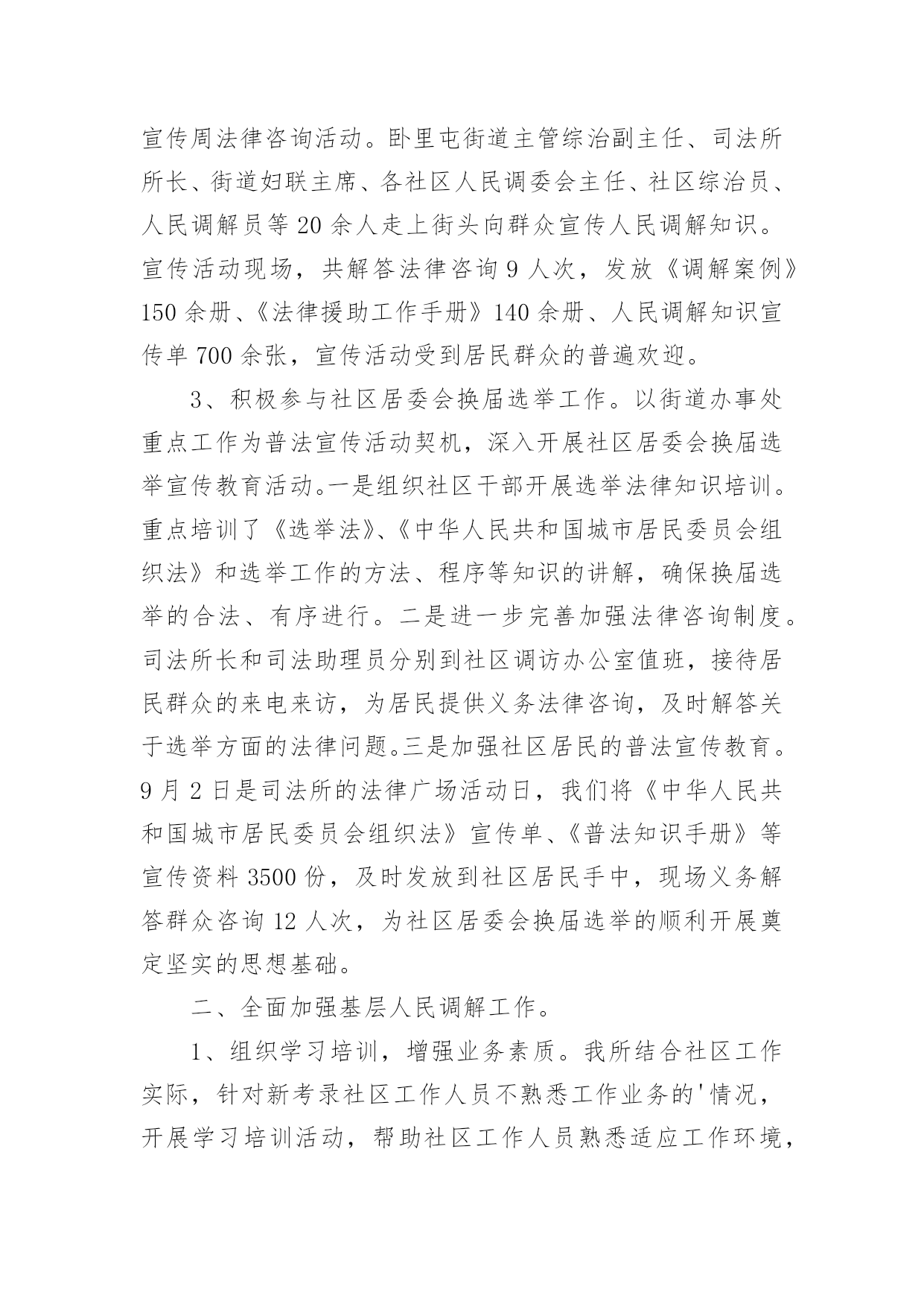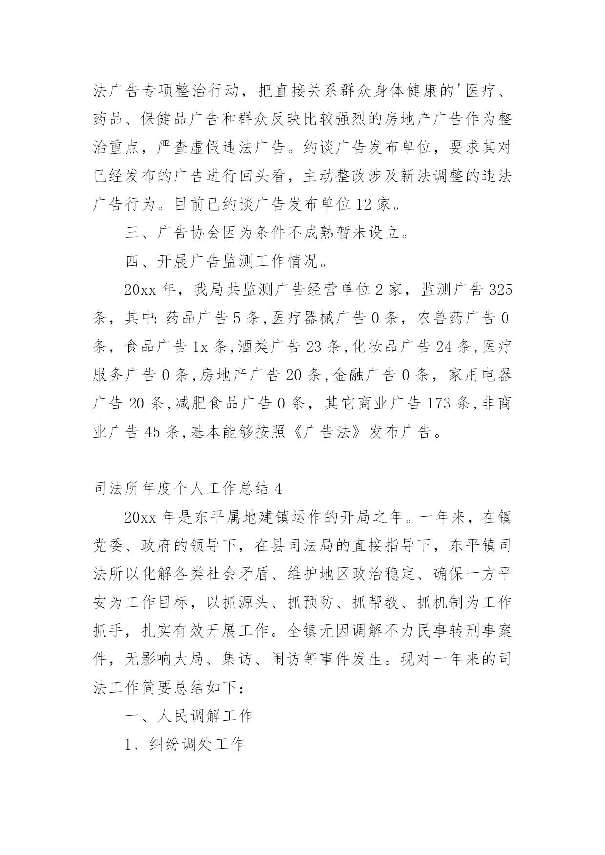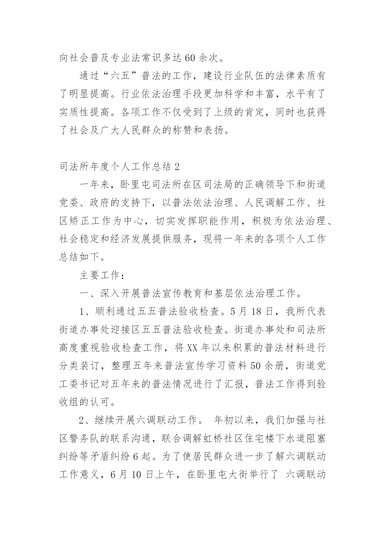 司法所年度个人工作总结总结就是把一个时间段取得的成绩、存在的问题及得到的经验和教训进行一次全面系统的总结的书面材料,它可使零星的、肤浅的、表面的感性认知上升到全面的、系统的、本质的理性认识上来,不妨坐下来好好写写总结吧。我们该怎么写总结呢?以下是小编为大家收集的司法所年度个人工作总结,供大家参考借鉴,希望可以帮助到有需要的朋友。司法所年度个人工作总结1为继续深入开展法制宣传教育和依法治理工作,切实推进“法治xx”建设和建设领域法治建设,根据县委、县政府“六五”普法文件精神,自20xx年以来,我局认真实施“六五”普法规划,积极落实“六五”普法工作,在“六五”普法中期考核验收之际,按计划、有步骤地完成了前半个规划期的各项目标任务,为全市营造和谐、稳定的社会环境和公正、高效的法治环境,作出了重要贡献。一、高度重视,加强领导,确保普法教育工作组织保障(一)制定了“六五”普法规划作为“六五”普法的启动年,20xx年我局根据xx县“六五”普法规划精神,在总结和回顾“五五”普法经验的基础上,全面分析建设行业普法和法治工作现状,制定了《关于在建设系统开展法制宣传教育和依法治理的第六个五年规划的通知》,对五年法制宣传教育和依法治理工作进行了全面部署。规划明确了我局“六五”普法的指导思想、总体目标和工作原则、主要任务、主要工作要求、工作步骤与安排、组织领导和保障等。将普法教育和依法治理工作纳入重要议事日程,定期和不定期召开普法工作协调会,听取普法工作的情况汇报,协调解决普法工作中的问题。(二)健全了普法工作机构普治工作是一个系统工程,具有全局性的战略意义。对此,局党组给予了高度的重视。为加强对“六五”普法工作的领导,成立了局系统普法依法治理领导小组,由局长担任领导小组组长,党委书记、分管领导任副组长,局股室及局直各单位为成员。并根据领导变动情况及时予以调整充实。领导小组下设办公室。局系统普法依法治理领导小组每季度定期召开领导小组成员会议,研究部署我局普法和依法治理工作,期间多次协调解决工作中的困难和问题。(三)完善了普法工作制度普治工作的深入开展,不断在行业的管理工作中显现出积极的效果,为把普法工作认真、长期地坚持好,我们结合建设系统年度责任目标制建立了普法依法治理工作责任制。每年初,局系统普法依法治理领导小组制定本年度依法治市工作计划,明确本年度普法工作的目标任务和工作重点。于年中、年末一并进行打分考核,并规定此项标准是评先评优的硬性标准,凡普治工作达不到考核要求的,一律建议取消评先资格,形成了年初有目标、半年有小结、平时有督查、年终有考核的'目标管理体系。两年半里,系统各单位始终能够不放松对普治工作的关注和落实,通过这一制度发挥的作用,更推动了系统法制工作的深入开展。二、周密部署,细致安排,提高普法教育广度和深度按照“六五”普法规划确定的工作任务和要求,突出普法重点,拓宽宣传领域,丰富宣传形式,在实效上下功夫,收到了明显成效。(一)以领导干部为重点,认真开展学法活动按照上级要求,结合我局干部教育培训工作,制定了学习制度,扎实开展了领导干部学法培训教育工作。一是坚持每年邀请专家对局机关干部开设法制讲座,确保每年至少安排2次以上的法律知识讲座。目前已系统地学习了《物权法》、《婚姻法》、《合同法》、《行政许可法》及相关配套法律、法规,提高了局党委科学决策水平。二是局机关根据学习计划,坚持每隔一周的周一晚上学习制度。提高了工作人员的法律素养,形成了良好的风气。(二)以行政执法人员为重点,认真开展学考活动为全面实现行业管理由注重依靠行政手段管理向注重依靠运用法律手段管理的转变,提高执法人员和行业队伍法律素质势在必行,我局充分利用“六五”普法这一契机,认真组织好执法人员的培训工作。为把此项重点工作抓实抓好,我们制订和实施了全员学法的集中培训和辅导与自学相结合的制度,在全系统规定行政执法人员每年学法保证不少于60小时,全员学每年不少于40小时。其次,我们每年都组织2到3次的行政执法人员专题培训,并制定了《行政执法人员执法管理制度》。同时我们每年都组织“六五”普法干部法律知识考试,人手一本普法教材。三、齐心协力,不断创新,使普法工作真正惠及于民(一)不断深化了规范化服务型机关建设为进一步加快职能由管理型向服务型转变,我局采取了一系列措施,取得了明显成效。一是在施工单位广泛开展了法律知识进工地工作,对符合条件的工程项目要求建立农民工学校。对农民开展的法律常识和维权宣讲,取得了良好的法律效果和社会效果。二是认真贯彻实施《行政许可法》,将局里的全部行政许可项目纳入政府行政审批大厅,实行一站式服务,简化了办事流程,实现现场办结率不低于90%、按时办结率达100%。三是建立和完善行政执法监督机制,建立一支专业行政执法监督队伍,不断深化行政执法责任制,健全和完善评议