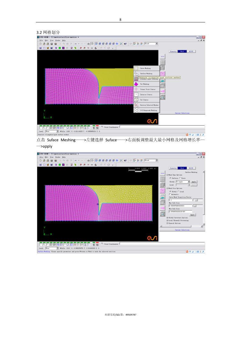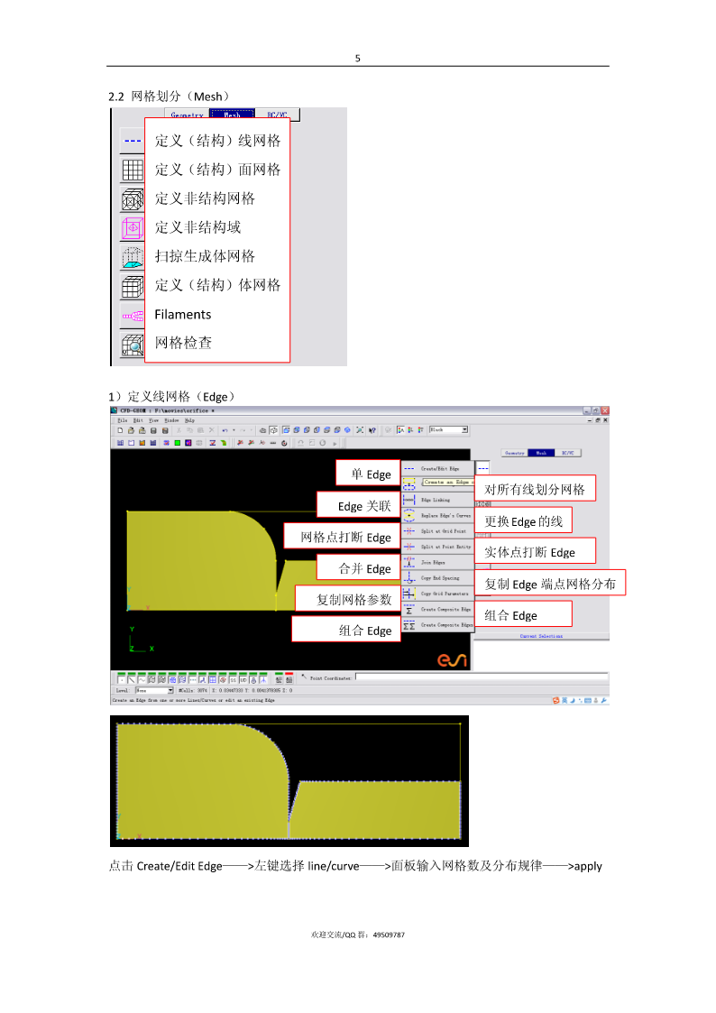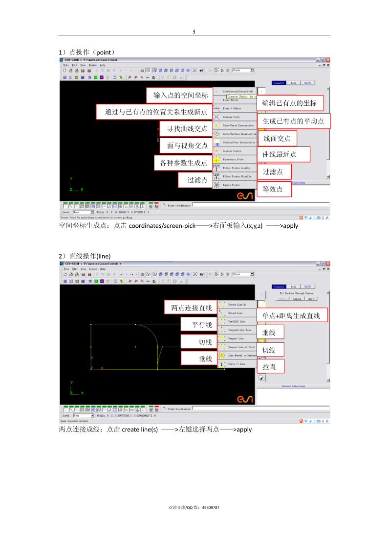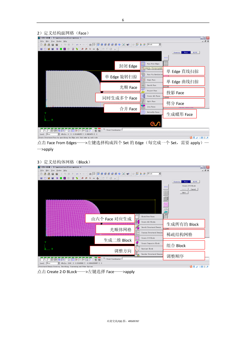 1CFD-GEOM入门教程(一)本教程主要用于初学者熟悉操作窗口、按钮及结构/非结构网格生成流程,对已经有使用经验的请漂过……算例说明:该算例为屈服孔算例,是CFD-ACE+标准算例中的一个,此处使用CFD-GEOM来生成模型。几何尺寸说明非结构网格结构网格1结构网格2网格生成结果欢迎交流/QQ群:495097872窗口熟悉1.文件操作按钮视图方位按钮实体/网格显示方式按钮几网何格边操操界作作设面面置板面板板实体/网格显示/隐藏按钮当前选择提示鼠标用途:左键旋转,右键移动,中键缩放基本操作步骤:点击操作(按钮)——>选择操作对象——>点击中键apply(——>右面板输入操作参数——>点击中键apply)2.结构网格生成2.1几何生成(Geometry)点操作直线操作圆/弧线操作曲线操作面操作带孔面操作体操作移动/旋转/缩放等打断/合并操作重叠操作离散面操作测量工具欢迎交流/QQ群:4950978731)点操作(point)输入点的空间坐标编辑已有点的坐标通过与已有点的位置关系生成新点生成已有点的平均点寻找曲线交点线面交点面与视角交点曲线最近点各种参数生成点过滤点过滤点等效点空间坐标生成点:点击coordinates/screen-pick——>右面板输入(x,y,z)——>apply2)直线操作(line)两点连接直线单点+距离生成直线平行线垂线切线切线垂线拉直两点连接成线:点击createline(s)——>左键选择两点——>apply欢迎交流/QQ群:4950978743)圆/弧线操作(Circle/Arc)三点圆两点圆圆心加半径三点弧线圆心加半径弧线椭圆抛物线三点弧线:点击3-pointArc——>左键选择三点——>apply4)面操作(Surface)封闭线直线扫掠旋转扫掠曲线扫掠任意两边四边复制加距离在网格面基础上生成投影转化为修整面转化为未修整面封闭线:点击FitThroughCurves——>左键依次选择封闭的线后——>apply欢迎交流/QQ群:4950978752.2网格划分(Mesh)定义(结构)线网格定义(结构)面网格定义非结构网格定义非结构域扫掠生成体网格定义(结构)体网格Filaments网格检查1)定义线网格(Edge)单Edge对所有线划分网格Edge关联更换Edge的线网格点打断Edge实体点打断Edge合并Edge复制Edge端点网格分布复制网格参数组合Edge组合Edge点击Create/EditEdge——>左键选择line/curve——>面板输入网格数及分布规律——>apply欢迎交流/QQ群:4950978762)定义结构面网格(Face)封闭Edge单Edge直线扫掠单Edge旋转扫掠单Edge曲线扫掠光顺Face投影Face同时生成多个Face劈分Face合并Face生成蝶形Face点击FaceFromEdges——>左键选择构成四个Set的Edge(每完成一个Set,需要apply)——>apply3)定义结构体网格(Block)由六个Face对应生成生成所有的Block光顺体网格稀疏结构网格生成二维Block组合Block调整方向调整顺序点击Create2-DBLock——>左键选择Face——>apply欢迎交流/QQ群:4950978773.非结构生成3.1几何生成点击FitThroughCurves——>左键选择封闭的line及Edge(在于结构网格重合的位置已有Edge,此时选择Edge,生成的非结构网格点与Edge点重合)——>apply欢迎交流/QQ群:4950978783.2网格划分点击SufaceMeshing——>左键选择Suface——>右面板调整最大最小网格及网格增长率——>apply欢迎交流/QQ群:4950978794.边界/体积条件设置问题类型边界条件体积条件Interface设定此步骤的工作都可以在ACE-GUI或FASTRAN-GUI中设定1)设