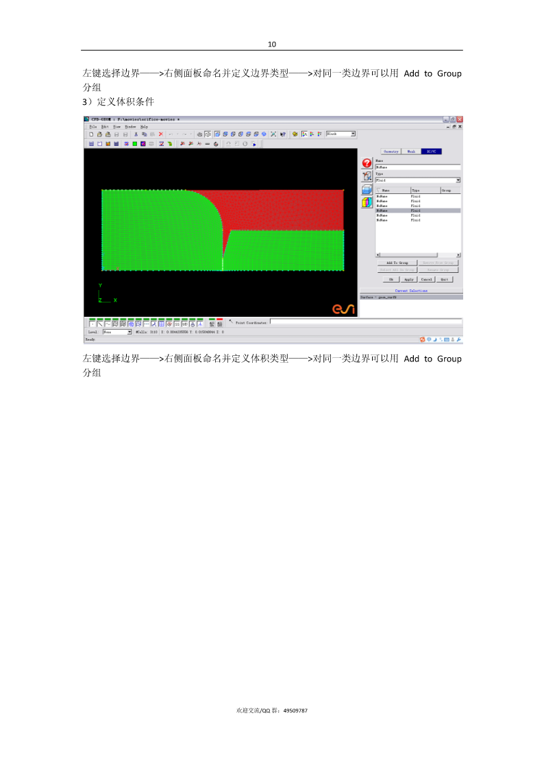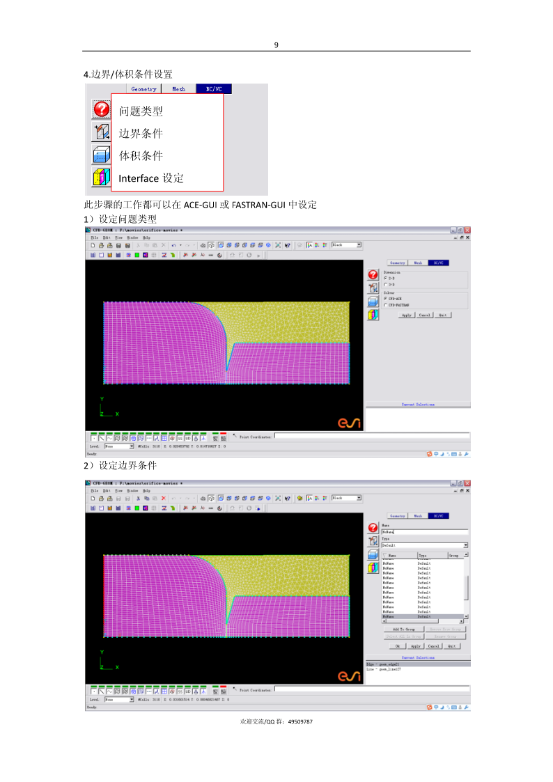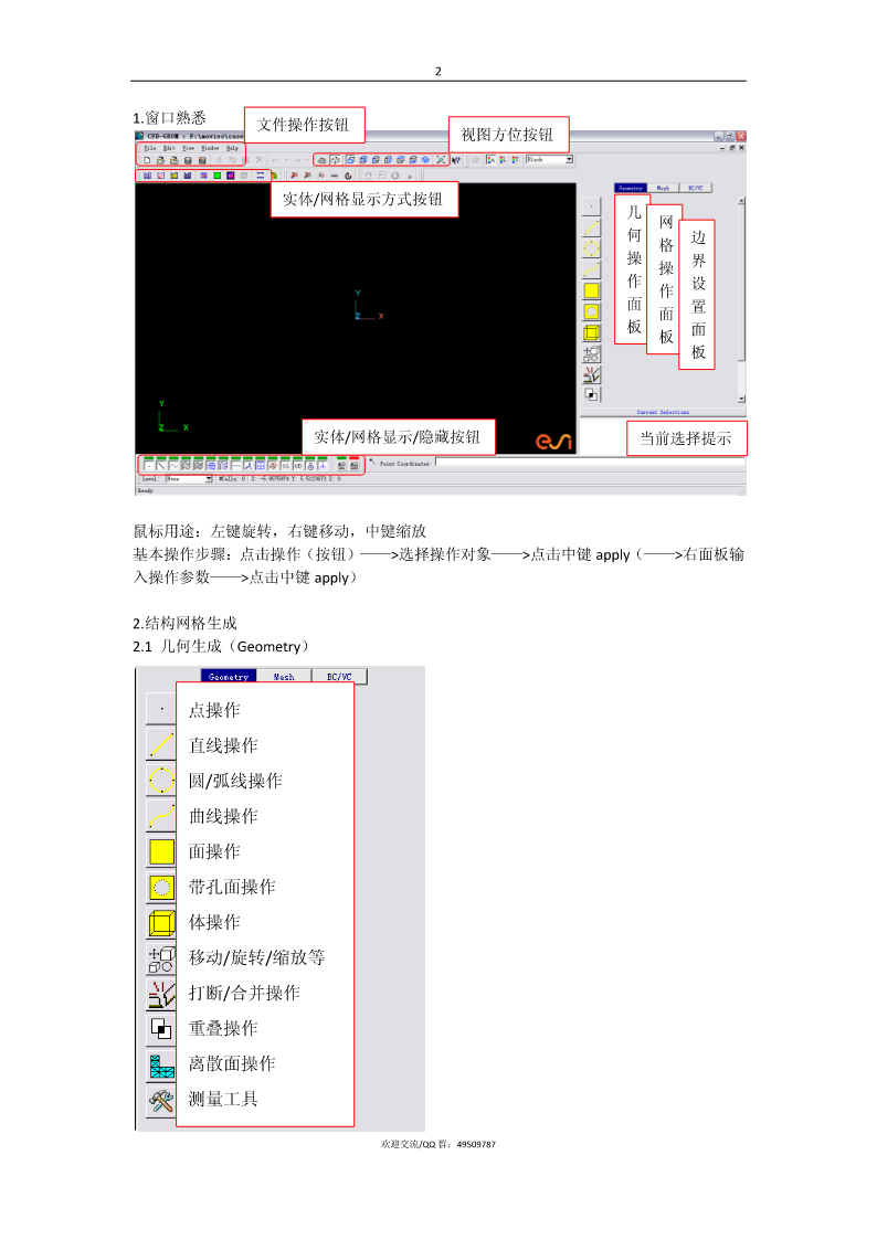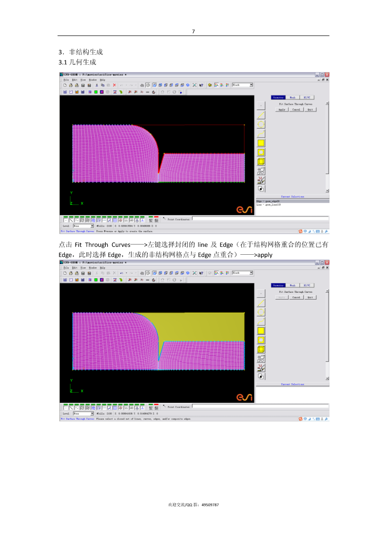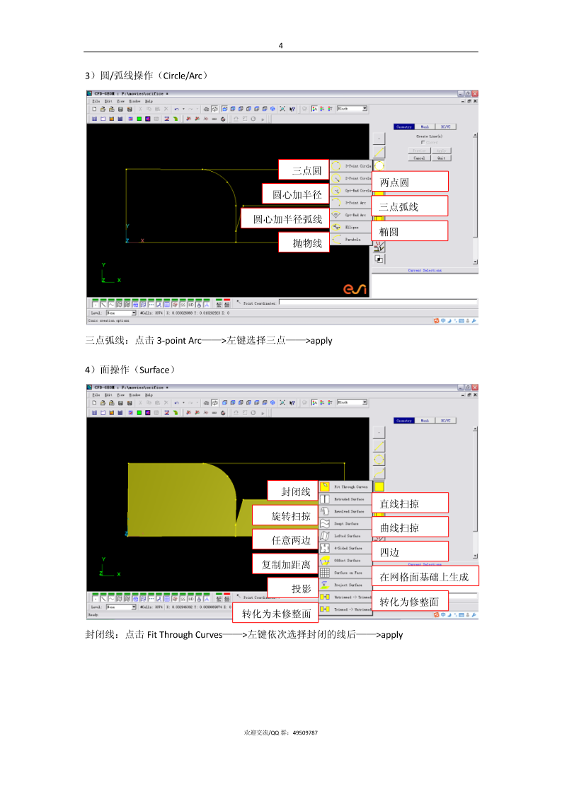 1CFD-GEOM入门教程(一)本教程主要用于初学者熟悉操作窗口、按钮及结构/非结构网格生成流程,对已经有使用经验的请漂过……算例说明:该算例为屈服孔算例,是CFD-ACE+标准算例中的一个,此处使用CFD-GEOM来生成模型。几何尺寸说明非结构网格结构网格1结构网格2网格生成结果欢迎交流/QQ群:495097872窗口熟悉1.文件操作按钮视图方位按钮实体/网格显示方式按钮几网何格边操操界作作设面面置板面板板实体/网格显示/隐藏按钮当前选择提示鼠标用途:左键旋转,右键移动,中键缩放基本操作步骤:点击操作(按钮)——>选择操作对象——>点击中键apply(——>右面板输入操作参数——>点击中键apply)2.结构网格生成2.1几何生成(Geometry)点操作直线操作圆/弧线操作曲线操作面操作带孔面操作体操作移动/旋转/缩放等打断/合并操作重叠操作离散面操作测量工具欢迎交流/QQ群:4950978731)点操作(point)输入点的空间坐标编辑已有点的坐标通过与已有点的位置关系生成新点生成已有点的平均点寻找曲线交点线面交点面与视角交点曲线最近点各种参数生成点过滤点过滤点等效点空间坐标生成点:点击coordinates/screen-pick——>右面板输入(x,y,z)——>apply2)直线操作(line)两点连接直线单点+距离生成直线平行线垂线切线切线垂线拉直两点连接成线:点击createline(s)——>左键选择两点——>apply欢迎交流/QQ群:4950978743)圆/弧线操作(Circle/Arc)三点圆两点圆圆心加半径三点弧线圆心加半径弧线椭圆抛物线三点弧线:点击3-pointArc——>左键选择三点——>apply4)面操作(Surface)封闭线直线扫掠旋转扫掠曲线扫掠任意两边四边复制加距离在网格面基础上生成投影转化为修整面转化为未修整面封闭线:点击FitThroughCurves——>左键依次选择封闭的线后——>apply欢迎交流/QQ群:4950978752.2网格划分(Mesh)定义(结构)线网格定义(结构)面网格定义非结构网格定义非结构域扫掠生成体网格定义(结构)体网格Filaments网格检查1)定义线网格(Edge)单Edge对所有线划分网格Edge关联更换Edge的线网格点打断Edge实体点打断Edge合并Edge复制Edge端点网格分布复制网格参数组合Edge组合Edge点击Create/EditEdge——>左键选择line/curve——>面板输入网格数及分布规律——>apply欢迎交流/QQ群:4950978762)定义结构面网格(Face)封闭Edge单Edge直线扫掠单Edge旋转扫掠单Edge曲线扫掠光顺Face投影Face同时生成多个Face劈分Face合并Face生成蝶形Face点击FaceFromEdges——>左键选择构成四个Set的Edge(每完成一个Set,需要apply)——>apply3)定义结构体网格(Block)由六个Face对应生成生成所有的Block光顺体网格稀疏结构网格生成二维Block组合Block调整方向调整顺序点击Create2-DBLock——>左键选择Face——>apply欢迎交流/QQ群:4950978773.非结构生成3.1几何生成点击FitThroughCurves——>左键选择封闭的line及Edge(在于结构网格重合的位置已有Edge,此时选择Edge,生成的非结构网格点与Edge点重合)——>apply欢迎交流/QQ群:4950978783.2网格划分点击SufaceMeshing——>左键选择Suface——>右面板调整最大最小网格及网格增长率——>apply欢迎交流/QQ群:4950978794.边界/体积条件设置问题类型边界条件体积条件Interface设定此步骤的工作都可以在ACE-GUI或FASTRAN-GUI中设定1)设