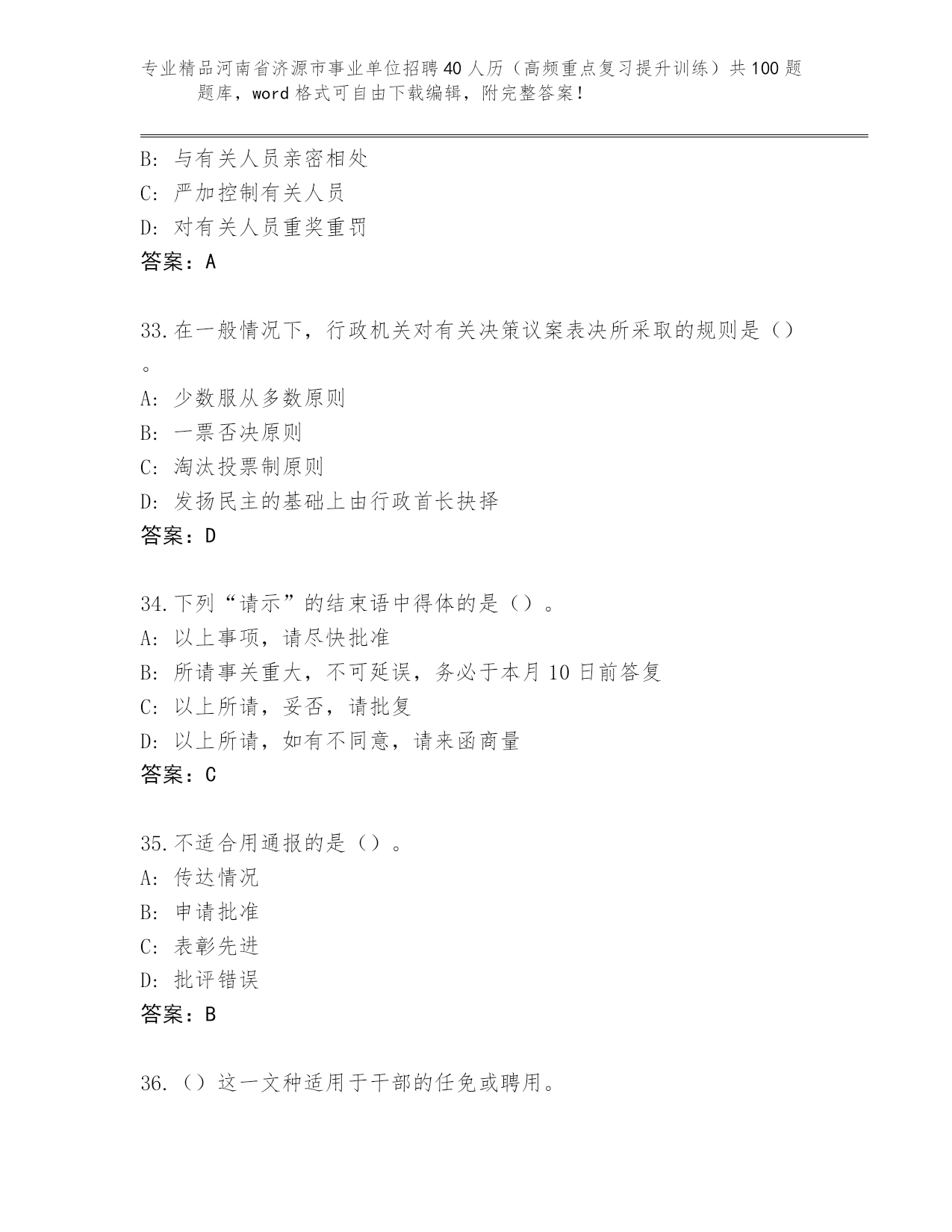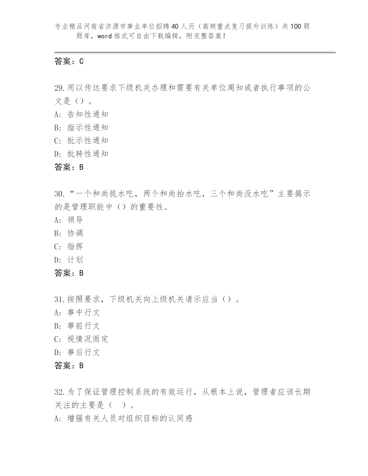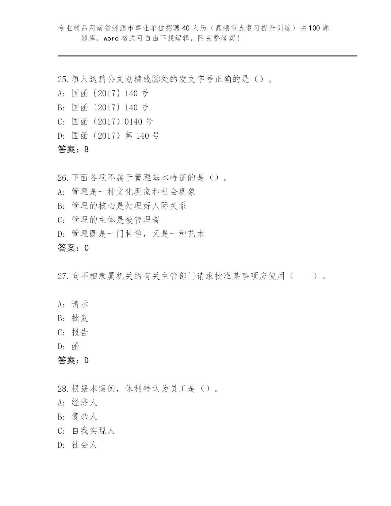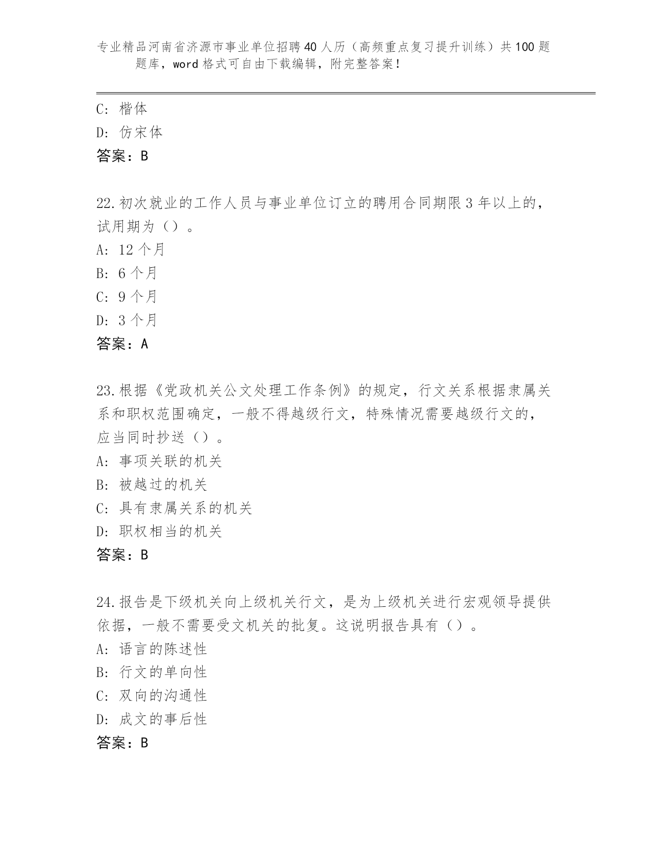 精编河南省济源市事业单位招聘40人历(高频重点复习提升训练)共100题 完整题库含答案下载