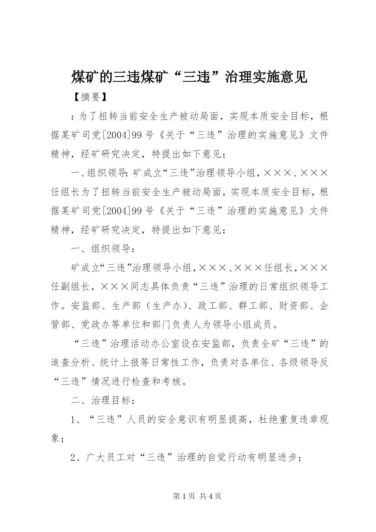 第PAGE\*Arabic\*MERGEFORMAT4页共NUMPAGES\*MERGEFORMAT4页煤矿的三违煤矿“三违”治理实施意见【摘要】:为了扭转当前安全生产被动局面,实现本质安全目标,根据某矿司党[2004]99号《关于“三违”治理的实施意见》文件精神,经矿研究决定,特提出如下意见:一、组织领导:矿成立“三违”治理领导小组,×××、×××任组长为了扭转当前安全生产被动局面,实现本质安全目标,根据某矿司党[2004]99号《关于“三违”治理的实施意见》文件精神,经矿研究决定,特提出如下意见:一、组织领导:矿成立“三违”治理领导小组,×××、×××任组长,×××任副组长,×××同志具体负责“三违”治理的日常组织领导工作。安监部、生产部(生产办)、政工部、群工部、财资部、企管部、党政办等单位和部门负责人为领导小组成员。“三违”治理活动办公室设在安监部,负责全矿“三违”的追查分析、统计上报等日常性工作,负责对各单位、各级领导反“三违”情况进行检查和考核。二、治理目标:1、“三违”人员的安全意识有明显提高,杜绝重复违章现象;2、广大员工对“三违”治理的自觉行动有明显进步;3、“三违”人数有大幅度下降;4、消除违章因素造成的各类事故,实现安全年。三、“三违”的处理程序:先由矿安监部初步追查,事实清楚,属“三违”行为后,按照追查分析、现身说法、停班学习、帮教提高、行政处罚、张榜公示、电视爆光、亲属签字、建档立卡、业务考试的“三违”处理程序进行。1、追查分析。由矿安监部组织,相关部门领导、“三违”人员及单位负责人、发现“三违”人员参加。2、现身说法。“三违”人员在本单位安全活动时,结合自身“三违”事实,谈认识、谈体会,吸取教训,保证不再违章。由各单位主管负责。3、停班学习。停班学习的形式采取自学和集中学习相结合,一般“三违”集中学习一周,严重“三违”集中学习10天,集中学习由财资部负责。4、帮教提高。井级以上的领导、政工部长、群工部长、支部书记对“三违”人员进行谈话,帮助“三违”人员提高认识。5、行政处罚。按照“三违”治理的条款进行处罚。6、张榜公示。在公示栏公布处罚结果。7、电视爆光。政工部组织,电讯中心对“三违”人员的追查、谈话、处理进行电视爆光。8、亲属签字。“三违”人员在停班学习期间,通过认识,写出安全保证书,家属或亲人在安全保证书上签名。由单位支部书记负责。9、建档立卡。对各类“三违”人员安监部建立追查、处理档案,记录清楚。10、业务考试。停班学习期满前二天,“三违”人员带家属或亲人签字的安全保证书,进行业务知识考试,考试时严格按照教考分离的办法执行,考试不合格,将延长停班学习时间,直至考试合格后方可上岗,具体由财资部组织。四、治理措施:(一)认真抓好舆论引导和宣传教育,增强对“三违”治理的责任感和紧迫感。今年以来,集团公司安全生产形势十分严峻,虽然我矿总体安全形势基本稳定,但工伤事故时有发生,有些事故性质还相当严重,究其原因都是因“三违”造成的,“三违”行为屡禁不止,少数“三违”人员及习惯性违章屡教不改,已严重威胁职工生命安全和国家财产,必须下大力气治理“三违”,否则,很难维持企业正常的生产经营活动。基层各单位特别是党政主要领导要充分认识到“三违”是造成各类事故的根源,也是影响企业形象和制约企业发展的“顽症”。各单位、各部门、各级领导干部要提高对反“三违”的认识,治理“三违”事关职工生命安全和切身利益,事关企业利益和矿井安1/3123下一页尾页