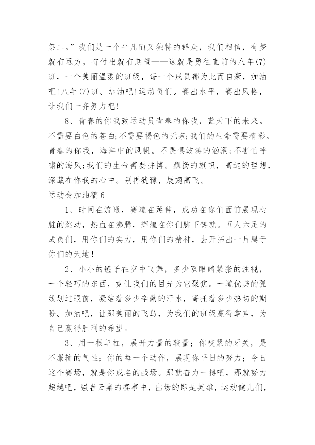 运动会加油稿运动会加油稿在社会发展不断提速的今天,越来越多人会去使用加油稿,借助加油稿可以更好地为他人加油打气。为了让您在写加油稿时更加简单方便,以下是小编为大家整理的运动会加油稿,欢迎阅读与收藏。运动会加油稿11、青春无畏,逐梦扬威。2、互相学习,取长补短,再接再厉,勇攀高峰。3、与时俱进,开拓创新,顽强拼搏,勇夺第一。4、锻炼意志,强身健体。5、七彩阳光,积极向上。6、体育如花绽放快乐校园,青春似火燃烧亮丽人生。7、努力拼搏,锐意进取。8、青春如火,超越自我,八年五班,奋勇拼搏。9、用心积极,努力拼搏,磨练意志,强健体魄。10、励精图治,开拓进取。11、顽强拼搏,勇夺第一。12、体坛青春际会,校园运动乐章。13、健康的体魄,永恒的追求。14、互相学习,取长补短,再接再厉,勇攀高峰。15、不爱运动,浑身病痛;天天锻炼,身体壮健。16、济师精英,顽强拼搏。17、努力奋斗,勇敢争先。18、运动会加油稿简短有力19、奋力拼搏,勇于攀登。20、励精图治,奋发向上,努力拼搏,永不言弃。21、挑战自我,突破极限;奋发拼搏,勇于开拓。22、利剑出鞘,倒海翻江。23、努力拼搏,锐意进取,携手奋进,共创佳绩。24、强身健体,立志成材。25、时不我待,努力举绩,一鼓作气,挑战佳绩。26、浓墨重彩写大运,拼搏自强走人生。27、乘风破浪,奋勇激昂。28、意气奋发,斗志昂扬。29、风起云涌,出水蛟龙;唯我八班,傲视群雄。30、不言失败,赛出风采。31、强身健体,终身幸福。32、顽强拼搏,积极向上。33、为了梦想,冲刺前进。34、锐不可当,超越自我,再创辉煌。35、英姿飒爽,步伐矫健。36、赛出风格,赛出水平;展现自我,争创新高。37、激流永进,永不言弃。38、发扬体育精神,提高师生素质。39、大踏步向前,让生命实现我们的光彩。40、挑战自我,突破极限。41、今天付出,明天收获,全力以赴,事业辉煌。42、团结,拼搏,向上!43、田径英姿多豪迈,趣味比赛亦精彩。44、努力拼搏,自强不息。45、挥动激情,放飞梦想,团结拼搏,树我雄风。46、爱我实中,赛出水平。47、与时俱进,奋发图强。48、团结奋进,争创一流;与时俱进,奋发图强。49、奋发拼搏,勇于开拓。50、只要拼,只要博,成功就在不远处。51、团结拼搏,争创佳绩。52、团结进取,开拓创新,顽强拼搏,争创一流。53、凌云赛场,斗志昂扬。54、让运动挥散汗水,让青春闪耀光芒。55、挥动活力,挑战自我,突破极限,超越自我。56、顽强拼搏,拥抱胜利,勇争第一。57、团结拼搏,超越自我。58、留下你的.汗水,展现你的风采,演绎一出精彩。59、敢闯敢拼,齐心协力,争创佳绩。60、磨砺意志,奋发冲刺。61、生命因运动精彩,体育让梦想成真。62、人人关心体育,体育造福人人。63、挑战运动极限,演绎健美人生。64、飞跃梦想,自强不息。65、挥动激情,放飞梦想。66、生命在于运动,成功在于拼搏。67、超越梦想,永不言弃。运动会加油稿21.坚定,执着,耐力与希望,在延伸的白色跑道中点点凝聚!力量,信念,拼搏与奋斗,在遥远的终点线上渐渐明亮!时代的强音正在你的脚下踏响。2.你们挥舞着充满力量的'双臂,看着实心球化成美丽的弧线,我着实在心里佩服你们,你们抛出了自己的水平。3.你们挥舞着充满力量的双臂,看着实心球化成美丽的弧线,我着实在心里佩服你们,你们抛出了自己的水平。4.环形的跑道一圈又一圈的坚持,毅力与精神活跃在会场上,湿透的衣衫,满头的大汗,无限追求、奋力追赶,我们为你欢呼跳跃,我们为你骄傲。5.你的汗水洒在跑道,浇灌着成功的花朵开放;你的欢笑飞扬在赛场,为班争光数你最棒;跑吧,追吧,在这广阔的赛场上,你似骏马似离铉的箭;跑吧,追吧,你比虎猛比豹强。运动会加油稿3只有运动会使山穷水尽变得柳暗花明,会使卑微的生命变得悲壮与伟大。运动健儿们,我们看到了,透过你们晶莹的汗水,我们看到了xx的希望,越过你们奔腾的脚步,我们看到了希望,看到了希望的明天。旅行,生命这没有回程的运动场。拓荒,生命这没有回头的运动场。感动,你们运动的'精神,拼博的勇气。运动会加油稿4运动员,当你驰骋在运动场上,你便征服了别人,你便征服了自己。站再那坚硬的起跑线前,也就是成就你梦想的时刻。是的,有很多梦是遥不可及的,但梦想是可以成真的。克雷洛夫有句名言:现实在此岸,理想在彼岸,中间隔着湍急的河流。努力行动则是架在川上的桥梁。要从现实的此岸,到达理想的彼岸,重在努力,重在自信。贵在坚持,而这更应该是我们运动健儿的精神。雄鹰属于蓝天,激流属于大海,而我们的.运动员则属于绿茵茵的草地。那是希望升起的地方,也将是胜利降临的舞台。自信的运动健儿们,当你们为梦想而拼搏,为胜利而流汗时,也在为我们xx中争光。运动会加油稿51、年轻的我们自信飞扬,青春的气息如同出生