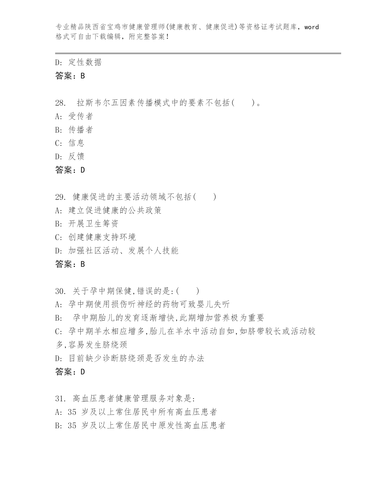 优选陕西省宝鸡市健康管理师(健康教育、健康促进)等资格证考试王牌题库及答案【全国通用】
