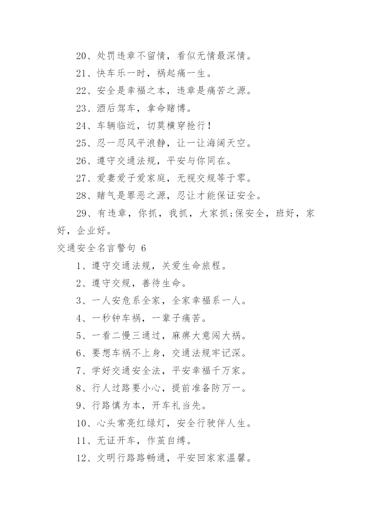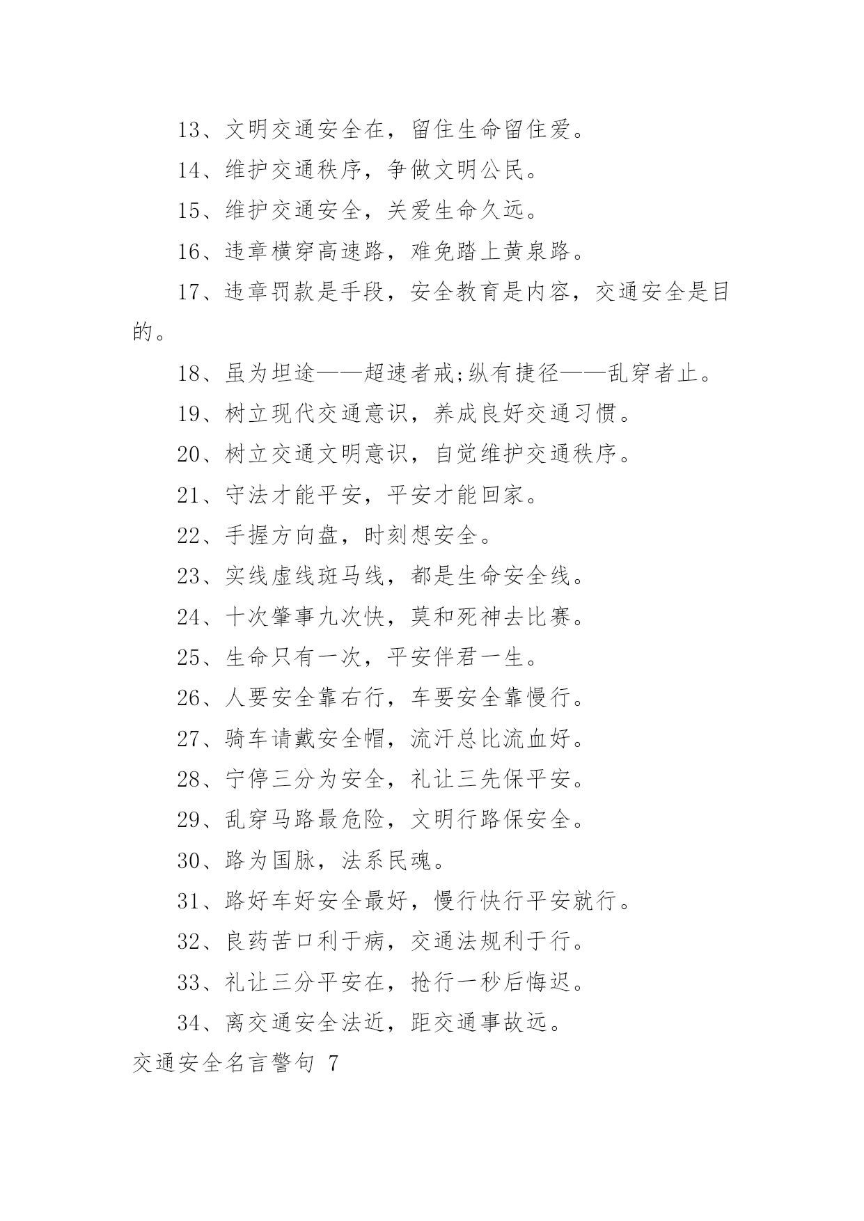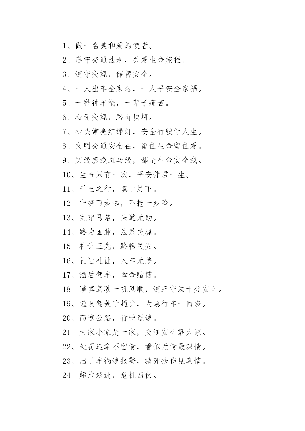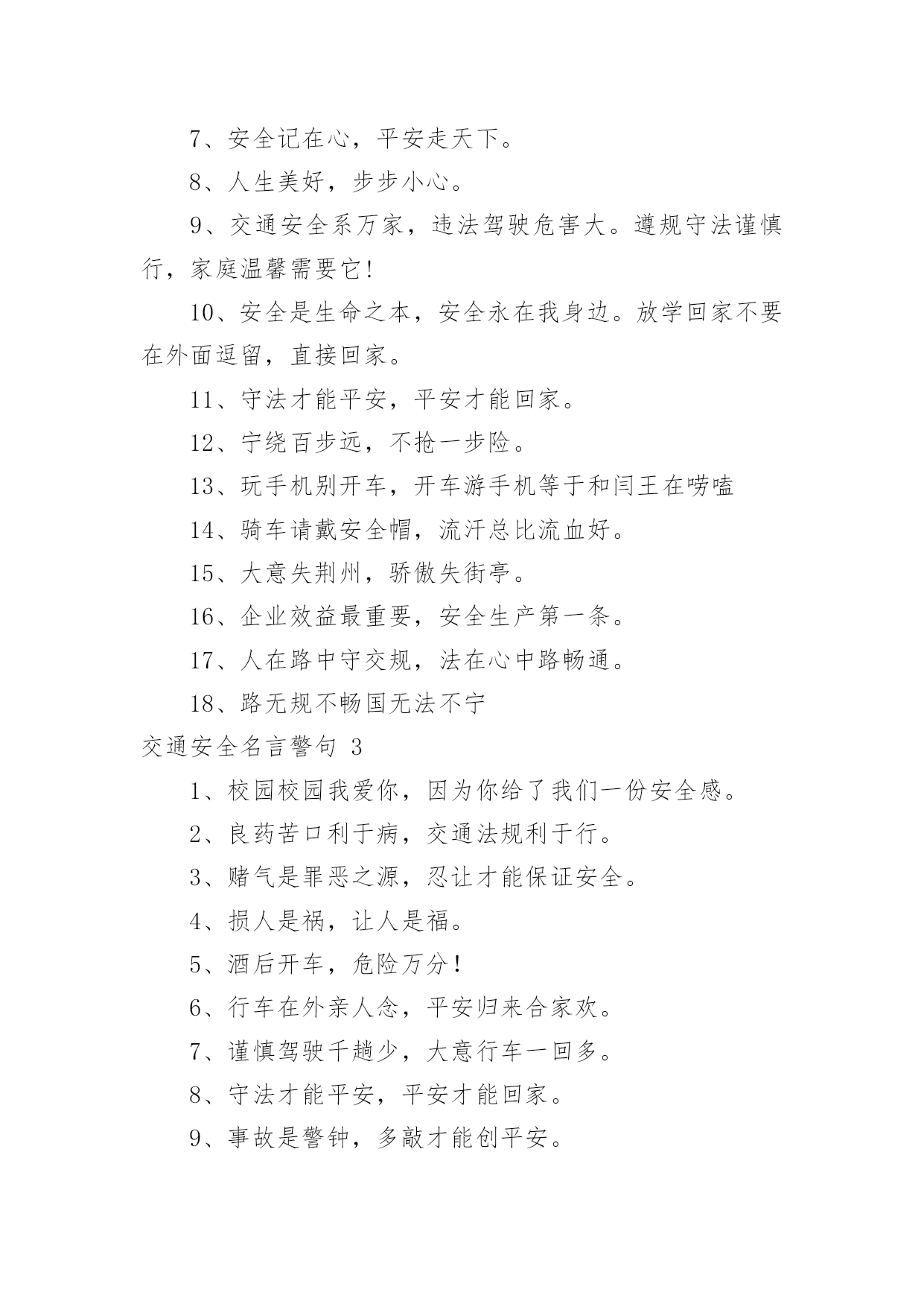 交通安全名言警句交通安全名言警句在日常学习、工作或生活中,大家都经常接触到名言警句吧,多看多背一些名言警句可以丰富知识水平,提高自己的文学修养。什么样的名言警句才是好的名言警句呢?以下是小编为大家收集的交通安全名言警句,仅供参考,大家一起来看看吧。交通安全名言警句11、法规在心中,平安在手中。2、心头常亮红绿灯,安全行驶伴人生。3、守交规迎春夏秋冬福,保安全纳东西南北财。4、讲究交通公德,遵守交通法规。5、法规记心中,三思而后行。6、别让酒瓶与你一起上路,交通安全须靠你我维护。7、礼让礼让,人车无恙。8、穿马路,跨护栏,少公德,多危险。9、守法的人以教训换流血,违法的'人以流血换教训。10、违章是安全的大敌,车祸的朋友。11、交通安全进万家,出入平安你我他。12、车来人往两相让,山重水复一片天。13、维护交通秩序,争做文明公民。14、处罚违章不留情,看似无情最深情。15、酒后驾车者,医院给你开好了房间。16、狭路相逢“让”者胜,两车相顶“退”者赢。17、交通法规人人遵守,文明城市处处安全。18、路好车好安全最好,慢行快行平安才行。19、何愁路途多遥远,遵守法规保平安。20、骑好车、走好路、安全伴您每一步。21、加强综合治理,保障交通安全。22、大家小家是一家,交通安全靠大家。23、记住安全就二字,就能平安走天下。24、勿以快慢论英雄,安全行车最光荣。25、居安思危危自小,有备无患患可除。26、享受通行权利,应尽安全义务。27、安全是天,安全是地,没有安全,就没有了天和地。28、人生美好,步步小心。29、手拉手打造文明交通,心连心创建和谐社会。30、开车多一分小心,家人多十分安心。交通安全名言警句21、超载超速,危机四伏。2、校园是我家,平安靠大家。3、举安全之盾,防事故之患。4、酒后驾车拿命赌博5、若要亲人勿牵挂,酒后不要把车驾。6、三思而后行,思命思家思社会。7、安全记在心,平安走天下。8、人生美好,步步小心。9、交通安全系万家,违法驾驶危害大。遵规守法谨慎行,家庭温馨需要它!10、安全是生命之本,安全永在我身边。放学回家不要在外面逗留,直接回家。11、守法才能平安,平安才能回家。12、宁绕百步远,不抢一步险。13、玩手机别开车,开车游手机等于和闫王在唠嗑14、骑车请戴安全帽,流汗总比流血好。15、大意失荆州,骄傲失街亭。16、企业效益最重要,安全生产第一条。17、人在路中守交规,法在心中路畅通。18、路无规不畅国无法不宁交通安全名言警句31、校园校园我爱你,因为你给了我们一份安全感。2、良药苦口利于病,交通法规利于行。3、赌气是罪恶之源,忍让才能保证安全。4、损人是祸,让人是福。5、酒后开车,危险万分!6、行车在外亲人念,平安归来合家欢。7、谨慎驾驶千趟少,大意行车一回多。8、守法才能平安,平安才能回家。9、事故是警钟,多敲才能创平安。10、酒性发作不由人,醉酒开车祸害深。11、宁可有理让无理,不可有理对无理。12、超载超速,危机四伏。13、爱妻爱子爱家庭,无视交规等于零。14、忍一忍风平浪静,让一让海阔天空。15、快快乐乐出门去,平平安安回家来。16、车辆行人守秩序,平安保身皆欢喜。17、维护交通秩序,遵守社会公德。18、要么是交警的'严格执法,要么是车祸的残酷无情。19、走过春夏秋冬,安全永驻心中。20、要想效益好,安全最重要。21、一人安危系全家,全家幸福系一人。22、学龄前儿童上街要有成年人带领。23、遵守交规,储蓄安全。24、遵守交通法规,平安与你同在。25、遵守交通法规,上路绝不吃亏。26、一人出车全家念,一人平安全家福。27、雨雪雾,限车速。28、最大的浪费是事故,最大的节约是安全。29、要想车祸不上身,交通法规牢记深。30、庄稼离不开阳光,安全少不了规章。交通安全名言警句41、骑车上路别着急,争、超、抢道不安全2、不开带病车上路3、行人一生平安,行车一路平安4、遵章守规连你我,道路畅通有保障5、交通法规是您生命之友!6、骑好车、走好路、安全伴您每一步7、遵守交通信号,遵守交通标志,遵守交通标线8、树立文明意识,搞好交通秩序9、违规是交通事故的祸根,侥幸是交通事故的'隐患10、良药苦口利于病,交通规则利于行11、路好车好安全最好,慢行快行平安才行12、讲究交通公德,遵守交通法规13、车铃车闸齐全,维系您的安全14、遵守交规得平安,道路畅通保安全15、骑车抢行一秒,危险增加十分16、交通安全抛脑后,交通事故在前头17、您保持车况良好,车容整洁18、交通安全在我心中!19、加强综合治理,保障交通安全20、学龄前儿童上街要有成年人带领21、穿马路,跨护栏,少公德,多危险22、上有老,下有小,出了交通事故不得了23、宣传交通法规,提高交通文明意识24、最大的浪费是事故,最大的节约是安全25、行横道是您横过马路的安