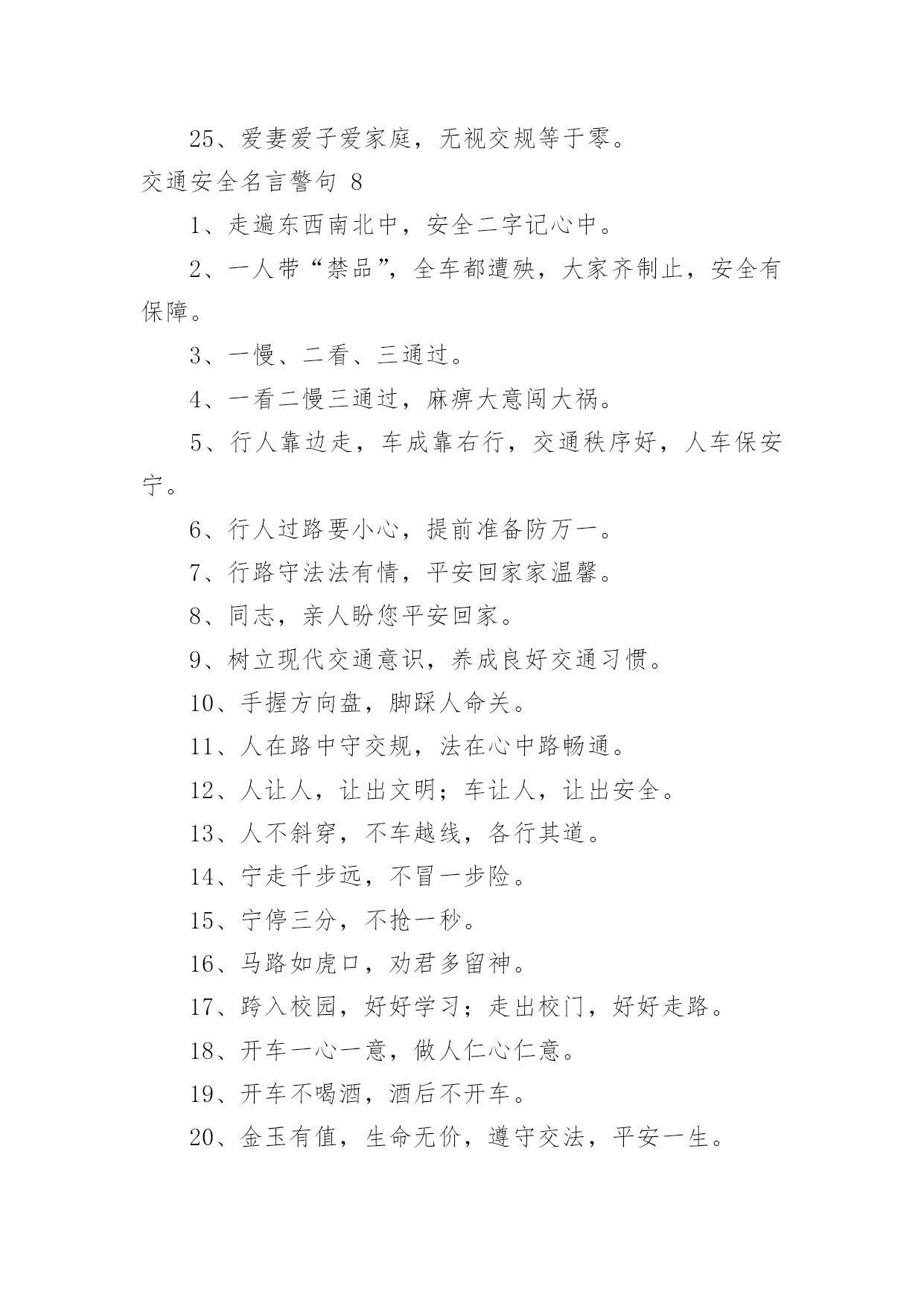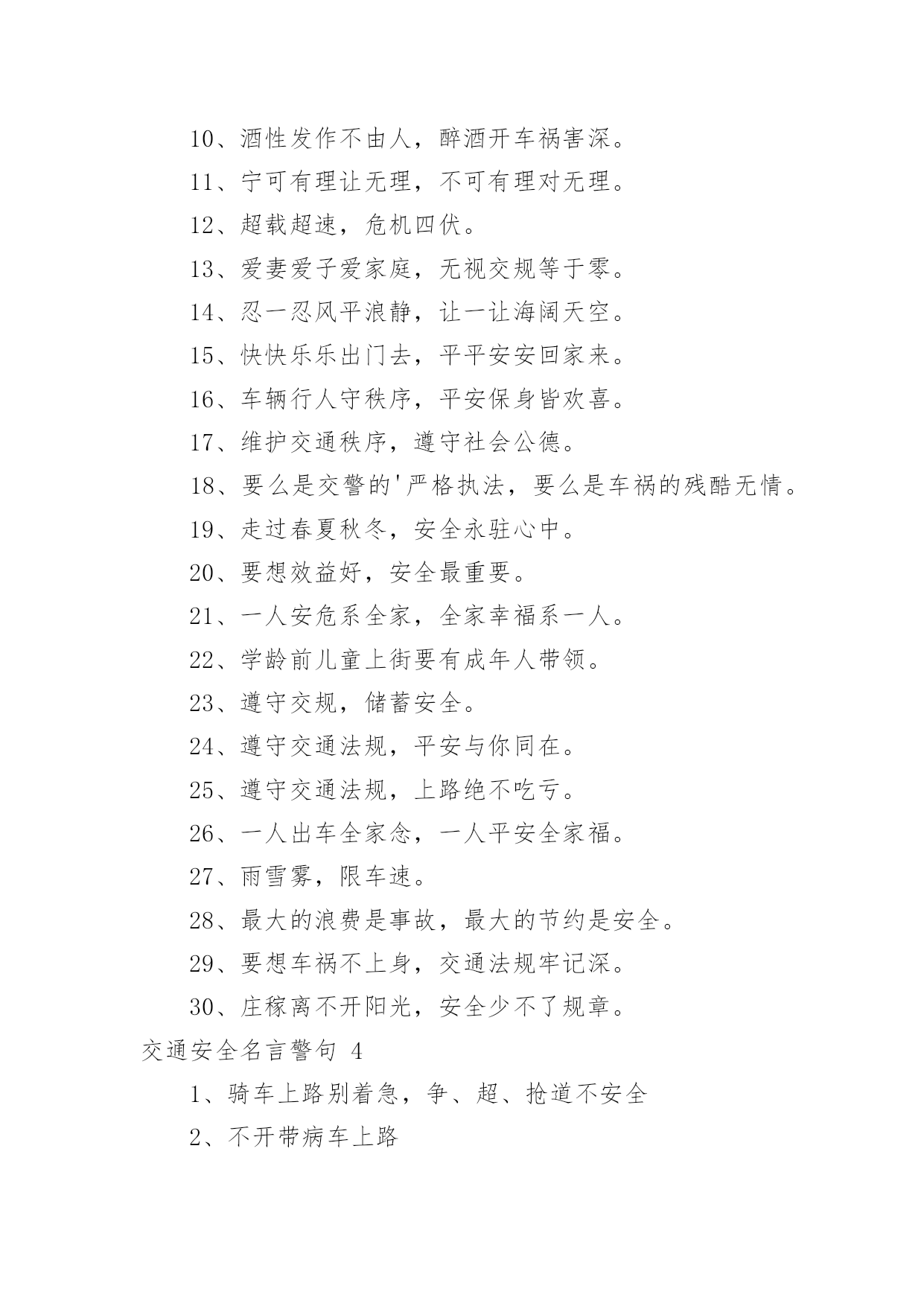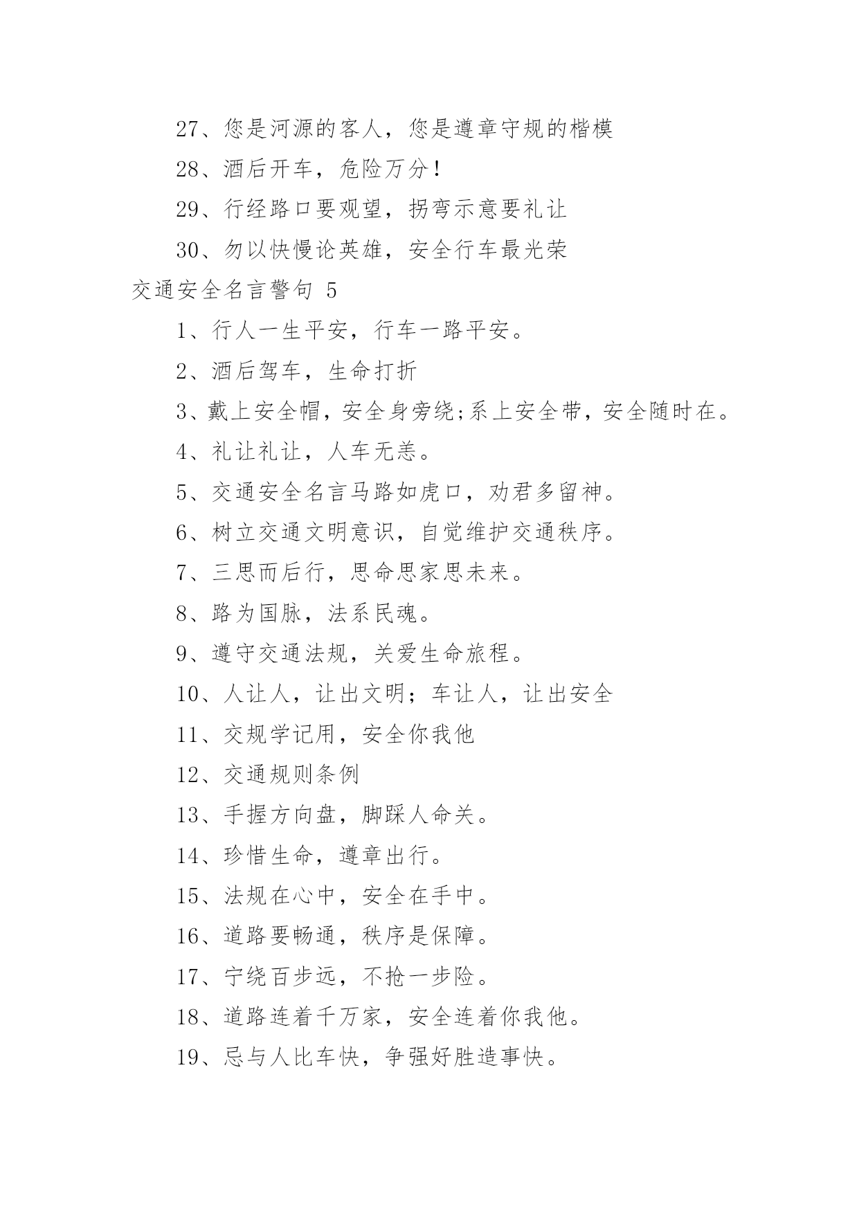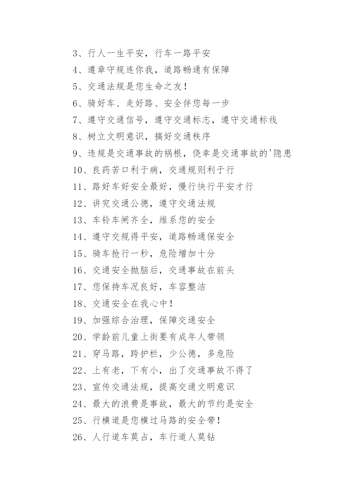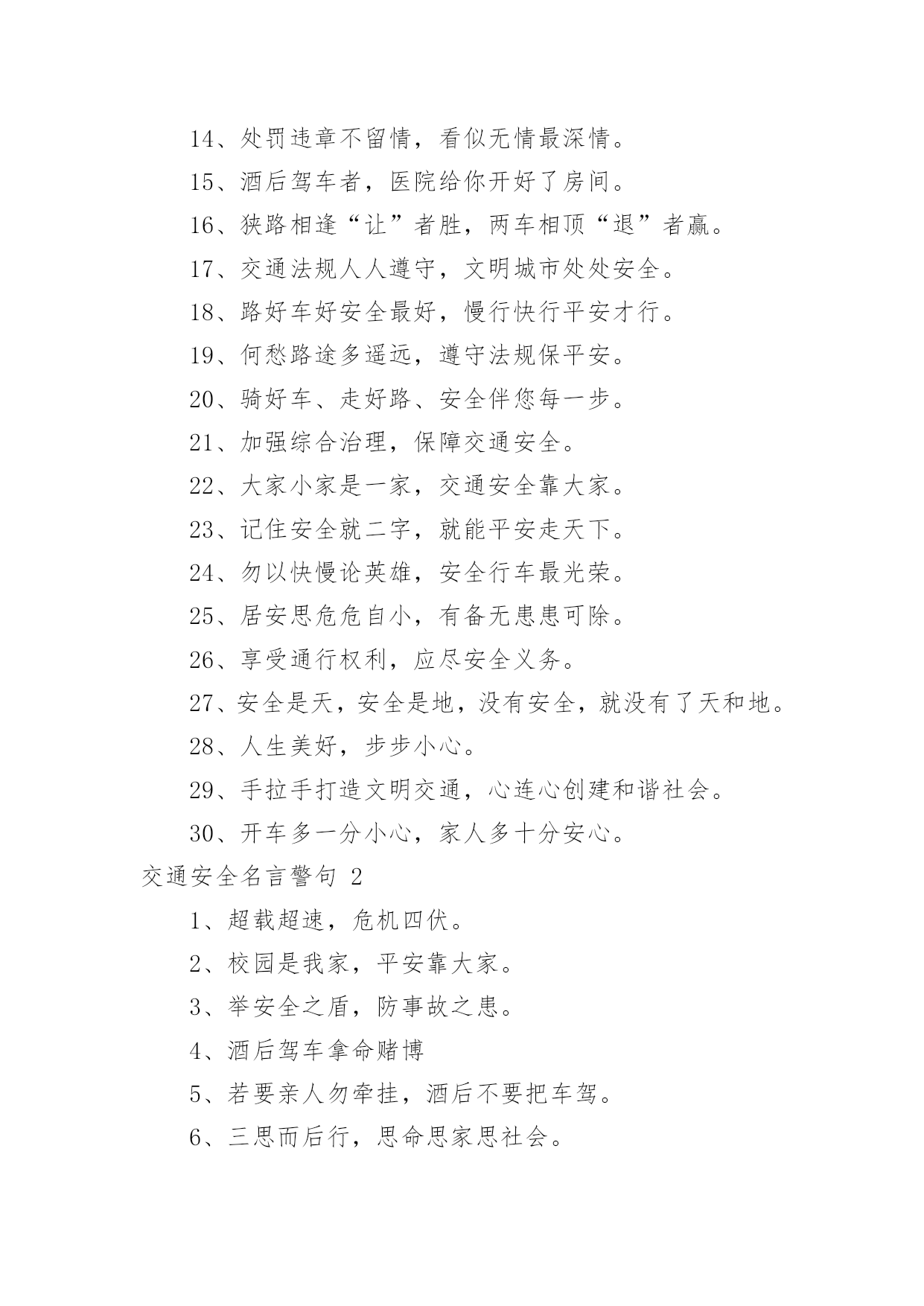 交通安全名言警句交通安全名言警句在日常学习、工作或生活中,大家都经常接触到名言警句吧,多看多背一些名言警句可以丰富知识水平,提高自己的文学修养。什么样的名言警句才是好的名言警句呢?以下是小编为大家收集的交通安全名言警句,仅供参考,大家一起来看看吧。交通安全名言警句11、法规在心中,平安在手中。2、心头常亮红绿灯,安全行驶伴人生。3、守交规迎春夏秋冬福,保安全纳东西南北财。4、讲究交通公德,遵守交通法规。5、法规记心中,三思而后行。6、别让酒瓶与你一起上路,交通安全须靠你我维护。7、礼让礼让,人车无恙。8、穿马路,跨护栏,少公德,多危险。9、守法的人以教训换流血,违法的'人以流血换教训。10、违章是安全的大敌,车祸的朋友。11、交通安全进万家,出入平安你我他。12、车来人往两相让,山重水复一片天。13、维护交通秩序,争做文明公民。14、处罚违章不留情,看似无情最深情。15、酒后驾车者,医院给你开好了房间。16、狭路相逢“让”者胜,两车相顶“退”者赢。17、交通法规人人遵守,文明城市处处安全。18、路好车好安全最好,慢行快行平安才行。19、何愁路途多遥远,遵守法规保平安。20、骑好车、走好路、安全伴您每一步。21、加强综合治理,保障交通安全。22、大家小家是一家,交通安全靠大家。23、记住安全就二字,就能平安走天下。24、勿以快慢论英雄,安全行车最光荣。25、居安思危危自小,有备无患患可除。26、享受通行权利,应尽安全义务。27、安全是天,安全是地,没有安全,就没有了天和地。28、人生美好,步步小心。29、手拉手打造文明交通,心连心创建和谐社会。30、开车多一分小心,家人多十分安心。交通安全名言警句21、超载超速,危机四伏。2、校园是我家,平安靠大家。3、举安全之盾,防事故之患。4、酒后驾车拿命赌博5、若要亲人勿牵挂,酒后不要把车驾。6、三思而后行,思命思家思社会。7、安全记在心,平安走天下。8、人生美好,步步小心。9、交通安全系万家,违法驾驶危害大。遵规守法谨慎行,家庭温馨需要它!10、安全是生命之本,安全永在我身边。放学回家不要在外面逗留,直接回家。11、守法才能平安,平安才能回家。12、宁绕百步远,不抢一步险。13、玩手机别开车,开车游手机等于和闫王在唠嗑14、骑车请戴安全帽,流汗总比流血好。15、大意失荆州,骄傲失街亭。16、企业效益最重要,安全生产第一条。17、人在路中守交规,法在心中路畅通。18、路无规不畅国无法不宁交通安全名言警句31、校园校园我爱你,因为你给了我们一份安全感。2、良药苦口利于病,交通法规利于行。3、赌气是罪恶之源,忍让才能保证安全。4、损人是祸,让人是福。5、酒后开车,危险万分!6、行车在外亲人念,平安归来合家欢。7、谨慎驾驶千趟少,大意行车一回多。8、守法才能平安,平安才能回家。9、事故是警钟,多敲才能创平安。10、酒性发作不由人,醉酒开车祸害深。11、宁可有理让无理,不可有理对无理。12、超载超速,危机四伏。13、爱妻爱子爱家庭,无视交规等于零。14、忍一忍风平浪静,让一让海阔天空。15、快快乐乐出门去,平平安安回家来。16、车辆行人守秩序,平安保身皆欢喜。17、维护交通秩序,遵守社会公德。18、要么是交警的'严格执法,要么是车祸的残酷无情。19、走过春夏秋冬,安全永驻心中。20、要想效益好,安全最重要。21、一人安危系全家,全家幸福系一人。22、学龄前儿童上街要有成年人带领。23、遵守交规,储蓄安全。24、遵守交通法规,平安与你同在。25、遵守交通法规,上路绝不吃亏。26、一人出车全家念,一人平安全家福。27、雨雪雾,限车速。28、最大的浪费是事故,最大的节约是安全。29、要想车祸不上身,交通法规牢记深。30、庄稼离不开阳光,安全少不了规章。交通安全名言警句41、骑车上路别着急,争、超、抢道不安全2、不开带病车上路3、行人一生平安,行车一路平安4、遵章守规连你我,道路畅通有保障5、交通法规是您生命之友!6、骑好车、走好路、安全伴您每一步7、遵守交通信号,遵守交通标志,遵守交通标线8、树立文明意识,搞好交通秩序9、违规是交通事故的祸根,侥幸是交通事故的'隐患10、良药苦口利于病,交通规则利于行11、路好车好安全最好,慢行快行平安才行12、讲究交通公德,遵守交通法规13、车铃车闸齐全,维系您的安全14、遵守交规得平安,道路畅通保安全15、骑车抢行一秒,危险增加十分16、交通安全抛脑后,交通事故在前头17、您保持车况良好,车容整洁18、交通安全在我心中!19、加强综合治理,保障交通安全20、学龄前儿童上街要有成年人带领21、穿马路,跨护栏,少公德,多危险22、上有老,下有小,出了交通事故不得了23、宣传交通法规,提高交通文明意识24、最大的浪费是事故,最大的节约是安全25、行横道是您横过马路的安