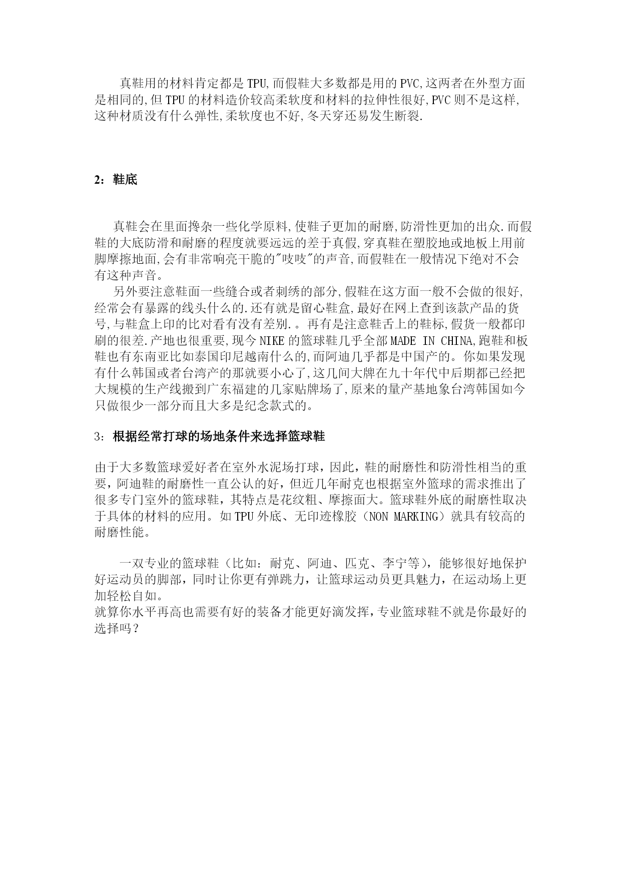 篮球运动作为世界第二大运动项目,越来越受到世界各国人民的追捧。篮球,无论在运动的激烈程度,还是在其技巧上都有着独特的魅力。特别是在大型的篮球比赛中,对技巧的运用更是让人叹为观止,表演性与运动的精彩程度得到了完美的融合。所以说,篮球三场上的观众也是最为热烈,最为激情的了。说道篮球赛,很多人会立刻想到美国的NBA,中国的CBA吧?相信大多数人都会认为像科比、巴蒂尔、詹姆斯、基德等篮球明星是因为他们本身体质就很好,并且拥有精湛的篮球技术。淡然,这些是不可否认的,但是有人注意到他们所穿的篮球鞋了吗?就如科比、詹姆斯所穿的耐克,巴蒂尔、基德穿的匹克,他们所穿的鞋其实对他们在篮球赛场的发挥也是功不可没。如果没有一双性能卓越的篮球鞋,他们也许就没那么挥洒自如了吧?没有一双好的鞋子保护他们的双脚,恐怕脚部也会很容易受伤吧?这是一个崇尚经典和复古的时代是一个把时尚与复古文化相结合的创新时代。耐克正式沿着这种风格一路走来。耐克NIKE是全球著名的体育用品品牌中文译为耐克。该公司生产的体育用品包罗万象服装,鞋类,运动器材等等。1972年NIKE公司正式成立。其前身是由现任NIKE总裁菲尔.耐特以及比尔.鲍尔曼教练投资的蓝带体育公司。该公司产品包罗万象运动服装、鞋、运动器材等。它用自身骄人的业绩印证着创始人比尔.鲍尔曼曾说过的话“只要你拥有身躯你就是一个运动员。而世界上只要有运动员耐克公司就会不断发展壮大。”耐克的语言就是运动的语言。经过50年的发展耐克已经占领了大部分市场份额无论是在国内还是国外耐克都是以一个胜利者的姿态立足于世界鞋业之林。耐克以经典、复古、时尚的设计赢得了众多运动爱好者的亲睐是潮流鞋子的风向标。当我们看到匹克时我们第一反应就是想到了篮球运动。没错匹克篮球鞋系列给人一种稳重大方的感觉同时配上时下流行的色彩与风格不但让你在篮球场上挥洒自如同时能感受到青春的步伐与时尚的脉搏。让你畅享篮球运动畅享无限激情与生命的活力。阿迪达斯能成为耐克的劲敌绝非偶然。除了其科学专业的设计理念更为重要的是其紧抓消费者道的心理需求时刻与潮流、时尚、经典等元素相结合并不断进行创新。所以才能赢得市场的认可不断地发展壮大。“彪马”和“阿迪达斯”各自发展出自己的特色都拥有辉煌的历史。而今彪马时尚经典依旧。热爱生活热爱运动。每天适量运动生活才会更加美好热爱运动当然需要好的鞋子与服饰21商城正品运动鞋服带给你不一样的运动享受。或许谈NBA,CBA对一般人来说太遥远了,那现实中也有很多事喜欢打篮球的爱好者吧?时常在小区里看到一些小孩子在玩篮球,有时也会感概,这些或许就是中国未来的篮球之星吧?呵呵,有点跑题了。但是大多数篮球爱好者在打球时都没有一双专业的篮球鞋,随便穿一双就上场了。可能会让运动员更加轻松,可能会更加轻便吧。可有谁认真想过,这样的鞋子在运动时容易使脚部受伤,更重会造成骨折。那我们在日常篮球运动中应该怎样选择适合自己的篮球鞋呢?主要关注哪些方面呢?1:鞋面工艺真鞋用的材料肯定都是TPU,而假鞋大多数都是用的PVC,这两者在外型方面是相同的,但TPU的材料造价较高柔软度和材料的拉伸性很好,PVC则不是这样,这种材质没有什么弹性,柔软度也不好,冬天穿还易发生断裂.2:鞋底真鞋会在里面搀杂一些化学原料,使鞋子更加的耐磨,防滑性更加的出众.而假鞋的大底防滑和耐磨的程度就要远远的差于真假,穿真鞋在塑胶地或地板上用前脚摩擦地面,会有非常响亮干脆的"吱吱"的声音,而假鞋在一般情况下绝对不会有这种声音。另外要注意鞋面一些缝合或者刺绣的部分,假鞋在这方面一般不会做的很好,经常会有暴露的线头什么的.还有就是留心鞋盒,最好在网上查到该款产品的货号,与鞋盒上印的比对看有没有差别.。再有是注意鞋舌上的鞋标,假货一般都印刷的很差.产地也很重要,现今NIKE的篮球鞋几乎全部MADEINCHINA,跑鞋和板鞋也有东南亚比如泰国印尼越南什么的,而阿迪几乎都是中国产的。你如果发现有什么韩国或者台湾产的那就要小心了,这几间大牌在九十年代中后期都已经把大规模的生产线搬到广东福建的几家贴牌场了,原来的量产基地象台湾韩国如今只做很少一部分而且大多是纪念款式的。3:根据经常打球的场地条件来选择篮球鞋由于大多数篮球爱好者在室外水泥场打球,因此,鞋的耐磨性和防滑性相当的重要,阿迪鞋的耐磨性一直公认的好,但近几年耐克也根据室外篮球的需求推出了很多专门室外的篮球鞋,其特点是花纹粗、摩擦面大。篮球鞋外底的耐磨性取决于具体的材料的应用。如TPU外底、无印迹橡胶(NONMARKING)就具有较高的耐磨性能。一双专业的篮球鞋(比如:耐克、阿迪、匹克、李宁等),能够很好地保护好运动员的脚部,同时让你更有弹跳力,让篮球运动员更具魅力,
