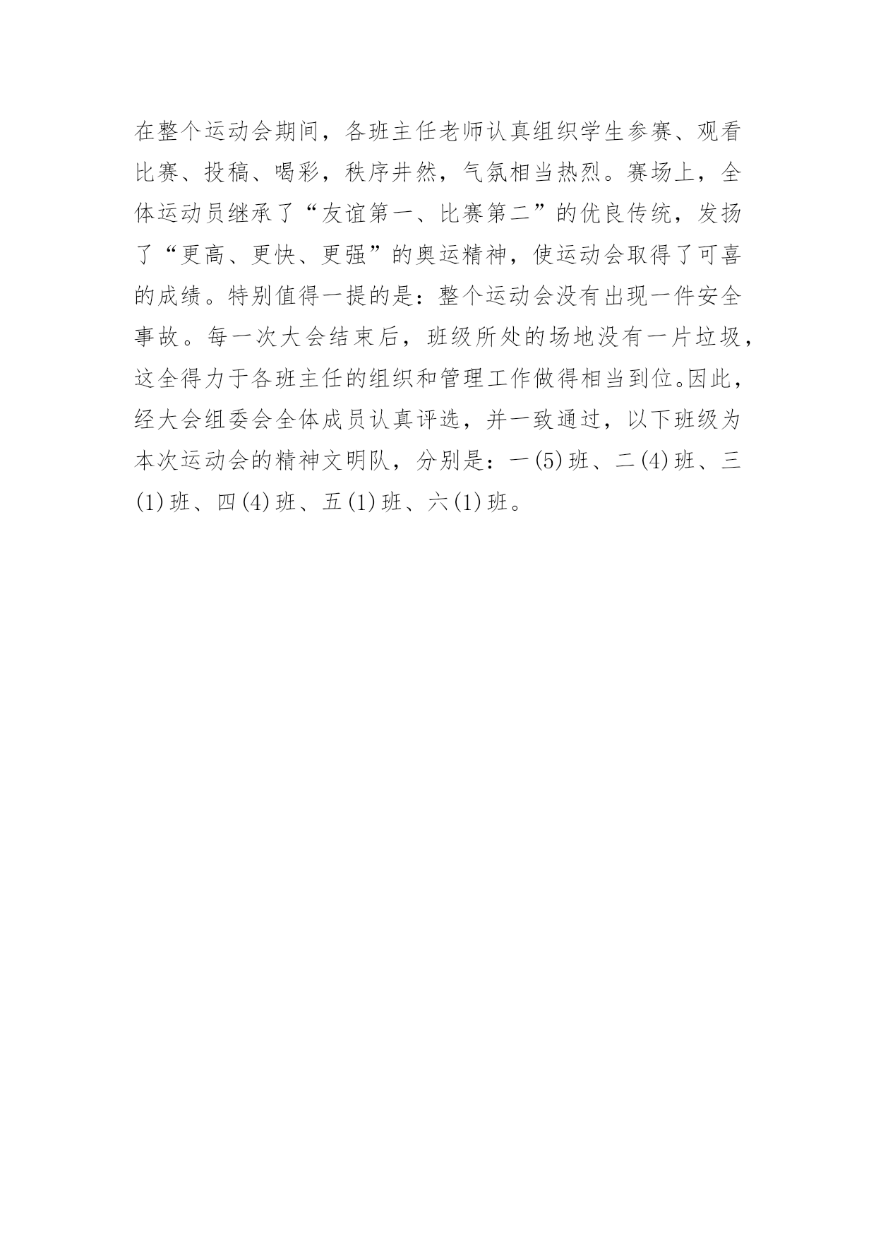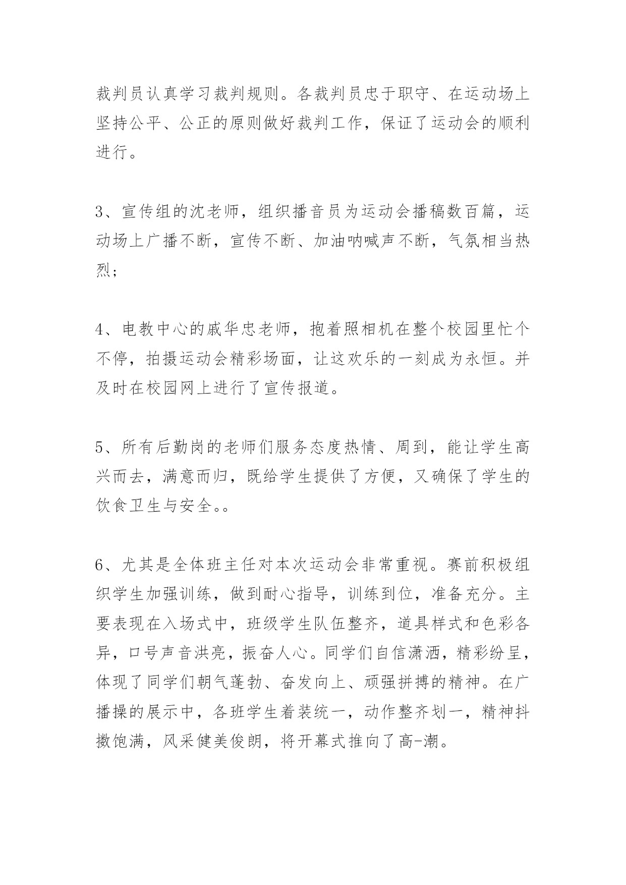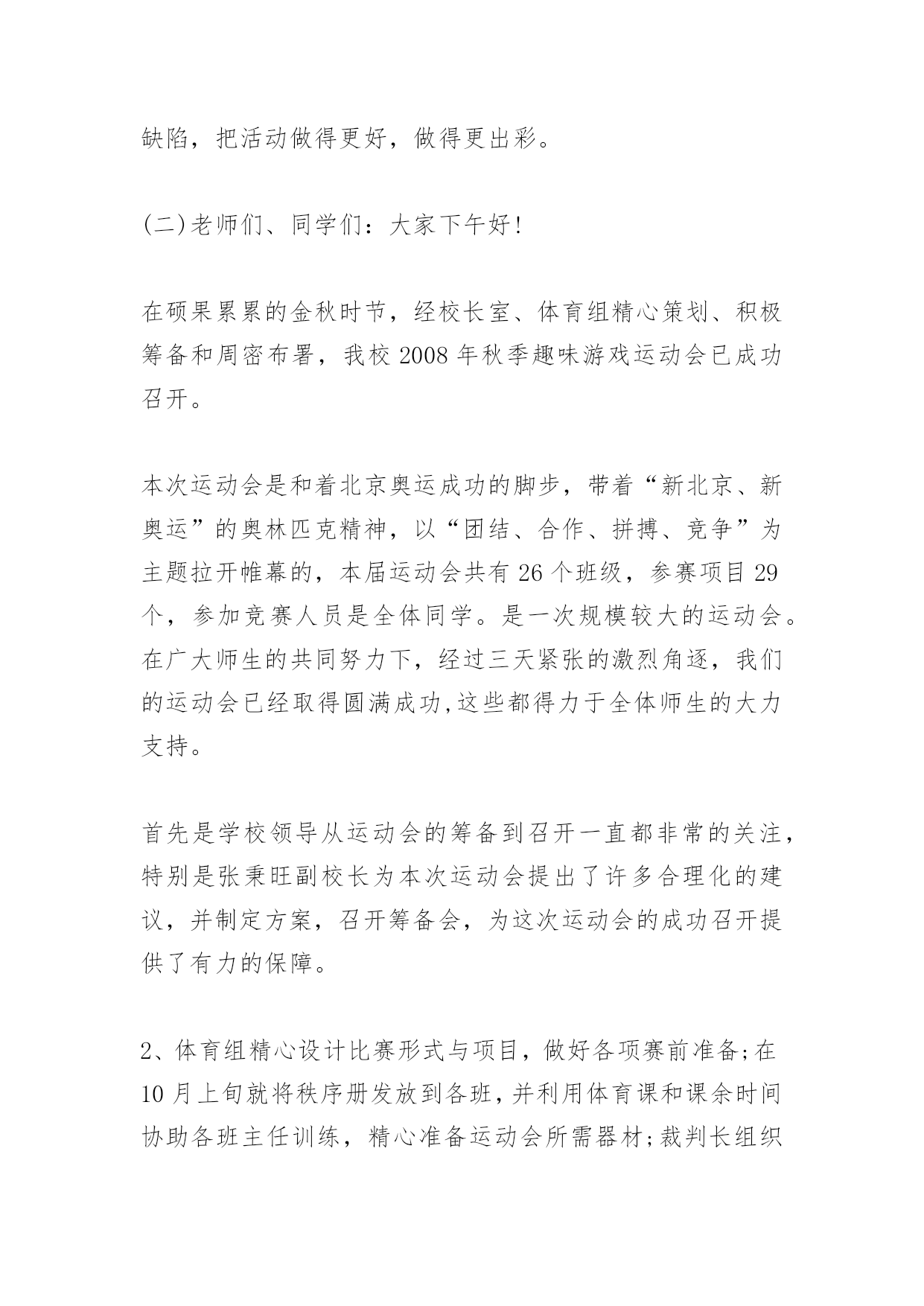 趣味运动会活动总结趣味运动会活动总结初次共同举办这样较为大型的团体活动,在筹划的初期遇到了一些困难,没有经验是最大的障碍。后经过向学长和学姐请求帮助及大家的多次讨论,才得以使筹划走上正轨。但是随后仍出现了一个一个的问题。由于策划者双方的想法时常出现分歧,如在安排人员和资金问题上,并且在对游戏规则的安排上都有不统一的情况出现,使得整个策划过程花费时间长,同时也因为两个班级没有一致空闲的休息时间这客观因素,导致活动安排一再拖延。值得欣慰的是,最后经过共同不懈的努力,敲定时间,开展了此次的活动,整个活动期间较为顺利,但仍存在不尽如人意之处,由于是分块开展,出现了场面的小混乱。这是组织者(策划者)的工作失误,没有把可能发生的各种情况分析到位而产生出的问题.当然,这整个过程中也有其较好之处。善于沟通,是达成最终共识的首要保障。筹划过程中,策划者多次将各班同学的建议收集整理,经过整合,并且进行较缜密地安排,反复进行了修改。与此同时,更重要的是得到了老师和同学的大力支持以及积极地提出意见,建议和最后的参与。在活动进行时,达到了活动举办时的初衷,加强了班级的凝聚力,提高同学参与活动的积极性,增进了班级之间的交流。总而言之,在整个活动的策划和进行过程中,必然有其不足之处,但是它的优势也凸显出来。希望能在下次的活动中克服以上指出的缺陷,把活动做得更好,做得更出彩。(二)老师们、同学们:大家下午好!在硕果累累的金秋时节,经校长室、体育组精心策划、积极筹备和周密布署,我校2008年秋季趣味游戏运动会已成功召开。本次运动会是和着北京奥运成功的脚步,带着“新北京、新奥运”的奥林匹克精神,以“团结、合作、拼搏、竞争”为主题拉开帷幕的,本届运动会共有26个班级,参赛项目29个,参加竞赛人员是全体同学。是一次规模较大的运动会。在广大师生的共同努力下,经过三天紧张的激烈角逐,我们的运动会已经取得圆满成功,这些都得力于全体师生的大力支持。首先是学校领导从运动会的筹备到召开一直都非常的关注,特别是张秉旺副校长为本次运动会提出了许多合理化的建议,并制定方案,召开筹备会,为这次运动会的成功召开提供了有力的保障。2、体育组精心设计比赛形式与项目,做好各项赛前准备;在10月上旬就将秩序册发放到各班,并利用体育课和课余时间协助各班主任训练,精心准备运动会所需器材;裁判长组织裁判员认真学习裁判规则。各裁判员忠于职守、在运动场上坚持公平、公正的原则做好裁判工作,保证了运动会的顺利进行。3、宣传组的沈老师,组织播音员为运动会播稿数百篇,运动场上广播不断,宣传不断、加油呐喊声不断,气氛相当热烈;4、电教中心的戚华忠老师,抱着照相机在整个校园里忙个不停,拍摄运动会精彩场面,让这欢乐的一刻成为永恒。并及时在校园网上进行了宣传报道。5、所有后勤岗的老师们服务态度热情、周到,能让学生高兴而去,满意而归,既给学生提供了方便,又确保了学生的饮食卫生与安全。。6、尤其是全体班主任对本次运动会非常重视。赛前积极组织学生加强训练,做到耐心指导,训练到位,准备充分。主要表现在入场式中,班级学生队伍整齐,道具样式和色彩各异,口号声音洪亮,振奋人心。同学们自信潇洒,精彩纷呈,体现了同学们朝气蓬勃、奋发向上、顽强拼搏的精神。在广播操的展示中,各班学生着装统一,动作整齐划一,精神抖擞饱满,风采健美俊朗,将开幕式推向了高-潮。在整个运动会期间,各班主任老师认真组织学生参赛、观看比赛、投稿、喝彩,秩序井然,气氛相当热烈。赛场上,全体运动员继承了“友谊第一、比赛第二”的优良传统,发扬了“更高、更快、更强”的奥运精神,使运动会取得了可喜的成绩。特别值得一提的是:整个运动会没有出现一件安全事故。每一次大会结束后,班级所处的场地没有一片垃圾,这全得力于各班主任的组织和管理工作做得相当到位。因此,经大会组委会全体成员认真评选,并一致通过,以下班级为本次运动会的精神文明队,分别是:一(5)班、二(4)班、三(1)班、四(4)班、五(1)班、六(1)班。