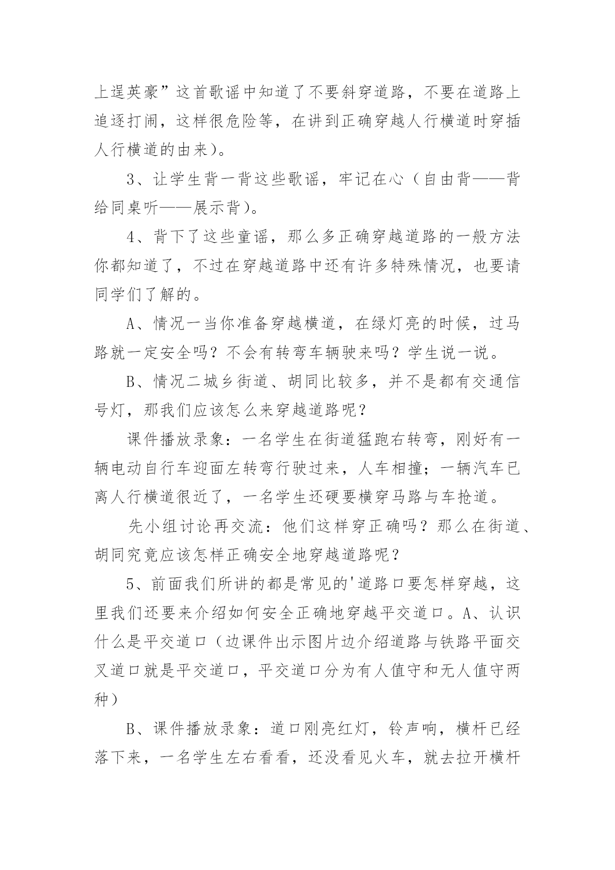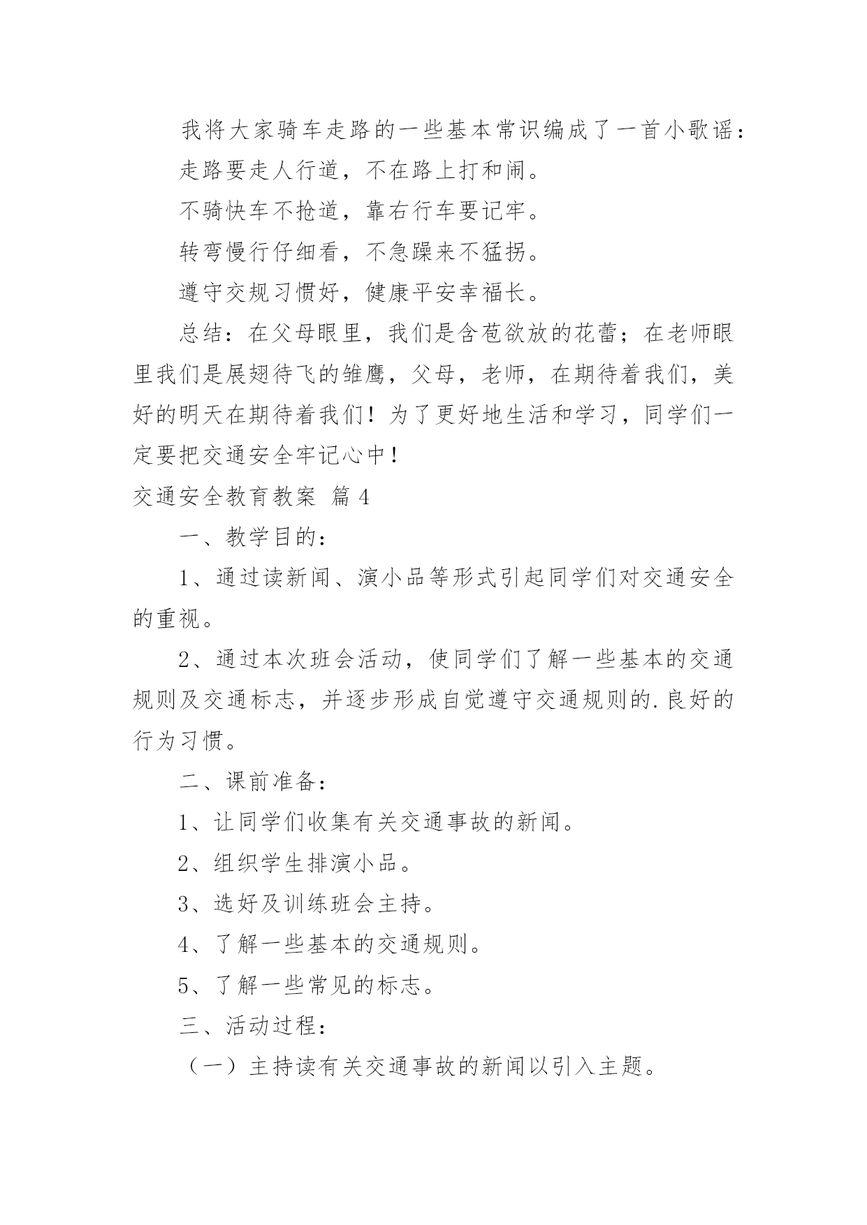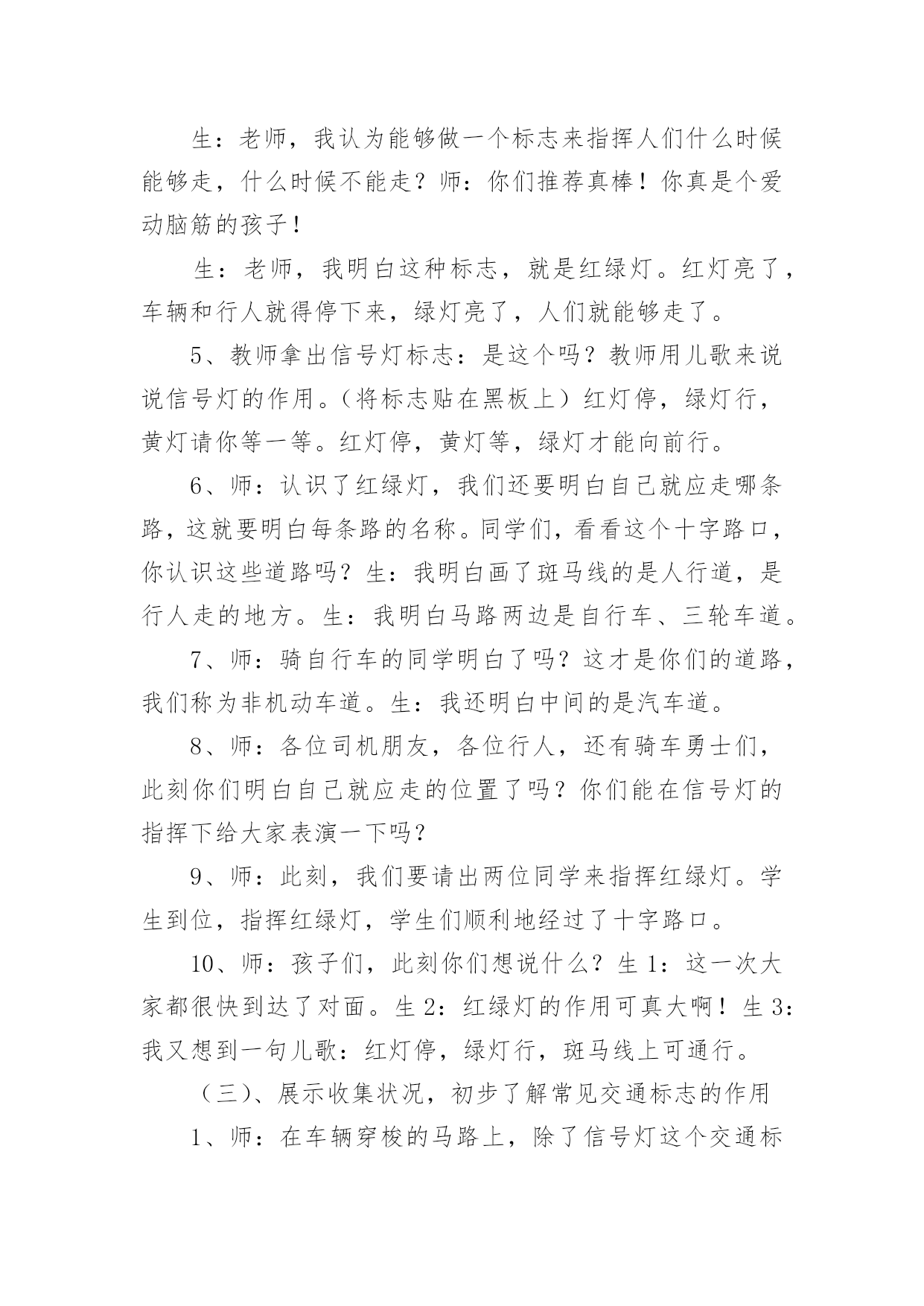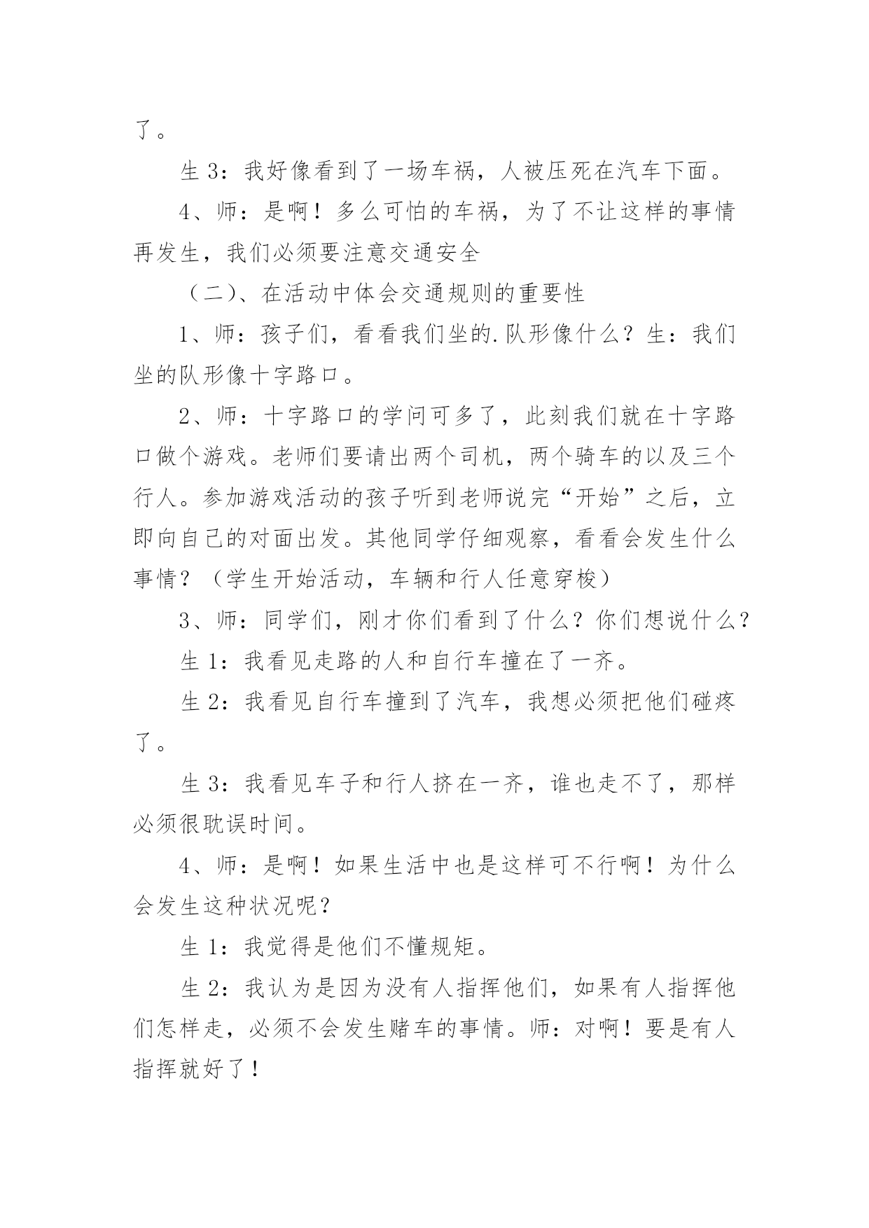 交通安全教育教案交通安全教育教案4篇作为一名人民教师,编写教案是必不可少的,教案是保证教学取得成功、提高教学质量的基本条件。如何把教案做到重点突出呢?下面是小编为大家收集的交通安全教育教案6篇,欢迎大家分享。交通安全教育教案篇1一、活动目标:1、让学生在交流活动中认识一些常见的交通标志。2、让学生在游戏活动中体验交通规则的重要性,从而自觉地遵守交通规则。二、活动准备:1、学生准备活动所需的各种玩具车辆。2学生收集各种交通标志(照片或图片)。三、教学过程(一)展开联想,揭示活动主题1、师:同学们,请同学先看大屏幕。课件出现:各种车辆的喧闹声,之后是紧急刹车的声音,然后是人们的尖叫声,屏幕由黑色逐渐变成鲜红色。2、师:刚才你们看到了什么?听到了什么?想到了什么?生1:我听到了汽车的嗽叭声,还听到了刹车的声音。生2:我还听见了一个人的尖叫声,我看见了血流出来了。生3:我好像看到了一场车祸,人被压死在汽车下面。4、师:是啊!多么可怕的车祸,为了不让这样的事情再发生,我们必须要注意交通安全(二)、在活动中体会交通规则的重要性1、师:孩子们,看看我们坐的.队形像什么?生:我们坐的队形像十字路口。2、师:十字路口的学问可多了,此刻我们就在十字路口做个游戏。老师们要请出两个司机,两个骑车的以及三个行人。参加游戏活动的孩子听到老师说完“开始”之后,立即向自己的对面出发。其他同学仔细观察,看看会发生什么事情?(学生开始活动,车辆和行人任意穿梭)3、师:同学们,刚才你们看到了什么?你们想说什么?生1:我看见走路的人和自行车撞在了一齐。生2:我看见自行车撞到了汽车,我想必须把他们碰疼了。生3:我看见车子和行人挤在一齐,谁也走不了,那样必须很耽误时间。4、师:是啊!如果生活中也是这样可不行啊!为什么会发生这种状况呢?生1:我觉得是他们不懂规矩。生2:我认为是因为没有人指挥他们,如果有人指挥他们怎样走,必须不会发生赌车的事情。师:对啊!要是有人指挥就好了!生:老师,我认为能够做一个标志来指挥人们什么时候能够走,什么时候不能走?师:你们推荐真棒!你真是个爱动脑筋的孩子!生:老师,我明白这种标志,就是红绿灯。红灯亮了,车辆和行人就得停下来,绿灯亮了,人们就能够走了。5、教师拿出信号灯标志:是这个吗?教师用儿歌来说说信号灯的作用。(将标志贴在黑板上)红灯停,绿灯行,黄灯请你等一等。红灯停,黄灯等,绿灯才能向前行。6、师:认识了红绿灯,我们还要明白自己就应走哪条路,这就要明白每条路的名称。同学们,看看这个十字路口,你认识这些道路吗?生:我明白画了斑马线的是人行道,是行人走的地方。生:我明白马路两边是自行车、三轮车道。7、师:骑自行车的同学明白了吗?这才是你们的道路,我们称为非机动车道。生:我还明白中间的是汽车道。8、师:各位司机朋友,各位行人,还有骑车勇士们,此刻你们明白自己就应走的位置了吗?你们能在信号灯的指挥下给大家表演一下吗?9、师:此刻,我们要请出两位同学来指挥红绿灯。学生到位,指挥红绿灯,学生们顺利地经过了十字路口。10、师:孩子们,此刻你们想说什么?生1:这一次大家都很快到达了对面。生2:红绿灯的作用可真大啊!生3:我又想到一句儿歌:红灯停,绿灯行,斑马线上可通行。(三)、展示收集状况,初步了解常见交通标志的作用1、师:在车辆穿梭的马路上,除了信号灯这个交通标志外,还有很多交通标志,你们收集到了吗?把你们课前收集到的交通标志在小组上交流一下,再向全班汇报。2、生拿出收集的交通标志,在小组上热烈地交流着,教师巡回倾听学生的交流状况。(四)总结师:你们了解得真多,老师为你们喝彩交通安全教育教案篇2教学目标:1、了解怎样安全正确地穿越十字路口、城乡街道胡同、平交道口。2、认识什么是平交道口。3、学会安全正确地穿越十字路口、城乡街道胡同、平交道口,树立强烈的道路交通安全意识。教学过程:一、引入1、同学们,当我们上学、放学和外出活动的时候,几乎天天都要在各种道路上行走。瞧,这些同学在穿越道路时是多么有秩序,多么注意安全呀。(课件播放学生通过走人行横道、地道、天桥安全穿越道路的画面或录象)二、新授1、那么怎么样穿越道路才能保证安全和正确呢?让我们先来读一读这些歌谣,看看我们从中可以学到哪些正确穿越道路的方法。2、学生读歌谣,交流从歌谣中读懂了什么(如从“斜穿道路很危险,匆匆奔跑不安全,嬉戏打闹全不要,莫在路上逞英豪”这首歌谣中知道了不要斜穿道路,不要在道路上追逐打闹,这样很危险等,在讲到正确穿越人行横道时穿插人行横道的由来)。3、让学生背一背这些歌谣,牢记在心(自由背——背给同桌听——展示背)。4、背下了这些童谣,那么多正确穿越道路的一般方法你都知道了,不过在穿越道路中还有许多特殊情况,也要请同学们了解的。A、情况一当你准备穿越横道,在绿灯亮的时候,过马路就