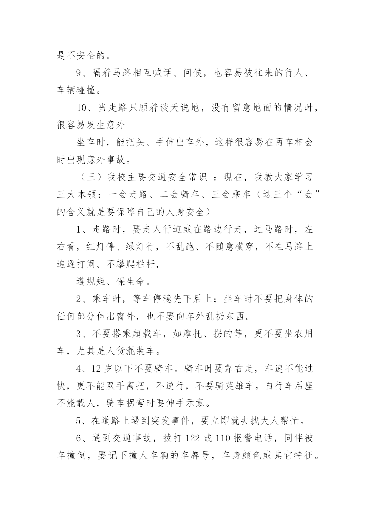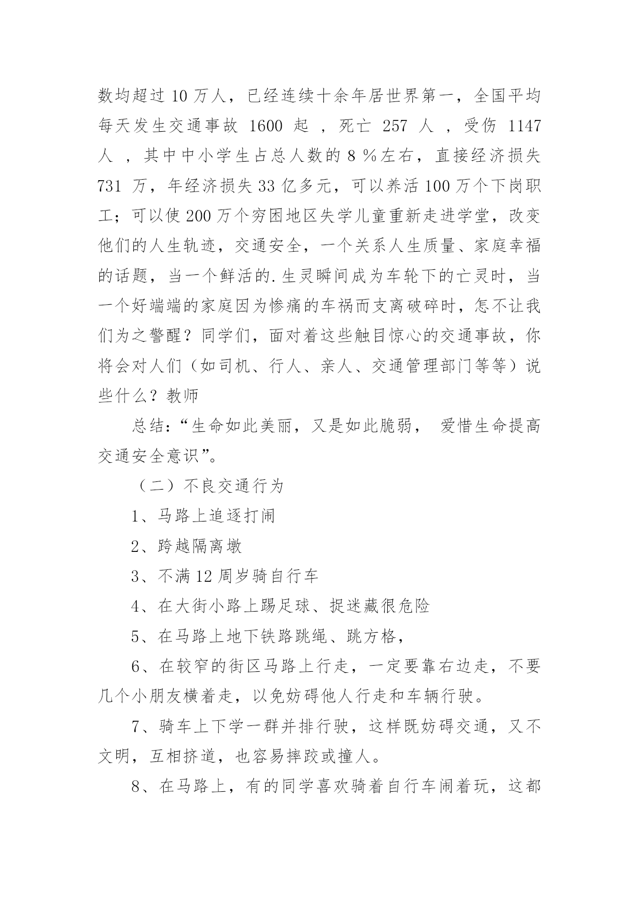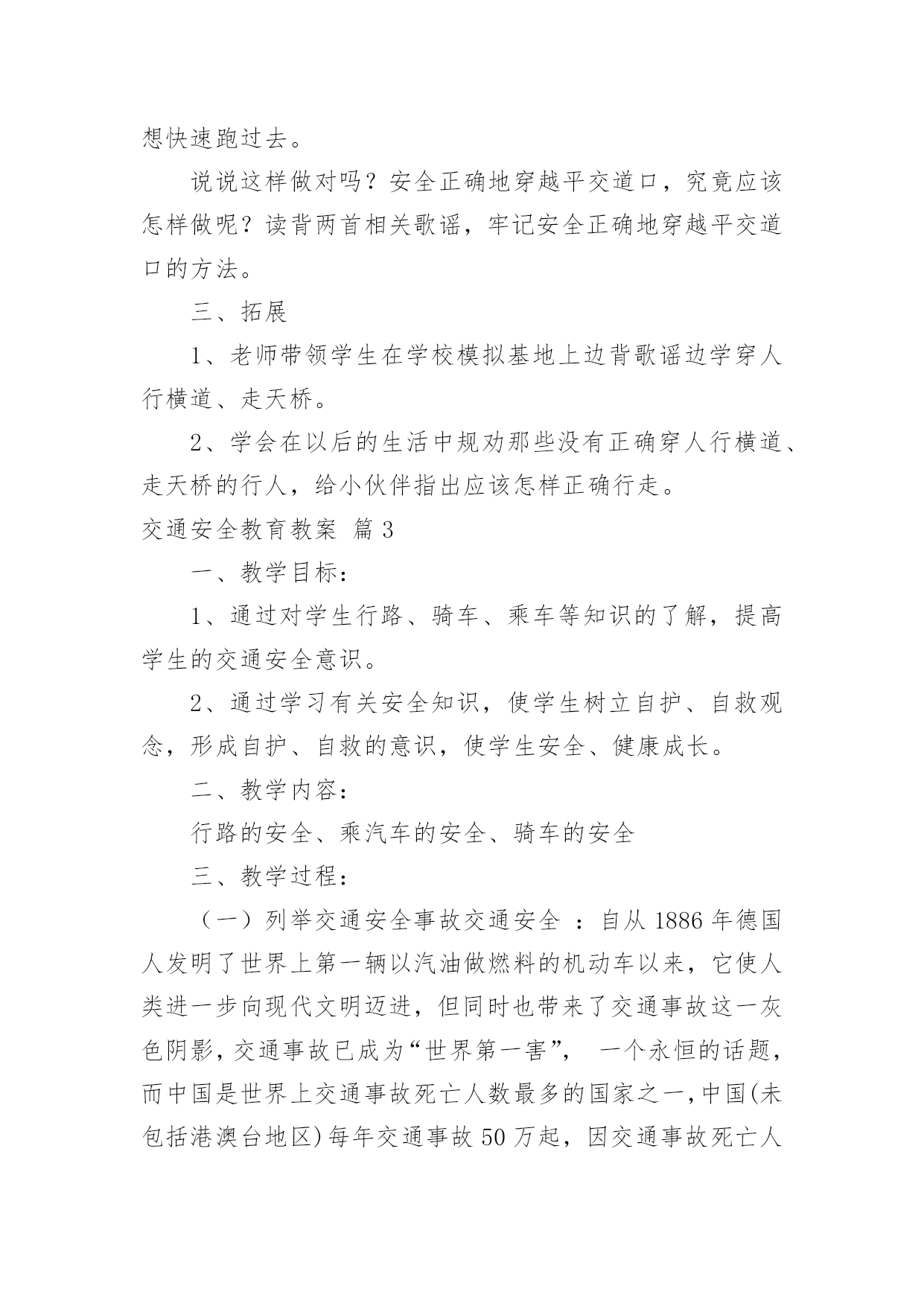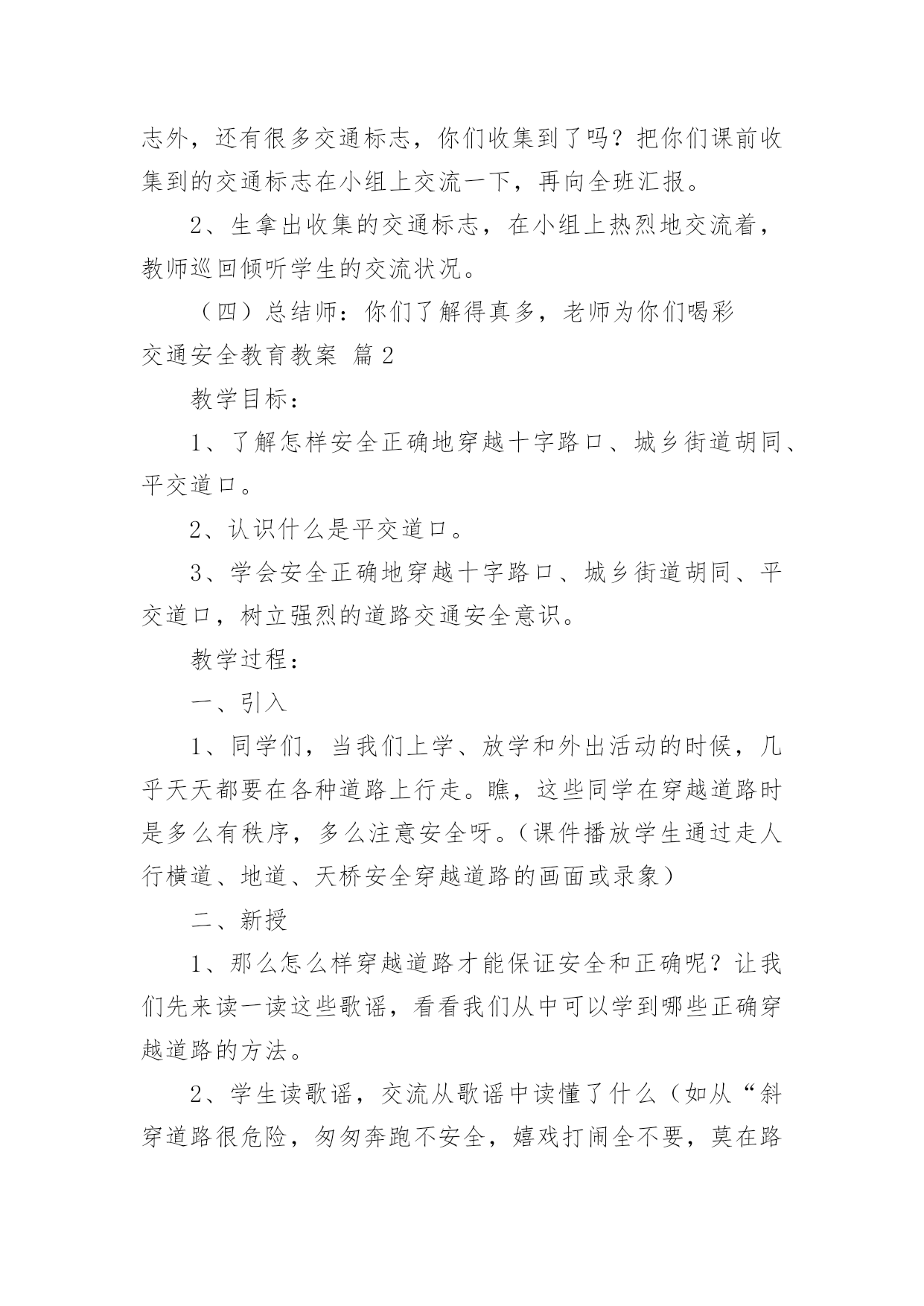 交通安全教育教案交通安全教育教案4篇作为一名人民教师,编写教案是必不可少的,教案是保证教学取得成功、提高教学质量的基本条件。如何把教案做到重点突出呢?下面是小编为大家收集的交通安全教育教案6篇,欢迎大家分享。交通安全教育教案篇1一、活动目标:1、让学生在交流活动中认识一些常见的交通标志。2、让学生在游戏活动中体验交通规则的重要性,从而自觉地遵守交通规则。二、活动准备:1、学生准备活动所需的各种玩具车辆。2学生收集各种交通标志(照片或图片)。三、教学过程(一)展开联想,揭示活动主题1、师:同学们,请同学先看大屏幕。课件出现:各种车辆的喧闹声,之后是紧急刹车的声音,然后是人们的尖叫声,屏幕由黑色逐渐变成鲜红色。2、师:刚才你们看到了什么?听到了什么?想到了什么?生1:我听到了汽车的嗽叭声,还听到了刹车的声音。生2:我还听见了一个人的尖叫声,我看见了血流出来了。生3:我好像看到了一场车祸,人被压死在汽车下面。4、师:是啊!多么可怕的车祸,为了不让这样的事情再发生,我们必须要注意交通安全(二)、在活动中体会交通规则的重要性1、师:孩子们,看看我们坐的.队形像什么?生:我们坐的队形像十字路口。2、师:十字路口的学问可多了,此刻我们就在十字路口做个游戏。老师们要请出两个司机,两个骑车的以及三个行人。参加游戏活动的孩子听到老师说完“开始”之后,立即向自己的对面出发。其他同学仔细观察,看看会发生什么事情?(学生开始活动,车辆和行人任意穿梭)3、师:同学们,刚才你们看到了什么?你们想说什么?生1:我看见走路的人和自行车撞在了一齐。生2:我看见自行车撞到了汽车,我想必须把他们碰疼了。生3:我看见车子和行人挤在一齐,谁也走不了,那样必须很耽误时间。4、师:是啊!如果生活中也是这样可不行啊!为什么会发生这种状况呢?生1:我觉得是他们不懂规矩。生2:我认为是因为没有人指挥他们,如果有人指挥他们怎样走,必须不会发生赌车的事情。师:对啊!要是有人指挥就好了!生:老师,我认为能够做一个标志来指挥人们什么时候能够走,什么时候不能走?师:你们推荐真棒!你真是个爱动脑筋的孩子!生:老师,我明白这种标志,就是红绿灯。红灯亮了,车辆和行人就得停下来,绿灯亮了,人们就能够走了。5、教师拿出信号灯标志:是这个吗?教师用儿歌来说说信号灯的作用。(将标志贴在黑板上)红灯停,绿灯行,黄灯请你等一等。红灯停,黄灯等,绿灯才能向前行。6、师:认识了红绿灯,我们还要明白自己就应走哪条路,这就要明白每条路的名称。同学们,看看这个十字路口,你认识这些道路吗?生:我明白画了斑马线的是人行道,是行人走的地方。生:我明白马路两边是自行车、三轮车道。7、师:骑自行车的同学明白了吗?这才是你们的道路,我们称为非机动车道。生:我还明白中间的是汽车道。8、师:各位司机朋友,各位行人,还有骑车勇士们,此刻你们明白自己就应走的位置了吗?你们能在信号灯的指挥下给大家表演一下吗?9、师:此刻,我们要请出两位同学来指挥红绿灯。学生到位,指挥红绿灯,学生们顺利地经过了十字路口。10、师:孩子们,此刻你们想说什么?生1:这一次大家都很快到达了对面。生2:红绿灯的作用可真大啊!生3:我又想到一句儿歌:红灯停,绿灯行,斑马线上可通行。(三)、展示收集状况,初步了解常见交通标志的作用1、师:在车辆穿梭的马路上,除了信号灯这个交通标志外,还有很多交通标志,你们收集到了吗?把你们课前收集到的交通标志在小组上交流一下,再向全班汇报。2、生拿出收集的交通标志,在小组上热烈地交流着,教师巡回倾听学生的交流状况。(四)总结师:你们了解得真多,老师为你们喝彩交通安全教育教案篇2教学目标:1、了解怎样安全正确地穿越十字路口、城乡街道胡同、平交道口。2、认识什么是平交道口。3、学会安全正确地穿越十字路口、城乡街道胡同、平交道口,树立强烈的道路交通安全意识。教学过程:一、引入1、同学们,当我们上学、放学和外出活动的时候,几乎天天都要在各种道路上行走。瞧,这些同学在穿越道路时是多么有秩序,多么注意安全呀。(课件播放学生通过走人行横道、地道、天桥安全穿越道路的画面或录象)二、新授1、那么怎么样穿越道路才能保证安全和正确呢?让我们先来读一读这些歌谣,看看我们从中可以学到哪些正确穿越道路的方法。2、学生读歌谣,交流从歌谣中读懂了什么(如从“斜穿道路很危险,匆匆奔跑不安全,嬉戏打闹全不要,莫在路上逞英豪”这首歌谣中知道了不要斜穿道路,不要在道路上追逐打闹,这样很危险等,在讲到正确穿越人行横道时穿插人行横道的由来)。3、让学生背一背这些歌谣,牢记在心(自由背——背给同桌听——展示背)。4、背下了这些童谣,那么多正确穿越道路的一般方法你都知道了,不过在穿越道路中还有许多特殊情况,也要请同学们了解的。A、情况一当你准备穿越横道,在绿灯亮的时候,过马路就