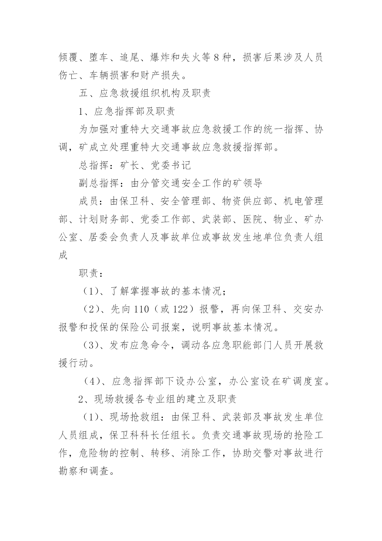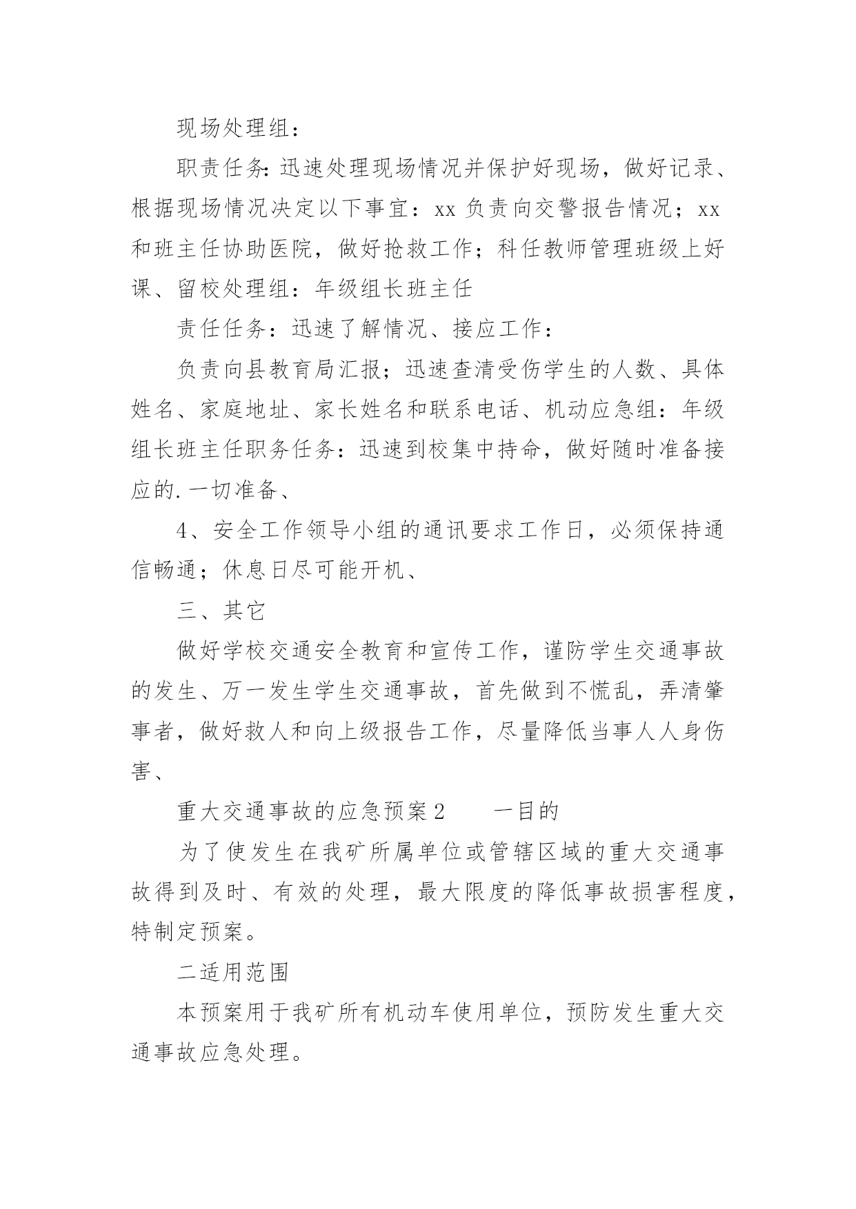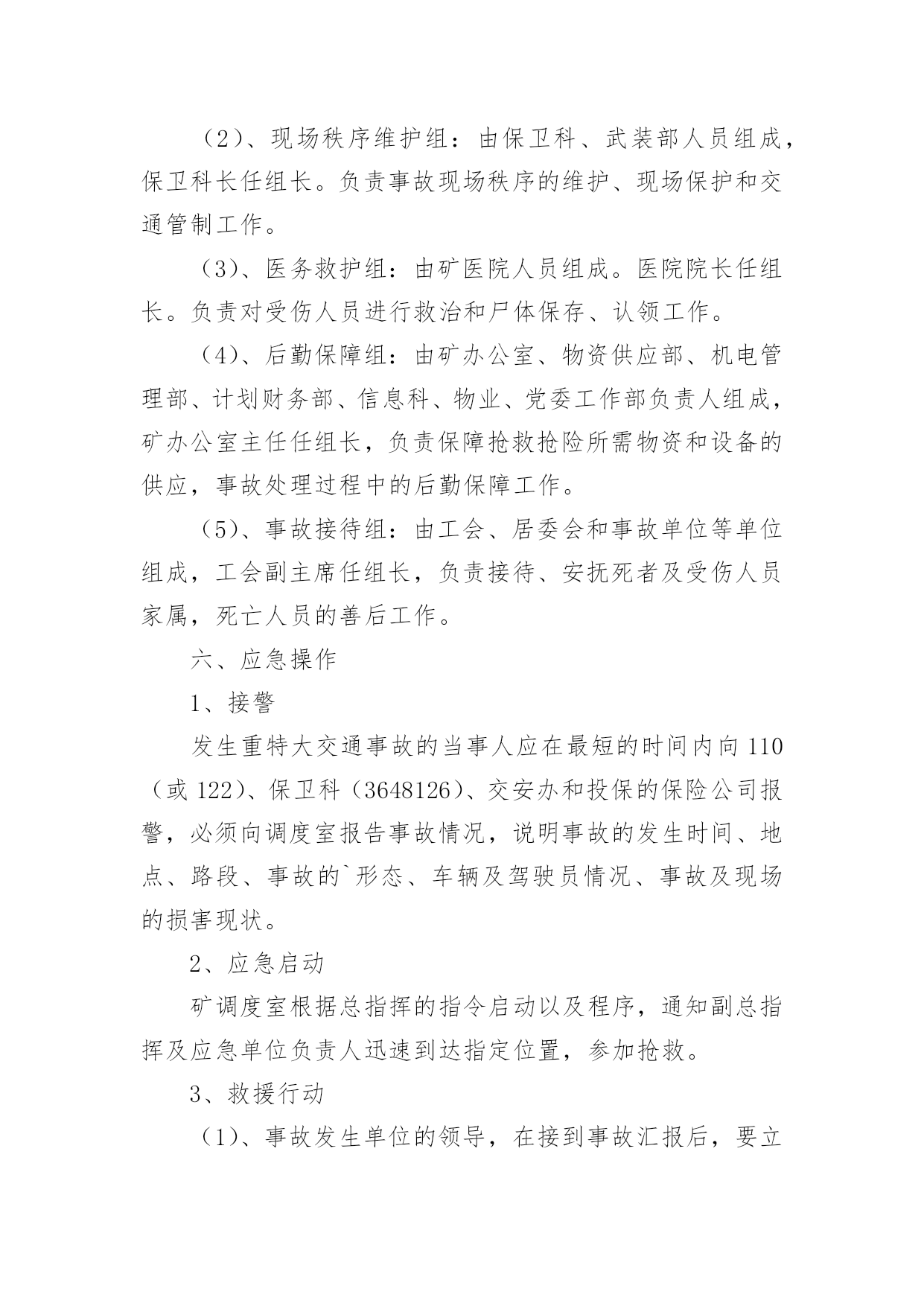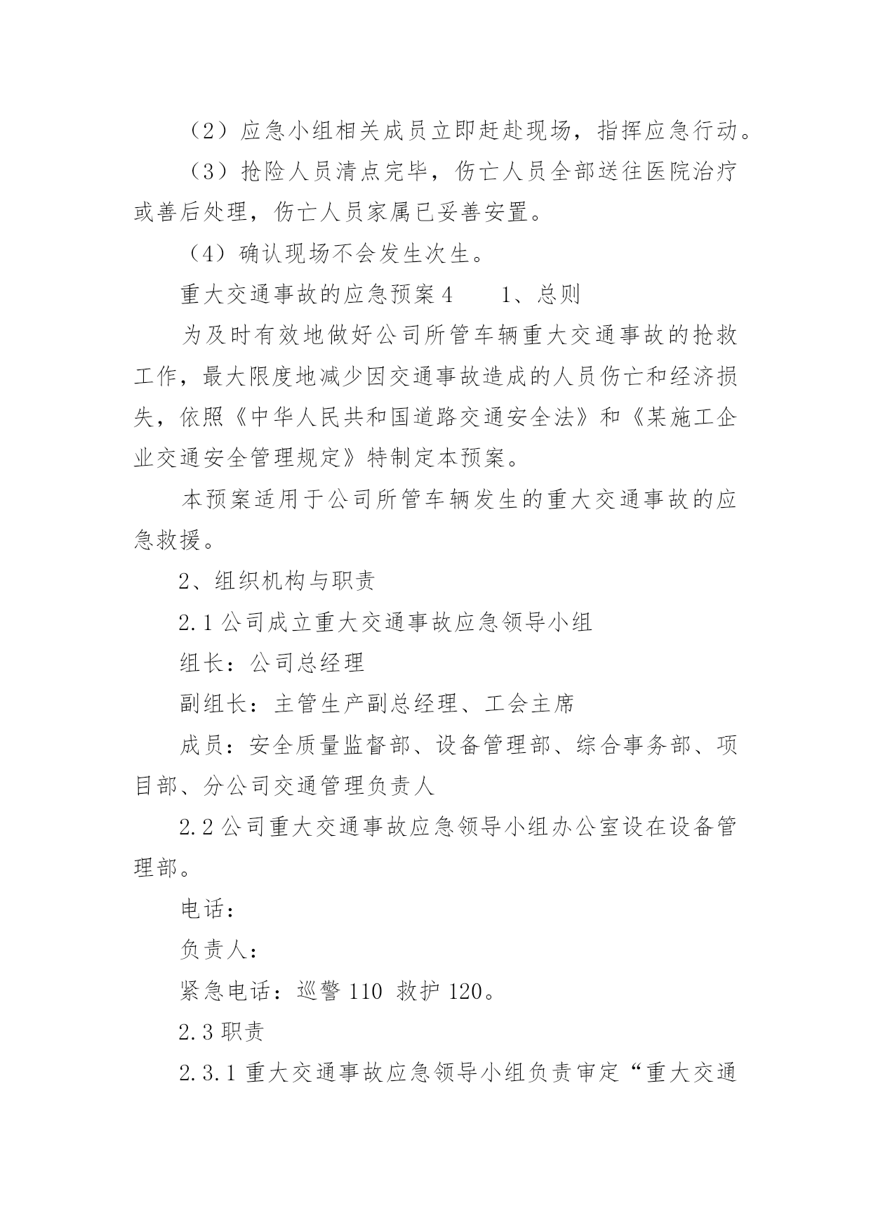 重大交通事故的应急预案重大交通事故的应急预案范文(通用6篇)在学习、工作、生活中,有时会突发意外事故,为了避免造成重大损失和危害,往往需要预先进行应急预案编制工作。编制应急预案需要注意哪些问题呢?以下是小编收集整理的重大交通事故的应急预案范文(通用6篇),仅供参考,希望能够帮助到大家。重大交通事故的应急预案1一、交通安全工作应急领导小组组长:副组长:组员:二、处理交通安全事故方案1、教育、学校交通安全工作领导小组的所有成员要经常向学生进行交通安全宣传,教育学生在上学或放学路上,特别是教育学生在出校门时要注意门口交通安全,防止人流过多造成交通事故,并作好交通安全记录、2、报告、一旦出现交通安全事故,在场的教职工均有权也有义务立即报告、一般情况报告程序:现场教师或知情教师在第一时间内,立即向学校交通安全工作领导小组报告情况;交通安全工作领导小组成员第一时间内赶到事故现场,展开营救工作,同时立即向县教育局和交警部门报告情况、3、应急工作分工现场处理组:职责任务:迅速处理现场情况并保护好现场,做好记录、根据现场情况决定以下事宜:xx负责向交警报告情况;xx和班主任协助医院,做好抢救工作;科任教师管理班级上好课、留校处理组:年级组长班主任责任任务:迅速了解情况、接应工作:负责向县教育局汇报;迅速查清受伤学生的人数、具体姓名、家庭地址、家长姓名和联系电话、机动应急组:年级组长班主任职务任务:迅速到校集中持命,做好随时准备接应的.一切准备、4、安全工作领导小组的通讯要求工作日,必须保持通信畅通;休息日尽可能开机、三、其它做好学校交通安全教育和宣传工作,谨防学生交通事故的发生、万一发生学生交通事故,首先做到不慌乱,弄清肇事者,做好救人和向上级报告工作,尽量降低当事人人身伤害、重大交通事故的应急预案2一目的为了使发生在我矿所属单位或管辖区域的重大交通事故得到及时、有效的处理,最大限度的降低事故损害程度,特制定预案。二适用范围本预案用于我矿所有机动车使用单位,预防发生重大交通事故应急处理。三、引用标准1、《道路交通安全法》。2、一体化管理标准。四、基本情况1、机动车情况矿现有车辆单位10个,30台以上车辆单位2个,20台以上车辆单位1个,10台以上车辆单位1个,2台以上车辆单位3个,1辆以上车辆单位6个。矿现有车辆122台,:大型货车43台,(5T以上)、小型货车7台(1.25T以上)、大客车1台(30座以上)、中小型客车6台(9座以上)、小轿车42台、特种车1台、(警车3台、医用救护车2台、吊车1台〈25T〉、洒水车2台。2、驾驶员情况在岗驾驶员130人。3、本市道路情况(1)、国道:207国道、晋阳高速公路、晋焦高速公路、长晋高速公路。(2)、省道:晋长公路、晋韩公路、陵沁公路。(3)、县道:晋张公路、周犁公路、东大线。4、交通事故危害辩识及风险道路交通事故的发生具有突发性、偶然性、不确定性,无特定的时间、无特定路段,按事故造成的人员伤亡情况和直接经济损失大小,可分为轻微事故、一般事故、重大事故和特大事故四类,主要形态基本可分为碰撞、碾压、刮擦、倾覆、堕车、追尾、爆炸和失火等8种,损害后果涉及人员伤亡、车辆损害和财产损失。五、应急救援组织机构及职责1、应急指挥部及职责为加强对重特大交通事故应急救援工作的统一指挥、协调,矿成立处理重特大交通事故应急救援指挥部。总指挥:矿长、党委书记副总指挥:由分管交通安全工作的矿领导成员:由保卫科、安全管理部、物资供应部、机电管理部、计划财务部、党委工作部、武装部、医院、物业、矿办公室、居委会负责人及事故单位或事故发生地单位负责人组成职责:(1)、了解掌握事故的基本情况;(2)、先向110(或122)报警,再向保卫科、交安办报警和投保的保险公司报案,说明事故基本情况。(3)、发布应急命令,调动各应急职能部门人员开展救援行动。(4)、应急指挥部下设办公室,办公室设在矿调度室。2、现场救援各专业组的建立及职责(1)、现场抢救组:由保卫科、武装部及事故发生单位人员组成,保卫科科长任组长。负责交通事故现场的抢险工作,危险物的控制、转移、消除工作,协助交警对事故进行勘察和调查。(2)、现场秩序维护组:由保卫科、武装部人员组成,保卫科长任组长。负责事故现场秩序的维护、现场保护和交通管制工作。(3)、医务救护组:由矿医院人员组成。医院院长任组长。负责对受伤人员进行救治和尸体保存、认领工作。(4)、后勤保障组:由矿办公室、物资供应部、机电管理部、计划财务部、信息科、物业、党委工作部负责人组成,矿办公室主任任组长,负责保障抢救抢险所需物资和设备的供应,事故处理过程中的后勤保障工作。(5)、事故接待组:由工会、居委会和事故单位等单位组成,工会副主席任组长,负责接待、安抚死者及受伤人员家属,死亡人员的善后工作。六、应急操作1、接