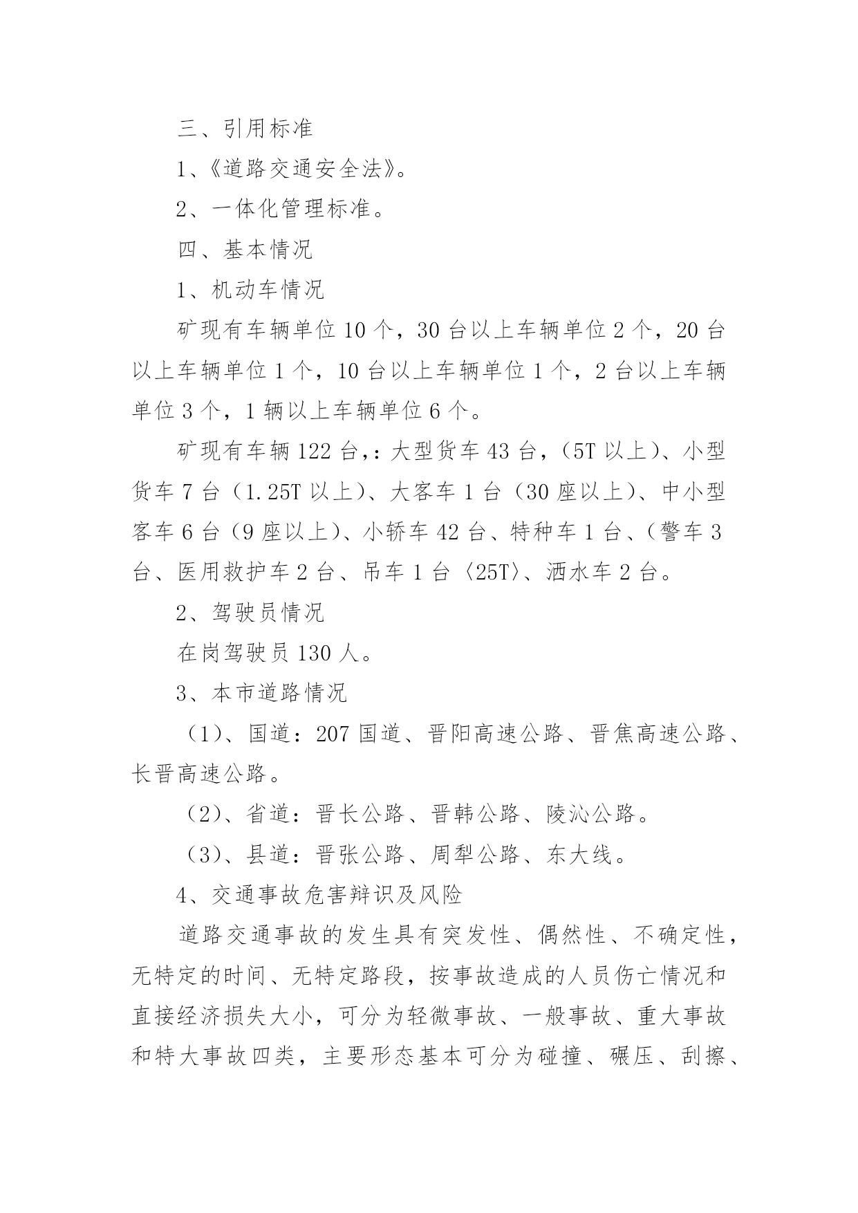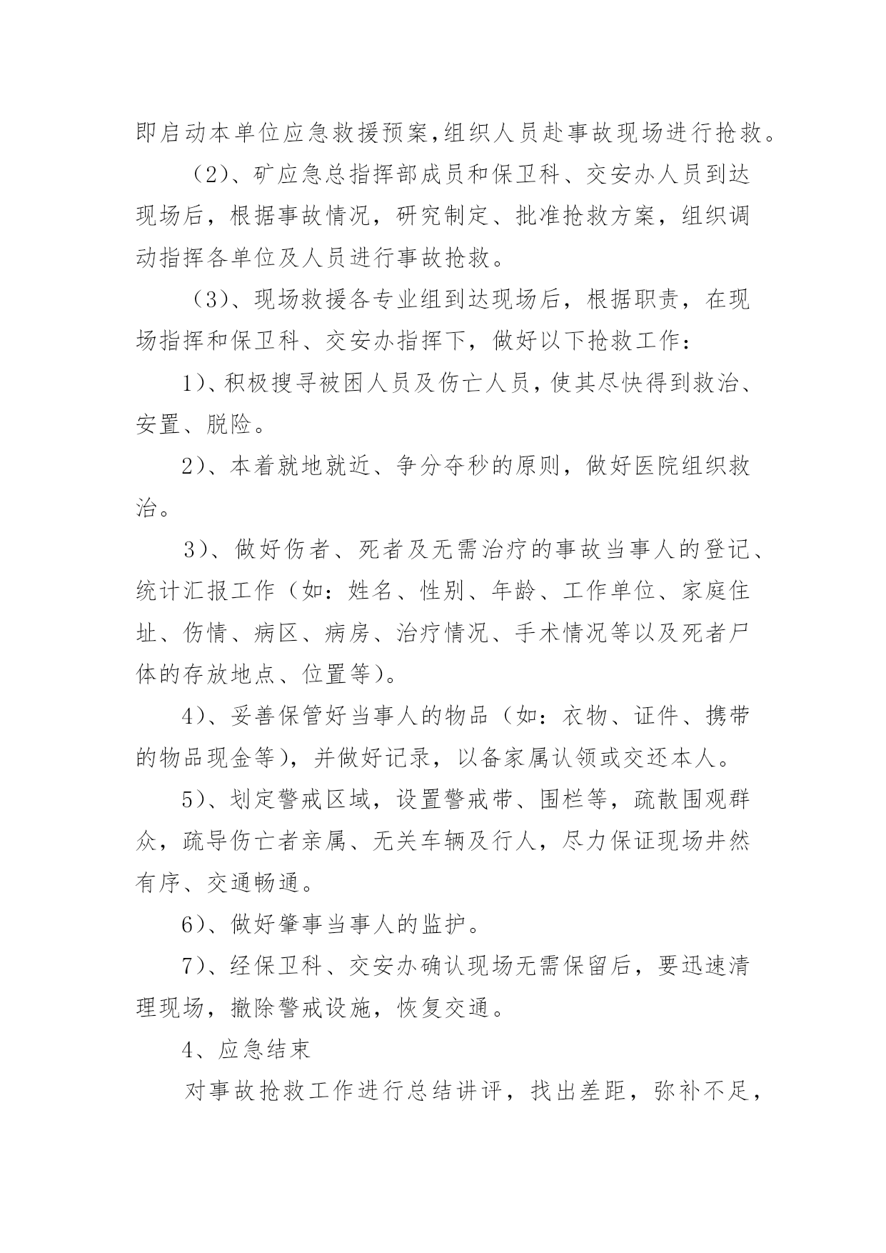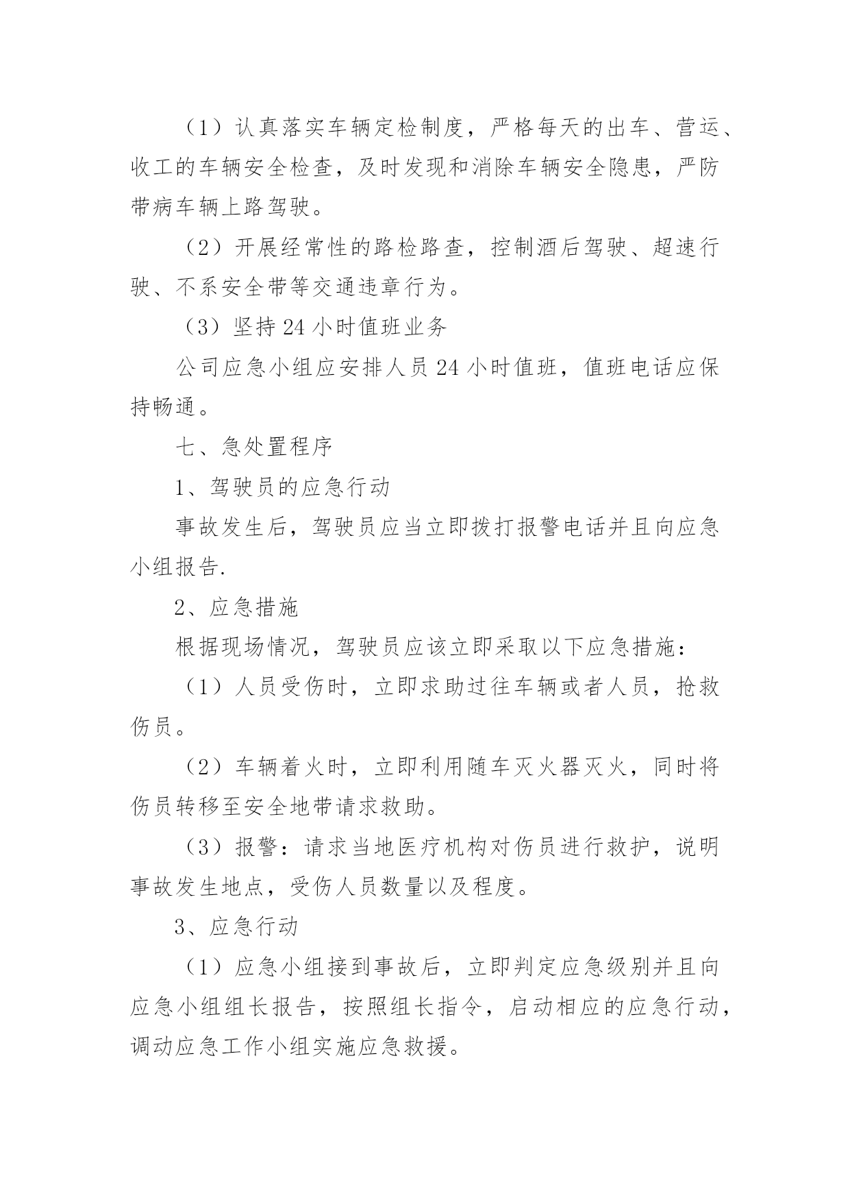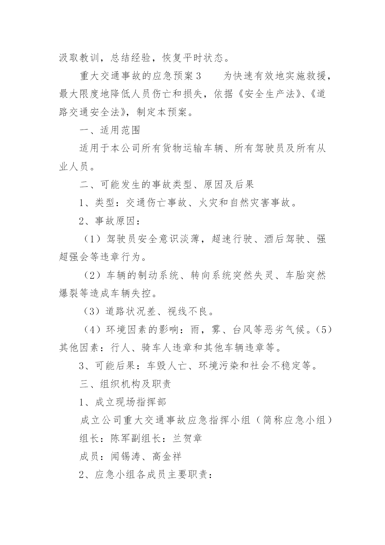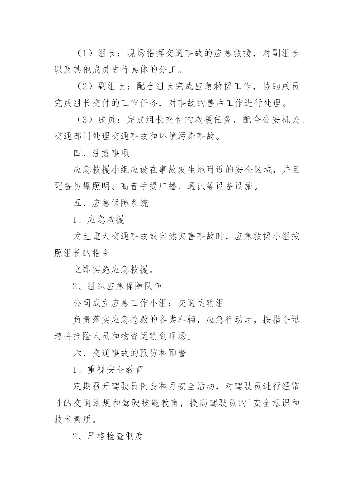重大交通事故的应急预案重大交通事故的应急预案范文(通用6篇)在学习、工作、生活中,有时会突发意外事故,为了避免造成重大损失和危害,往往需要预先进行应急预案编制工作。编制应急预案需要注意哪些问题呢?以下是小编收集整理的重大交通事故的应急预案范文(通用6篇),仅供参考,希望能够帮助到大家。重大交通事故的应急预案1一、交通安全工作应急领导小组组长:副组长:组员:二、处理交通安全事故方案1、教育、学校交通安全工作领导小组的所有成员要经常向学生进行交通安全宣传,教育学生在上学或放学路上,特别是教育学生在出校门时要注意门口交通安全,防止人流过多造成交通事故,并作好交通安全记录、2、报告、一旦出现交通安全事故,在场的教职工均有权也有义务立即报告、一般情况报告程序:现场教师或知情教师在第一时间内,立即向学校交通安全工作领导小组报告情况;交通安全工作领导小组成员第一时间内赶到事故现场,展开营救工作,同时立即向县教育局和交警部门报告情况、3、应急工作分工现场处理组:职责任务:迅速处理现场情况并保护好现场,做好记录、根据现场情况决定以下事宜:xx负责向交警报告情况;xx和班主任协助医院,做好抢救工作;科任教师管理班级上好课、留校处理组:年级组长班主任责任任务:迅速了解情况、接应工作:负责向县教育局汇报;迅速查清受伤学生的人数、具体姓名、家庭地址、家长姓名和联系电话、机动应急组:年级组长班主任职务任务:迅速到校集中持命,做好随时准备接应的.一切准备、4、安全工作领导小组的通讯要求工作日,必须保持通信畅通;休息日尽可能开机、三、其它做好学校交通安全教育和宣传工作,谨防学生交通事故的发生、万一发生学生交通事故,首先做到不慌乱,弄清肇事者,做好救人和向上级报告工作,尽量降低当事人人身伤害、重大交通事故的应急预案2一目的为了使发生在我矿所属单位或管辖区域的重大交通事故得到及时、有效的处理,最大限度的降低事故损害程度,特制定预案。二适用范围本预案用于我矿所有机动车使用单位,预防发生重大交通事故应急处理。三、引用标准1、《道路交通安全法》。2、一体化管理标准。四、基本情况1、机动车情况矿现有车辆单位10个,30台以上车辆单位2个,20台以上车辆单位1个,10台以上车辆单位1个,2台以上车辆单位3个,1辆以上车辆单位6个。矿现有车辆122台,:大型货车43台,(5T以上)、小型货车7台(1.25T以上)、大客车1台(30座以上)、中小型客车6台(9座以上)、小轿车42台、特种车1台、(警车3台、医用救护车2台、吊车1台〈25T〉、洒水车2台。2、驾驶员情况在岗驾驶员130人。3、本市道路情况(1)、国道:207国道、晋阳高速公路、晋焦高速公路、长晋高速公路。(2)、省道:晋长公路、晋韩公路、陵沁公路。(3)、县道:晋张公路、周犁公路、东大线。4、交通事故危害辩识及风险道路交通事故的发生具有突发性、偶然性、不确定性,无特定的时间、无特定路段,按事故造成的人员伤亡情况和直接经济损失大小,可分为轻微事故、一般事故、重大事故和特大事故四类,主要形态基本可分为碰撞、碾压、刮擦、倾覆、堕车、追尾、爆炸和失火等8种,损害后果涉及人员伤亡、车辆损害和财产损失。五、应急救援组织机构及职责1、应急指挥部及职责为加强对重特大交通事故应急救援工作的统一指挥、协调,矿成立处理重特大交通事故应急救援指挥部。总指挥:矿长、党委书记副总指挥:由分管交通安全工作的矿领导成员:由保卫科、安全管理部、物资供应部、机电管理部、计划财务部、党委工作部、武装部、医院、物业、矿办公室、居委会负责人及事故单位或事故发生地单位负责人组成职责:(1)、了解掌握事故的基本情况;(2)、先向110(或122)报警,再向保卫科、交安办报警和投保的保险公司报案,说明事故基本情况。(3)、发布应急命令,调动各应急职能部门人员开展救援行动。(4)、应急指挥部下设办公室,办公室设在矿调度室。2、现场救援各专业组的建立及职责(1)、现场抢救组:由保卫科、武装部及事故发生单位人员组成,保卫科科长任组长。负责交通事故现场的抢险工作,危险物的控制、转移、消除工作,协助交警对事故进行勘察和调查。(2)、现场秩序维护组:由保卫科、武装部人员组成,保卫科长任组长。负责事故现场秩序的维护、现场保护和交通管制工作。(3)、医务救护组:由矿医院人员组成。医院院长任组长。负责对受伤人员进行救治和尸体保存、认领工作。(4)、后勤保障组:由矿办公室、物资供应部、机电管理部、计划财务部、信息科、物业、党委工作部负责人组成,矿办公室主任任组长,负责保障抢救抢险所需物资和设备的供应,事故处理过程中的后勤保障工作。(5)、事故接待组:由工会、居委会和事故单位等单位组成,工会副主席任组长,负责接待、安抚死者及受伤人员家属,死亡人员的善后工作。六、应急操作1、接