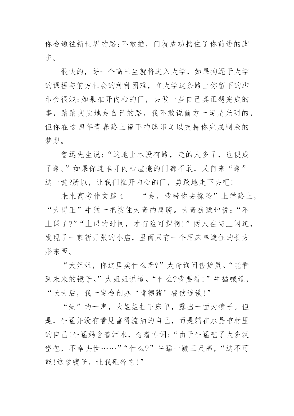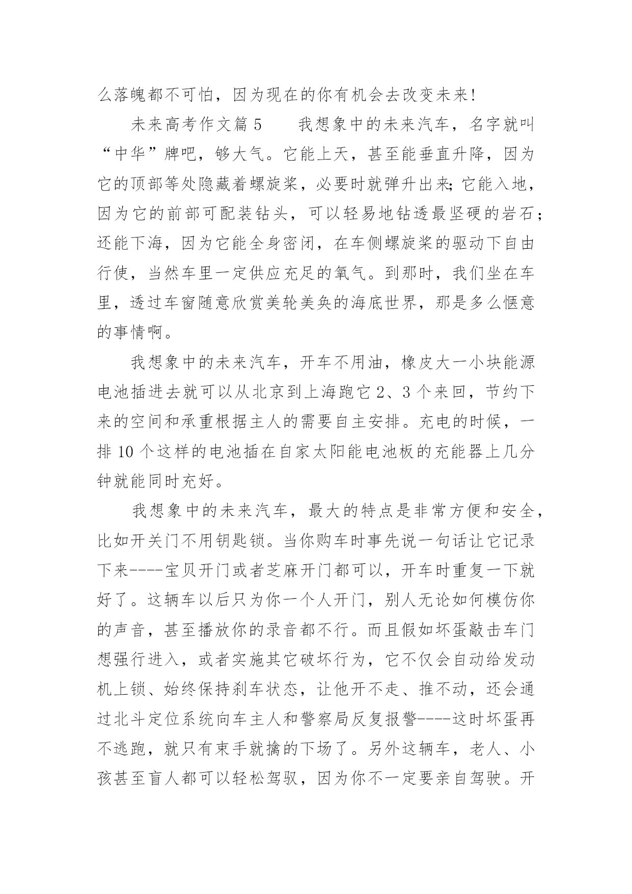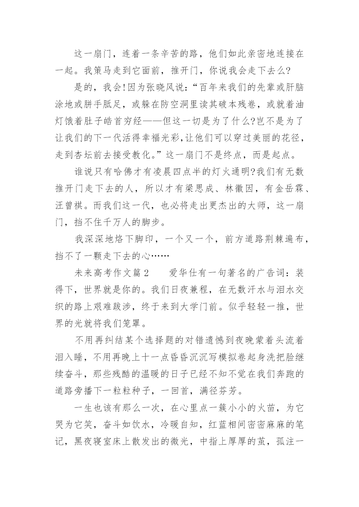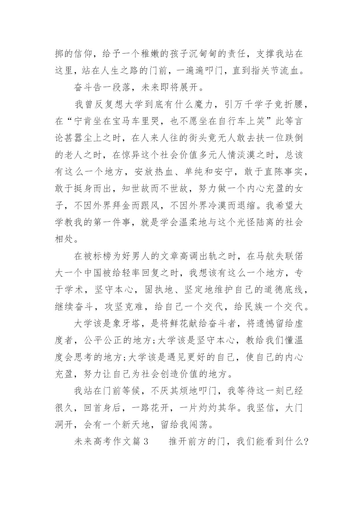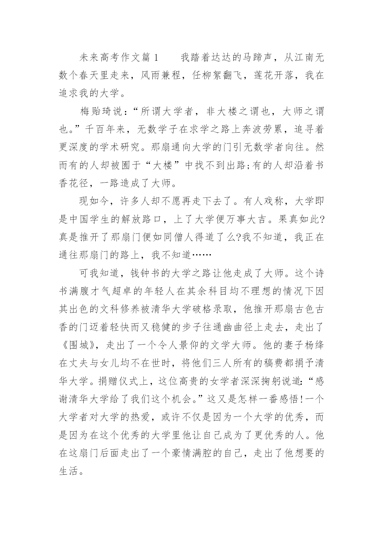 2022未来高考作文2022未来高考作文在生活、工作和学习中,大家都有写作文的经历,对作文很是熟悉吧,借助作文可以宣泄心中的情感,调节自己的心情。你知道作文怎样写才规范吗?下面是小编为大家收集的2022未来高考作文,欢迎大家分享。【作文题目】浙江卷:未来(2022年)近年来,浙江省着力强化创新驱动,深入实施人才强省、创新强省首位战略,深入实施“鲲鹏行动”“高层次人才特殊支持计划”等人才工程,全省高质量发展水平持续提升。新时代浙江青年,在各行各业、不同领域开拓创新。如95后姑娘徐枫灿,在空军航空大学刻苦训练、满分通过考核,成为我国陆军首位初放单飞的女飞行员;90后青年工人杨杰,从一名普通的学徒工成长为“浙江工匠”,获得浙江省劳动模范称号;之江实验室智能超算研究中心团队,35岁以下成员占比近九成,勇闯国内智能超算领域“无人区”,斩获超算应用领域的国际最高奖项——戈登贝尔奖……以上材料对你未来发展有什么启示?请写一篇文章。【注意】①角度自选,立意自定,题目自拟。②明确文体,不得写成诗歌。③不得少于800字。④不得抄袭、套作。作文范文:未来高考作文篇1我踏着达达的马蹄声,从江南无数个春天里走来,风雨兼程,任柳絮翻飞,莲花开落,我在追求我的大学。梅贻琦说:“所谓大学者,非大楼之谓也,大师之谓也。”千百年来,无数学子在求学之路上奔波劳累,追寻着更深度的学术研究。那扇通向大学的门引无数学者向往。然而有的人却被囿于“大楼”中找不到出路;有的人却沿着书香花径,一路造成了大师。现如今,许多人却不愿再走下去了。有人戏称,大学即是中国学生的解放路口,上了大学便万事大吉。果真如此?真是推开了那扇门便如同僧人得道了么?我不知道,我正在通往那扇门的路上,我不知道……可我知道,钱钟书的大学之路让他走成了大师。这个诗书满腹才气超卓的年轻人在其余科目均不理想的情况下因其出色的文科修养被清华大学破格录取,他推开那扇古色古香的门迈着轻快而又稳健的步子往通幽曲径上走去,走出了《围城》,走出了一个令人景仰的文学大师。他的妻子杨绛在丈夫与女儿均不在世时,将他们三人所有的稿费都捐予清华大学。捐赠仪式上,这位高贵的女学者深深掬躬说道:“感谢清华大学给了我们这个机会。”这又是怎样一番感悟!一个大学者对大学的热爱,或许不仅是因为一个大学的优秀,而是因为在这个优秀的大学里他让自己成为了更优秀的人。他在这扇门后面走出了一个豪情满腔的自己,走出了他想要的生活。这一扇门,连着一条辛苦的路,他们如此亲密地连接在一起。我策马走到它面前,推开门,你说我会走下去么?是的,我会!因为张晓风说:“百年来我们的先辈或肝脑涂地或胼手胝足,或躲在防空洞里读其破本残卷,或就着油灯饿着肚子皓首穷经——但这一切是为了什么?岂不是为了让我们的下一代活得幸福光彩,让他们可以穿过美丽的花径,走到杏坛前去接受教化。”这一扇门不是终点,而是起点。谁说只有哈佛才有凌晨四点半的灯火通明?我们有无数推开门走下去的人,所以才有梁思成、林徽因,有金岳霖、汪曾祺。而我们这一代,也必将走出更杰出的大师,这一扇门,挡不住千万人的脚步。我深深地烙下脚印,一个又一个,前方道路荆棘遍布,挡不了一颗走下去的心……未来高考作文篇2爱华仕有一句著名的广告词:装得下,世界就是你的。我们日夜兼程,在无数汗水与泪水交织的路上艰难跋涉,终于来到大学门前。似乎轻轻一推,世界的光就将我们笼罩。不用再纠结某个选择题的对错遗憾到夜晚蒙着头流着泪入睡,不用再晚上十一点昏昏沉沉写模拟卷起身洗把脸继续奋斗,那些残酷的温暖的日子已经不知不觉在我们奔跑的道路旁播下一粒粒种子,一回首,满径芬芳。一生也该有那么一次,在心里点一簇小小的火苗,为它哭为它笑,奋斗如饮水,冷暖自知,红蓝相间密密麻麻的笔记,黑夜寝室床上散发出的微光,中指上厚厚的茧,孤注一掷的信仰,给予一个稚嫩的孩子沉甸甸的责任,支撑我站在这里,站在人生之路的门前,一遍遍叩门,直到指关节流血。奋斗告一段落,未来即将展开。我曾反复想大学到底有什么魔力,引万千学子竞折腰,在“宁肯坐在宝马车里哭,也不愿坐在自行车上笑”此等言论甚嚣尘上之时,在人来人往的街头竟无人敢去扶一位跌倒的老人之时,在惊异这个社会价值多元人情淡漠之时,总该有这么一个地方,安放热血、单纯和安宁,敢于直陈事实,敢于挺身而出,知世故而不世故,努力做一个内心充盈的女子,不因外界拜金而跟风,不因外界冷漠而退缩。我希望大学教我的第一件事,就是学会温柔地与这个光怪陆离的社会相处。在被标榜为好男人的文章高调出轨之时,在马航失联偌大一个中国被给轻率回复之时,我想该有这么一个地方,专于学术,坚守本心,固执地、坚定地维护自己的道德底线,继续奋斗,攻坚克难,给自己一个交代,给民族一个交代。大学该是象牙塔,是将鲜花献给奋斗者,将遗憾留给虚度者,公平公正的地方;大学该是坚守本心,