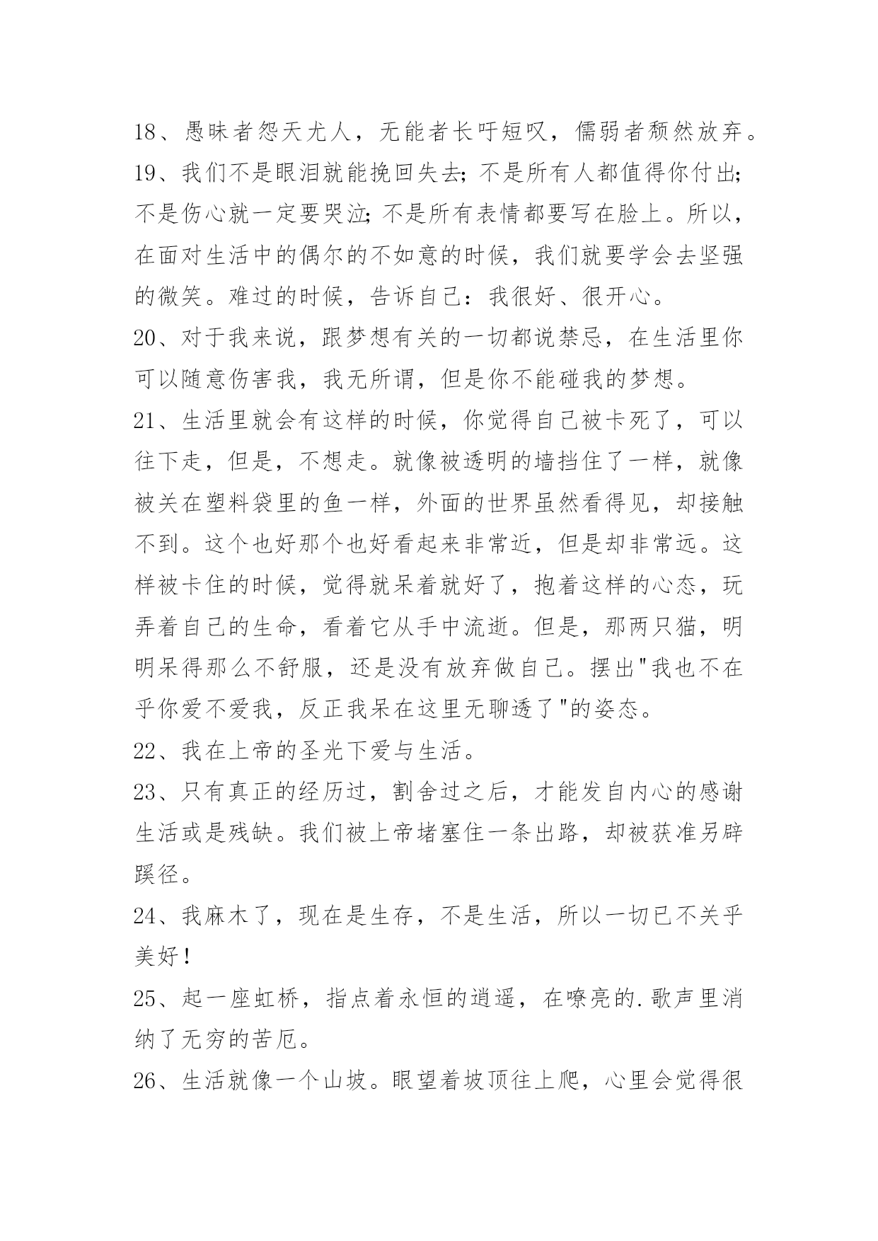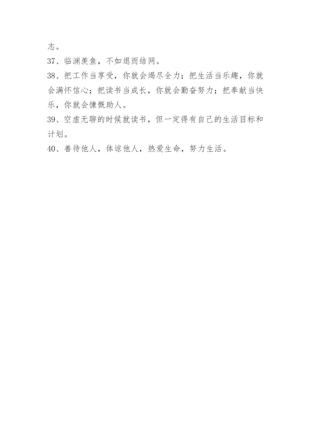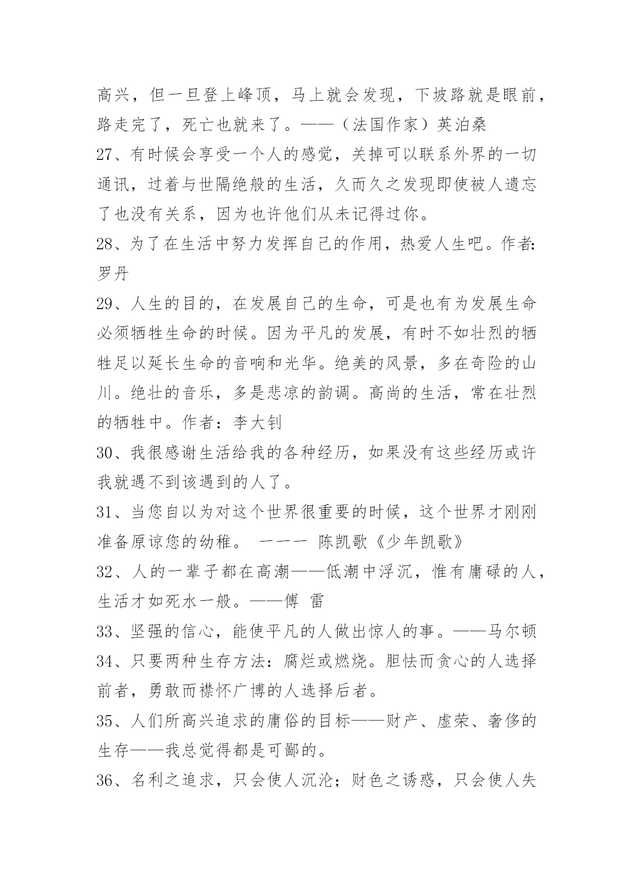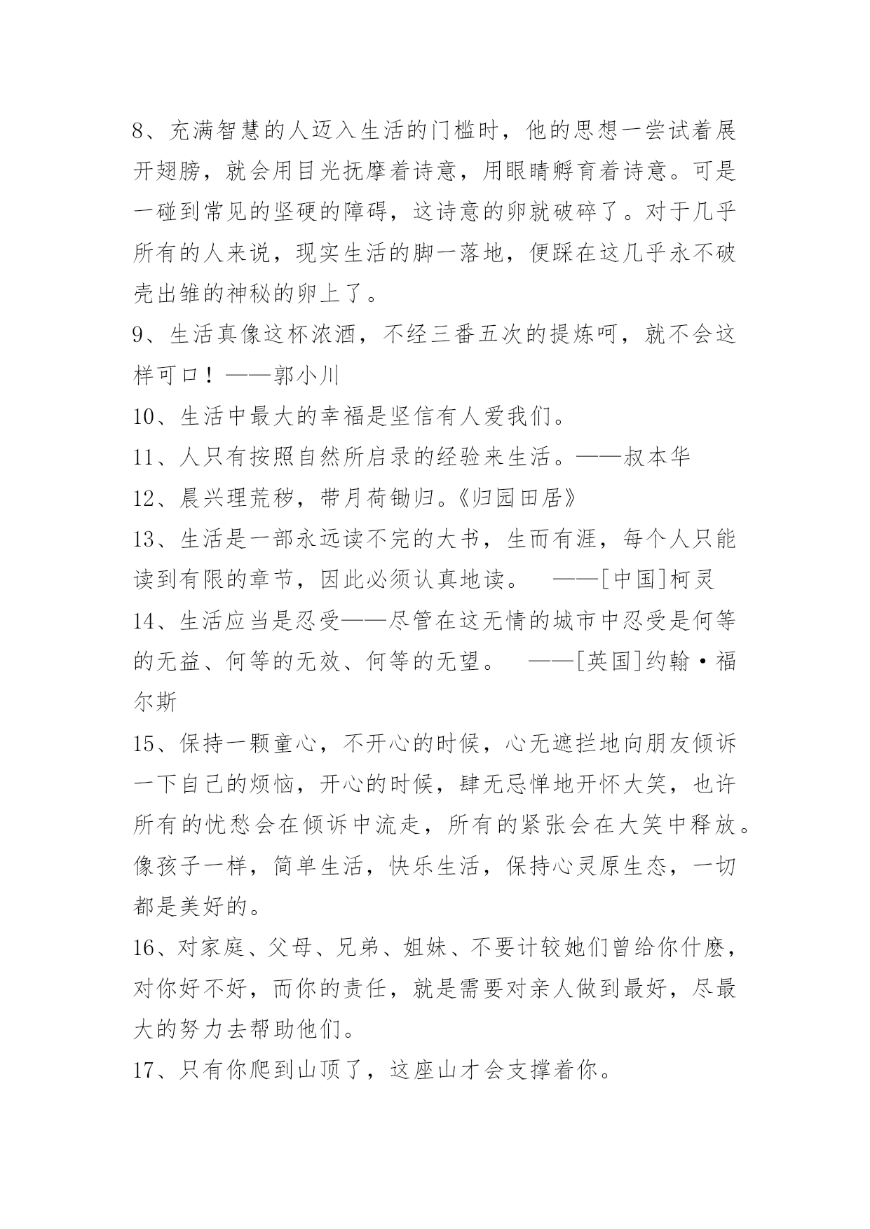 经典生活名言名句2021年经典生活名言名句锦集40句有眼界才有境界,有实力才有魅力,有思路才有出路,有作为才有地位。政从正来,智从知来,财从才来,位从为来!以下是小编为大家提供的生活名言名句40句,一起来看一下吧。1、岁月的辗转,自己知道这样的日子有多么的辛苦。但是,我想我们还是很感谢老天让我们做了一回人,经受了生活的洗礼,学到了很多,也懂得了很多。在生活的重重洗礼下,我们懂得了:珍惜现在拥有的,努力去营造明天更美的生活。2、面对生活的风风雨雨,只有具备坚强意志的人,才能活出多彩的人生。3、布施不是有钱人的专利品,而是一分虔诚的爱心。4、不要因为长期埋头科学,而失去对生活、对美、对待诗意的感受能力。——达尔文5、在寂寞无聊中,一个人才能感到跟关于思想的人在一起生活的好处。——卢梭6、人在童年和少年时代,快乐和幸福如果得到的越容易,那么他在成年的生活中就越不懂得什么是真正的幸福。——苏霍姆林斯基7、生活在书的世界之中,意味着领略思维的美,享受文化财富,使自身变得更加高尚。——苏霍姆林斯基8、充满智慧的人迈入生活的门槛时,他的思想一尝试着展开翅膀,就会用目光抚摩着诗意,用眼睛孵育着诗意。可是一碰到常见的坚硬的障碍,这诗意的卵就破碎了。对于几乎所有的人来说,现实生活的脚一落地,便踩在这几乎永不破壳出雏的神秘的卵上了。9、生活真像这杯浓酒,不经三番五次的提炼呵,就不会这样可口!——郭小川10、生活中最大的幸福是坚信有人爱我们。11、人只有按照自然所启录的经验来生活。——叔本华12、晨兴理荒秽,带月荷锄归。《归园田居》13、生活是一部永远读不完的大书,生而有涯,每个人只能读到有限的章节,因此必须认真地读。——[中国]柯灵14、生活应当是忍受——尽管在这无情的城市中忍受是何等的无益、何等的无效、何等的无望。——[英国]约翰·福尔斯15、保持一颗童心,不开心的时候,心无遮拦地向朋友倾诉一下自己的烦恼,开心的时候,肆无忌惮地开怀大笑,也许所有的忧愁会在倾诉中流走,所有的紧张会在大笑中释放。像孩子一样,简单生活,快乐生活,保持心灵原生态,一切都是美好的。16、对家庭、父母、兄弟、姐妹、不要计较她们曾给你什麽,对你好不好,而你的责任,就是需要对亲人做到最好,尽最大的努力去帮助他们。17、只有你爬到山顶了,这座山才会支撑着你。18、愚昧者怨天尤人,无能者长吁短叹,儒弱者颓然放弃。19、我们不是眼泪就能挽回失去;不是所有人都值得你付出;不是伤心就一定要哭泣;不是所有表情都要写在脸上。所以,在面对生活中的偶尔的不如意的时候,我们就要学会去坚强的微笑。难过的时候,告诉自己:我很好、很开心。20、对于我来说,跟梦想有关的一切都说禁忌,在生活里你可以随意伤害我,我无所谓,但是你不能碰我的梦想。21、生活里就会有这样的时候,你觉得自己被卡死了,可以往下走,但是,不想走。就像被透明的墙挡住了一样,就像被关在塑料袋里的鱼一样,外面的世界虽然看得见,却接触不到。这个也好那个也好看起来非常近,但是却非常远。这样被卡住的时候,觉得就呆着就好了,抱着这样的心态,玩弄着自己的生命,看着它从手中流逝。但是,那两只猫,明明呆得那么不舒服,还是没有放弃做自己。摆出"我也不在乎你爱不爱我,反正我呆在这里无聊透了"的姿态。22、我在上帝的圣光下爱与生活。23、只有真正的经历过,割舍过之后,才能发自内心的感谢生活或是残缺。我们被上帝堵塞住一条出路,却被获准另辟蹊径。24、我麻木了,现在是生存,不是生活,所以一切已不关乎美好!25、起一座虹桥,指点着永恒的逍遥,在嘹亮的.歌声里消纳了无穷的苦厄。26、生活就像一个山坡。眼望着坡顶往上爬,心里会觉得很高兴,但一旦登上峰顶,马上就会发现,下坡路就是眼前,路走完了,死亡也就来了。——(法国作家)英泊桑27、有时候会享受一个人的感觉,关掉可以联系外界的一切通讯,过着与世隔绝般的生活,久而久之发现即使被人遗忘了也没有关系,因为也许他们从未记得过你。28、为了在生活中努力发挥自己的作用,热爱人生吧。作者:罗丹29、人生的目的,在发展自己的生命,可是也有为发展生命必须牺牲生命的时候。因为平凡的发展,有时不如壮烈的牺牲足以延长生命的音响和光华。绝美的风景,多在奇险的山川。绝壮的音乐,多是悲凉的韵调。高尚的生活,常在壮烈的牺牲中。作者:李大钊30、我很感谢生活给我的各种经历,如果没有这些经历或许我就遇不到该遇到的人了。31、当您自以为对这个世界很重要的时候,这个世界才刚刚准备原谅您的幼稚。一一一陈凯歌《少年凯歌》32、人的一辈子都在高潮——低潮中浮沉,惟有庸碌的人,生活才如死水一般。——傅雷33、坚强的信心,能使平凡的人做出惊人的事。——马尔顿34、只要两种生存方法:腐烂或燃烧。胆怯而贪心的人选择前者,勇敢而襟怀广博的人选择后者。35、人们所高兴追求的