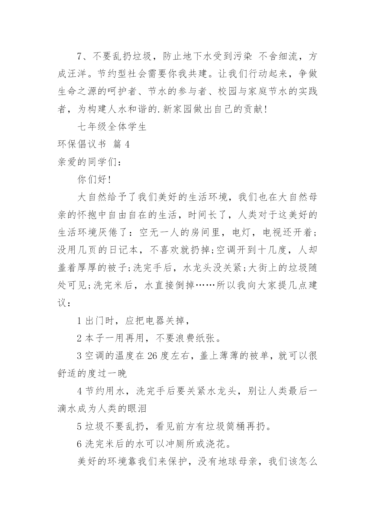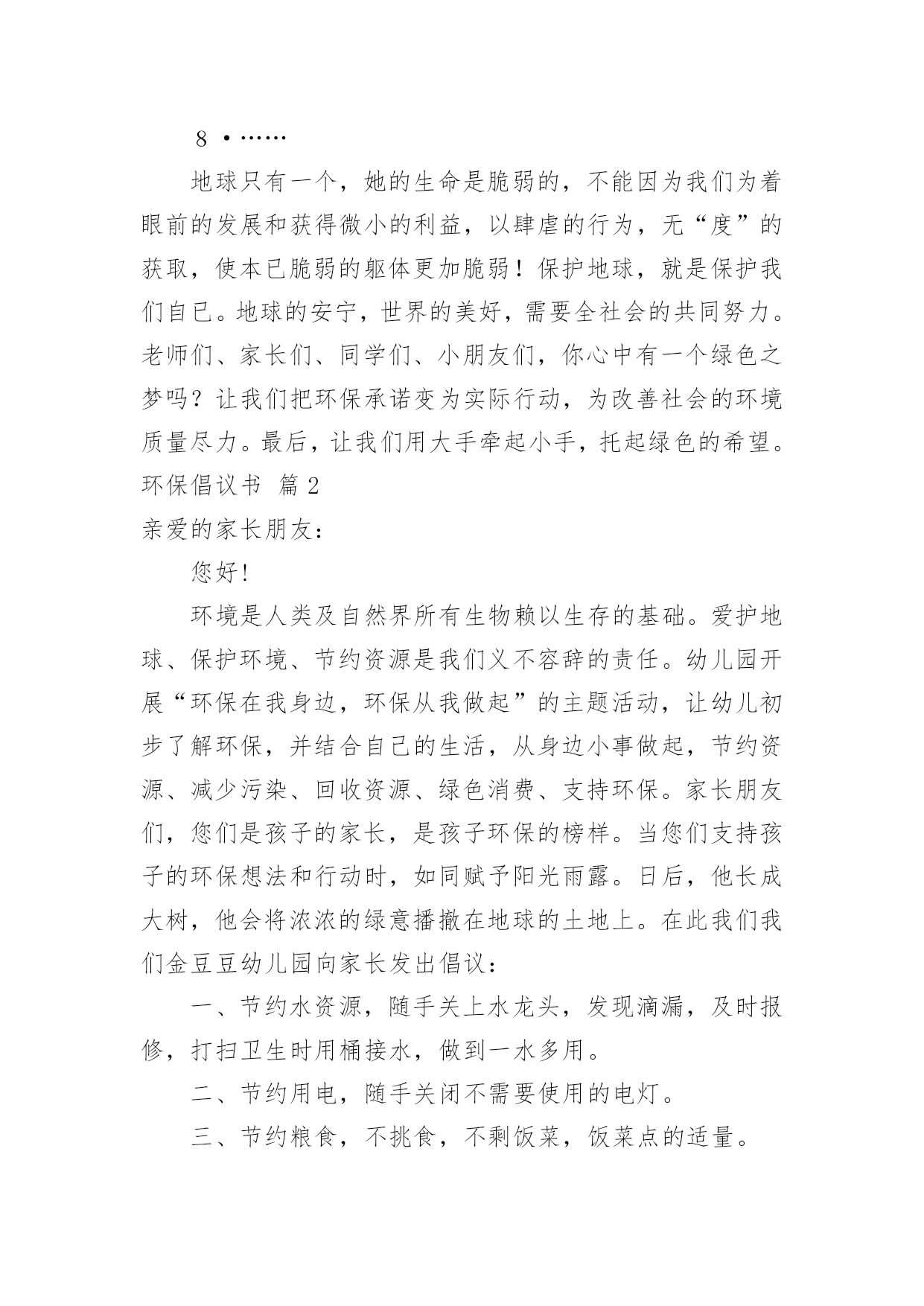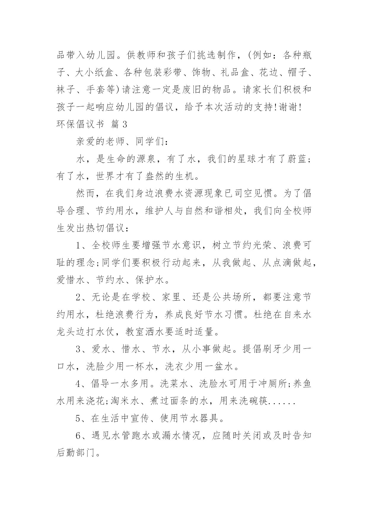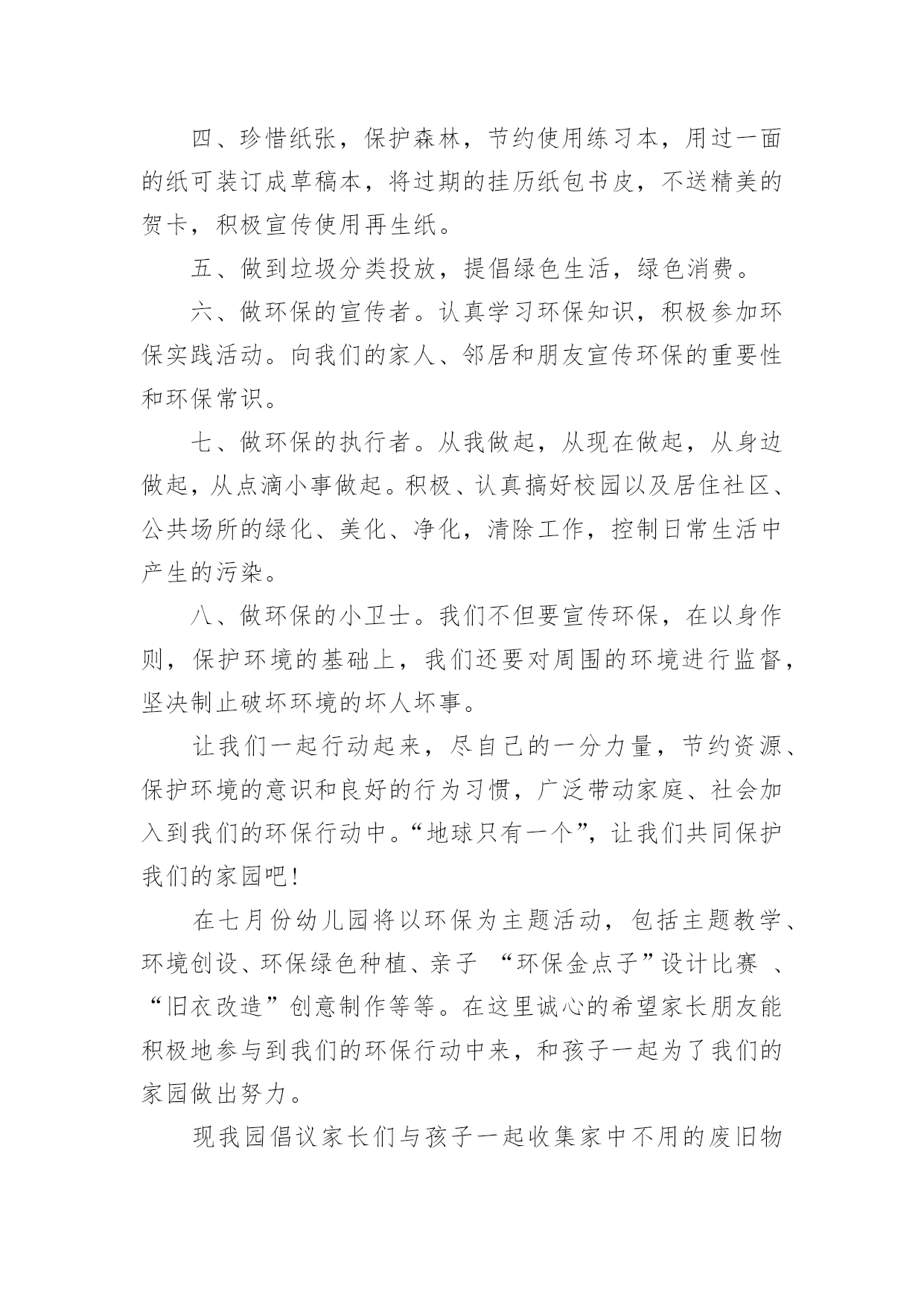 环保倡议书【推荐】环保倡议书4篇环保倡议书篇1敬爱的环保局:地球是人类的母亲,是生命的摇篮。我们本应该保护地球母亲的,而我们却在破坏地球母亲,破坏地球母亲那光滑的皮肤。正如《只有一个地球》这篇文章所说的,我们不能再指望破坏了地球后再移居到别的星球上去。所以我们亡羊补牢,为时不晚,保护我们的地球,爱护环境,我给大家提一些建议:1、大力节约资源,不使用或少用一次性饭盒、筷子等消费品,不浪费纸张。2、大力节约能源,不浪费水电,随手关灯、随时关紧水龙头。3、使用环保电池,防止汞、铬污染、慎用洗涤剂,减少水污染。4、自觉保护生活环境,积极参与社会绿化美化活动,保护绿地、花木。5、建议垃圾分类,清理“白色”污染,把废塑料袋打个节再扔进垃圾箱。6、建议文明行为,从我做起,不随地吐痰,不乱扔废弃物,保护绿色环境。7、尽量使用公共交通工具、自行车或步行,减少空气污染;使用无铅汽油,购买小排气量的轿车。8·……地球只有一个,她的生命是脆弱的,不能因为我们为着眼前的发展和获得微小的利益,以肆虐的行为,无“度”的获取,使本已脆弱的躯体更加脆弱!保护地球,就是保护我们自已。地球的安宁,世界的美好,需要全社会的共同努力。老师们、家长们、同学们、小朋友们,你心中有一个绿色之梦吗?让我们把环保承诺变为实际行动,为改善社会的环境质量尽力。最后,让我们用大手牵起小手,托起绿色的希望。环保倡议书篇2亲爱的家长朋友:您好!环境是人类及自然界所有生物赖以生存的基础。爱护地球、保护环境、节约资源是我们义不容辞的责任。幼儿园开展“环保在我身边,环保从我做起”的主题活动,让幼儿初步了解环保,并结合自己的生活,从身边小事做起,节约资源、减少污染、回收资源、绿色消费、支持环保。家长朋友们,您们是孩子的家长,是孩子环保的榜样。当您们支持孩子的环保想法和行动时,如同赋予阳光雨露。日后,他长成大树,他会将浓浓的绿意播撤在地球的土地上。在此我们我们金豆豆幼儿园向家长发出倡议:一、节约水资源,随手关上水龙头,发现滴漏,及时报修,打扫卫生时用桶接水,做到一水多用。二、节约用电,随手关闭不需要使用的电灯。三、节约粮食,不挑食,不剩饭菜,饭菜点的适量。四、珍惜纸张,保护森林,节约使用练习本,用过一面的纸可装订成草稿本,将过期的挂历纸包书皮,不送精美的贺卡,积极宣传使用再生纸。五、做到垃圾分类投放,提倡绿色生活,绿色消费。六、做环保的宣传者。认真学习环保知识,积极参加环保实践活动。向我们的家人、邻居和朋友宣传环保的重要性和环保常识。七、做环保的执行者。从我做起,从现在做起,从身边做起,从点滴小事做起。积极、认真搞好校园以及居住社区、公共场所的绿化、美化、净化,清除工作,控制日常生活中产生的污染。八、做环保的小卫士。我们不但要宣传环保,在以身作则,保护环境的基础上,我们还要对周围的环境进行监督,坚决制止破坏环境的坏人坏事。让我们一起行动起来,尽自己的一分力量,节约资源、保护环境的意识和良好的行为习惯,广泛带动家庭、社会加入到我们的环保行动中。“地球只有一个”,让我们共同保护我们的家园吧!在七月份幼儿园将以环保为主题活动,包括主题教学、环境创设、环保绿色种植、亲子“环保金点子”设计比赛、“旧衣改造”创意制作等等。在这里诚心的希望家长朋友能积极地参与到我们的环保行动中来,和孩子一起为了我们的家园做出努力。现我园倡议家长们与孩子一起收集家中不用的废旧物品带入幼儿园。供教师和孩子们挑选制作,(例如:各种瓶子、大小纸盒、各种包装彩带、饰物、礼品盒、花边、帽子、袜子、手套等)请注意一定是废旧的物品。请家长们积极和孩子一起响应幼儿园的倡议,给予本次活动的支持!谢谢!环保倡议书篇3亲爱的老师、同学们:水,是生命的源泉,有了水,我们的星球才有了蔚蓝;有了水,世界才有了盎然的生机。然而,在我们身边浪费水资源现象已司空见惯。为了倡导合理、节约用水,维护人与自然和谐相处,我们向全校师生发出热切倡议:1、全校师生要增强节水意识,树立节约光荣、浪费可耻的理念;同学们要积极行动起来,从我做起、从点滴做起,爱惜水、节约水、保护水。2、无论是在学校、家里、还是公共场所,都要注意节约用水,杜绝浪费行为,养成良好节水习惯。杜绝在自来水龙头边打水仗,教室洒水要适时适量。3、爱水、惜水、节水,从小事做起。提倡刷牙少用一口水,洗脸少用一杯水,洗衣少用一盆水。4、倡导一水多用。洗菜水、洗脸水可用于冲厕所;养鱼水用来浇花;淘米水、煮过面条的水,用来洗碗筷......5、在生活中宣传、使用节水器具。6、遇见水管跑水或漏水情况,应随时关闭或及时告知后勤部门。7、不要乱扔垃圾,防止地下水受到污染不舍细流,方成汪洋。节约型社会需要你我共建。让我们行动起来,争做生命之源的呵护者、节水的参与者、校园与家庭节水的实践者,为构建人水和谐的.新家园做出自己的