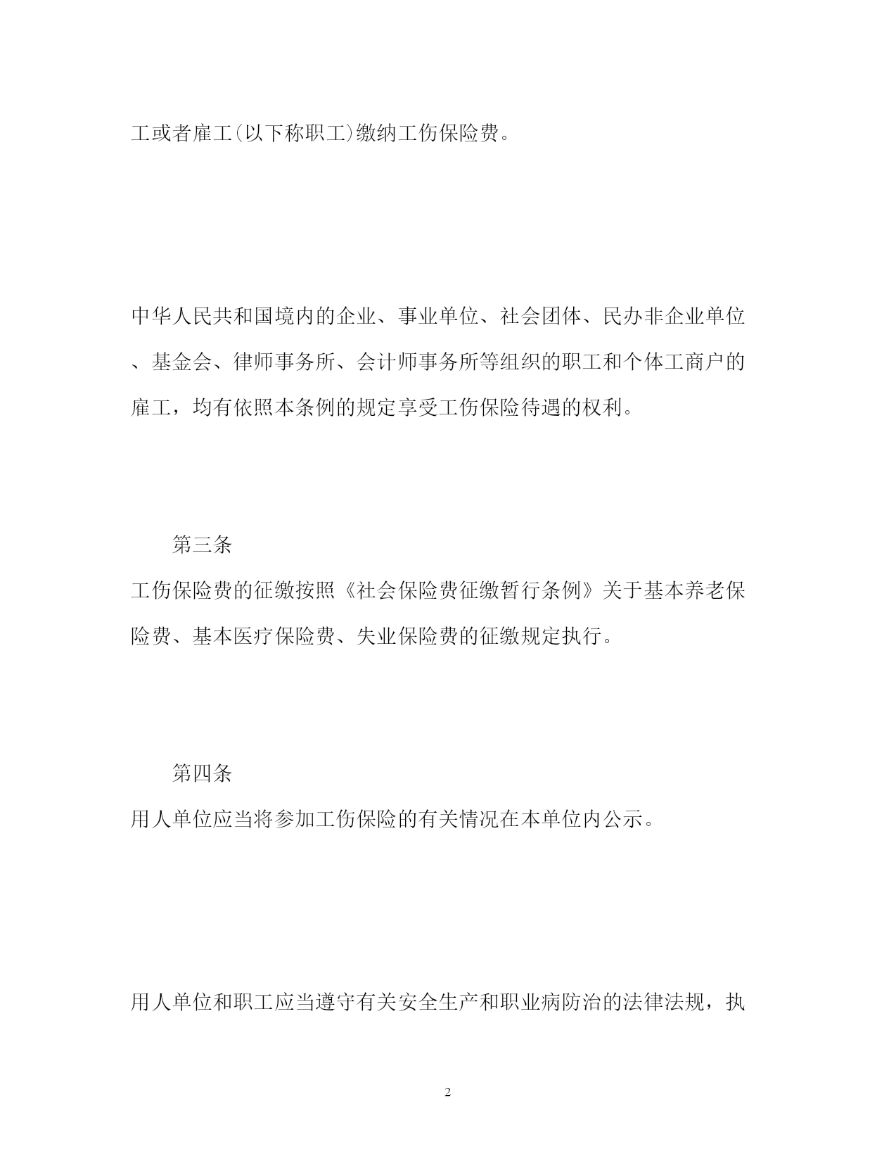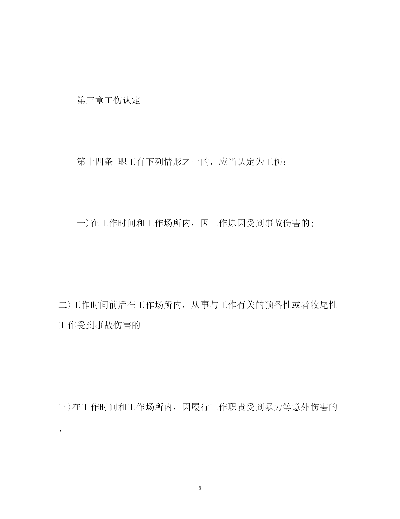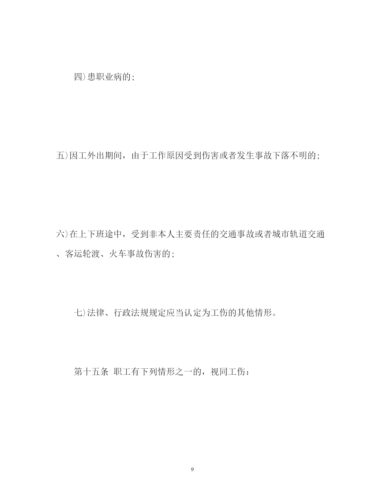 此资料由网络收集而来,如有侵权请告知上传者立即删除。资料共分享,我们负责传递知识。PAGEPAGE15工伤保险条例细则工伤保险条例细则第一章总则第一条为了保障因工作遭受事故伤害或者患职业病的职工获得医疗救治和经济补偿,促进工伤预防和职业康复,分散用人单位的工伤风险,制定本条例。第二条中华人民共和国境内的企业、事业单位、社会团体、民办非企业单位、基金会、律师事务所、会计师事务所等组织和有雇工的个体工商户(以下称用人单位)应当依照本条例规定参加工伤保险,为本单位全部职工或者雇工(以下称职工)缴纳工伤保险费。中华人民共和国境内的企业、事业单位、社会团体、民办非企业单位、基金会、律师事务所、会计师事务所等组织的职工和个体工商户的雇工,均有依照本条例的规定享受工伤保险待遇的权利。第三条工伤保险费的征缴按照《社会保险费征缴暂行条例》关于基本养老保险费、基本医疗保险费、失业保险费的征缴规定执行。第四条用人单位应当将参加工伤保险的有关情况在本单位内公示。用人单位和职工应当遵守有关安全生产和职业病防治的法律法规,执行安全卫生规程和标准,预防工伤事故发生,避免和减少职业病危害。职工发生工伤时,用人单位应当采取措施使工伤职工得到及时救治。第五条国务院社会保险行政部门负责全国的工伤保险工作。县级以上地方各级人民政府社会保险行政部门负责本行政区域内的工伤保险工作。社会保险行政部门按照国务院有关规定设立的社会保险经办机构(以下称经办机构)具体承办工伤保险事务。第六条社会保险行政部门等部门制定工伤保险的政策、标准,应当征求工会组织、用人单位代表的意见。第二章工伤保险基金第七条工伤保险基金由用人单位缴纳的工伤保险费、工伤保险基金的利息和依法纳入工伤保险基金的其他资金构成。第八条工伤保险费根据以支定收、收支平衡的原则,确定费率。国家根据不同行业的工伤风险程度确定行业的差别费率,并根据工伤保险费使用、工伤发生率等情况在每个行业内确定若干费率档次。行业差别费率及行业内费率档次由国务院社会保险行政部门制定,报国务院批准后公布施行。统筹地区经办机构根据用人单位工伤保险费使用、工伤发生率等情况,适用所属行业内相应的费率档次确定单位缴费费率。第九条国务院社会保险行政部门应当定期了解全国各统筹地区工伤保险基金收支情况,及时提出调整行业差别费率及行业内费率档次的方案,报国务院批准后公布施行。第十条用人单位应当按时缴纳工伤保险费。职工个人不缴纳工伤保险费。用人单位缴纳工伤保险费的数额为本单位职工工资总额乘以单位缴费费率之积。对难以按照工资总额缴纳工伤保险费的行业,其缴纳工伤保险费的具体方式,由国务院社会保险行政部门规定。第十一条工伤保险基金逐步实行省级统筹。跨地区、生产流动性较大的行业,可以采取相对集中的方式异地参加统筹地区的工伤保险。具体办法由国务院社会保险行政部门会同有关行业的主管部门制定。第十二条工伤保险基金存入社会保障基金财政专户,用于本条例规定的工伤保险待遇,劳动能力鉴定,工伤预防的宣传、培训等费用,以及法律、法规规定的用于工伤保险的其他费用的支付。工伤预防费用的提取比例、使用和管理的具体办法,由国务院社会保险行政部门会同国务院财政、卫生行政、安全生产监督管理等部门规定。任何单位或者个人不得将工伤保险基金用于投资运营、兴建或者改建办公场所、发放奖金,或者挪作其他用途。第十三条工伤保险基金应当留有一定比例的储备金,用于统筹地区重大事故的工伤保险待遇支付;储备金不足支付的,由统筹地区的人民政府垫付。储备金占基金总额的具体比例和储备金的使用办法,由省、自治区、直辖市人民政府规定。第三章工伤认定第十四条职工有下列情形之一的,应当认定为工伤:一)在工作时间和工作场所内,因工作原因受到事故伤害的;二)工作时间前后在工作场所内,从事与工作有关的预备性或者收尾性工作受到事故伤害的;三)在工作时间和工作场所内,因履行工作职责受到暴力等意外伤害的;四)患职业病的;五)因工外出期间,由于工作原因受到伤害或者发生事故下落不明的;六)在上下班途中,受到非本人主要责任的交通事故或者城市轨道交通、客运轮渡、火车事故伤害的;七)法律、行政法规规定应当认定为工伤的其他情形。第十五条职工有下列情形之一的,视同工伤:一)在工作时间和工作岗位,突发疾病死亡或者在48小时之内经抢救无效死亡的;二)在抢险救灾等维护国家利益、公共利益活动中受到伤害的;三)职工原在军队服役,因战、因公负伤致残,已取得革命伤残军人证,到用人单位后旧伤复发的。职工有