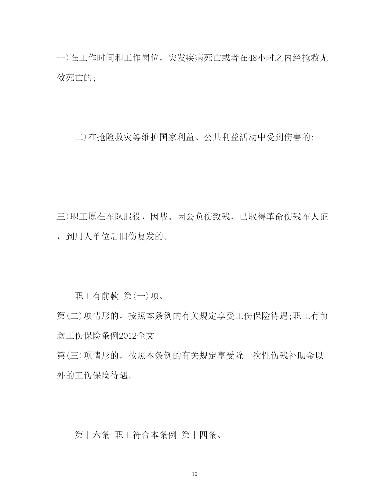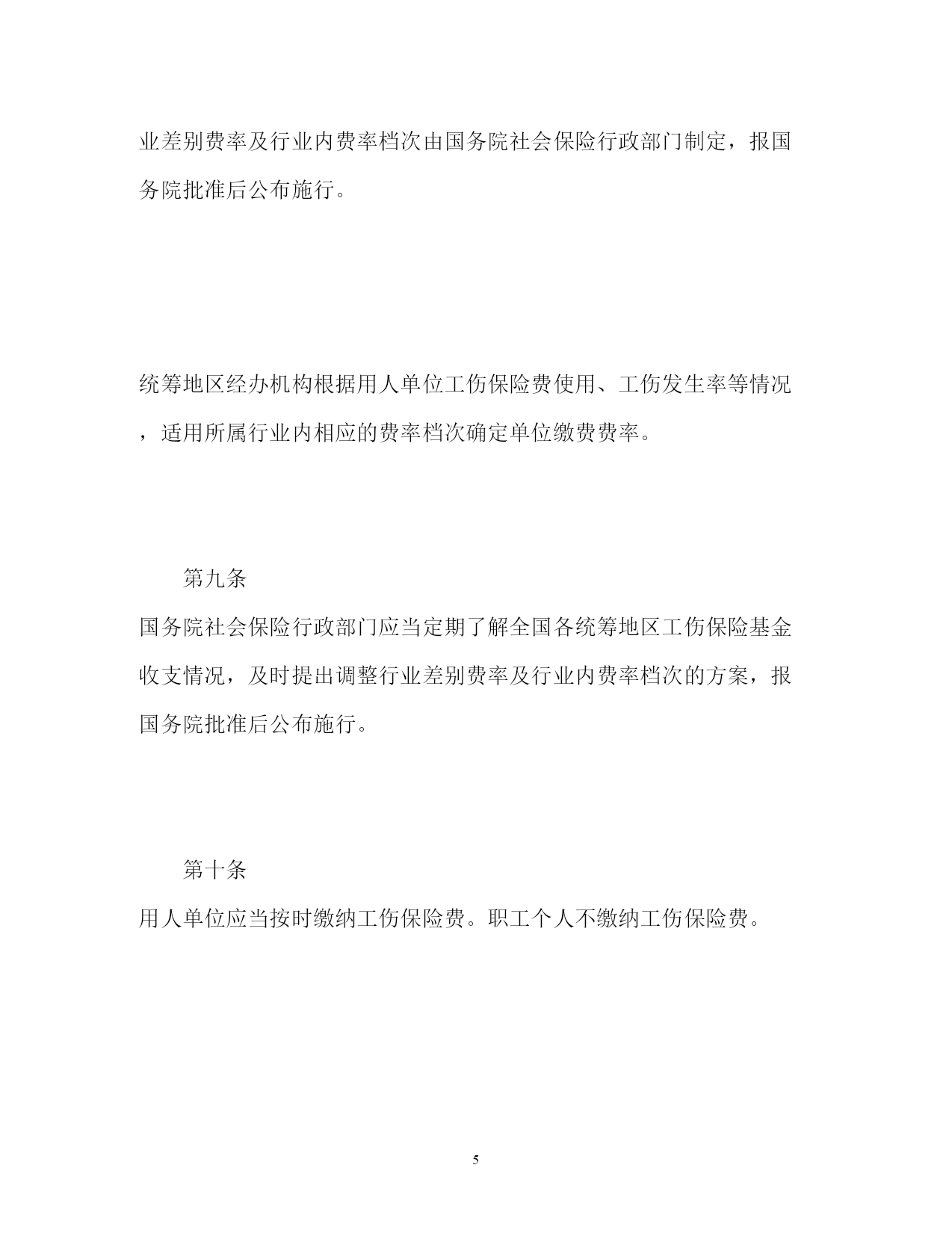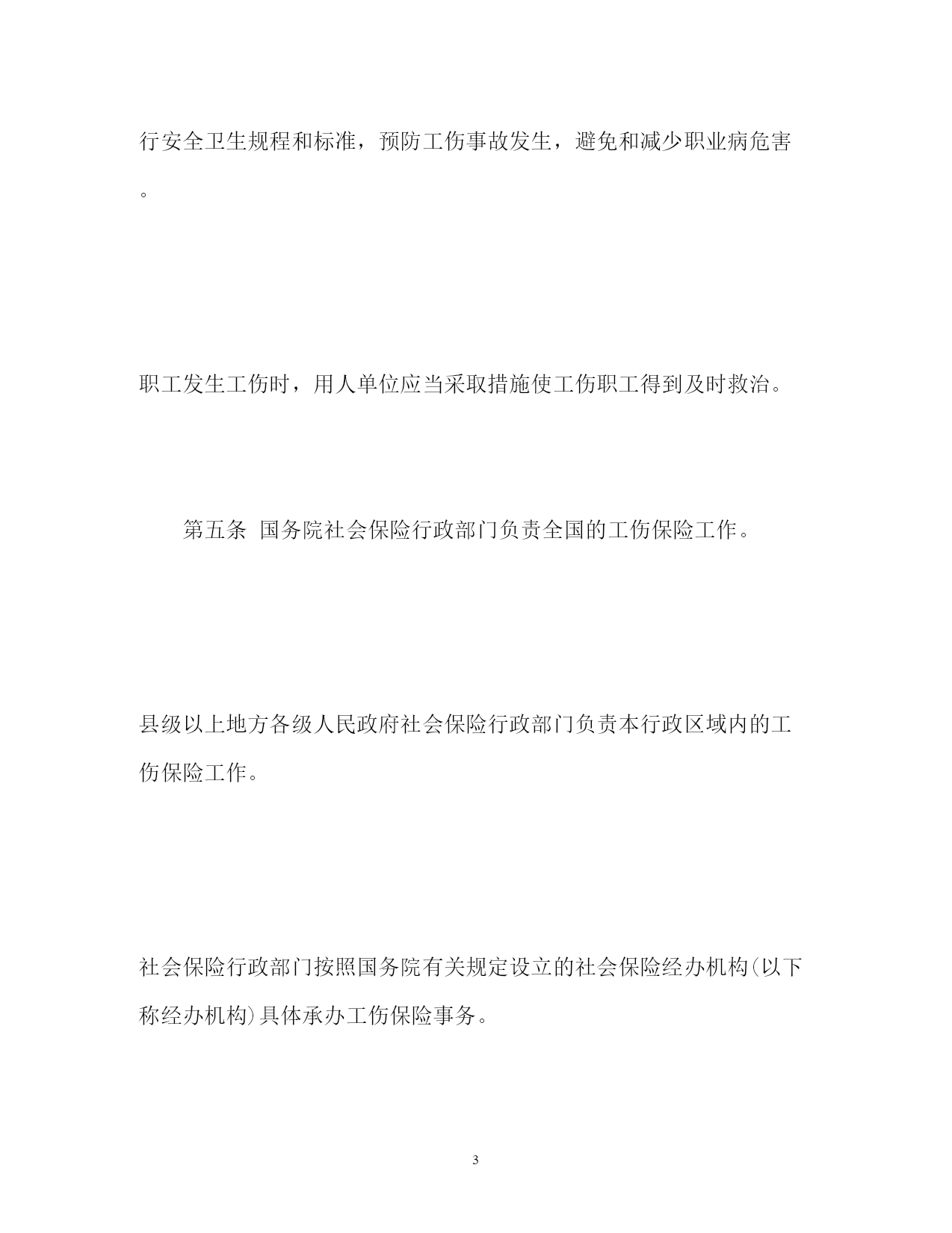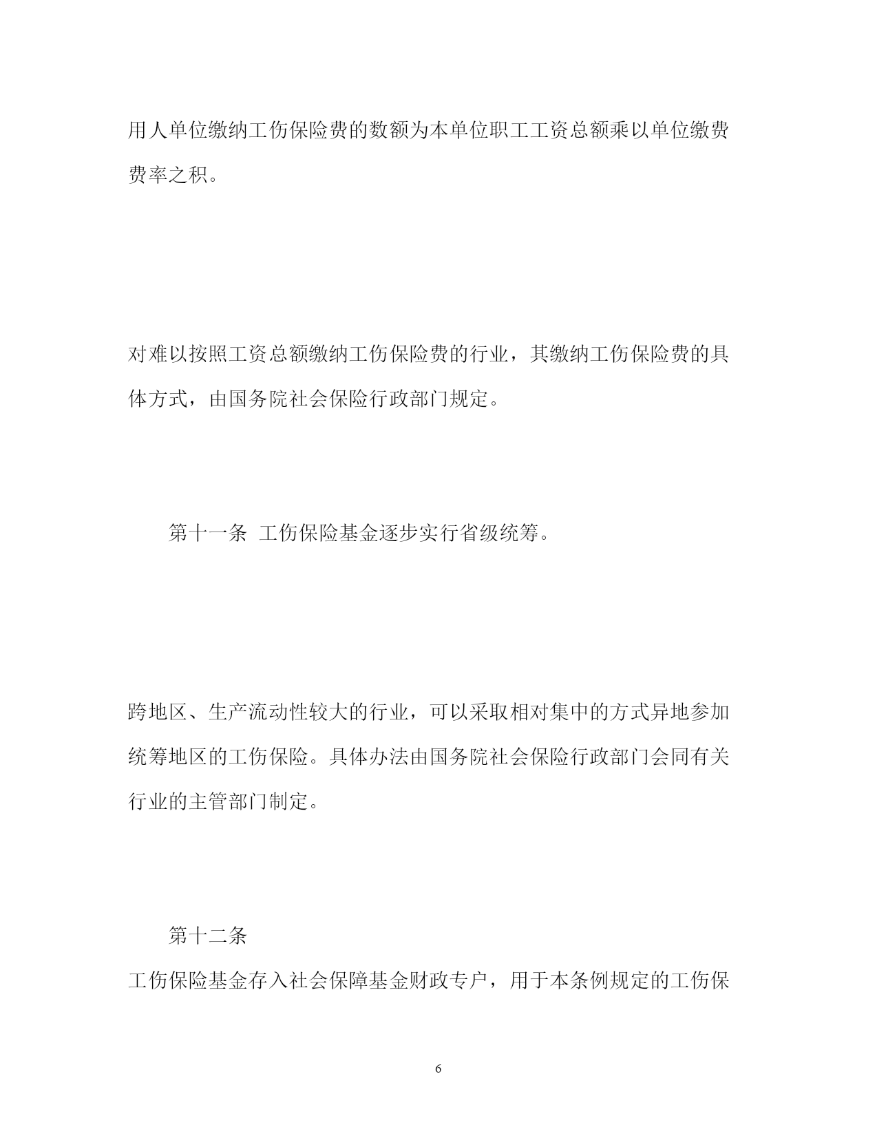 此资料由网络收集而来,如有侵权请告知上传者立即删除。资料共分享,我们负责传递知识。PAGEPAGE15工伤保险条例细则工伤保险条例细则第一章总则第一条为了保障因工作遭受事故伤害或者患职业病的职工获得医疗救治和经济补偿,促进工伤预防和职业康复,分散用人单位的工伤风险,制定本条例。第二条中华人民共和国境内的企业、事业单位、社会团体、民办非企业单位、基金会、律师事务所、会计师事务所等组织和有雇工的个体工商户(以下称用人单位)应当依照本条例规定参加工伤保险,为本单位全部职工或者雇工(以下称职工)缴纳工伤保险费。中华人民共和国境内的企业、事业单位、社会团体、民办非企业单位、基金会、律师事务所、会计师事务所等组织的职工和个体工商户的雇工,均有依照本条例的规定享受工伤保险待遇的权利。第三条工伤保险费的征缴按照《社会保险费征缴暂行条例》关于基本养老保险费、基本医疗保险费、失业保险费的征缴规定执行。第四条用人单位应当将参加工伤保险的有关情况在本单位内公示。用人单位和职工应当遵守有关安全生产和职业病防治的法律法规,执行安全卫生规程和标准,预防工伤事故发生,避免和减少职业病危害。职工发生工伤时,用人单位应当采取措施使工伤职工得到及时救治。第五条国务院社会保险行政部门负责全国的工伤保险工作。县级以上地方各级人民政府社会保险行政部门负责本行政区域内的工伤保险工作。社会保险行政部门按照国务院有关规定设立的社会保险经办机构(以下称经办机构)具体承办工伤保险事务。第六条社会保险行政部门等部门制定工伤保险的政策、标准,应当征求工会组织、用人单位代表的意见。第二章工伤保险基金第七条工伤保险基金由用人单位缴纳的工伤保险费、工伤保险基金的利息和依法纳入工伤保险基金的其他资金构成。第八条工伤保险费根据以支定收、收支平衡的原则,确定费率。国家根据不同行业的工伤风险程度确定行业的差别费率,并根据工伤保险费使用、工伤发生率等情况在每个行业内确定若干费率档次。行业差别费率及行业内费率档次由国务院社会保险行政部门制定,报国务院批准后公布施行。统筹地区经办机构根据用人单位工伤保险费使用、工伤发生率等情况,适用所属行业内相应的费率档次确定单位缴费费率。第九条国务院社会保险行政部门应当定期了解全国各统筹地区工伤保险基金收支情况,及时提出调整行业差别费率及行业内费率档次的方案,报国务院批准后公布施行。第十条用人单位应当按时缴纳工伤保险费。职工个人不缴纳工伤保险费。用人单位缴纳工伤保险费的数额为本单位职工工资总额乘以单位缴费费率之积。对难以按照工资总额缴纳工伤保险费的行业,其缴纳工伤保险费的具体方式,由国务院社会保险行政部门规定。第十一条工伤保险基金逐步实行省级统筹。跨地区、生产流动性较大的行业,可以采取相对集中的方式异地参加统筹地区的工伤保险。具体办法由国务院社会保险行政部门会同有关行业的主管部门制定。第十二条工伤保险基金存入社会保障基金财政专户,用于本条例规定的工伤保险待遇,劳动能力鉴定,工伤预防的宣传、培训等费用,以及法律、法规规定的用于工伤保险的其他费用的支付。工伤预防费用的提取比例、使用和管理的具体办法,由国务院社会保险行政部门会同国务院财政、卫生行政、安全生产监督管理等部门规定。任何单位或者个人不得将工伤保险基金用于投资运营、兴建或者改建办公场所、发放奖金,或者挪作其他用途。第十三条工伤保险基金应当留有一定比例的储备金,用于统筹地区重大事故的工伤保险待遇支付;储备金不足支付的,由统筹地区的人民政府垫付。储备金占基金总额的具体比例和储备金的使用办法,由省、自治区、直辖市人民政府规定。第三章工伤认定第十四条职工有下列情形之一的,应当认定为工伤:一)在工作时间和工作场所内,因工作原因受到事故伤害的;二)工作时间前后在工作场所内,从事与工作有关的预备性或者收尾性工作受到事故伤害的;三)在工作时间和工作场所内,因履行工作职责受到暴力等意外伤害的;四)患职业病的;五)因工外出期间,由于工作原因受到伤害或者发生事故下落不明的;六)在上下班途中,受到非本人主要责任的交通事故或者城市轨道交通、客运轮渡、火车事故伤害的;七)法律、行政法规规定应当认定为工伤的其他情形。第十五条职工有下列情形之一的,视同工伤:一)在工作时间和工作岗位,突发疾病死亡或者在48小时之内经抢救无效死亡的;二)在抢险救灾等维护国家利益、公共利益活动中受到伤害的;三)职工原在军队服役,因战、因公负伤致残,已取得革命伤残军人证,到用人单位后旧伤复发的。职工有