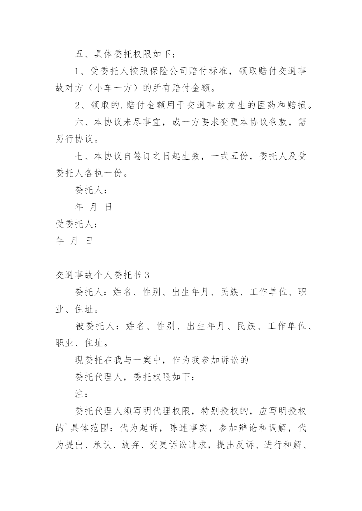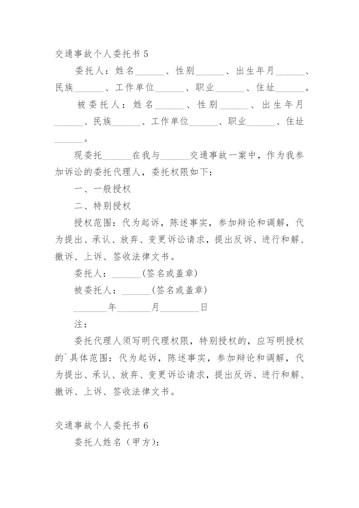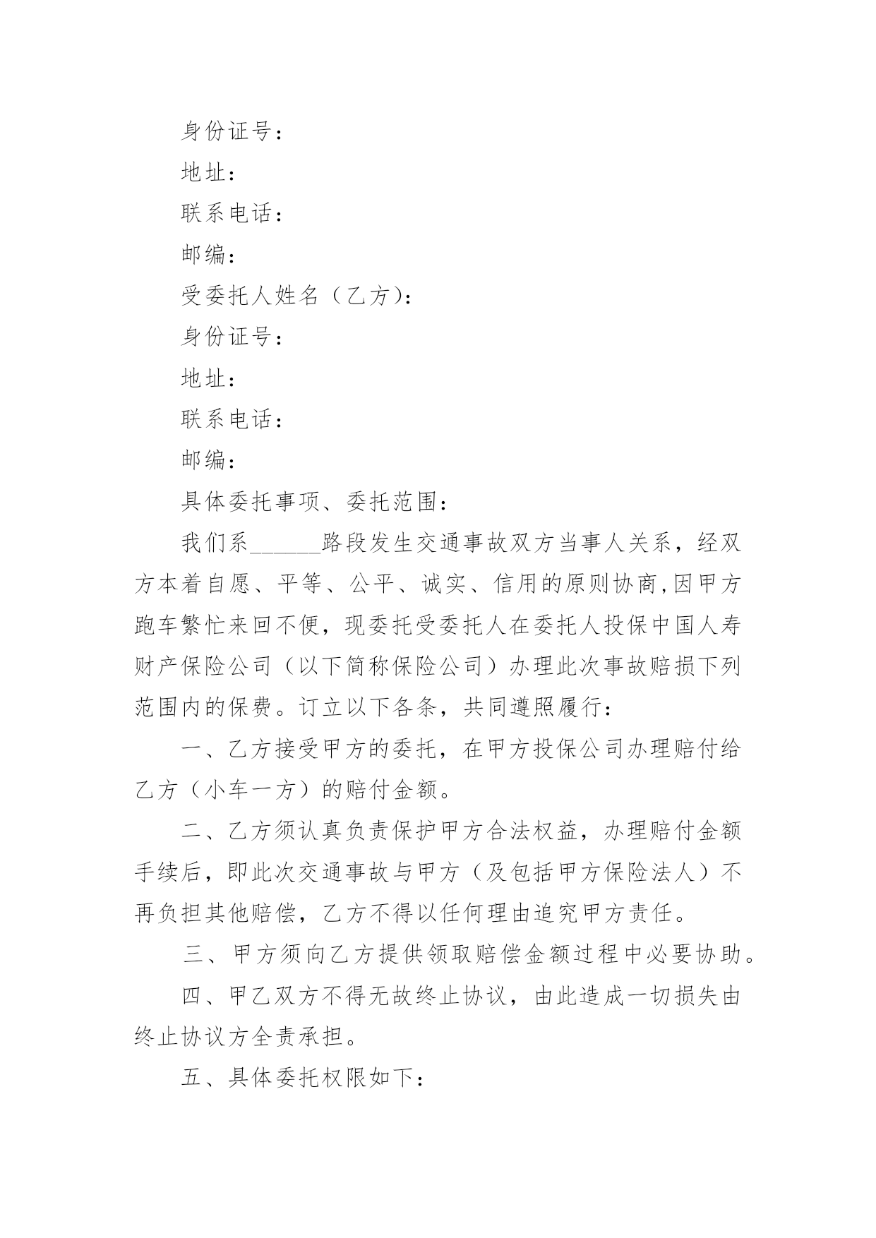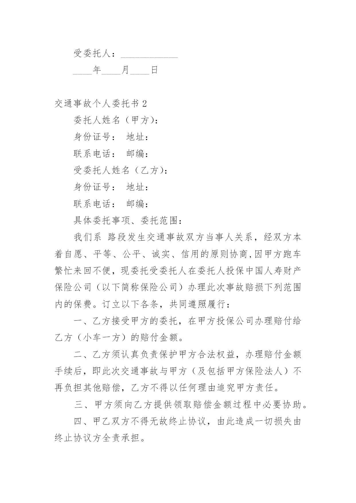 交通事故个人委托书交通事故个人委托书(9篇)被委托人在行使委托书上的合法权益内,被委托人不承担任何法律责任。在发展不断提速的社会中,我们越来越多的事务会去使用委托书,相信许多人会觉得委托书很难写吧,以下是小编收集整理的交通事故个人委托书,欢迎大家分享。交通事故个人委托书1委托人姓名:______(受害人母亲),身份证号:____________;地址:______________联系电话:___________邮编:______________受委托人姓名:______,男,身份证号:___________;地址:____________,联系电话:___________邮编:______________具体委托事项、委托范围:委托人委托上列受委托人在________________________路段发生交通事故死亡一事由____________其代理权限为全权代理。委托人:________________年____月____日受委托人:________________年____月____日交通事故个人委托书2委托人姓名(甲方):身份证号:地址:联系电话:邮编:受委托人姓名(乙方):身份证号:地址:联系电话:邮编:具体委托事项、委托范围:我们系路段发生交通事故双方当事人关系,经双方本着自愿、平等、公平、诚实、信用的原则协商,因甲方跑车繁忙来回不便,现委托受委托人在委托人投保中国人寿财产保险公司(以下简称保险公司)办理此次事故赔损下列范围内的保费。订立以下各条,共同遵照履行:一、乙方接受甲方的委托,在甲方投保公司办理赔付给乙方(小车一方)的赔付金额。二、乙方须认真负责保护甲方合法权益,办理赔付金额手续后,即此次交通事故与甲方(及包括甲方保险法人)不再负担其他赔偿,乙方不得以任何理由追究甲方责任。三、甲方须向乙方提供领取赔偿金额过程中必要协助。四、甲乙双方不得无故终止协议,由此造成一切损失由终止协议方全责承担。五、具体委托权限如下:1、受委托人按照保险公司赔付标准,领取赔付交通事故对方(小车一方)的所有赔付金额。2、领取的.赔付金额用于交通事故发生的医药和赔损。六、本协议未尽事宜,或一方要求变更本协议条款,需另行协议。七、本协议自签订之日起生效,一式五份,委托人及受委托人各执一份。委托人:年月日受委托人:年月日交通事故个人委托书3委托人:姓名、性别、出生年月、民族、工作单位、职业、住址。被委托人:姓名、性别、出生年月、民族、工作单位、职业、住址。现委托在我与一案中,作为我参加诉讼的委托代理人,委托权限如下:注:委托代理人须写明代理权限,特别授权的,应写明授权的`具体范围:代为起诉,陈述事实,参加辩论和调解,代为提出、承认、放弃、变更诉讼请求,提出反诉、进行和解、撤诉、上诉、签收法律文书。法人或其他组织授权委托书,是当事人依法委托他人作为诉讼代理人,向人民法院提交的写明委托事项和权限的文书。委托人:(签名或盖章)被委托人:(签名或盖章)_______年_______月________日交通事故个人委托书4本人______(姓名)系______(投标人名称)的法定代表人,现委托______(姓名)为我方代理人。代理人根据授权,以我方名义签署、澄清、递交、撤回、修改(项目名称)类别设备供应投标文件、签订合同和处理有关事宜,其法律后果由我方承担。委托期限:______。代理人无转委托权。附:法定代表人身份证明申请人:______(盖单位章)法定代表人:______(签字)身份证号码:委托代理人:______(签字)身份证号码:_______年_______月________日交通事故个人委托书5委托人:姓名______、性别______、出生年月______、民族______、工作单位______、职业______、住址______。被委托人:姓名______、性别______、出生年月______、民族______、工作单位______、职业______、住址______。现委托______在我与______交通事故一案中,作为我参加诉讼的委托代理人,委托权限如下:一、一般授权二、特别授权授权范围:代为起诉,陈述事实,参加辩论和调解,代为提出、承认、放弃、变更诉讼请求,提出反诉、进行和解、撤诉、上诉、签收法律文书。委托人:______(签名或盖章)被委托人:______(签名或盖章)_______年_______月________日注:委托代理人须写明代理权限,特别授权的,应写明授权的`具体范围:代为起诉,陈述事实,参加辩论和调解,代为提出、承认、放弃、变更诉讼请求,提出反诉、进行和解、撤诉、上诉、签收法律文书。交通事故个人委托书6委托人姓名(甲方):身份证号:地址:联系电话:邮编:受委托人姓名(乙方):身份证号:地址:联系电话: