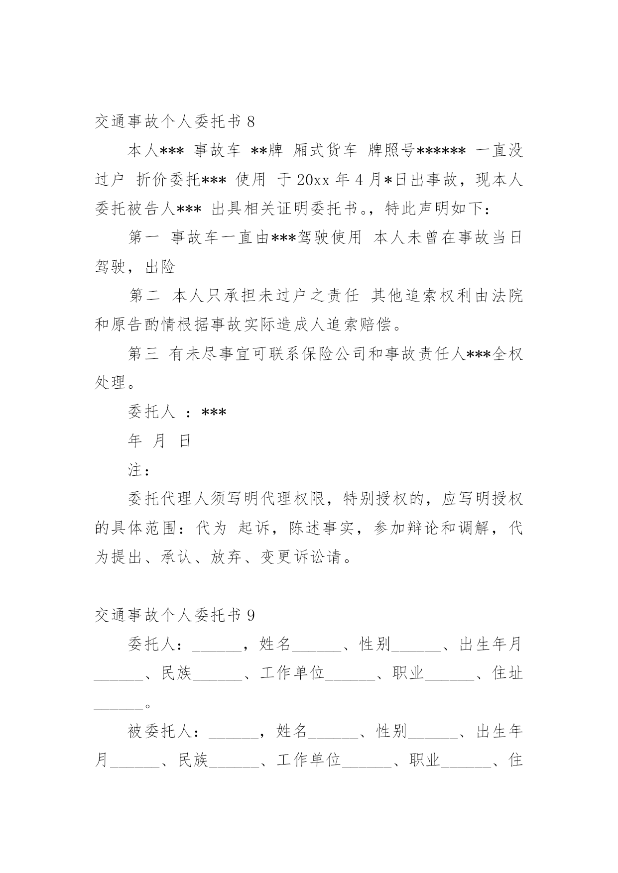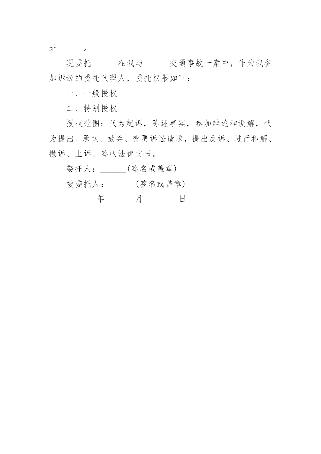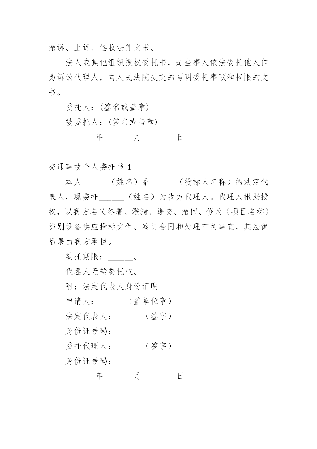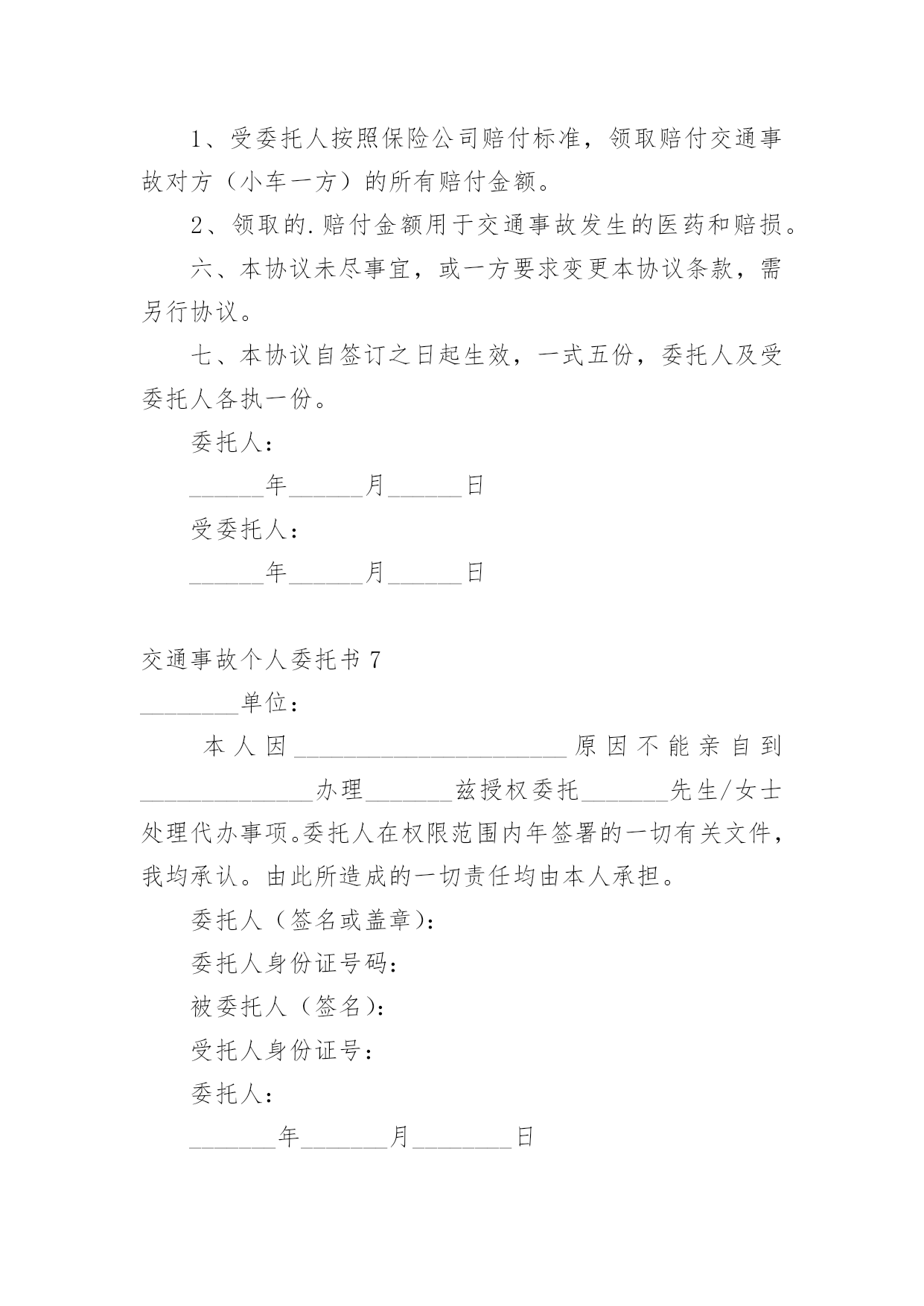 交通事故个人委托书交通事故个人委托书(9篇)被委托人在行使委托书上的合法权益内,被委托人不承担任何法律责任。在发展不断提速的社会中,我们越来越多的事务会去使用委托书,相信许多人会觉得委托书很难写吧,以下是小编收集整理的交通事故个人委托书,欢迎大家分享。交通事故个人委托书1委托人姓名:______(受害人母亲),身份证号:____________;地址:______________联系电话:___________邮编:______________受委托人姓名:______,男,身份证号:___________;地址:____________,联系电话:___________邮编:______________具体委托事项、委托范围:委托人委托上列受委托人在________________________路段发生交通事故死亡一事由____________其代理权限为全权代理。委托人:________________年____月____日受委托人:________________年____月____日交通事故个人委托书2委托人姓名(甲方):身份证号:地址:联系电话:邮编:受委托人姓名(乙方):身份证号:地址:联系电话:邮编:具体委托事项、委托范围:我们系路段发生交通事故双方当事人关系,经双方本着自愿、平等、公平、诚实、信用的原则协商,因甲方跑车繁忙来回不便,现委托受委托人在委托人投保中国人寿财产保险公司(以下简称保险公司)办理此次事故赔损下列范围内的保费。订立以下各条,共同遵照履行:一、乙方接受甲方的委托,在甲方投保公司办理赔付给乙方(小车一方)的赔付金额。二、乙方须认真负责保护甲方合法权益,办理赔付金额手续后,即此次交通事故与甲方(及包括甲方保险法人)不再负担其他赔偿,乙方不得以任何理由追究甲方责任。三、甲方须向乙方提供领取赔偿金额过程中必要协助。四、甲乙双方不得无故终止协议,由此造成一切损失由终止协议方全责承担。五、具体委托权限如下:1、受委托人按照保险公司赔付标准,领取赔付交通事故对方(小车一方)的所有赔付金额。2、领取的.赔付金额用于交通事故发生的医药和赔损。六、本协议未尽事宜,或一方要求变更本协议条款,需另行协议。七、本协议自签订之日起生效,一式五份,委托人及受委托人各执一份。委托人:年月日受委托人:年月日交通事故个人委托书3委托人:姓名、性别、出生年月、民族、工作单位、职业、住址。被委托人:姓名、性别、出生年月、民族、工作单位、职业、住址。现委托在我与一案中,作为我参加诉讼的委托代理人,委托权限如下:注:委托代理人须写明代理权限,特别授权的,应写明授权的`具体范围:代为起诉,陈述事实,参加辩论和调解,代为提出、承认、放弃、变更诉讼请求,提出反诉、进行和解、撤诉、上诉、签收法律文书。法人或其他组织授权委托书,是当事人依法委托他人作为诉讼代理人,向人民法院提交的写明委托事项和权限的文书。委托人:(签名或盖章)被委托人:(签名或盖章)_______年_______月________日交通事故个人委托书4本人______(姓名)系______(投标人名称)的法定代表人,现委托______(姓名)为我方代理人。代理人根据授权,以我方名义签署、澄清、递交、撤回、修改(项目名称)类别设备供应投标文件、签订合同和处理有关事宜,其法律后果由我方承担。委托期限:______。代理人无转委托权。附:法定代表人身份证明申请人:______(盖单位章)法定代表人:______(签字)身份证号码:委托代理人:______(签字)身份证号码:_______年_______月________日交通事故个人委托书5委托人:姓名______、性别______、出生年月______、民族______、工作单位______、职业______、住址______。被委托人:姓名______、性别______、出生年月______、民族______、工作单位______、职业______、住址______。现委托______在我与______交通事故一案中,作为我参加诉讼的委托代理人,委托权限如下:一、一般授权二、特别授权授权范围:代为起诉,陈述事实,参加辩论和调解,代为提出、承认、放弃、变更诉讼请求,提出反诉、进行和解、撤诉、上诉、签收法律文书。委托人:______(签名或盖章)被委托人:______(签名或盖章)_______年_______月________日注:委托代理人须写明代理权限,特别授权的,应写明授权的`具体范围:代为起诉,陈述事实,参加辩论和调解,代为提出、承认、放弃、变更诉讼请求,提出反诉、进行和解、撤诉、上诉、签收法律文书。交通事故个人委托书6委托人姓名(甲方):身份证号:地址:联系电话:邮编:受委托人姓名(乙方):身份证号:地址:联系电话: