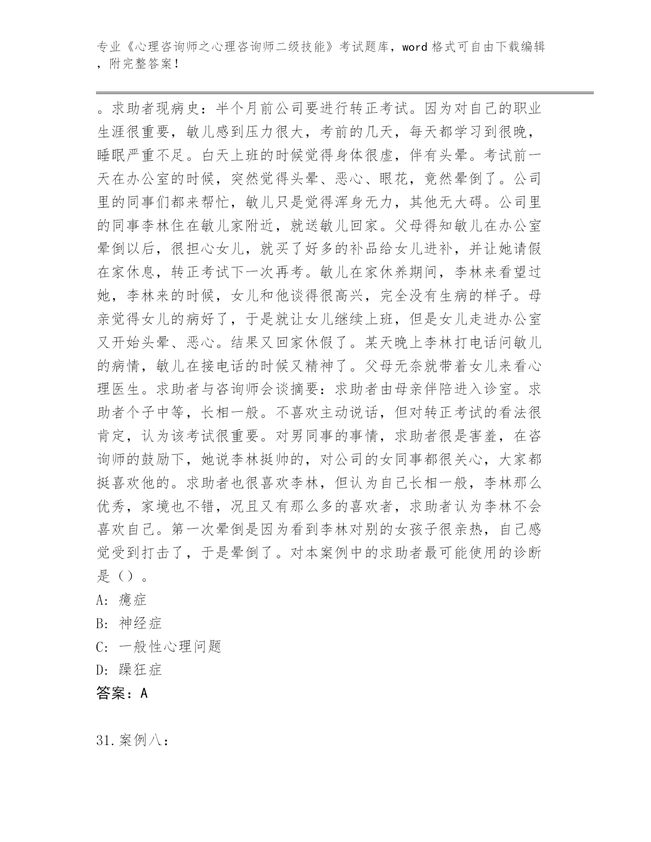 河北省蔚县2024年《心理咨询师之心理咨询师二级技能》考试题库(实用)