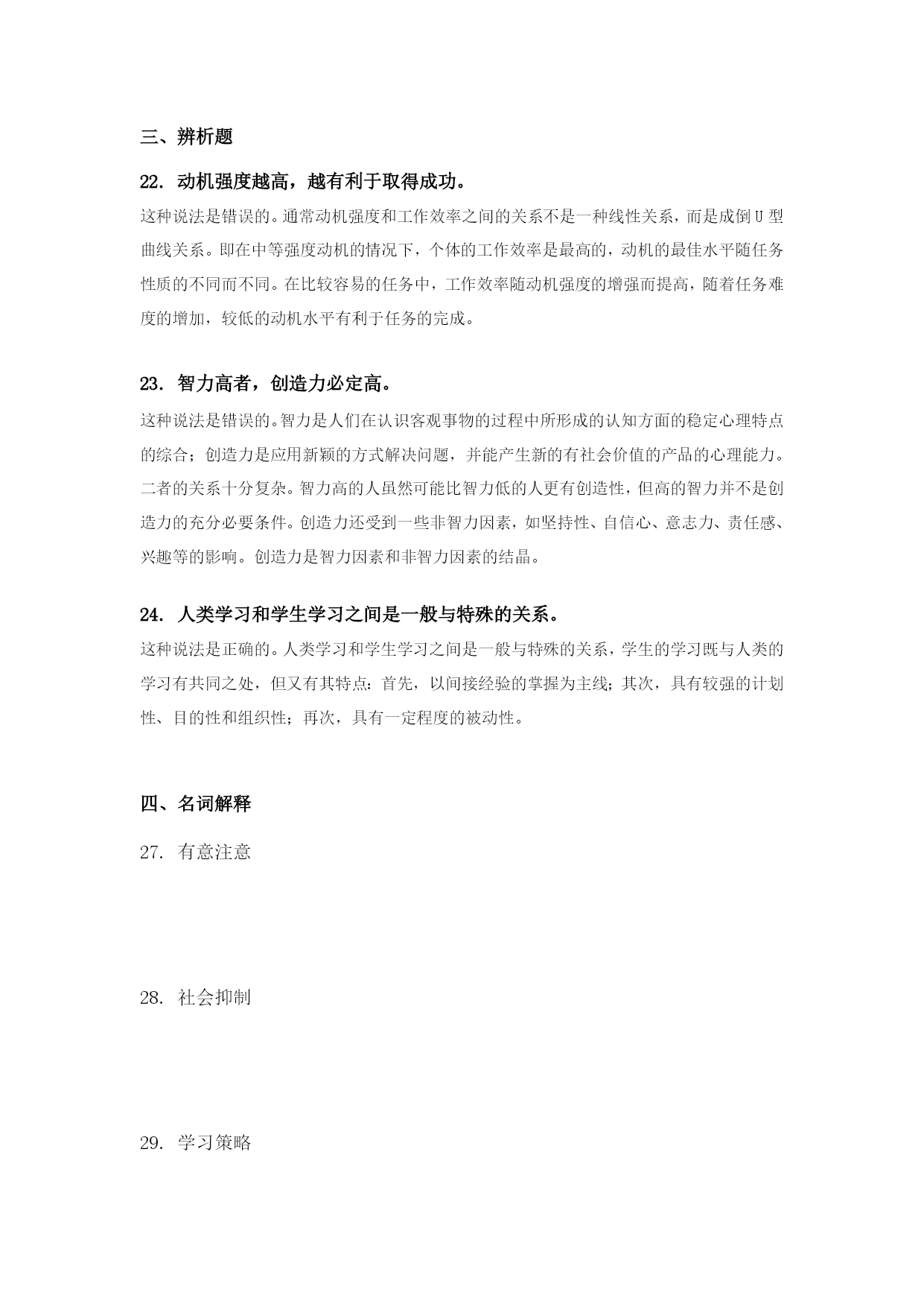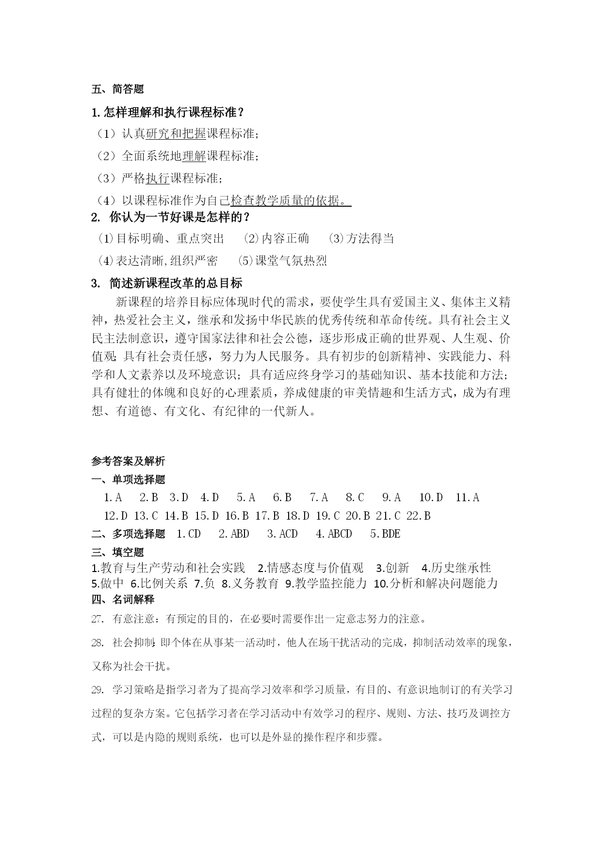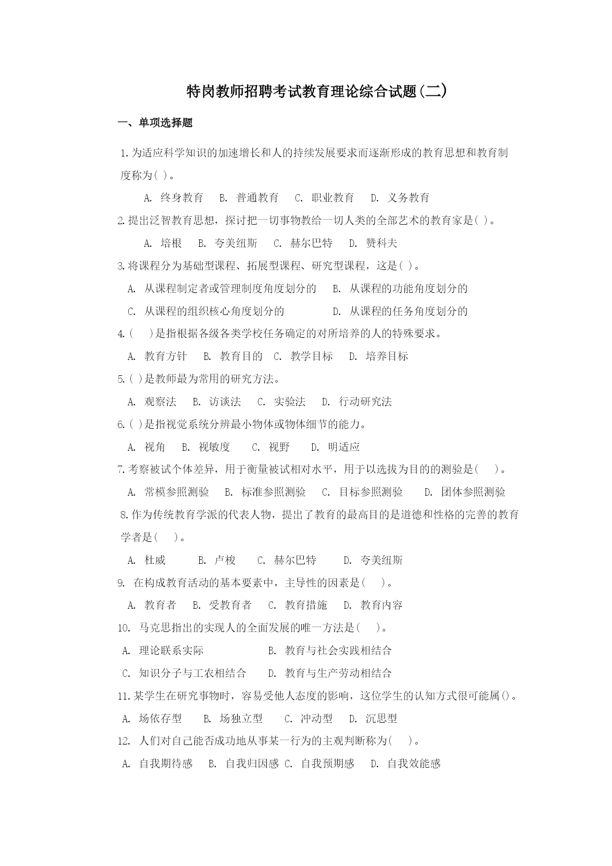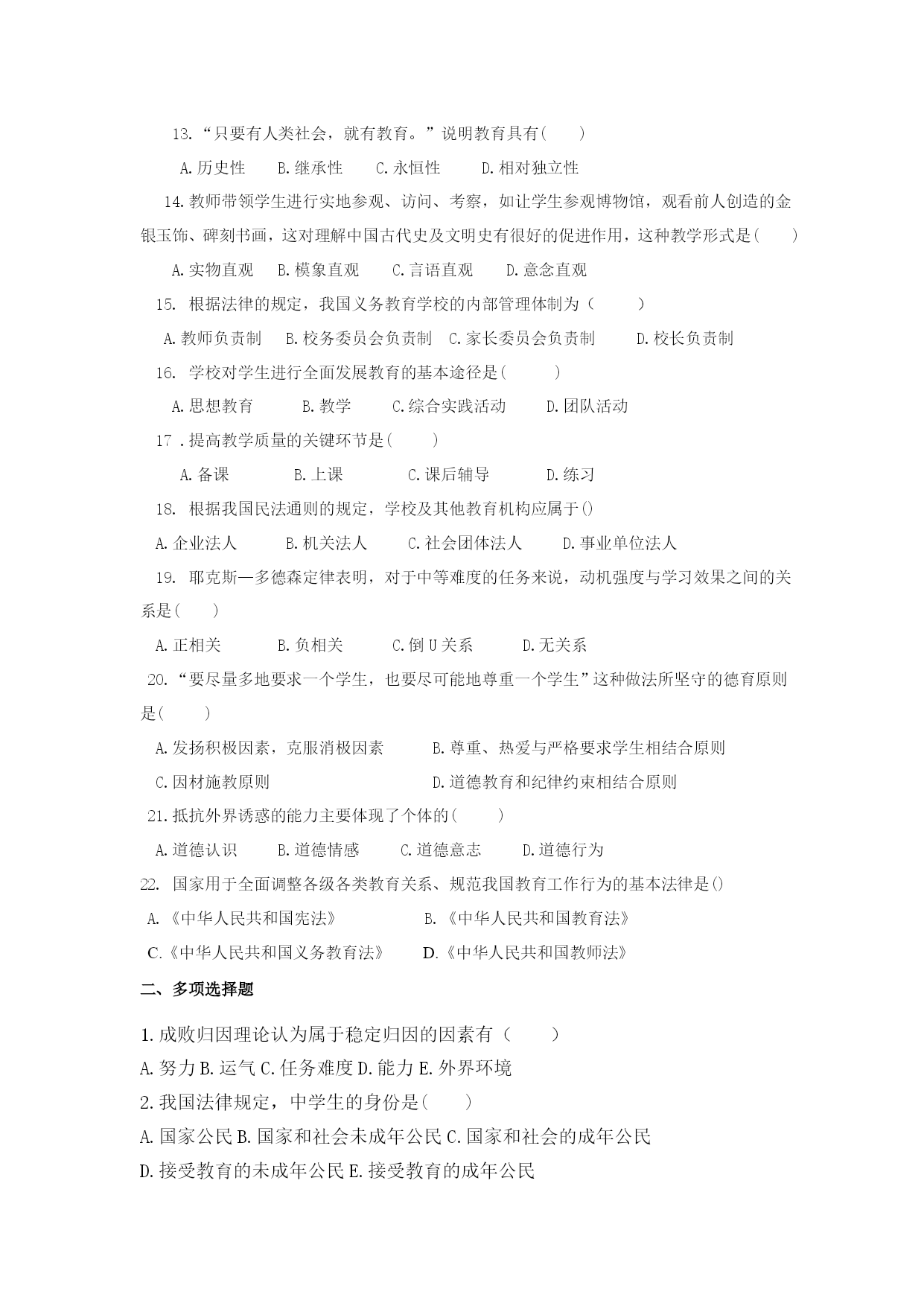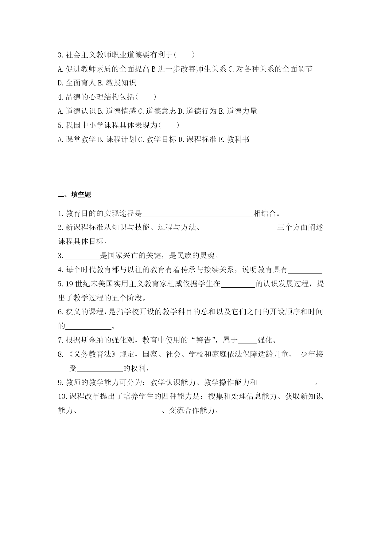 特岗教师招聘考试教育理论综合试题(二)一、单项选择题1.为适应科学知识的加速增长和人的持续发展要求而逐渐形成的教育思想和教育制度称为()。A.终身教育B.普通教育C.职业教育D.义务教育2.提出泛智教育思想,探讨把一切事物教给一切人类的全部艺术的教育家是()。A.培根B.夸美纽斯C.赫尔巴特D.赞科夫3.将课程分为基础型课程、拓展型课程、研究型课程,这是()。A.从课程制定者或管理制度角度划分的B.从课程的功能角度划分的C.从课程的组织核心角度划分的D.从课程的任务角度划分的4.()是指根据各级各类学校任务确定的对所培养的人的特殊要求。A.教育方针B.教育目的C.教学目标D.培养目标5.()是教师最为常用的研究方法。A.观察法B.访谈法C.实验法D.行动研究法6.()是指视觉系统分辨最小物体或物体细节的能力。A.视角B.视敏度C.视野D.明适应7.考察被试个体差异,用于衡量被试相对水平,用于以选拔为目的的测验是()。A.常模参照测验B.标准参照测验C.目标参照测验D.团体参照测验8.作为传统教育学派的代表人物,提出了教育的最高目的是道德和性格的完善的教育学者是()。A.杜威B.卢梭C.赫尔巴特D.夸美纽斯9.在构成教育活动的基本要素中,主导性的因素是()。A.教育者B.受教育者C.教育措施D.教育内容10.马克思指出的实现人的全面发展的唯一方法是()。A.理论联系实际B.教育与社会实践相结合C.知识分子与工农相结合D.教育与生产劳动相结合11.某学生在研究事物时,容易受他人态度的影响,这位学生的认知方式很可能属()。A.场依存型B.场独立型C.冲动型D.沉思型12.人们对自己能否成功地从事某一行为的主观判断称为()。A.自我期待感B.自我归因感C.自我预期感D.自我效能感13.“只要有人类社会,就有教育。”说明教育具有()A.历史性B.继承性C.永恒性D.相对独立性14.教师带领学生进行实地参观、访问、考察,如让学生参观博物馆,观看前人创造的金银玉饰、碑刻书画,这对理解中国古代史及文明史有很好的促进作用,这种教学形式是()A.实物直观B.模象直观C.言语直观D.意念直观15.根据法律的规定,我国义务教育学校的内部管理体制为()A.教师负责制B.校务委员会负责制C.家长委员会负责制D.校长负责制16.学校对学生进行全面发展教育的基本途径是()A.思想教育B.教学C.综合实践活动D.团队活动17.提高教学质量的关键环节是()A.备课B.上课C.课后辅导D.练习18.根据我国民法通则的规定,学校及其他教育机构应属于()A.企业法人B.机关法人C.社会团体法人D.事业单位法人19.耶克斯—多德森定律表明,对于中等难度的任务来说,动机强度与学习效果之间的关系是()A.正相关B.负相关C.倒U关系D.无关系20.“要尽量多地要求一个学生,也要尽可能地尊重一个学生”这种做法所坚守的德育原则是()A.发扬积极因素,克服消极因素B.尊重、热爱与严格要求学生相结合原则C.因材施教原则D.道德教育和纪律约束相结合原则21.抵抗外界诱惑的能力主要体现了个体的()A.道德认识B.道德情感C.道德意志D.道德行为22.国家用于全面调整各级各类教育关系、规范我国教育工作行为的基本法律是()A.《中华人民共和国宪法》B.《中华人民共和国教育法》C.《中华人民共和国义务教育法》D.《中华人民共和国教师法》二、多项选择题1.成败归因理论认为属于稳定归因的因素有()A.努力B.运气C.任务难度D.能力E.外界环境2.我国法律规定,中学生的身份是()A.国家公民B.国家和社会未成年公民C.国家和社会的成年公民D.接受教育的未成年公民E.接受教育的成年公民3.社会主义教师职业道德要有利于()A.促进教师素质的全面提高B进一步改善师生关系C.对各种关系的全面调节D.全面育人E.教授知识4.品德的心理结构包括()A.道德认识B.道德情感C.道德意志D.道德行为E.道德力量5.我国中小学课程具体表现为()A.课堂教学B.课程计划C.教学目标D.课程标准E.教科书二、填空题1.教育目的的实现途径是相结合。2.新课程标准从知识与技能、过程与方法、三个方面阐述课程具体目标。3.是国家兴亡的关键,是民族的灵魂。4.每个时代教育都与以往的教育有着传承与接续关系,说明教育具有5.19世纪末美国实用主义教育家杜威依据学生在的认识发展过程,提出了教学过程的五个阶段。6.狭义的课程,是指学校开设的教学科目的总和以及它们之间的开设顺序和时间的。7.根据斯金纳的强化观,教育中使用的“警告”,属于强化。8.《义务教育法》规定,国家、社会、学校和家庭依法保障