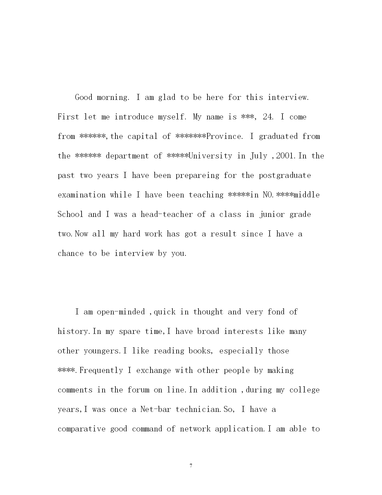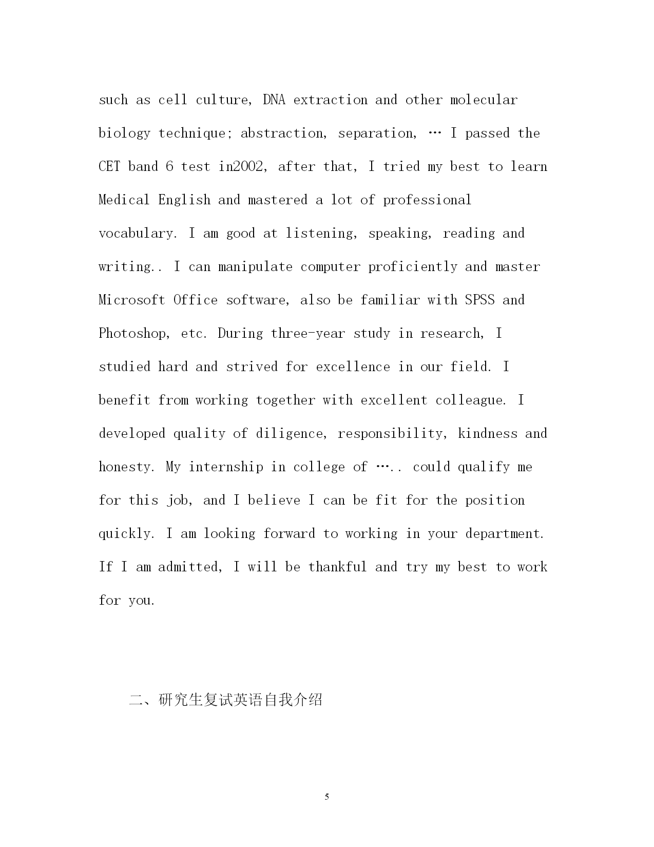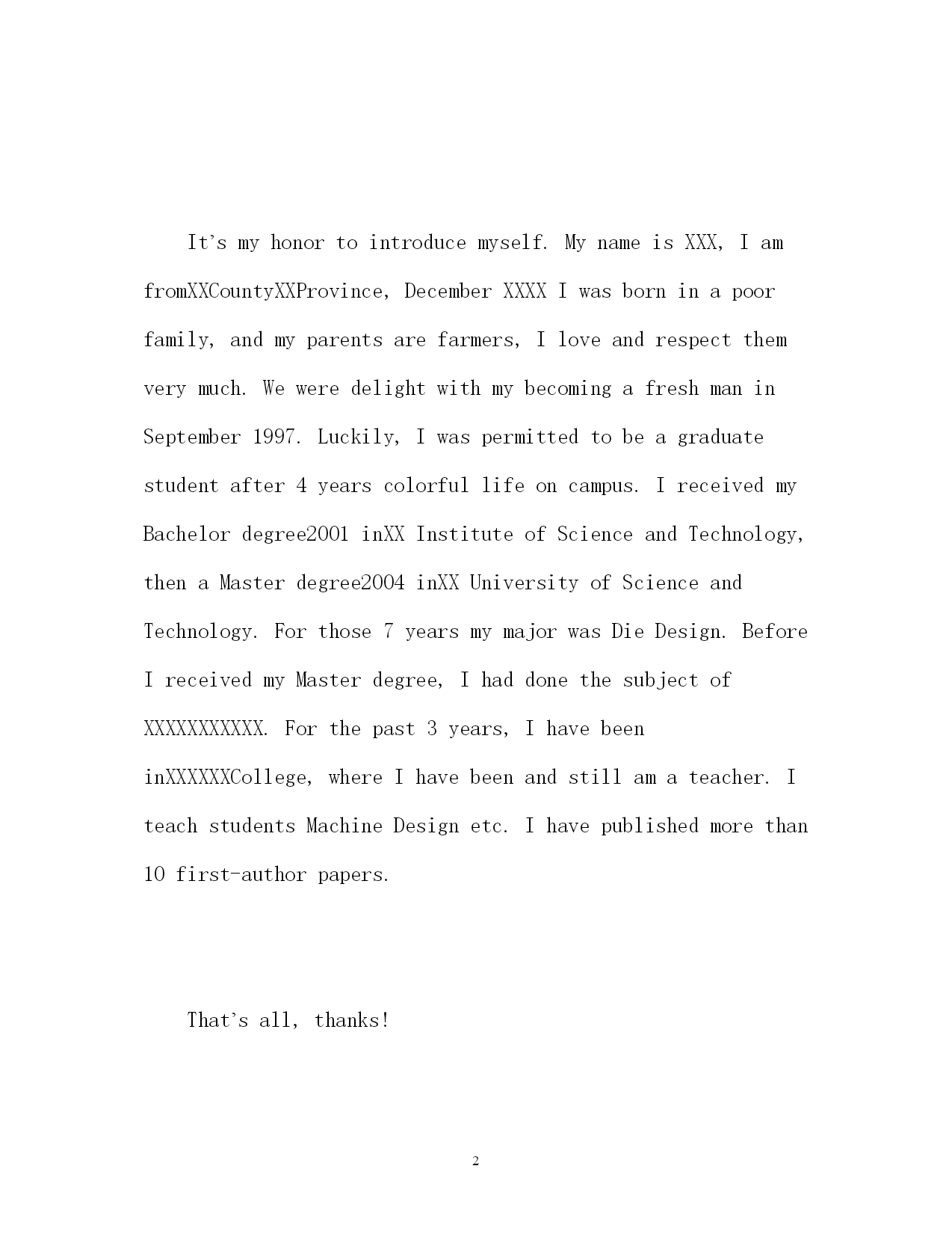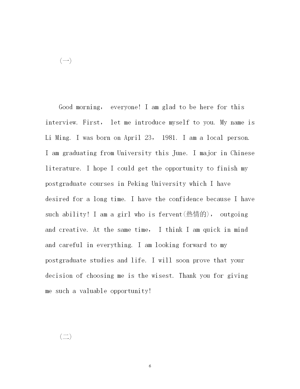 此资料由网络收集而来,如有侵权请告知上传者立即删除。资料共分享,我们负责传递知识。PAGEPAGE18研究生面试英语自我介绍研究生面试英语自我介绍集锦面试自我介绍是面试必不可少的环节,因此在面试前做好自我介绍的准备是必要的功课。下面是小编收集整理的`研究生面试英语自我介绍集锦,欢迎阅读借鉴,更多资讯请继续关注自我介绍栏目。一、研究生面试英语自我介绍(一)Goodmorning,DearProfessors:It’smyhonortointroducemyself.MynameisXXX,IamfromXXCountyXXProvince,DecemberXXXXIwasborninapoorfamily,andmyparentsarefarmers,Iloveandrespectthemverymuch.WeweredelightwithmybecomingafreshmaninSeptember1997.Luckily,Iwaspermittedtobeagraduatestudentafter4yearscolorfullifeoncampus.IreceivedmyBachelordegree2001inXXInstituteofScienceandTechnology,thenaMasterdegree2004inXXUniversityofScienceandTechnology.Forthose7yearsmymajorwasDieDesign.BeforeIreceivedmyMasterdegree,IhaddonethesubjectofXXXXXXXXXXX.Forthepast3years,IhavebeeninXXXXXXCollege,whereIhavebeenandstillamateacher.IteachstudentsMachineDesignetc.Ihavepublishedmorethan10first-authorpapers.That’sall,thanks!(二)It’smypleasuretobeheretointroducemyself.That’sadifficultquestion.Ithinkallthenight.Howtointroducemyself?TellyouwhoIam?YouallknowmynameisLiuXiaonao.TellyouwhatmymajorisorwhatIamdoingnow?YouallknowIstudyink-jetpaper,andyesterdayyouallmyexaminers.SotodayI’lltellyoumycharactersandfavorites.I’manopen-minded,kindandsmartgirl.Ilikedancing,especiallynationalandclassicaldancing,waltzisalsomylove.DancingcanmakemerelaxwhenIstudytired.ButabouttwoyearsIhavenochancetodancebecausemystudysubjectismoreattractivethandancing.LastmonthIbegantostudyplaypiano.ButtillnowIonlycanplayonesong“jasmineflower”.MaybeI’maslowlearner.Ialsolikedrama.Ihadparticipatedintheexamofactress.I’mveryluckIsucceedintheexam.Butmakemesurprisedthedirectoraskedmetogivehim50,000yuan.SoIwentbacktomystudy.NowIrealizewhatIreallylike.That’smymajor—printingandpapermaking.It’stheplacewhichcanactualizemyownpersonalworth.That’smylife,wonderfullifeandinterestinglife.Ihopethesunisalwaysinmylife.Thankyou.(三)Thankyouforgivingmethechancetointerviewanditismypleasuretointroducemyselftoyou.MynameisLiFeng.Imajorin……andIwillgraduatefro
