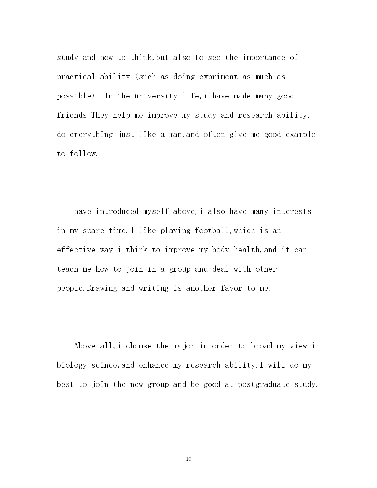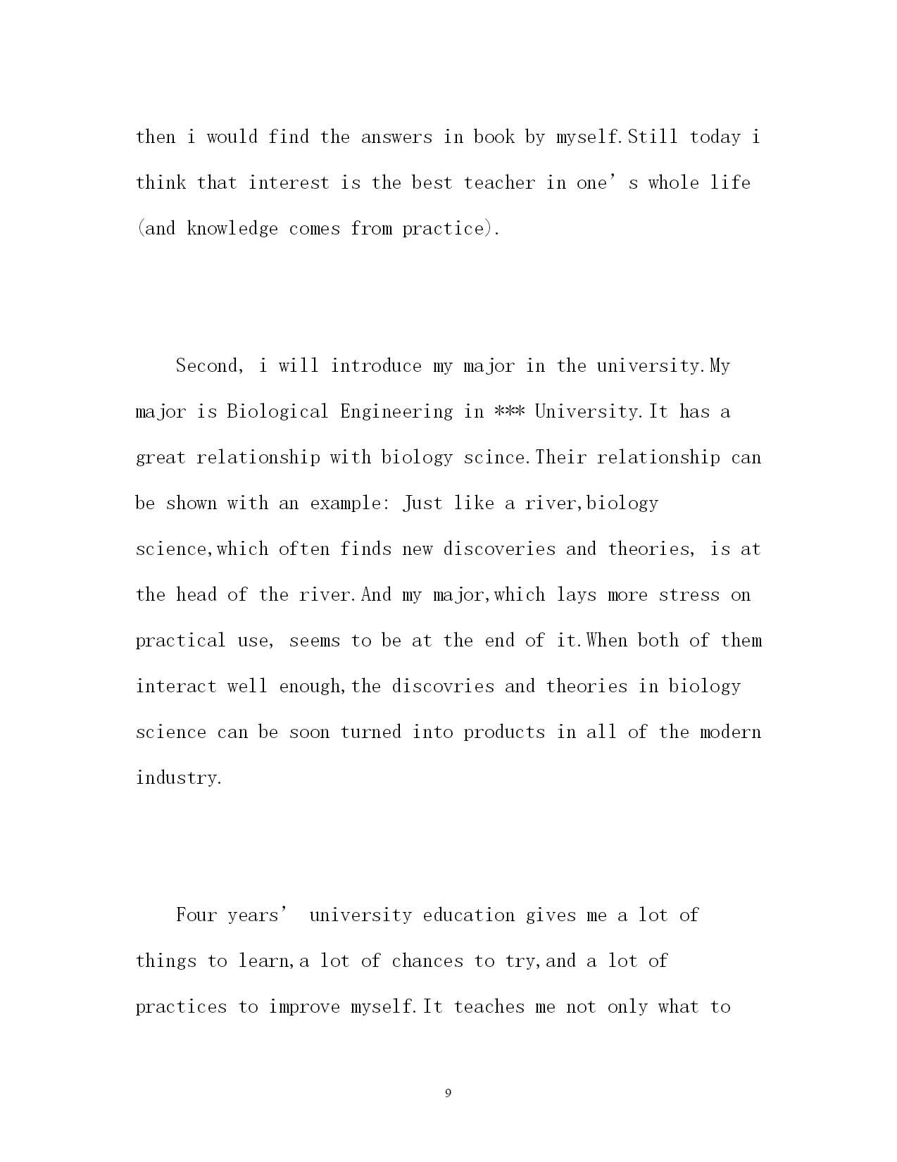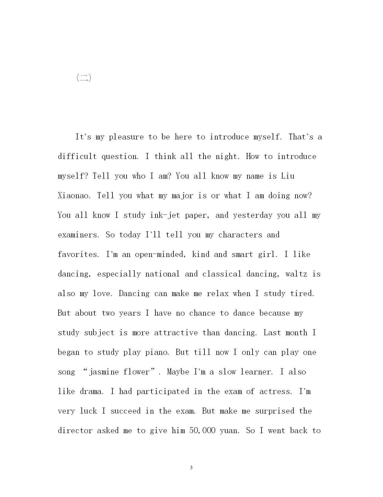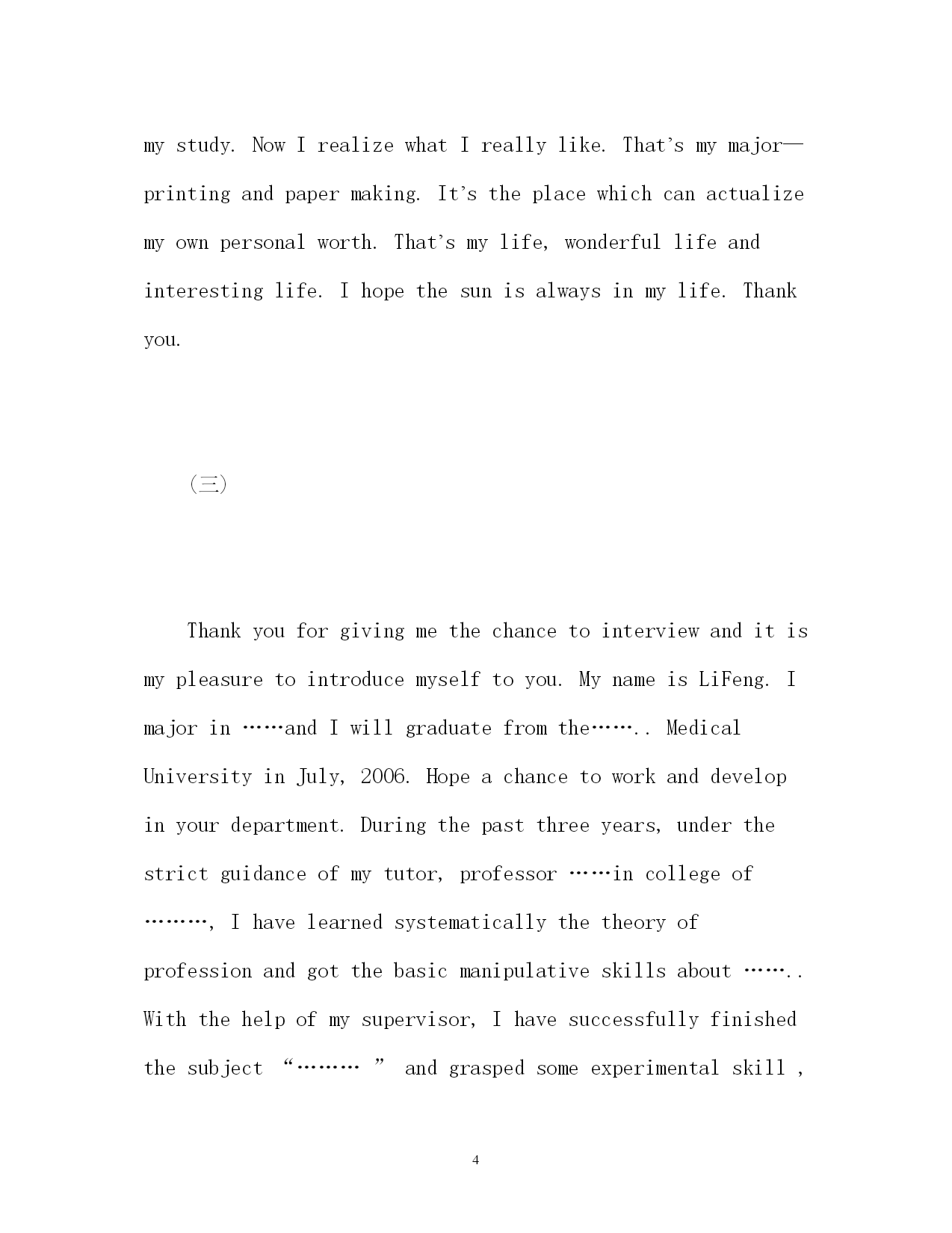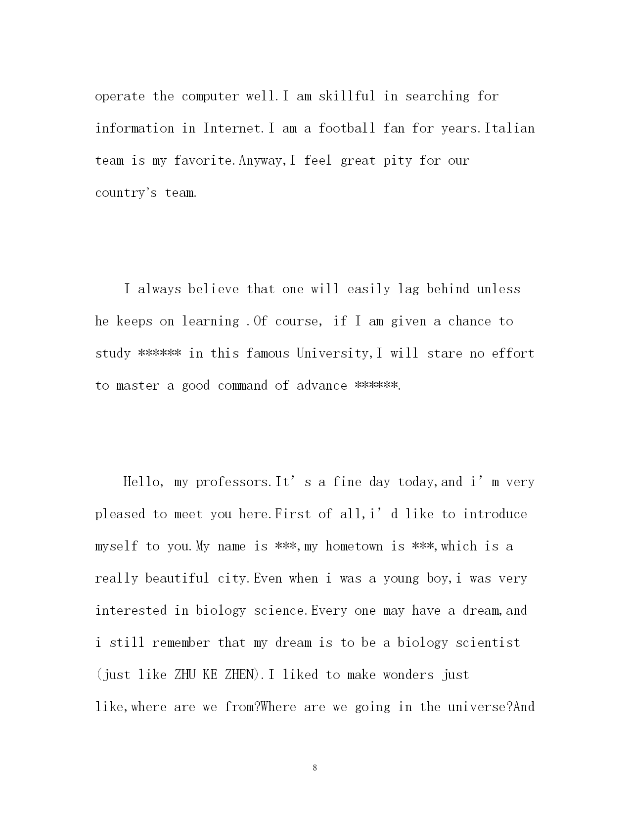 此资料由网络收集而来,如有侵权请告知上传者立即删除。资料共分享,我们负责传递知识。PAGEPAGE18研究生面试英语自我介绍研究生面试英语自我介绍集锦面试自我介绍是面试必不可少的环节,因此在面试前做好自我介绍的准备是必要的功课。下面是小编收集整理的`研究生面试英语自我介绍集锦,欢迎阅读借鉴,更多资讯请继续关注自我介绍栏目。一、研究生面试英语自我介绍(一)Goodmorning,DearProfessors:It’smyhonortointroducemyself.MynameisXXX,IamfromXXCountyXXProvince,DecemberXXXXIwasborninapoorfamily,andmyparentsarefarmers,Iloveandrespectthemverymuch.WeweredelightwithmybecomingafreshmaninSeptember1997.Luckily,Iwaspermittedtobeagraduatestudentafter4yearscolorfullifeoncampus.IreceivedmyBachelordegree2001inXXInstituteofScienceandTechnology,thenaMasterdegree2004inXXUniversityofScienceandTechnology.Forthose7yearsmymajorwasDieDesign.BeforeIreceivedmyMasterdegree,IhaddonethesubjectofXXXXXXXXXXX.Forthepast3years,IhavebeeninXXXXXXCollege,whereIhavebeenandstillamateacher.IteachstudentsMachineDesignetc.Ihavepublishedmorethan10first-authorpapers.That’sall,thanks!(二)It’smypleasuretobeheretointroducemyself.That’sadifficultquestion.Ithinkallthenight.Howtointroducemyself?TellyouwhoIam?YouallknowmynameisLiuXiaonao.TellyouwhatmymajorisorwhatIamdoingnow?YouallknowIstudyink-jetpaper,andyesterdayyouallmyexaminers.SotodayI’lltellyoumycharactersandfavorites.I’manopen-minded,kindandsmartgirl.Ilikedancing,especiallynationalandclassicaldancing,waltzisalsomylove.DancingcanmakemerelaxwhenIstudytired.ButabouttwoyearsIhavenochancetodancebecausemystudysubjectismoreattractivethandancing.LastmonthIbegantostudyplaypiano.ButtillnowIonlycanplayonesong“jasmineflower”.MaybeI’maslowlearner.Ialsolikedrama.Ihadparticipatedintheexamofactress.I’mveryluckIsucceedintheexam.Butmakemesurprisedthedirectoraskedmetogivehim50,000yuan.SoIwentbacktomystudy.NowIrealizewhatIreallylike.That’smymajor—printingandpapermaking.It’stheplacewhichcanactualizemyownpersonalworth.That’smylife,wonderfullifeandinterestinglife.Ihopethesunisalwaysinmylife.Thankyou.(三)Thankyouforgivingmethechancetointerviewanditismypleasuretointroducemyselftoyou.MynameisLiFeng.Imajorin……andIwillgraduatefro