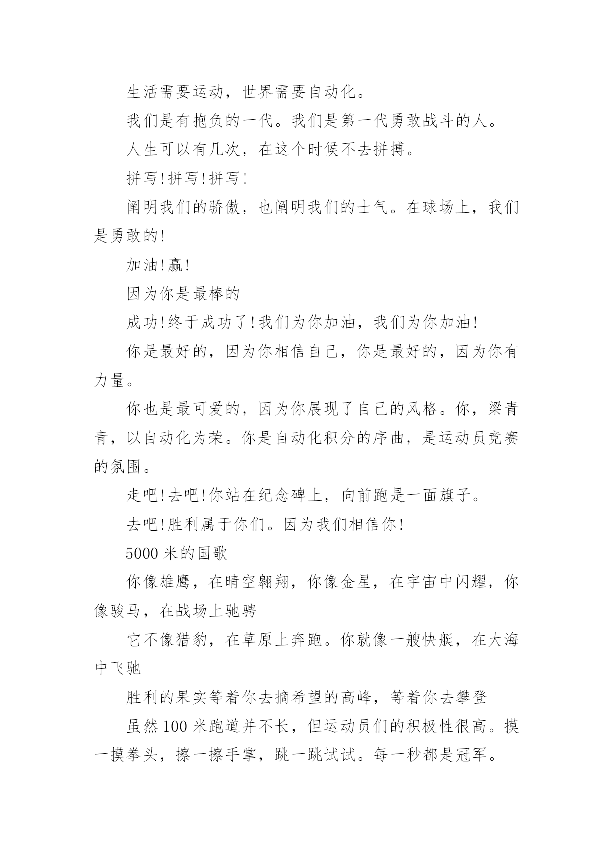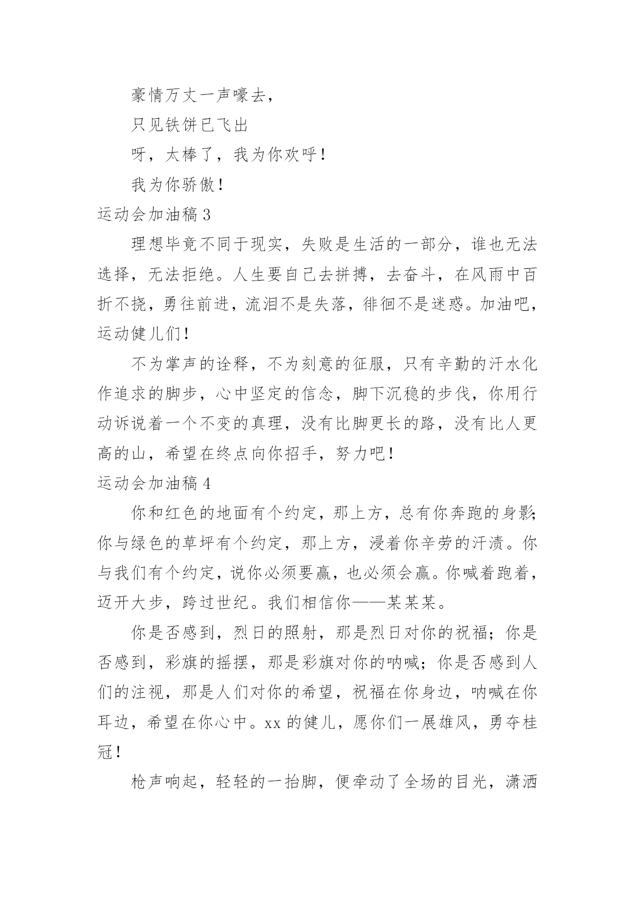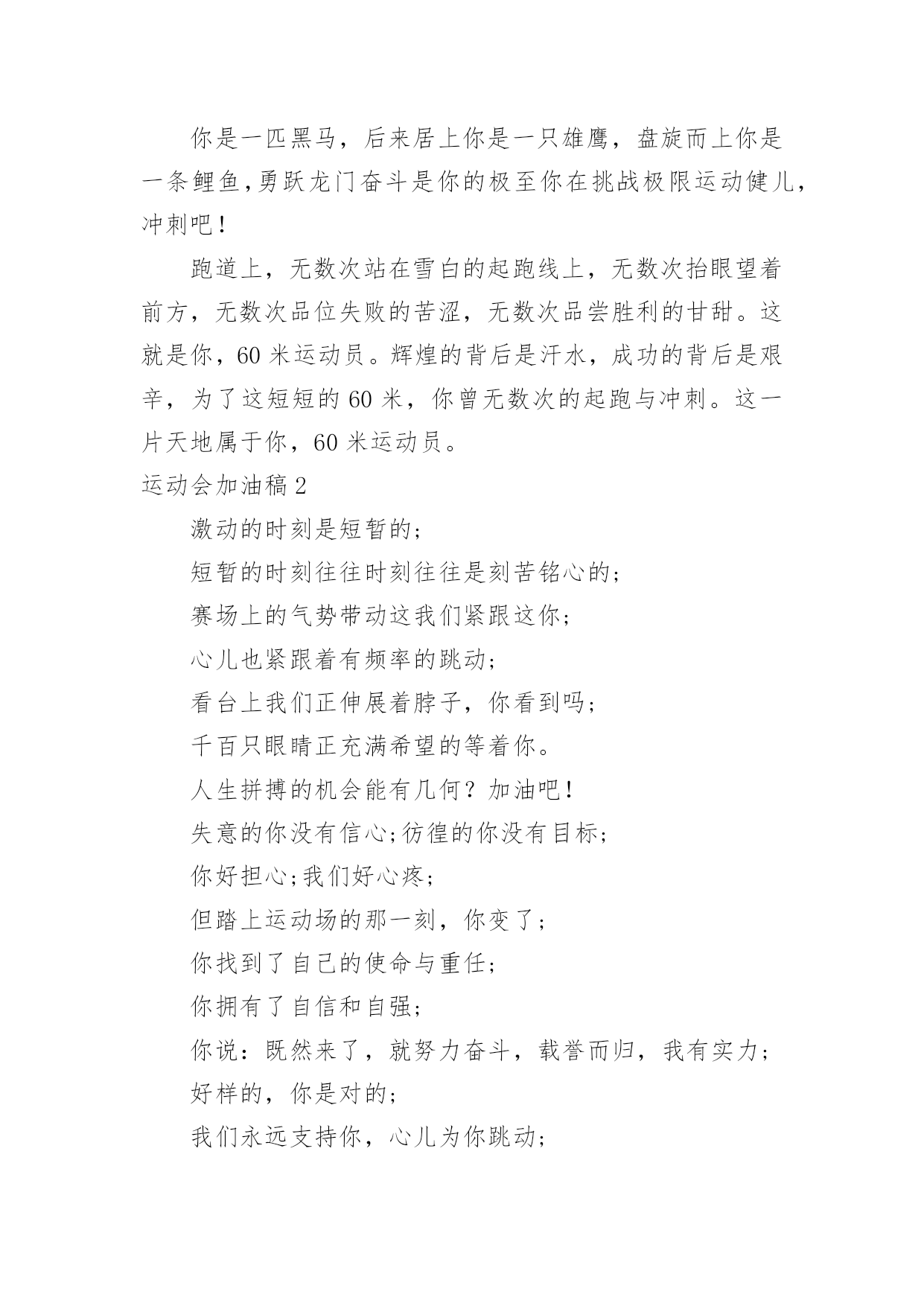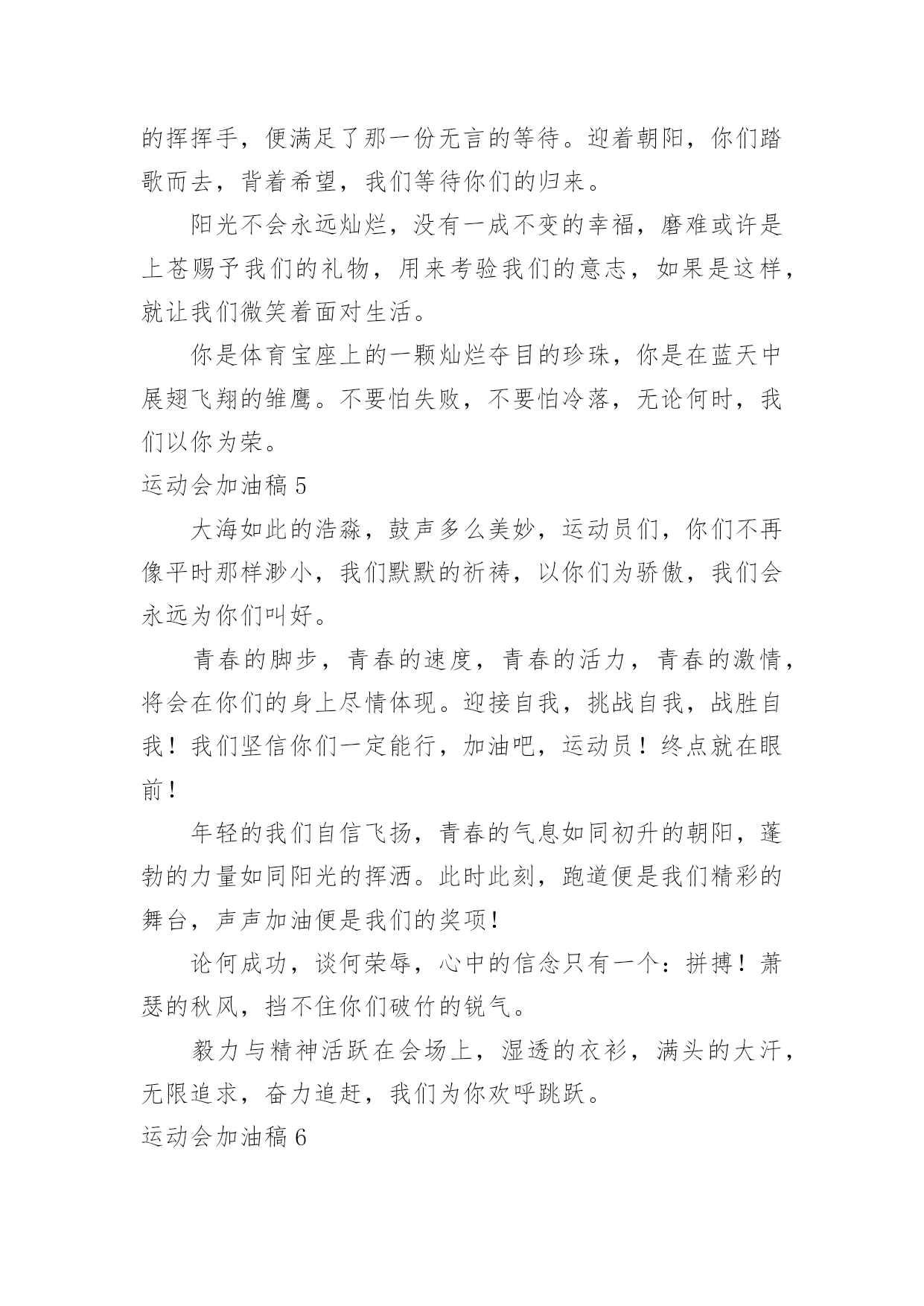 运动会加油稿运动会加油稿集合15篇在当下社会,需要使用加油稿的场合越来越多,加油稿可以起到活跃气氛的作用。相信很多朋友都对写加油稿感到非常苦恼吧,以下是小编整理的运动会加油稿,供大家参考借鉴,希望可以帮助到有需要的朋友。运动会加油稿1红色的跑道,承载着多少汗水,一条红线,记载着多少成败。一次起跑,是瞬间的爆发,成败,即决定其中。瞬间的瞬间,闪电的闪电,即是成功的起步。你的汗水洒在跑道,浇灌着成功的花朵开放。你的欢笑飞扬在赛场,为班争光你最棒。跑吧,追吧在这广阔的赛场上,你似骏马似离铉的箭。跑吧,追吧你比虎猛比豹强。运动场上有你们的步伐,那是辛苦汗水的抒发,你就像天边的云端,有彩霞的绚丽色彩。奔驰的骏马,飞奔的步伐让你的胜利在前方等待。枪声伴你踏上征程,你昂着自信的头,带着必胜的信念,冲去,奔去。那一刻时光仿佛都为你停住,你的勇气振动了一切,震撼了每一个人的心灵。终点。你赢了。虽然只是那短短的十几秒,但你在我们心中留下了永恒。你是一匹黑马,后来居上你是一只雄鹰,盘旋而上你是一条鲤鱼,勇跃龙门奋斗是你的极至你在挑战极限运动健儿,冲刺吧!跑道上,无数次站在雪白的起跑线上,无数次抬眼望着前方,无数次品位失败的苦涩,无数次品尝胜利的甘甜。这就是你,60米运动员。辉煌的背后是汗水,成功的背后是艰辛,为了这短短的60米,你曾无数次的起跑与冲刺。这一片天地属于你,60米运动员。运动会加油稿2激动的时刻是短暂的;短暂的时刻往往时刻往往是刻苦铭心的;赛场上的气势带动这我们紧跟这你;心儿也紧跟着有频率的跳动;看台上我们正伸展着脖子,你看到吗;千百只眼睛正充满希望的等着你。人生拼搏的机会能有几何?加油吧!失意的你没有信心;彷徨的你没有目标;你好担心;我们好心疼;但踏上运动场的那一刻,你变了;你找到了自己的使命与重任;你拥有了自信和自强;你说:既然来了,就努力奋斗,载誉而归,我有实力;好样的,你是对的;我们永远支持你,心儿为你跳动;青春为你骄傲。十米的助跑,踏板,起跳,凌空而起,在空中画出一道优美的弧线,着地。一整套的动作一气呵成,没有半点的拖泥带水,实在是标致极了,刹是好看。观众的欢呼声响起来了,鼓掌声响起来了,汇成一片,响彻云霄。然而,为了这成功的凌空一跃,参赛选手不知付出了心血,不知付出了多少汗水,甚至是眼泪。阳光总在风雨后,擦干了汗水和泪水,就是灿烂如花的笑脸。他们的辛勤训练终于在赛场上成为了凌空一跃,淋漓尽致地演绎了他们的风采。是的,“天道酬勤”,自古以来就是这样:没有付出就没有回报,一分耕耘,一分收获。奋力一抛的瞬间,一道闪亮的弧线划破美丽的长空,将力与美演绎的淋漓尽致,宛如希腊神话中的天神。精彩的男子甲组铁饼决赛吸引了众多同学的观看。阳光下他们自信的脸庞,让人们相信青春永不言败!手持铁饼,你已做好准备,举手投足间,都是自信;挥一挥手,你已蓄势待发,力量集中,毋庸置疑;奋力一掷,你已演绎完毕,弧线优美,落地稳当。我已经预见你的沉着与冷静,你的坦然与阔达,你的矫健与实力虽有几分沉重,几分辛苦正现人之本色,豪情万丈一声嚎去,只见铁饼已飞出呀,太棒了,我为你欢呼!我为你骄傲!运动会加油稿3理想毕竟不同于现实,失败是生活的一部分,谁也无法选择,无法拒绝。人生要自己去拼搏,去奋斗,在风雨中百折不挠,勇往前进,流泪不是失落,徘徊不是迷惑。加油吧,运动健儿们!不为掌声的诠释,不为刻意的征服,只有辛勤的汗水化作追求的脚步,心中坚定的信念,脚下沉稳的步伐,你用行动诉说着一个不变的真理,没有比脚更长的路,没有比人更高的山,希望在终点向你招手,努力吧!运动会加油稿4你和红色的地面有个约定,那上方,总有你奔跑的身影;你与绿色的草坪有个约定,那上方,浸着你辛劳的汗渍。你与我们有个约定,说你必须要赢,也必须会赢。你喊着跑着,迈开大步,跨过世纪。我们相信你——某某某。你是否感到,烈日的照射,那是烈日对你的祝福;你是否感到,彩旗的摇摆,那是彩旗对你的呐喊;你是否感到人们的注视,那是人们对你的希望,祝福在你身边,呐喊在你耳边,希望在你心中。xx的健儿,愿你们一展雄风,勇夺桂冠!枪声响起,轻轻的一抬脚,便牵动了全场的目光,潇洒的挥挥手,便满足了那一份无言的等待。迎着朝阳,你们踏歌而去,背着希望,我们等待你们的归来。阳光不会永远灿烂,没有一成不变的幸福,磨难或许是上苍赐予我们的礼物,用来考验我们的意志,如果是这样,就让我们微笑着面对生活。你是体育宝座上的一颗灿烂夺目的珍珠,你是在蓝天中展翅飞翔的雏鹰。不要怕失败,不要怕冷落,无论何时,我们以你为荣。运动会加油稿5大海如此的浩淼,鼓声多么美妙,运动员们,你们不再像平时那样渺小,我们默默的祈祷,以你们为骄傲,我们会永远为你们叫好。青春的脚步,青春的速度,青春的活力,青春的激情,将会在你们的身上尽情体现。迎接自我,挑战自我,战胜自