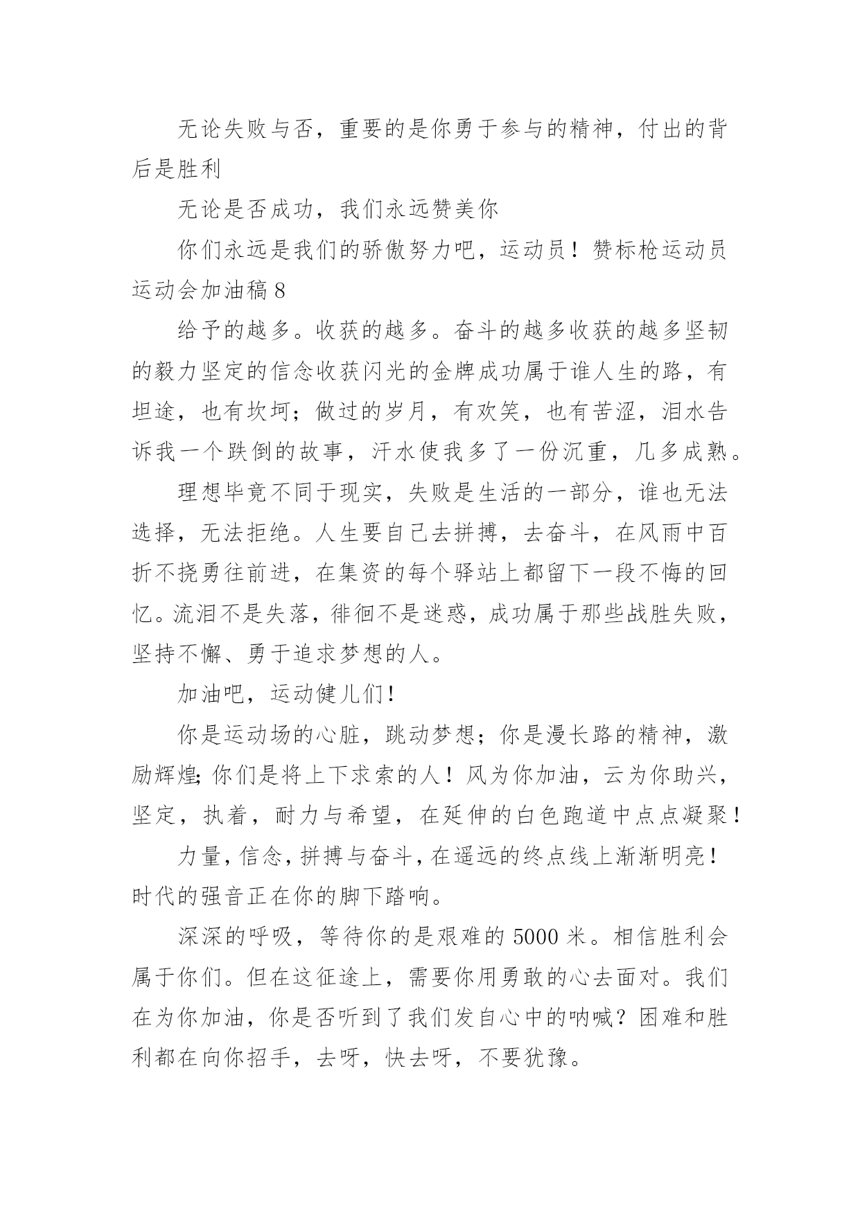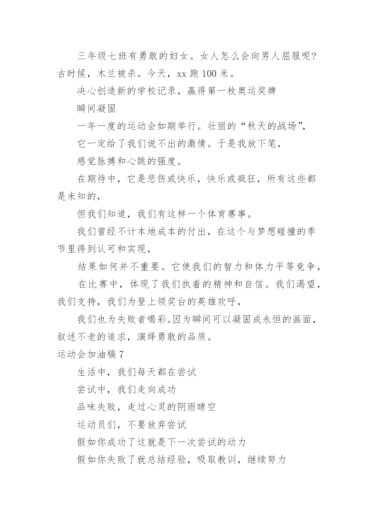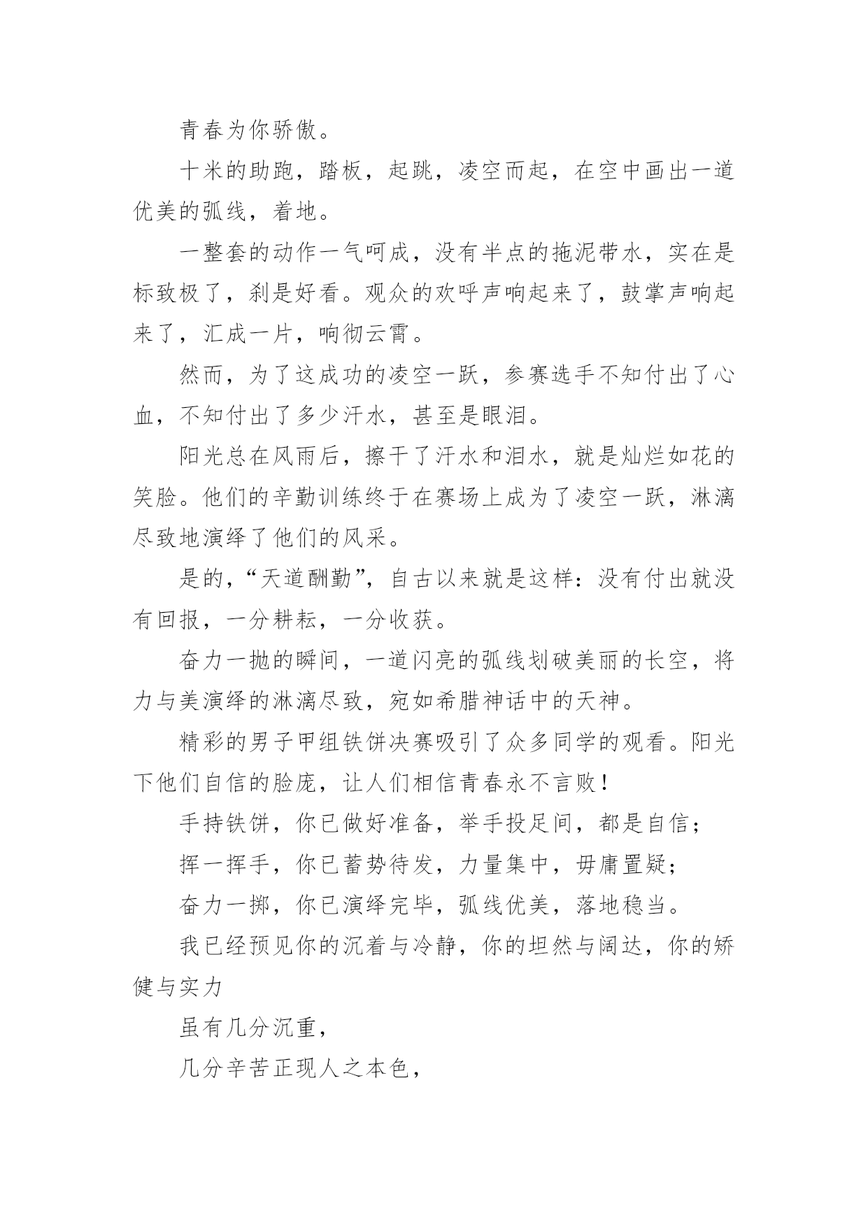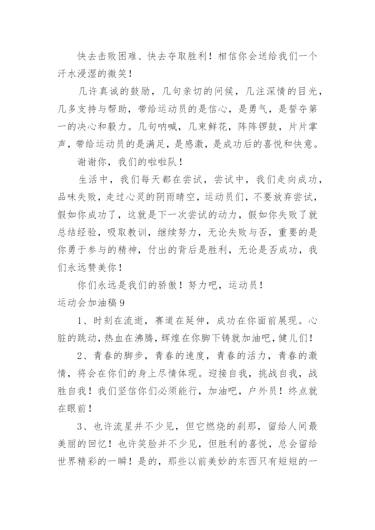 运动会加油稿运动会加油稿集合15篇在当下社会,需要使用加油稿的场合越来越多,加油稿可以起到活跃气氛的作用。相信很多朋友都对写加油稿感到非常苦恼吧,以下是小编整理的运动会加油稿,供大家参考借鉴,希望可以帮助到有需要的朋友。运动会加油稿1红色的跑道,承载着多少汗水,一条红线,记载着多少成败。一次起跑,是瞬间的爆发,成败,即决定其中。瞬间的瞬间,闪电的闪电,即是成功的起步。你的汗水洒在跑道,浇灌着成功的花朵开放。你的欢笑飞扬在赛场,为班争光你最棒。跑吧,追吧在这广阔的赛场上,你似骏马似离铉的箭。跑吧,追吧你比虎猛比豹强。运动场上有你们的步伐,那是辛苦汗水的抒发,你就像天边的云端,有彩霞的绚丽色彩。奔驰的骏马,飞奔的步伐让你的胜利在前方等待。枪声伴你踏上征程,你昂着自信的头,带着必胜的信念,冲去,奔去。那一刻时光仿佛都为你停住,你的勇气振动了一切,震撼了每一个人的心灵。终点。你赢了。虽然只是那短短的十几秒,但你在我们心中留下了永恒。你是一匹黑马,后来居上你是一只雄鹰,盘旋而上你是一条鲤鱼,勇跃龙门奋斗是你的极至你在挑战极限运动健儿,冲刺吧!跑道上,无数次站在雪白的起跑线上,无数次抬眼望着前方,无数次品位失败的苦涩,无数次品尝胜利的甘甜。这就是你,60米运动员。辉煌的背后是汗水,成功的背后是艰辛,为了这短短的60米,你曾无数次的起跑与冲刺。这一片天地属于你,60米运动员。运动会加油稿2激动的时刻是短暂的;短暂的时刻往往时刻往往是刻苦铭心的;赛场上的气势带动这我们紧跟这你;心儿也紧跟着有频率的跳动;看台上我们正伸展着脖子,你看到吗;千百只眼睛正充满希望的等着你。人生拼搏的机会能有几何?加油吧!失意的你没有信心;彷徨的你没有目标;你好担心;我们好心疼;但踏上运动场的那一刻,你变了;你找到了自己的使命与重任;你拥有了自信和自强;你说:既然来了,就努力奋斗,载誉而归,我有实力;好样的,你是对的;我们永远支持你,心儿为你跳动;青春为你骄傲。十米的助跑,踏板,起跳,凌空而起,在空中画出一道优美的弧线,着地。一整套的动作一气呵成,没有半点的拖泥带水,实在是标致极了,刹是好看。观众的欢呼声响起来了,鼓掌声响起来了,汇成一片,响彻云霄。然而,为了这成功的凌空一跃,参赛选手不知付出了心血,不知付出了多少汗水,甚至是眼泪。阳光总在风雨后,擦干了汗水和泪水,就是灿烂如花的笑脸。他们的辛勤训练终于在赛场上成为了凌空一跃,淋漓尽致地演绎了他们的风采。是的,“天道酬勤”,自古以来就是这样:没有付出就没有回报,一分耕耘,一分收获。奋力一抛的瞬间,一道闪亮的弧线划破美丽的长空,将力与美演绎的淋漓尽致,宛如希腊神话中的天神。精彩的男子甲组铁饼决赛吸引了众多同学的观看。阳光下他们自信的脸庞,让人们相信青春永不言败!手持铁饼,你已做好准备,举手投足间,都是自信;挥一挥手,你已蓄势待发,力量集中,毋庸置疑;奋力一掷,你已演绎完毕,弧线优美,落地稳当。我已经预见你的沉着与冷静,你的坦然与阔达,你的矫健与实力虽有几分沉重,几分辛苦正现人之本色,豪情万丈一声嚎去,只见铁饼已飞出呀,太棒了,我为你欢呼!我为你骄傲!运动会加油稿3理想毕竟不同于现实,失败是生活的一部分,谁也无法选择,无法拒绝。人生要自己去拼搏,去奋斗,在风雨中百折不挠,勇往前进,流泪不是失落,徘徊不是迷惑。加油吧,运动健儿们!不为掌声的诠释,不为刻意的征服,只有辛勤的汗水化作追求的脚步,心中坚定的信念,脚下沉稳的步伐,你用行动诉说着一个不变的真理,没有比脚更长的路,没有比人更高的山,希望在终点向你招手,努力吧!运动会加油稿4你和红色的地面有个约定,那上方,总有你奔跑的身影;你与绿色的草坪有个约定,那上方,浸着你辛劳的汗渍。你与我们有个约定,说你必须要赢,也必须会赢。你喊着跑着,迈开大步,跨过世纪。我们相信你——某某某。你是否感到,烈日的照射,那是烈日对你的祝福;你是否感到,彩旗的摇摆,那是彩旗对你的呐喊;你是否感到人们的注视,那是人们对你的希望,祝福在你身边,呐喊在你耳边,希望在你心中。xx的健儿,愿你们一展雄风,勇夺桂冠!枪声响起,轻轻的一抬脚,便牵动了全场的目光,潇洒的挥挥手,便满足了那一份无言的等待。迎着朝阳,你们踏歌而去,背着希望,我们等待你们的归来。阳光不会永远灿烂,没有一成不变的幸福,磨难或许是上苍赐予我们的礼物,用来考验我们的意志,如果是这样,就让我们微笑着面对生活。你是体育宝座上的一颗灿烂夺目的珍珠,你是在蓝天中展翅飞翔的雏鹰。不要怕失败,不要怕冷落,无论何时,我们以你为荣。运动会加油稿5大海如此的浩淼,鼓声多么美妙,运动员们,你们不再像平时那样渺小,我们默默的祈祷,以你们为骄傲,我们会永远为你们叫好。青春的脚步,青春的速度,青春的活力,青春的激情,将会在你们的身上尽情体现。迎接自我,挑战自我,战胜自