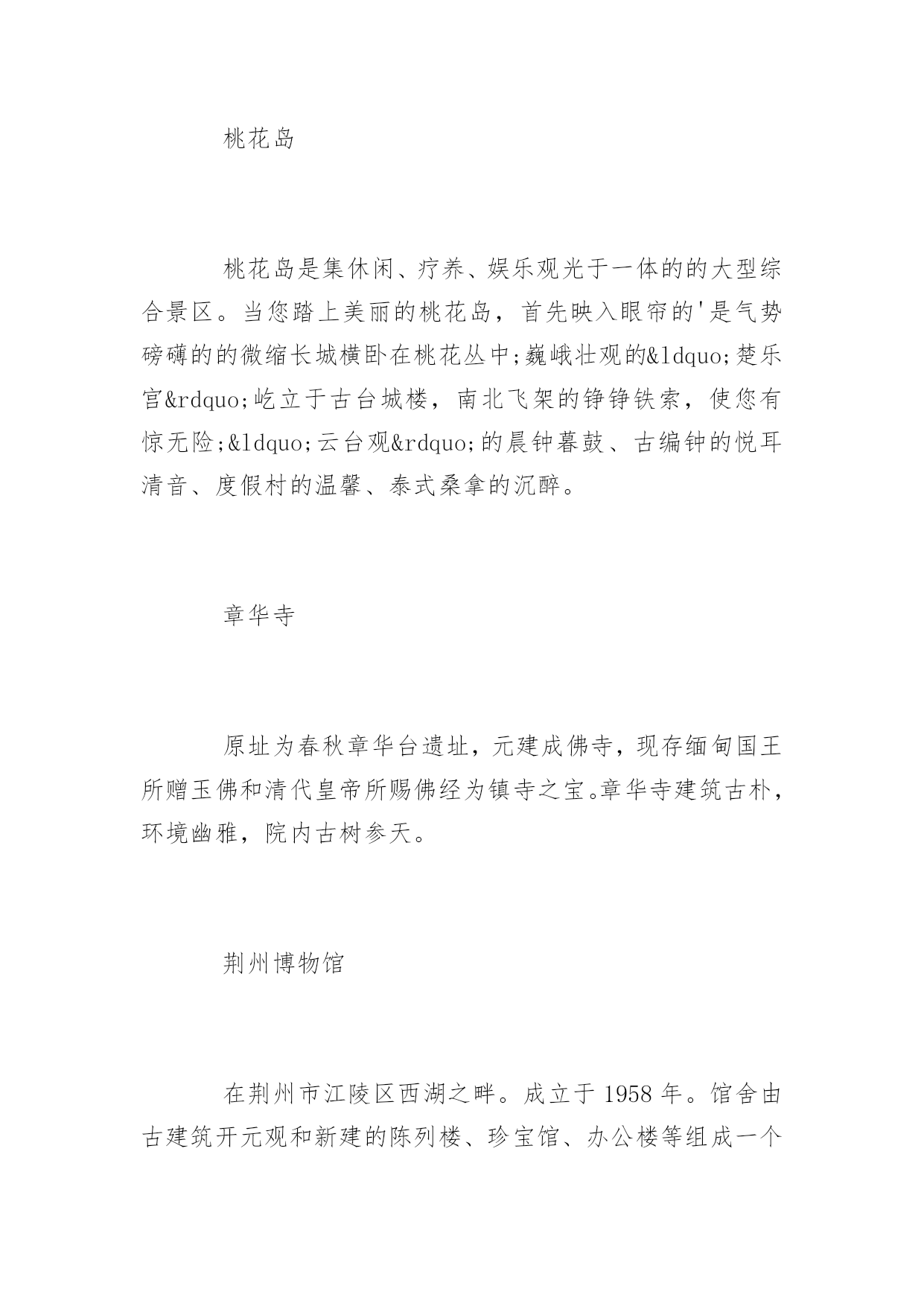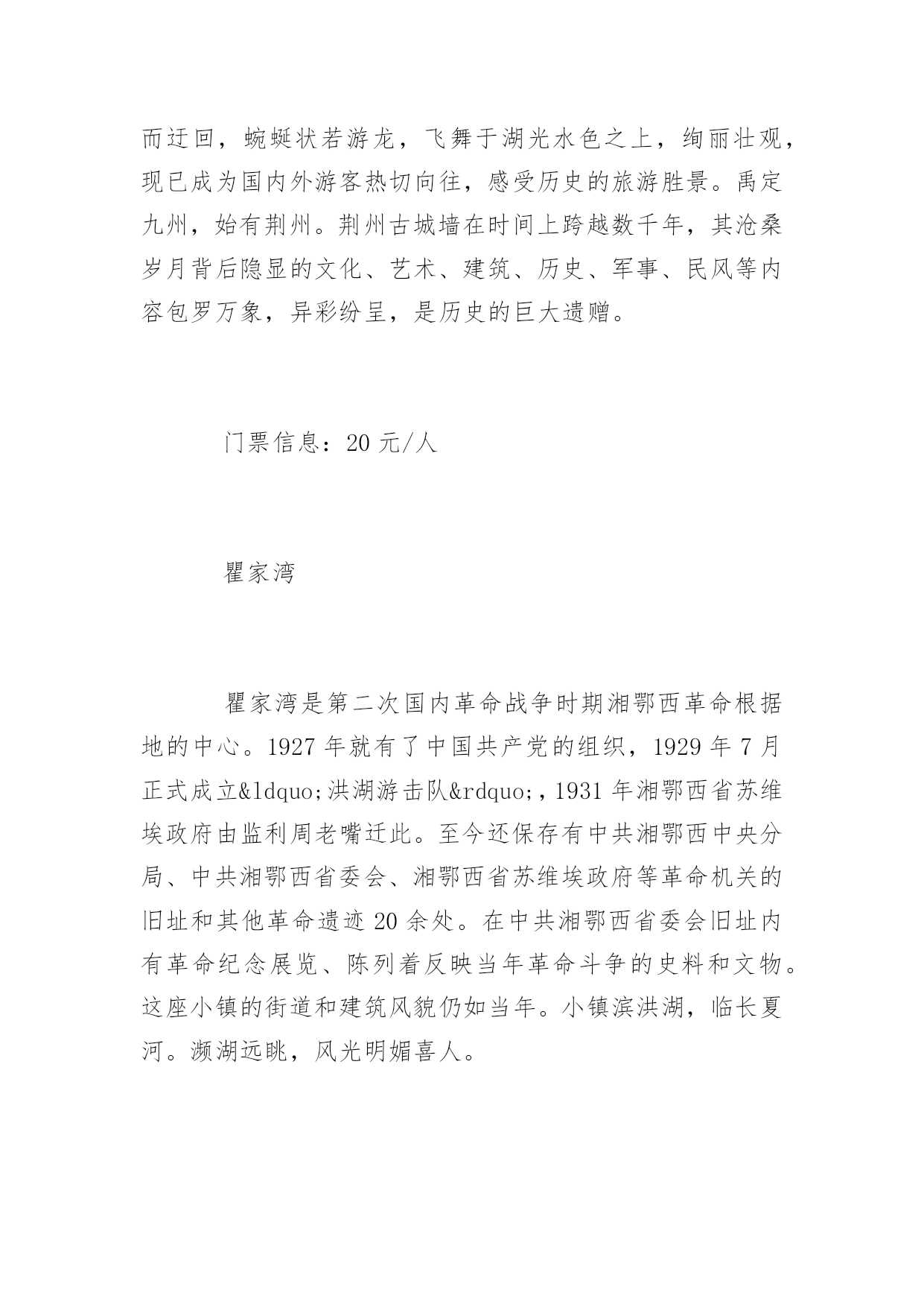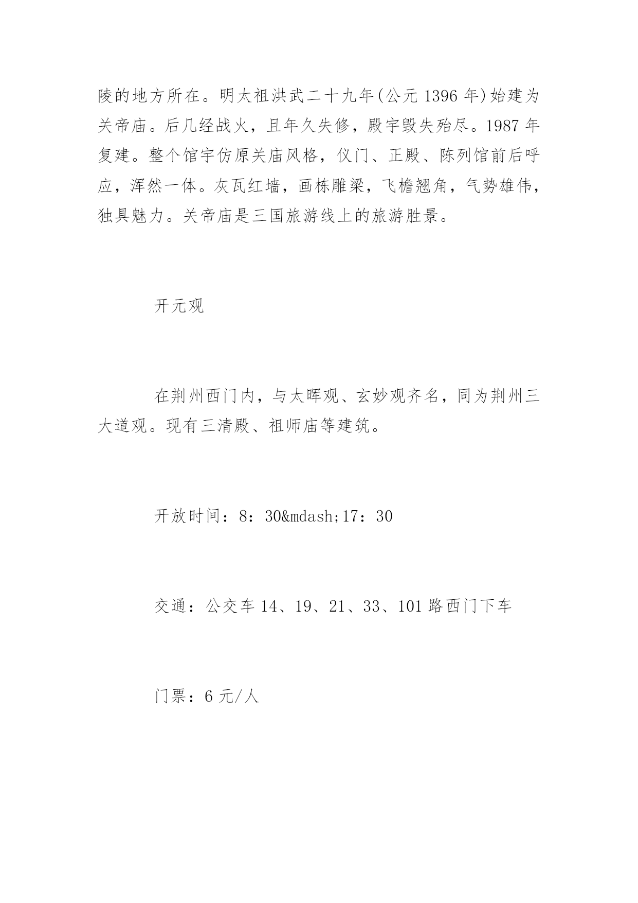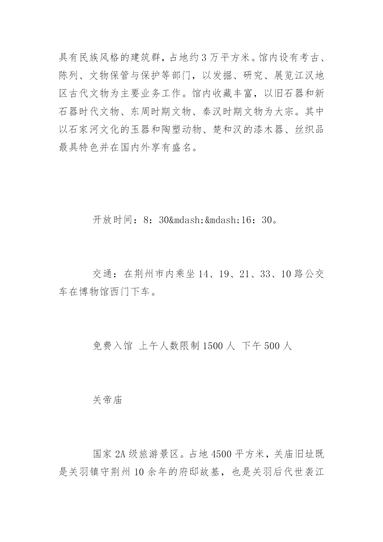 荆州旅游景点荆州旅游景点大全荆州是历史文化古城,来荆州旅游必去的景点有哪些呢?下面梳理了荆州旅游景点大全,供大家参考借鉴。荆州古城荆州古城墙始建于春秋战国时期,曾是楚国的官船码头和渚宫,后成为江陵县治所,出现了最初城廓。经过三百五十多年的风雨,现存的古城墙大部分为明末清初建筑。现耸立在人们眼前的雄伟砖城,为明清两代所修造。上下千年不同时代的城墙叠加在一起,这是中国延续时代最长、跨越朝代最多、由土城发展演变而来的唯一古城垣。荆州古城东西长3.75公里,南北宽1.2公里,周长11.28公里,城墙高8.83米,城垛4567个,炮台26座,藏兵洞4座,有城门和城楼6座。城池依地势而起伏,顺湖池而迂回,蜿蜒状若游龙,飞舞于湖光水色之上,绚丽壮观,现已成为国内外游客热切向往,感受历史的旅游胜景。禹定九州,始有荆州。荆州古城墙在时间上跨越数千年,其沧桑岁月背后隐显的文化、艺术、建筑、历史、军事、民风等内容包罗万象,异彩纷呈,是历史的巨大遗赠。门票信息:20元/人瞿家湾瞿家湾是第二次国内革命战争时期湘鄂西革命根据地的中心。1927年就有了中国共产党的组织,1929年7月正式成立“洪湖游击队”,1931年湘鄂西省苏维埃政府由监利周老嘴迁此。至今还保存有中共湘鄂西中央分局、中共湘鄂西省委会、湘鄂西省苏维埃政府等革命机关的旧址和其他革命遗迹20余处。在中共湘鄂西省委会旧址内有革命纪念展览、陈列着反映当年革命斗争的史料和文物。这座小镇的街道和建筑风貌仍如当年。小镇滨洪湖,临长夏河。濒湖远眺,风光明媚喜人。桃花岛桃花岛是集休闲、疗养、娱乐观光于一体的的大型综合景区。当您踏上美丽的桃花岛,首先映入眼帘的'是气势磅礴的的微缩长城横卧在桃花丛中;巍峨壮观的“楚乐宫”屹立于古台城楼,南北飞架的铮铮铁索,使您有惊无险;“云台观”的晨钟暮鼓、古编钟的悦耳清音、度假村的温馨、泰式桑拿的沉醉。章华寺原址为春秋章华台遗址,元建成佛寺,现存缅甸国王所赠玉佛和清代皇帝所赐佛经为镇寺之宝。章华寺建筑古朴,环境幽雅,院内古树参天。荆州博物馆在荆州市江陵区西湖之畔。成立于1958年。馆舍由古建筑开元观和新建的陈列楼、珍宝馆、办公楼等组成一个具有民族风格的建筑群,占地约3万平方米。馆内设有考古、陈列、文物保管与保护等部门,以发掘、研究、展览江汉地区古代文物为主要业务工作。馆内收藏丰富,以旧石器和新石器时代文物、东周时期文物、秦汉时期文物为大宗。其中以石家河文化的玉器和陶塑动物、楚和汉的漆木器、丝织品最具特色并在国内外享有盛名。开放时间:8:30——16:30。交通:在荆州市内乘坐14、19、21、33、10路公交车在博物馆西门下车。免费入馆上午人数限制1500人下午500人关帝庙国家2A级旅游景区。占地4500平方米,关庙旧址既是关羽镇守荆州10余年的府邸故基,也是关羽后代世袭江陵的地方所在。明太祖洪武二十九年(公元1396年)始建为关帝庙。后几经战火,且年久失修,殿宇毁失殆尽。1987年复建。整个馆宇仿原关庙风格,仪门、正殿、陈列馆前后呼应,浑然一体。灰瓦红墙,画栋雕梁,飞檐翘角,气势雄伟,独具魅力。关帝庙是三国旅游线上的旅游胜景。开元观在荆州西门内,与太晖观、玄妙观齐名,同为荆州三大道观。现有三清殿、祖师庙等建筑。开放时间:8:30—17:30交通:公交车14、19、21、33、101路西门下车门票:6元/人