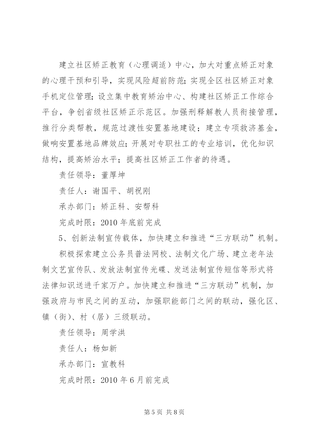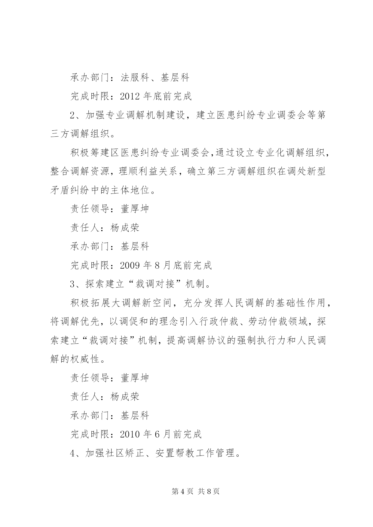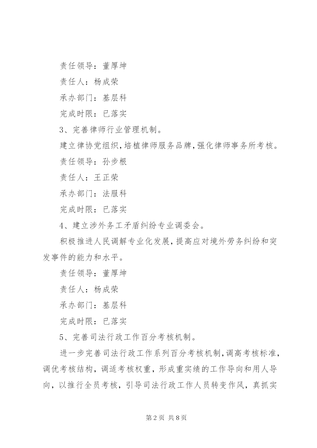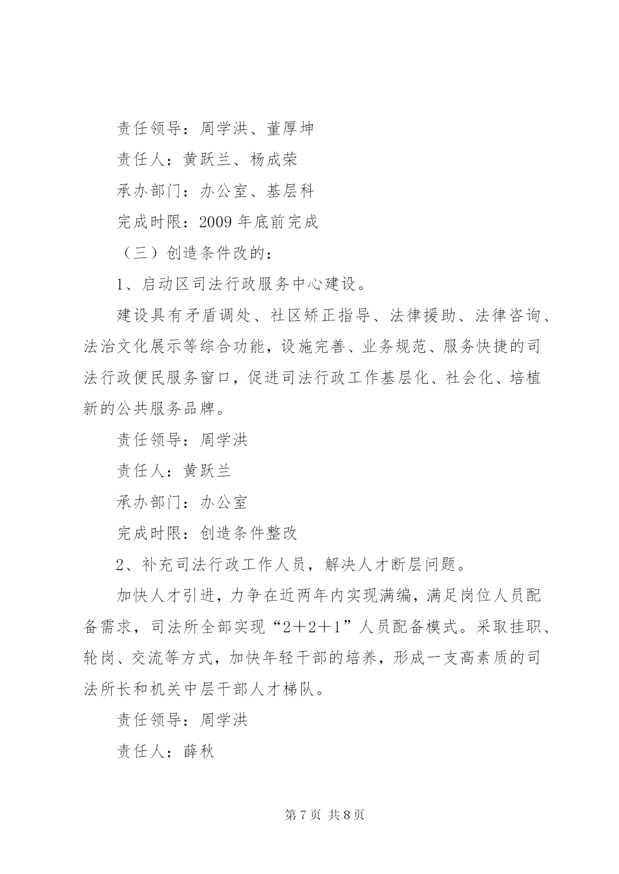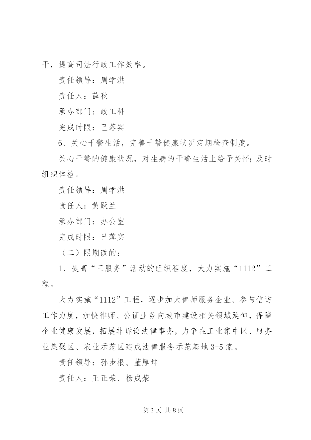 第PAGE\*Arabic\*MERGEFORMAT8页共NUMPAGES\*MERGEFORMAT8页司法局对照查摆问题整改方案进入学习实践活动“整改落实”阶段以来,**区司法局认真对照分析检查阶段查摆出来的问题和需要完善的体制机制,研究制定整改落实方案,做到“四明确一承诺”:明确整改项目、措施、责任、目标和时限要求,并通过网络、公示栏等形式向群众公布整改落实方案并作出公开承诺,把整改落实工作具体化、目标化、责任化和制度化。局领导班子以分析检查报告为主要依据,共梳理出整改项目三大类16条,具体内容如下:(一)立即改的:1、在各镇街调处中心设立“巡回审理点”。积极拓展诉调对接新空间,在各镇(街)矛盾纠纷调处中心普遍设立人民法院巡回审理点,实现诉调对接全覆盖,全面推行基层涉诉案件先行调解制度,着力提高涉诉案件调撤率。责任领导:董厚坤责任人:杨成荣承办部门:基层科完成时限:已落实2、加强司法行政工作品牌建设。以创建“XX省优秀司法所”为抓手,加强对“一所一特色、一镇(街)一品牌”创争活动的规划和指导,高标准规划、高品位推进基层司法所建设工作。责任领导:董厚坤责任人:杨成荣承办部门:基层科完成时限:已落实3、完善律师行业管理机制。建立律协党组织,培植律师服务品牌,强化律师事务所考核。责任领导:孙步根责任人:王正荣承办部门:法服科完成时限:已落实4、建立涉外务工矛盾纠纷专业调委会。积极推进人民调解专业化发展,提高应对境外劳务纠纷和突发事件的能力和水平。责任领导:董厚坤责任人:杨成荣承办部门:基层科完成时限:已落实5、完善司法行政工作百分考核机制。进一步完善司法行政工作系列百分考核机制,调高考核标准,调优考核结构,调适考核权重,形成重实绩的工作导向和用人导向,以推行全员考核,引导司法行政工作人员转变作风,真抓实干,提高司法行政工作效率。责任领导:周学洪责任人:薛秋承办部门:政工科完成时限:已落实6、关心干警生活,完善干警健康状况定期检查制度。关心干警的健康状况,对生病的干警生活上给予关怀;及时组织体检。责任领导:周学洪责任人:黄跃兰承办部门:办公室完成时限:已落实(二)限期改的:1、提高“三服务”活动的组织程度,大力实施“1112”工程。大力实施“1112”工程,逐步加大律师服务企业、参与信访工作力度,加快律师、公证业务向城市建设相关领域延伸,保障企业健康发展,拓展非诉讼法律事务,力争在工业集中区、服务业集聚区、农业示范区建成法律服务示范基地3-5家。责任领导:孙步根、董厚坤责任人:王正荣、杨成荣承办部门:法服科、基层科完成时限:2012年底前完成2、加强专业调解机制建设,建立医患纠纷专业调委会等第三方调解组织。积极筹建区医患纠纷专业调委会,通过设立专业化调解组织,整合调解资源,理顺利益关系,确立第三方调解组织在调处新型矛盾纠纷中的主体地位。责任领导:董厚坤责任人:杨成荣承办部门:基层科完成时限:2009年8月底前完成3、探索建立“裁调对接”机制。积极拓展大调解新空间,充分发挥人民调解的基础性作用,将调解优先,以调促和的理念引入行政仲裁、劳动仲裁领域,探索建立“裁调对接”机制,提高调解协议的强制执行力和人民调解的权威性。责任领导:董厚坤责任人:杨成荣承办部门:基层科完成时限:2010年6月前完成4、加强社区矫正、安置帮教工作管理。建立社区矫正教育(心理调适)中心,加大对重点矫正对象的心理干预和引导,实现风险超前防范;实现全区社区矫正对象手机定位管理;设立集中教育矫治中心、构建社区矫正工作综合平台,争创省级社区矫正示范区。加强刑释解教人员衔接管理,推行分类帮教,规范过渡性安置基地建设;建立专项救济基金,做响安置基地品牌效应;开展对专职社工的专业培训,优化知识结构,提高矫治水平;提高社区矫正工作者的待遇。责任领导:董厚坤责任人:谢国平、胡祝刚承办部门:矫正科、安帮科完成时限:2010年底前完成5、创新法制宣传载体,加快建立和推进“三方联动”机制。积极探索建立公务员普法网校、法制文化广场、建立老年法制文艺宣传队、发放法制宣传光碟、发送法制宣传短信等形式将法律知识送进千家万户。加快建立和推进“三方联动”机制,加强政府与市民之间的互动,加强职能部门之间的联动,强化区、镇(街)、村(居)三级联动。责任领导:周学洪责任人:杨如新承办部门:宣教科完成时限:2010年6月前完成6、加强司法行政队伍建设。在原有司法干警轮岗与交流的基础上,进一步加大轮岗与交流的力度,定期举办各类培训班、组织干警到先进地区学习取经,努力提高司法行政队伍的综合素质。责任领导:周学洪责任人:薛秋承办部门:政工科完成时限:2009年底前完成(已有部分落实)7、加强现代信息技术的应用。积极探索建立公务员普法网校,依托司法行政网络平台,设立网上接访中心,办理网