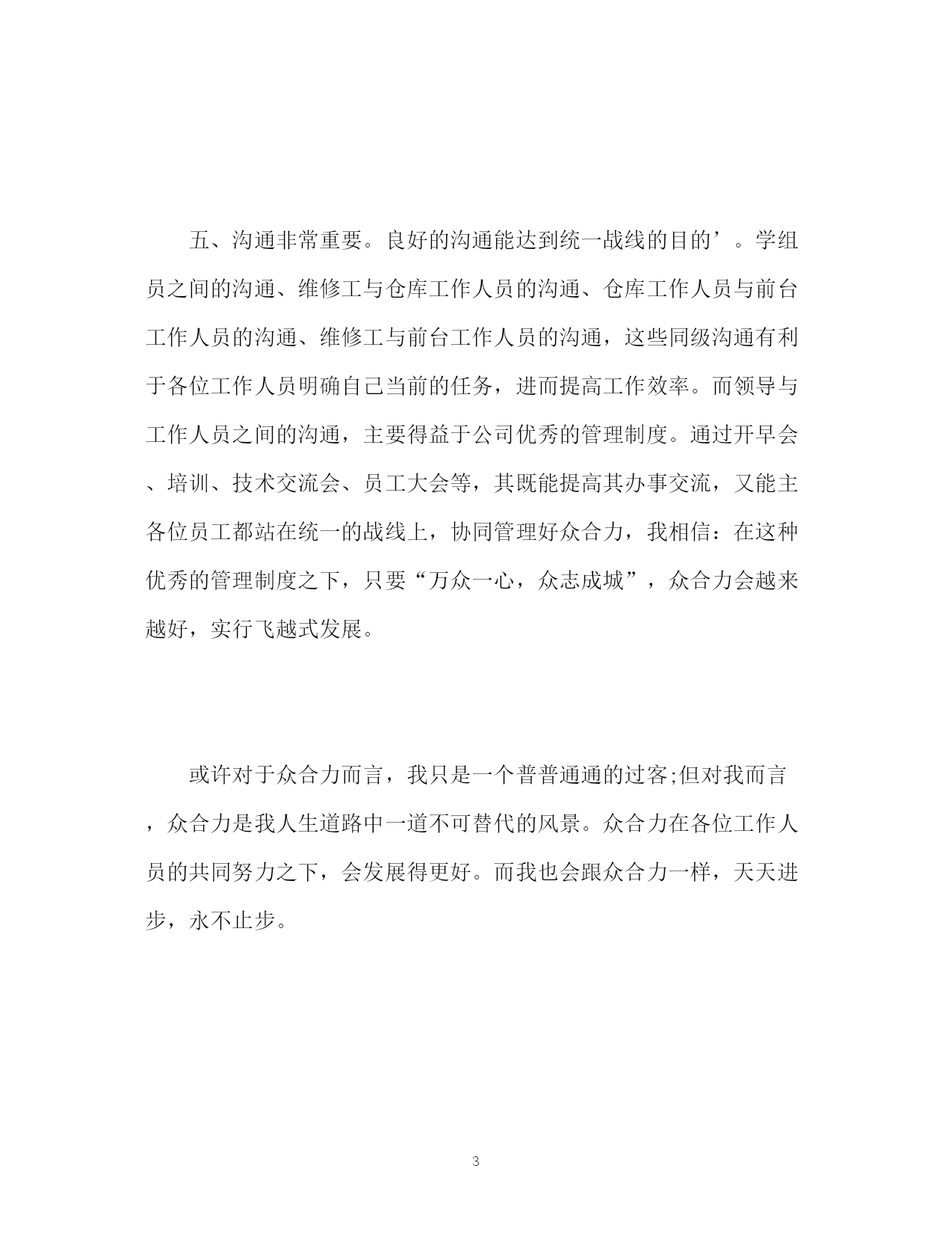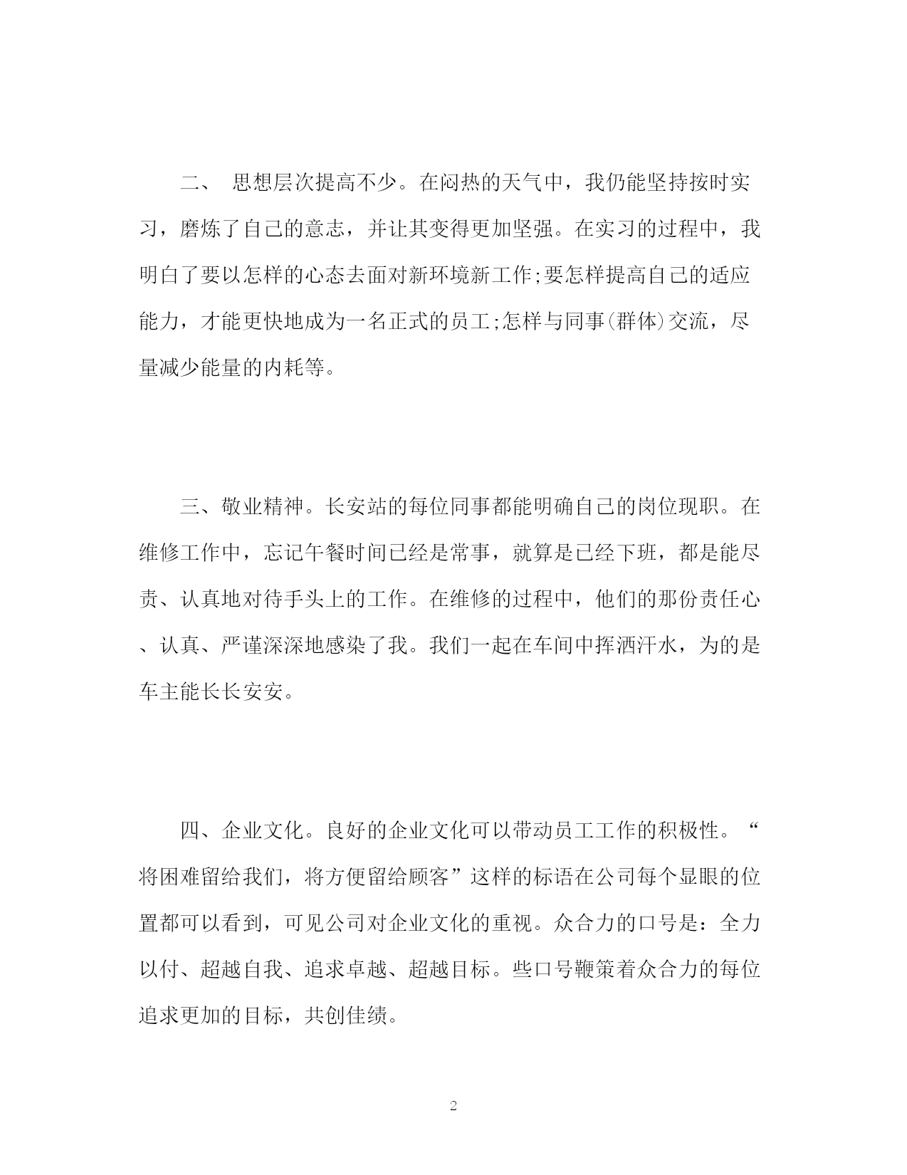 此资料由网络收集而来,如有侵权请告知上传者立即删除。资料共分享,我们负责传递知识。PAGEPAGE3机电维修实习工作总结机电维修实习工作总结时间过得很快,转眼间实习就快要结束了。首先,多谢恩师、曾主任、谢站长给我这个实习的机会和这段时间以来长安站同事的帮助与支持。回顾这一个月以来的实习,工作虽累,但并不阻碍我那颗“阳光之心”去享受工作中的点点滴滴。“用心”体会的实习过程中,我受益匪浅,主要有以下几个方面。一、技术方面。在实习过程中,我感触最深的一句话是:纸上得来终觉浅,绝知此事要躬行。理论知识与实际操作还是有一定的差距的,通过此次实习,能够巩固汽车构造的理念知识,能让我感性的接触实物,并提高了自己的动手能力。现在我已经知道保养的工作流程,并能做些简单的汽车维护。二、思想层次提高不少。在闷热的天气中,我仍能坚持按时实习,磨炼了自己的意志,并让其变得更加坚强。在实习的过程中,我明白了要以怎样的心态去面对新环境新工作;要怎样提高自己的适应能力,才能更快地成为一名正式的员工;怎样与同事(群体)交流,尽量减少能量的内耗等。三、敬业精神。长安站的每位同事都能明确自己的岗位现职。在维修工作中,忘记午餐时间已经是常事,就算是已经下班,都是能尽责、认真地对待手头上的工作。在维修的过程中,他们的那份责任心、认真、严谨深深地感染了我。我们一起在车间中挥洒汗水,为的是车主能长长安安。四、企业文化。良好的企业文化可以带动员工工作的积极性。“将困难留给我们,将方便留给顾客”这样的标语在公司每个显眼的位置都可以看到,可见公司对企业文化的重视。众合力的口号是:全力以付、超越自我、追求卓越、超越目标。些口号鞭策着众合力的每位追求更加的目标,共创佳绩。五、沟通非常重要。良好的沟通能达到统一战线的目的’。学组员之间的沟通、维修工与仓库工作人员的沟通、仓库工作人员与前台工作人员的沟通、维修工与前台工作人员的沟通,这些同级沟通有利于各位工作人员明确自己当前的任务,进而提高工作效率。而领导与工作人员之间的沟通,主要得益于公司优秀的管理制度。通过开早会、培训、技术交流会、员工大会等,其既能提高其办事交流,又能主各位员工都站在统一的战线上,协同管理好众合力,我相信:在这种优秀的管理制度之下,只要“万众一心,众志成城”,众合力会越来越好,实行飞越式发展。或许对于众合力而言,我只是一个普普通通的过客;但对我而言,众合力是我人生道路中一道不可替代的风景。众合力在各位工作人员的共同努力之下,会发展得更好。而我也会跟众合力一样,天天进步,永不止步。