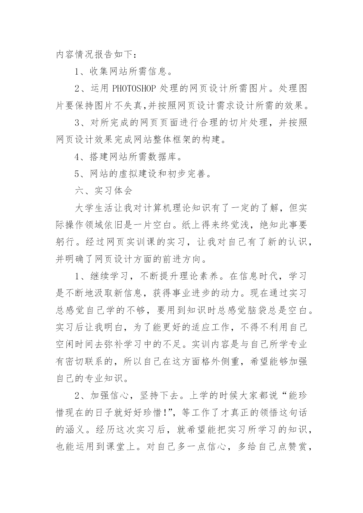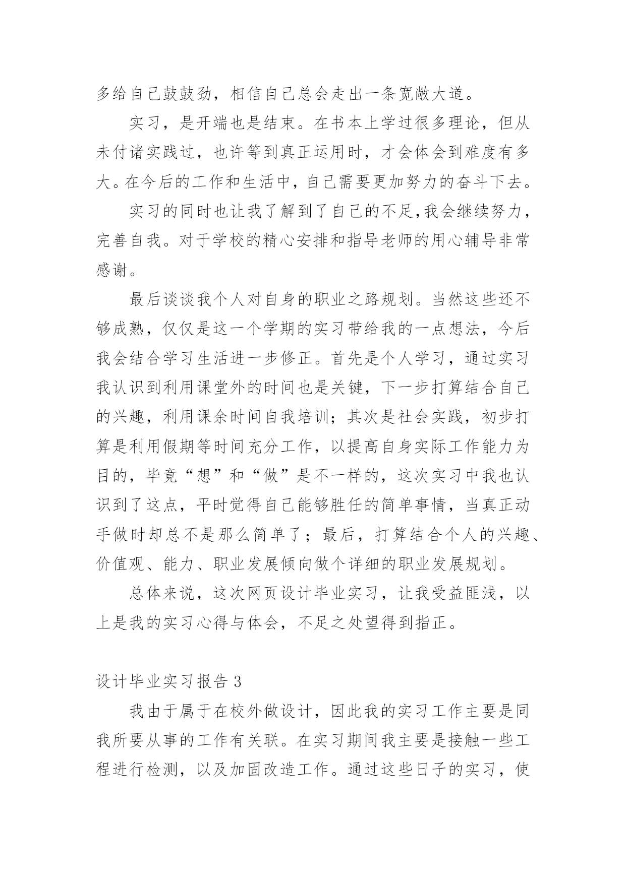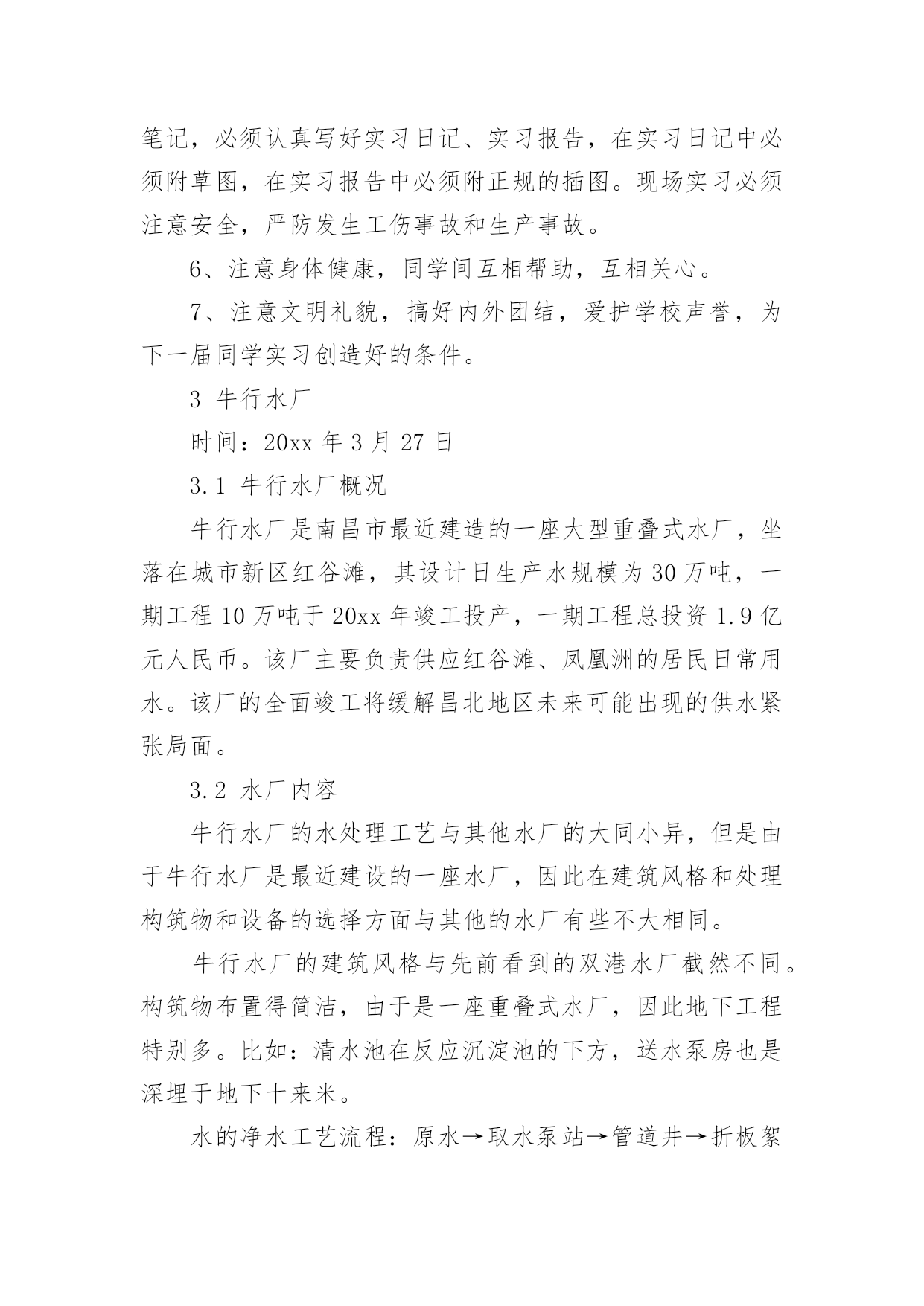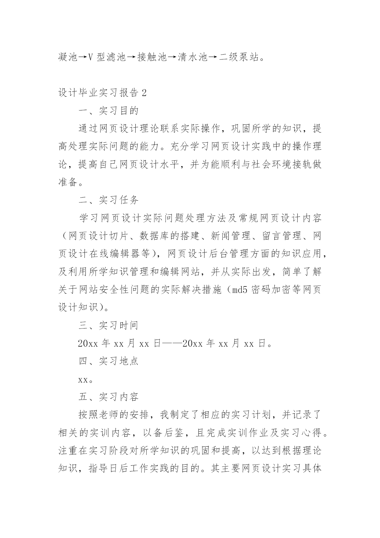 设计毕业实习报告设计毕业实习报告15篇在经济飞速发展的今天,报告十分的重要,其在写作上有一定的技巧。你知道怎样写报告才能写的好吗?下面是小编为大家收集的设计毕业实习报告,欢迎大家分享。设计毕业实习报告11实习目的1、实习是理论与实践相联系的环节,其主要目是巩固和加深所修课程。2、为毕业设计收集资料。3、开阔眼界,启发思维;对我国给水排水工程的现状和发展及给水排水工程在国民经济中的作用与地位有所了解,明确给水排水技术人员所担负的任务。2实习要求1、加强组织纪律性,集体活动中不得迟到早退和无故缺席,请假必须经有关指导教师批准。2、遵守所到单位的保密制度,严守国家机密。3、遵守厂方有关规章,遵守劳动纪律,按时上下班。4、虚心向工程技术人员和工人师傅学习,服从师傅和现场人员的安排与指导,做到眼勤、脑勤、脚勤与手勤,并注意培养自己发现问题与解决问题的独立工作能力。5、要勤记笔记,注意收集资料和设计参数,及时整理笔记,必须认真写好实习日记、实习报告,在实习日记中必须附草图,在实习报告中必须附正规的插图。现场实习必须注意安全,严防发生工伤事故和生产事故。6、注意身体健康,同学间互相帮助,互相关心。7、注意文明礼貌,搞好内外团结,爱护学校声誉,为下一届同学实习创造好的条件。3牛行水厂时间:20xx年3月27日3.1牛行水厂概况牛行水厂是南昌市最近建造的一座大型重叠式水厂,坐落在城市新区红谷滩,其设计日生产水规模为30万吨,一期工程10万吨于20xx年竣工投产,一期工程总投资1.9亿元人民币。该厂主要负责供应红谷滩、凤凰洲的居民日常用水。该厂的全面竣工将缓解昌北地区未来可能出现的供水紧张局面。3.2水厂内容牛行水厂的水处理工艺与其他水厂的大同小异,但是由于牛行水厂是最近建设的一座水厂,因此在建筑风格和处理构筑物和设备的选择方面与其他的水厂有些不大相同。牛行水厂的建筑风格与先前看到的双港水厂截然不同。构筑物布置得简洁,由于是一座重叠式水厂,因此地下工程特别多。比如:清水池在反应沉淀池的下方,送水泵房也是深埋于地下十来米。水的净水工艺流程:原水→取水泵站→管道井→折板絮凝池→V型滤池→接触池→清水池→二级泵站。设计毕业实习报告2一、实习目的通过网页设计理论联系实际操作,巩固所学的知识,提高处理实际问题的能力。充分学习网页设计实践中的操作理论,提高自己网页设计水平,并为能顺利与社会环境接轨做准备。二、实习任务学习网页设计实际问题处理方法及常规网页设计内容(网页设计切片、数据库的搭建、新闻管理、留言管理、网页设计在线编辑器等),网页设计后台管理方面的知识应用,及利用所学知识管理和编辑网站,并从实际出发,简单了解关于网站安全性问题的实际解决措施(md5密码加密等网页设计知识)。三、实习时间20xx年xx月xx日——20xx年xx月xx日。四、实习地点xx。五、实习内容按照老师的安排,我制定了相应的实习计划,并记录了相关的实训内容,以备后鉴,且完成实训作业及实习心得。注重在实习阶段对所学知识的巩固和提高,以达到根据理论知识,指导日后工作实践的目的。其主要网页设计实习具体内容情况报告如下:1、收集网站所需信息。2、运用PHOTOSHOP处理的网页设计所需图片。处理图片要保持图片不失真,并按照网页设计需求设计所需的效果。3、对所完成的网页页面进行合理的切片处理,并按照网页设计效果完成网站整体框架的构建。4、搭建网站所需数据库。5、网站的虚拟建设和初步完善。六、实习体会大学生活让我对计算机理论知识有了一定的了解,但实际操作领域依旧是一片空白。纸上得来终觉浅,绝知此事要躬行。经过网页实训课的实习,让我对自己有了新的认识,并明确了网页设计方面的前进方向。1、继续学习,不断提升理论素养。在信息时代,学习是不断地汲取新信息,获得事业进步的动力。现在通过实习总感觉自己学的不够,要用到知识时总感觉脑袋总是空白。实习后让我明白,为了能更好的适应工作,不得不利用自己空闲时间去弥补学习中的不足。实训内容是与自己所学专业有密切联系的,所以自己在这方面格外侧重,希望能够加强自己的专业知识。2、加强信心,坚持下去。上学的时候大家都说“能珍惜现在的日子就好好珍惜!”,等工作了才真正的领悟这句话的涵义。经历这次实习后,就希望能把实习所学习的知识,也能运用到课堂上。对自己多一点信心,多给自己点赞赏,多给自己鼓鼓劲,相信自己总会走出一条宽敞大道。实习,是开端也是结束。在书本上学过很多理论,但从未付诸实践过,也许等到真正运用时,才会体会到难度有多大。在今后的工作和生活中,自己需要更加努力的奋斗下去。实习的同时也让我了解到了自己的不足,我会继续努力,完善自我。对于学校的精心安排和指导老师的用心辅导非常感谢。最后谈谈我个人对自身的职业之路规划。当然这些还不够成熟,仅仅是这一个学期的实习带给我的一