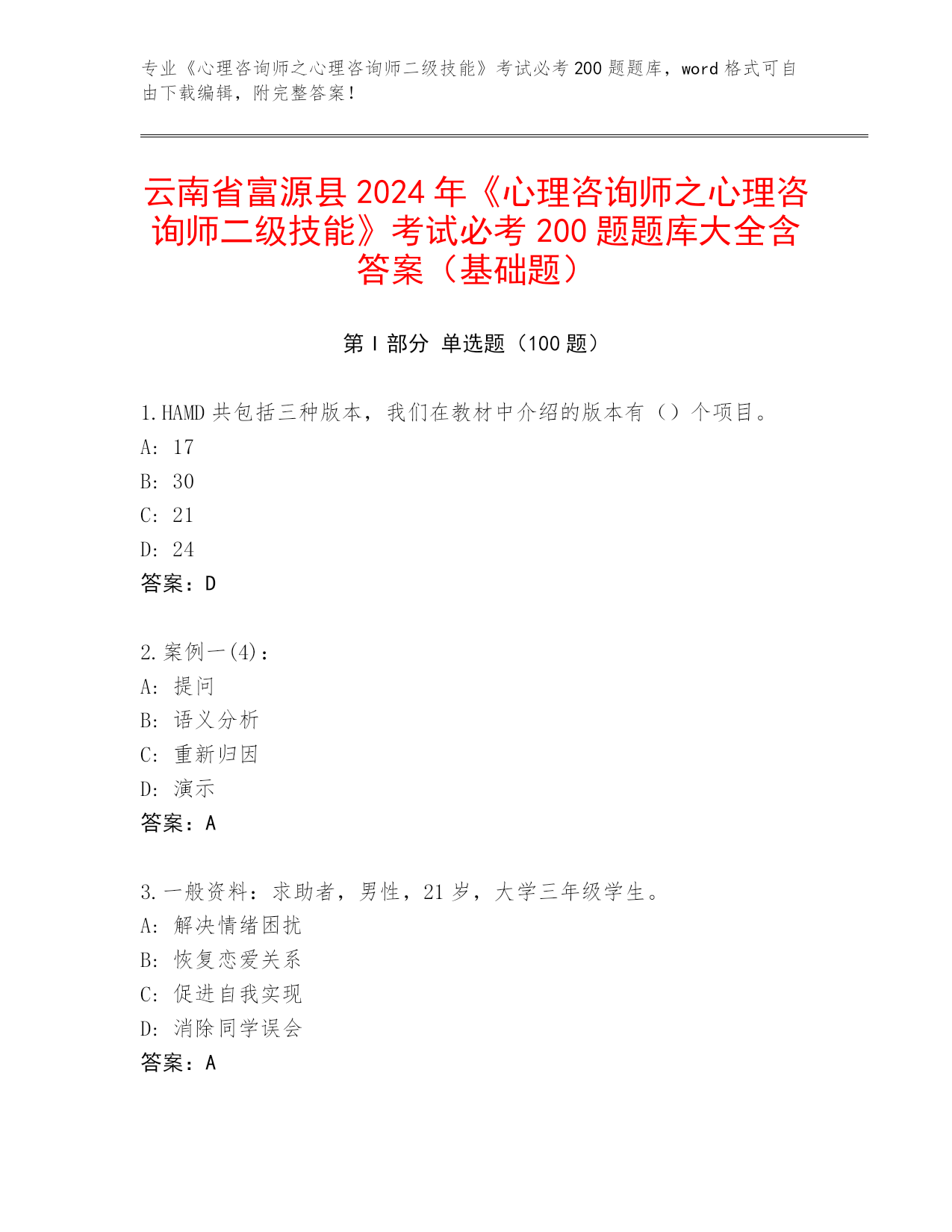 云南省富源县2024年《心理咨询师之心理咨询师二级技能》考试必考200题题库大全含答案(基础题)