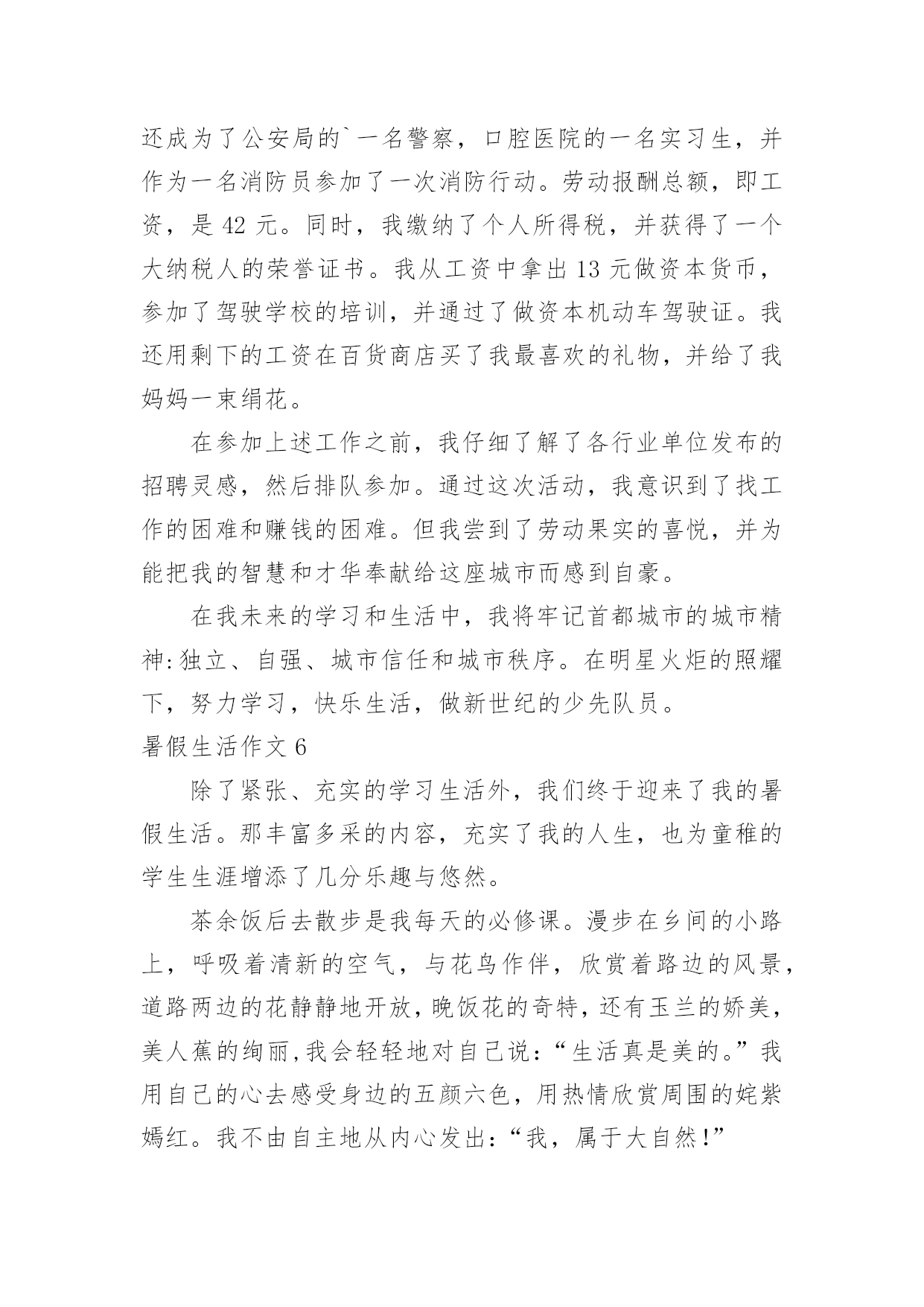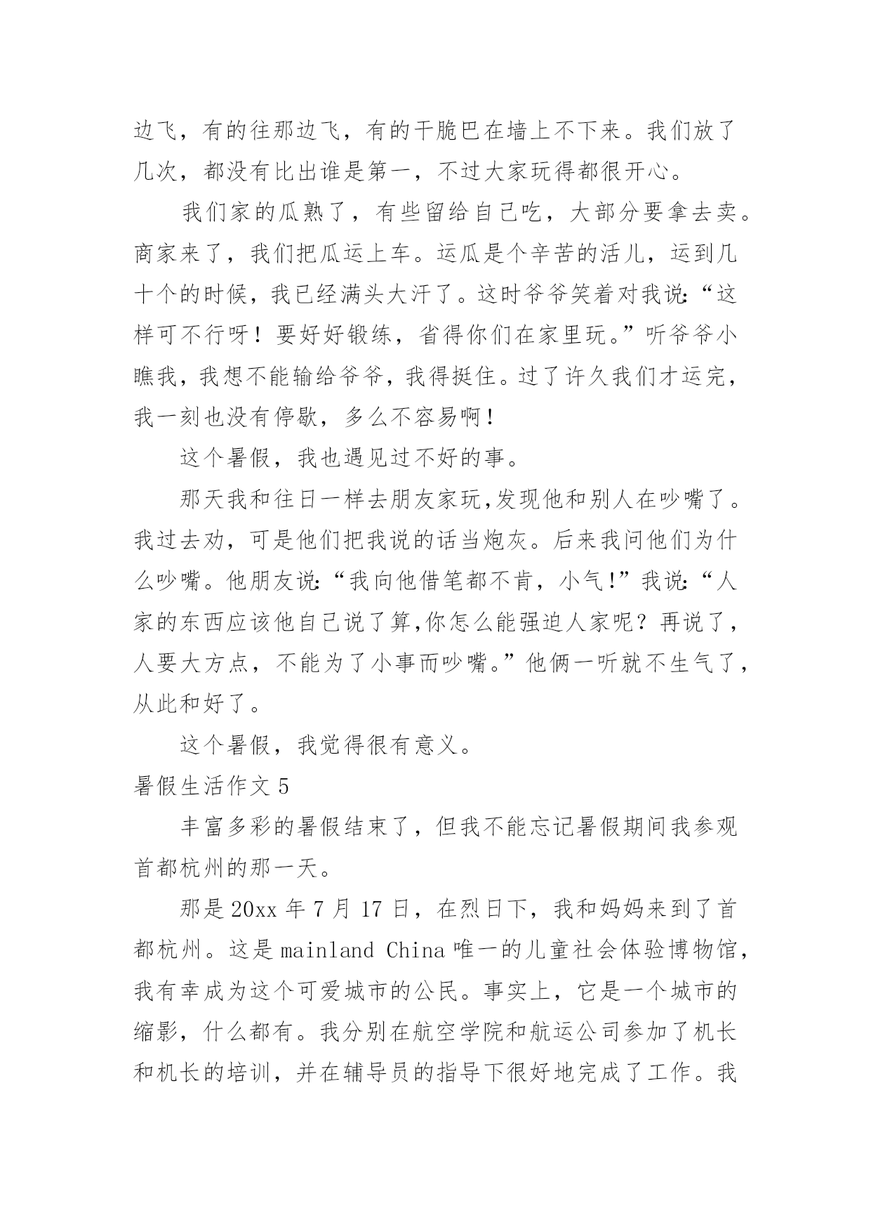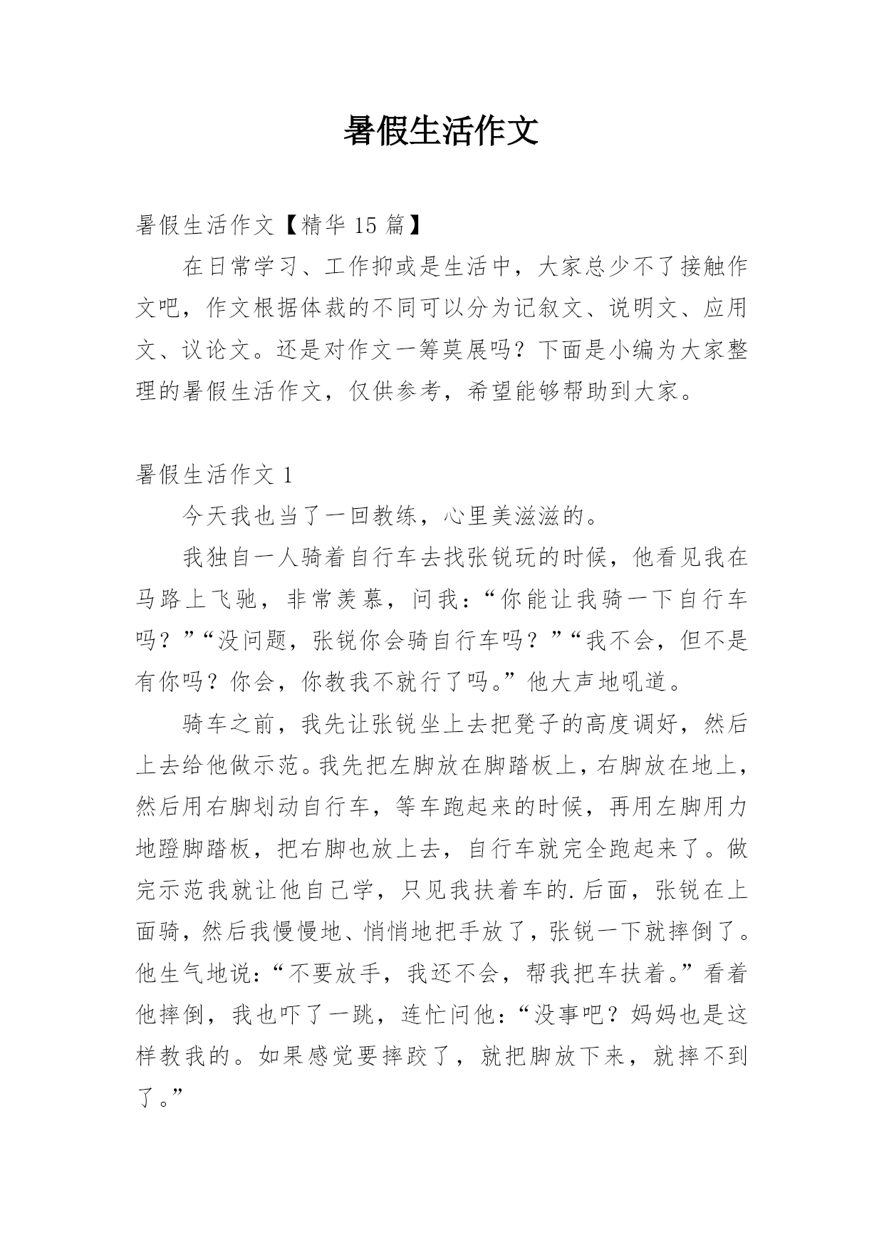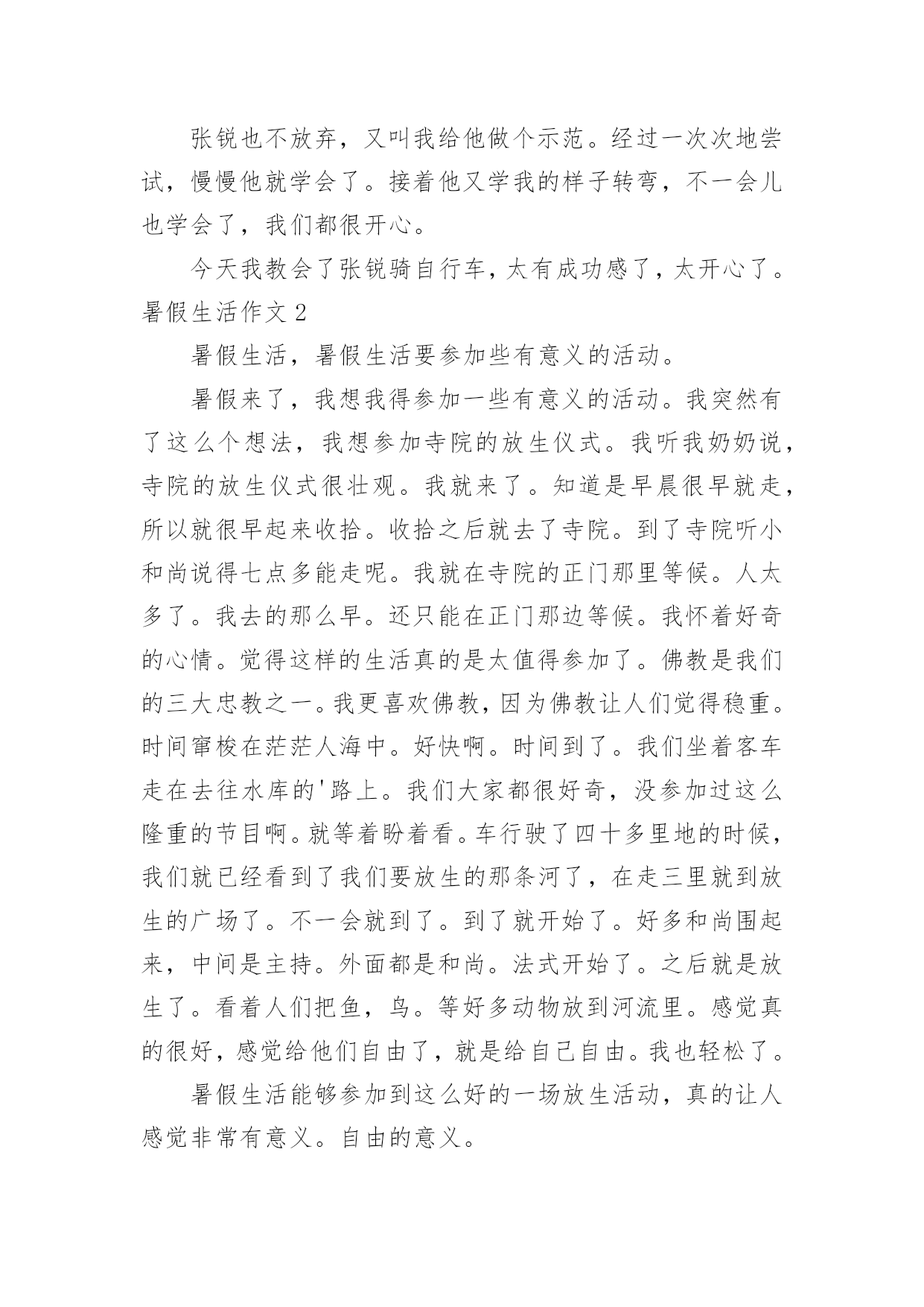 暑假生活作文暑假生活作文【精华15篇】在日常学习、工作抑或是生活中,大家总少不了接触作文吧,作文根据体裁的不同可以分为记叙文、说明文、应用文、议论文。还是对作文一筹莫展吗?下面是小编为大家整理的暑假生活作文,仅供参考,希望能够帮助到大家。暑假生活作文1今天我也当了一回教练,心里美滋滋的。我独自一人骑着自行车去找张锐玩的时候,他看见我在马路上飞驰,非常羡慕,问我:“你能让我骑一下自行车吗?”“没问题,张锐你会骑自行车吗?”“我不会,但不是有你吗?你会,你教我不就行了吗。”他大声地吼道。骑车之前,我先让张锐坐上去把凳子的高度调好,然后上去给他做示范。我先把左脚放在脚踏板上,右脚放在地上,然后用右脚划动自行车,等车跑起来的时候,再用左脚用力地蹬脚踏板,把右脚也放上去,自行车就完全跑起来了。做完示范我就让他自己学,只见我扶着车的.后面,张锐在上面骑,然后我慢慢地、悄悄地把手放了,张锐一下就摔倒了。他生气地说:“不要放手,我还不会,帮我把车扶着。”看着他摔倒,我也吓了一跳,连忙问他:“没事吧?妈妈也是这样教我的。如果感觉要摔跤了,就把脚放下来,就摔不到了。”张锐也不放弃,又叫我给他做个示范。经过一次次地尝试,慢慢他就学会了。接着他又学我的样子转弯,不一会儿也学会了,我们都很开心。今天我教会了张锐骑自行车,太有成功感了,太开心了。暑假生活作文2暑假生活,暑假生活要参加些有意义的活动。暑假来了,我想我得参加一些有意义的活动。我突然有了这么个想法,我想参加寺院的放生仪式。我听我奶奶说,寺院的放生仪式很壮观。我就来了。知道是早晨很早就走,所以就很早起来收拾。收拾之后就去了寺院。到了寺院听小和尚说得七点多能走呢。我就在寺院的正门那里等候。人太多了。我去的那么早。还只能在正门那边等候。我怀着好奇的心情。觉得这样的生活真的是太值得参加了。佛教是我们的三大忠教之一。我更喜欢佛教,因为佛教让人们觉得稳重。时间窜梭在茫茫人海中。好快啊。时间到了。我们坐着客车走在去往水库的'路上。我们大家都很好奇,没参加过这么隆重的节目啊。就等着盼着看。车行驶了四十多里地的时候,我们就已经看到了我们要放生的那条河了,在走三里就到放生的广场了。不一会就到了。到了就开始了。好多和尚围起来,中间是主持。外面都是和尚。法式开始了。之后就是放生了。看着人们把鱼,鸟。等好多动物放到河流里。感觉真的很好,感觉给他们自由了,就是给自己自由。我也轻松了。暑假生活能够参加到这么好的一场放生活动,真的让人感觉非常有意义。自由的意义。暑假生活作文3放假了,随着下课铃的一声响,我们的暑假生活就开始了。第二天,我和暑假作业展开了“赛跑”,我在和暑假作业不断地“赛跑”中,一点一点地消耗它的“体力”,在妈妈的帮助下,我终于赢了暑假作业,除了暑假作业还有老师的附加作业日?、看书、英语作文,我不断地写,终于我过五关斩六将完成了它们。在这一个多星期里,我像一只飞出笼子的小鸟,展开翅膀在蔚蓝的.天空中自由自在地飞翔。除了看看书,还有很多时间看电视、玩电脑。上学时,每天早上六点半就得准时起床,可现在,每天早上八点多才睁开的睡眼,不用那么着急地穿衣服,磨磨蹭蹭。吃过早饭,看电视,读读课外书。刚放暑假,除了在家玩玩电脑之外,还是在家,没有上学时的快活,不能和好朋友们在一起玩游戏。不管是快乐,还是轻松和烦恼,但我仍觉得放暑假的感觉真好!暑假生活作文4学生们都盼着暑假,我的暑假非常快乐。有一次我去找同学玩。同学提议去捉蜻蜓,我说好呀!我们来到了一处绿油油的开满五颜六色花朵的地方。蜻蜓有红的,黄的,紫的等花花绿绿的.。我们都捉到一只,有人提议来一次比赛,看谁捉的蜻蜓飞得远。我们来到了一处四周都是封闭的地方,站在同一条线上开始喊:“一、二、三!放!”大家就一起放,可是蜻蜓太不听话了,有的往这边飞,有的往那边飞,有的干脆巴在墙上不下来。我们放了几次,都没有比出谁是第一,不过大家玩得都很开心。我们家的瓜熟了,有些留给自己吃,大部分要拿去卖。商家来了,我们把瓜运上车。运瓜是个辛苦的活儿,运到几十个的时候,我已经满头大汗了。这时爷爷笑着对我说:“这样可不行呀!要好好锻练,省得你们在家里玩。”听爷爷小瞧我,我想不能输给爷爷,我得挺住。过了许久我们才运完,我一刻也没有停歇,多么不容易啊!这个暑假,我也遇见过不好的事。那天我和往日一样去朋友家玩,发现他和别人在吵嘴了。我过去劝,可是他们把我说的话当炮灰。后来我问他们为什么吵嘴。他朋友说:“我向他借笔都不肯,小气!”我说:“人家的东西应该他自己说了算,你怎么能强迫人家呢?再说了,人要大方点,不能为了小事而吵嘴。”他俩一听就不生气了,从此和好了。这个暑假,我觉得很有意义。暑假生活作文5丰富多彩的暑假结束了,但我不能忘记暑假期间我参观首都杭州的那一天。那是20xx年7月17日,在烈日下,我和妈