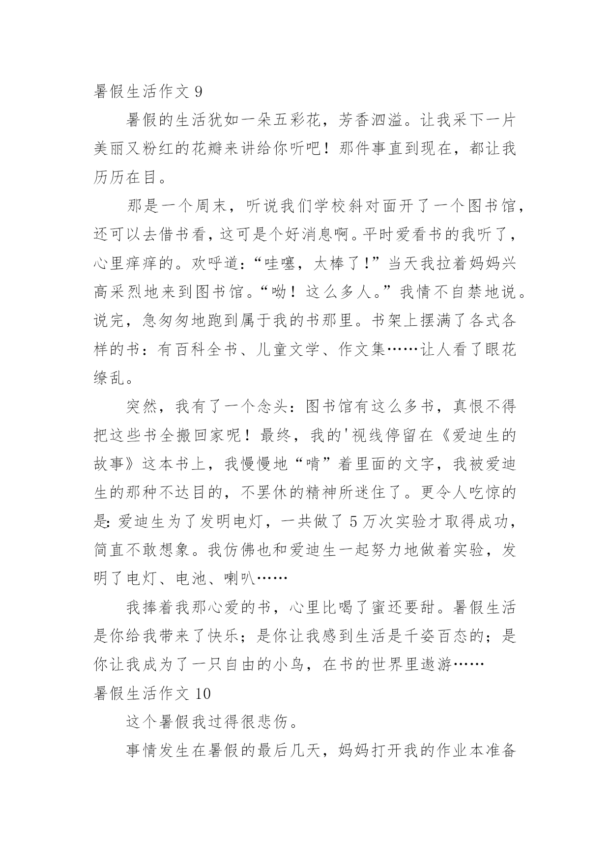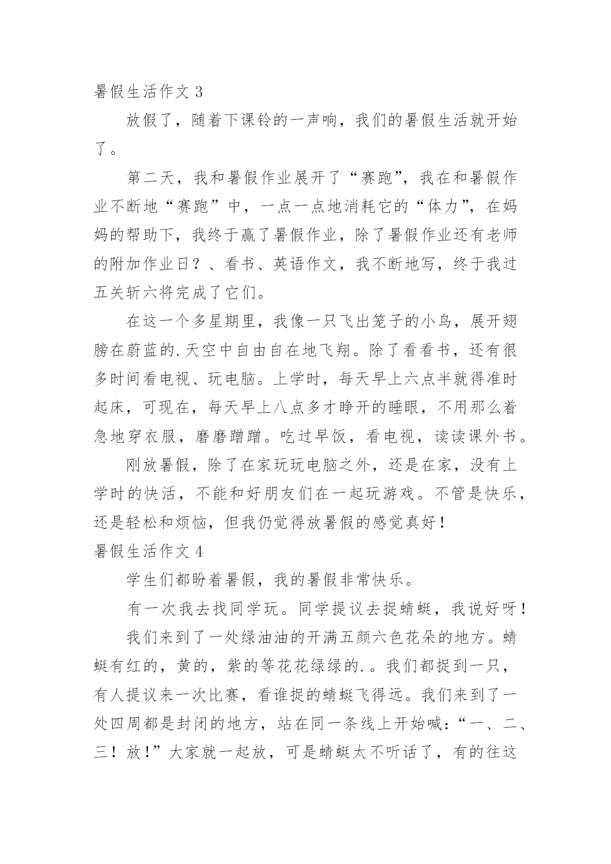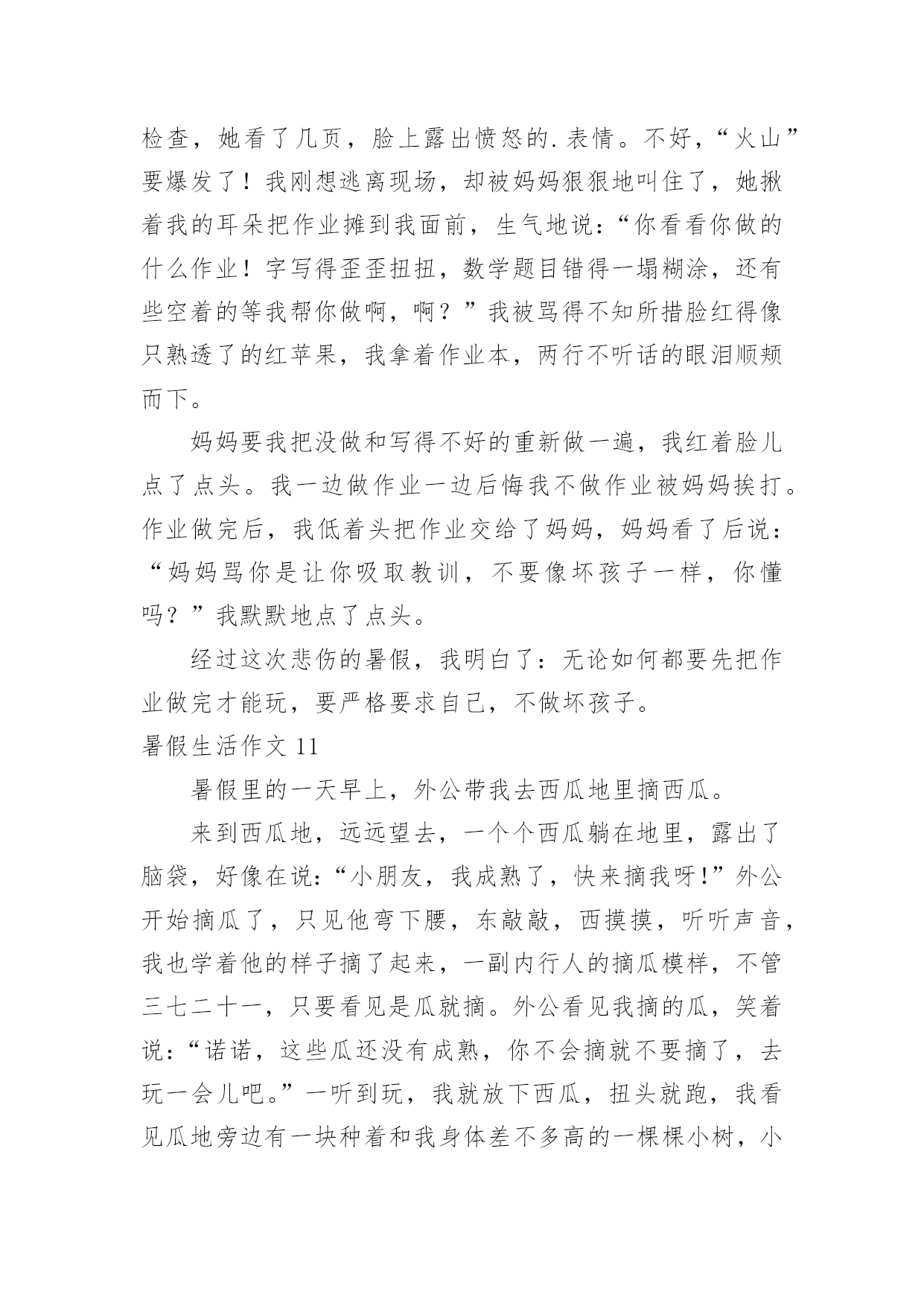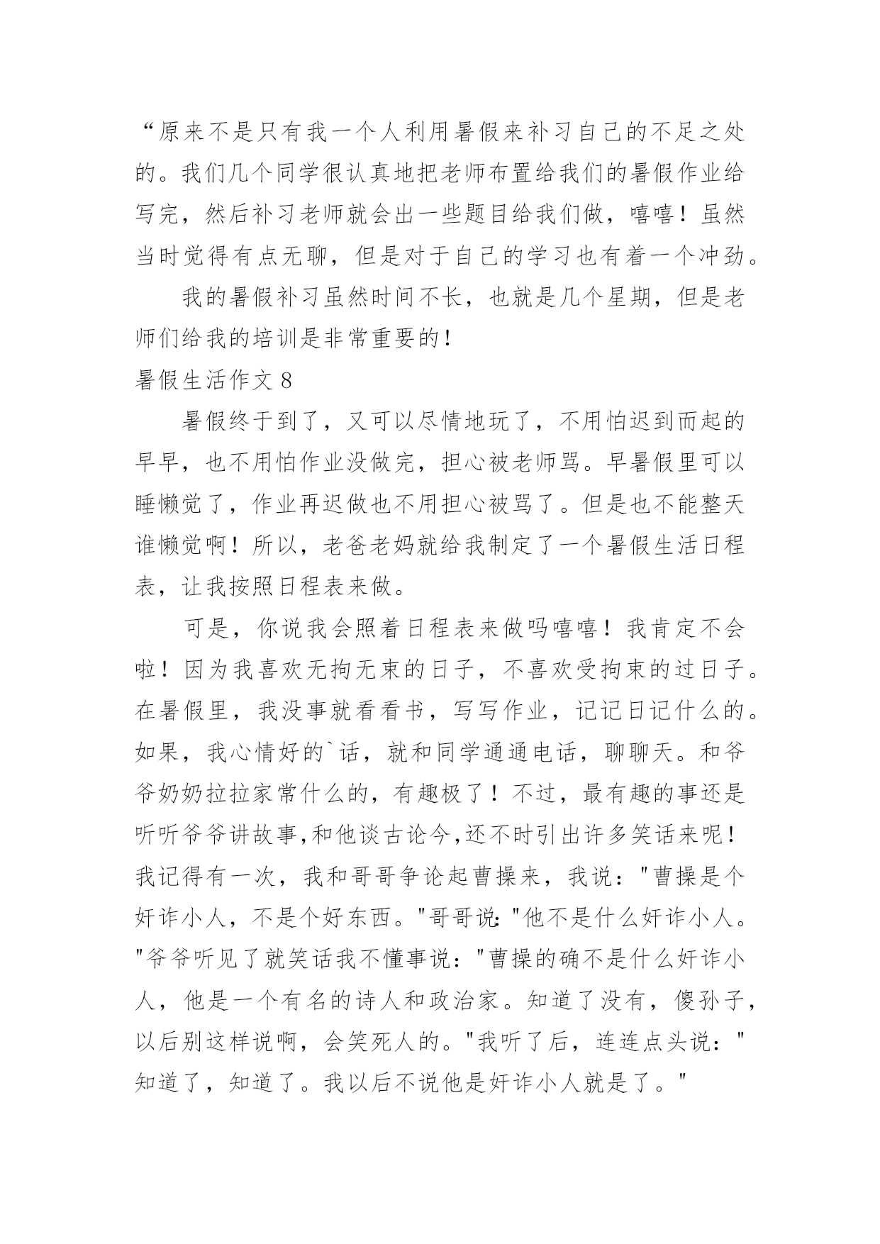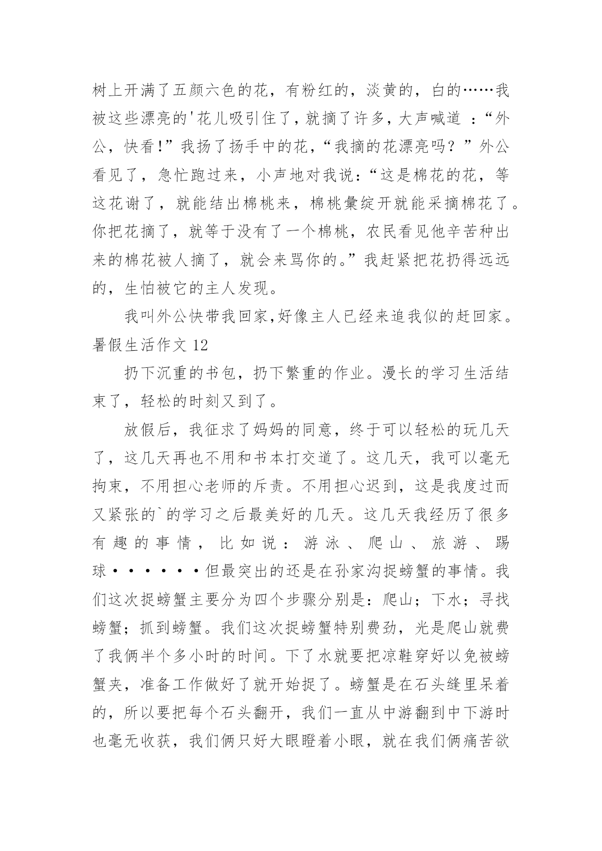 暑假生活作文暑假生活作文【精华15篇】在日常学习、工作抑或是生活中,大家总少不了接触作文吧,作文根据体裁的不同可以分为记叙文、说明文、应用文、议论文。还是对作文一筹莫展吗?下面是小编为大家整理的暑假生活作文,仅供参考,希望能够帮助到大家。暑假生活作文1今天我也当了一回教练,心里美滋滋的。我独自一人骑着自行车去找张锐玩的时候,他看见我在马路上飞驰,非常羡慕,问我:“你能让我骑一下自行车吗?”“没问题,张锐你会骑自行车吗?”“我不会,但不是有你吗?你会,你教我不就行了吗。”他大声地吼道。骑车之前,我先让张锐坐上去把凳子的高度调好,然后上去给他做示范。我先把左脚放在脚踏板上,右脚放在地上,然后用右脚划动自行车,等车跑起来的时候,再用左脚用力地蹬脚踏板,把右脚也放上去,自行车就完全跑起来了。做完示范我就让他自己学,只见我扶着车的.后面,张锐在上面骑,然后我慢慢地、悄悄地把手放了,张锐一下就摔倒了。他生气地说:“不要放手,我还不会,帮我把车扶着。”看着他摔倒,我也吓了一跳,连忙问他:“没事吧?妈妈也是这样教我的。如果感觉要摔跤了,就把脚放下来,就摔不到了。”张锐也不放弃,又叫我给他做个示范。经过一次次地尝试,慢慢他就学会了。接着他又学我的样子转弯,不一会儿也学会了,我们都很开心。今天我教会了张锐骑自行车,太有成功感了,太开心了。暑假生活作文2暑假生活,暑假生活要参加些有意义的活动。暑假来了,我想我得参加一些有意义的活动。我突然有了这么个想法,我想参加寺院的放生仪式。我听我奶奶说,寺院的放生仪式很壮观。我就来了。知道是早晨很早就走,所以就很早起来收拾。收拾之后就去了寺院。到了寺院听小和尚说得七点多能走呢。我就在寺院的正门那里等候。人太多了。我去的那么早。还只能在正门那边等候。我怀着好奇的心情。觉得这样的生活真的是太值得参加了。佛教是我们的三大忠教之一。我更喜欢佛教,因为佛教让人们觉得稳重。时间窜梭在茫茫人海中。好快啊。时间到了。我们坐着客车走在去往水库的'路上。我们大家都很好奇,没参加过这么隆重的节目啊。就等着盼着看。车行驶了四十多里地的时候,我们就已经看到了我们要放生的那条河了,在走三里就到放生的广场了。不一会就到了。到了就开始了。好多和尚围起来,中间是主持。外面都是和尚。法式开始了。之后就是放生了。看着人们把鱼,鸟。等好多动物放到河流里。感觉真的很好,感觉给他们自由了,就是给自己自由。我也轻松了。暑假生活能够参加到这么好的一场放生活动,真的让人感觉非常有意义。自由的意义。暑假生活作文3放假了,随着下课铃的一声响,我们的暑假生活就开始了。第二天,我和暑假作业展开了“赛跑”,我在和暑假作业不断地“赛跑”中,一点一点地消耗它的“体力”,在妈妈的帮助下,我终于赢了暑假作业,除了暑假作业还有老师的附加作业日?、看书、英语作文,我不断地写,终于我过五关斩六将完成了它们。在这一个多星期里,我像一只飞出笼子的小鸟,展开翅膀在蔚蓝的.天空中自由自在地飞翔。除了看看书,还有很多时间看电视、玩电脑。上学时,每天早上六点半就得准时起床,可现在,每天早上八点多才睁开的睡眼,不用那么着急地穿衣服,磨磨蹭蹭。吃过早饭,看电视,读读课外书。刚放暑假,除了在家玩玩电脑之外,还是在家,没有上学时的快活,不能和好朋友们在一起玩游戏。不管是快乐,还是轻松和烦恼,但我仍觉得放暑假的感觉真好!暑假生活作文4学生们都盼着暑假,我的暑假非常快乐。有一次我去找同学玩。同学提议去捉蜻蜓,我说好呀!我们来到了一处绿油油的开满五颜六色花朵的地方。蜻蜓有红的,黄的,紫的等花花绿绿的.。我们都捉到一只,有人提议来一次比赛,看谁捉的蜻蜓飞得远。我们来到了一处四周都是封闭的地方,站在同一条线上开始喊:“一、二、三!放!”大家就一起放,可是蜻蜓太不听话了,有的往这边飞,有的往那边飞,有的干脆巴在墙上不下来。我们放了几次,都没有比出谁是第一,不过大家玩得都很开心。我们家的瓜熟了,有些留给自己吃,大部分要拿去卖。商家来了,我们把瓜运上车。运瓜是个辛苦的活儿,运到几十个的时候,我已经满头大汗了。这时爷爷笑着对我说:“这样可不行呀!要好好锻练,省得你们在家里玩。”听爷爷小瞧我,我想不能输给爷爷,我得挺住。过了许久我们才运完,我一刻也没有停歇,多么不容易啊!这个暑假,我也遇见过不好的事。那天我和往日一样去朋友家玩,发现他和别人在吵嘴了。我过去劝,可是他们把我说的话当炮灰。后来我问他们为什么吵嘴。他朋友说:“我向他借笔都不肯,小气!”我说:“人家的东西应该他自己说了算,你怎么能强迫人家呢?再说了,人要大方点,不能为了小事而吵嘴。”他俩一听就不生气了,从此和好了。这个暑假,我觉得很有意义。暑假生活作文5丰富多彩的暑假结束了,但我不能忘记暑假期间我参观首都杭州的那一天。那是20xx年7月17日,在烈日下,我和妈