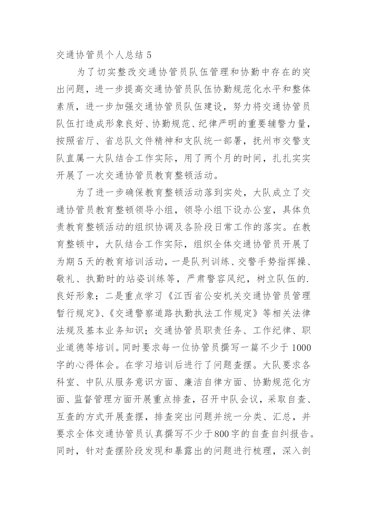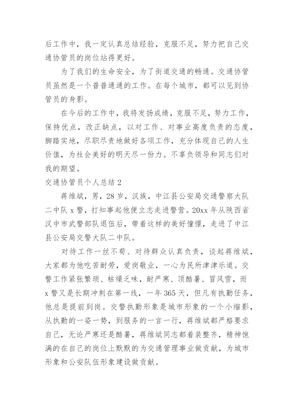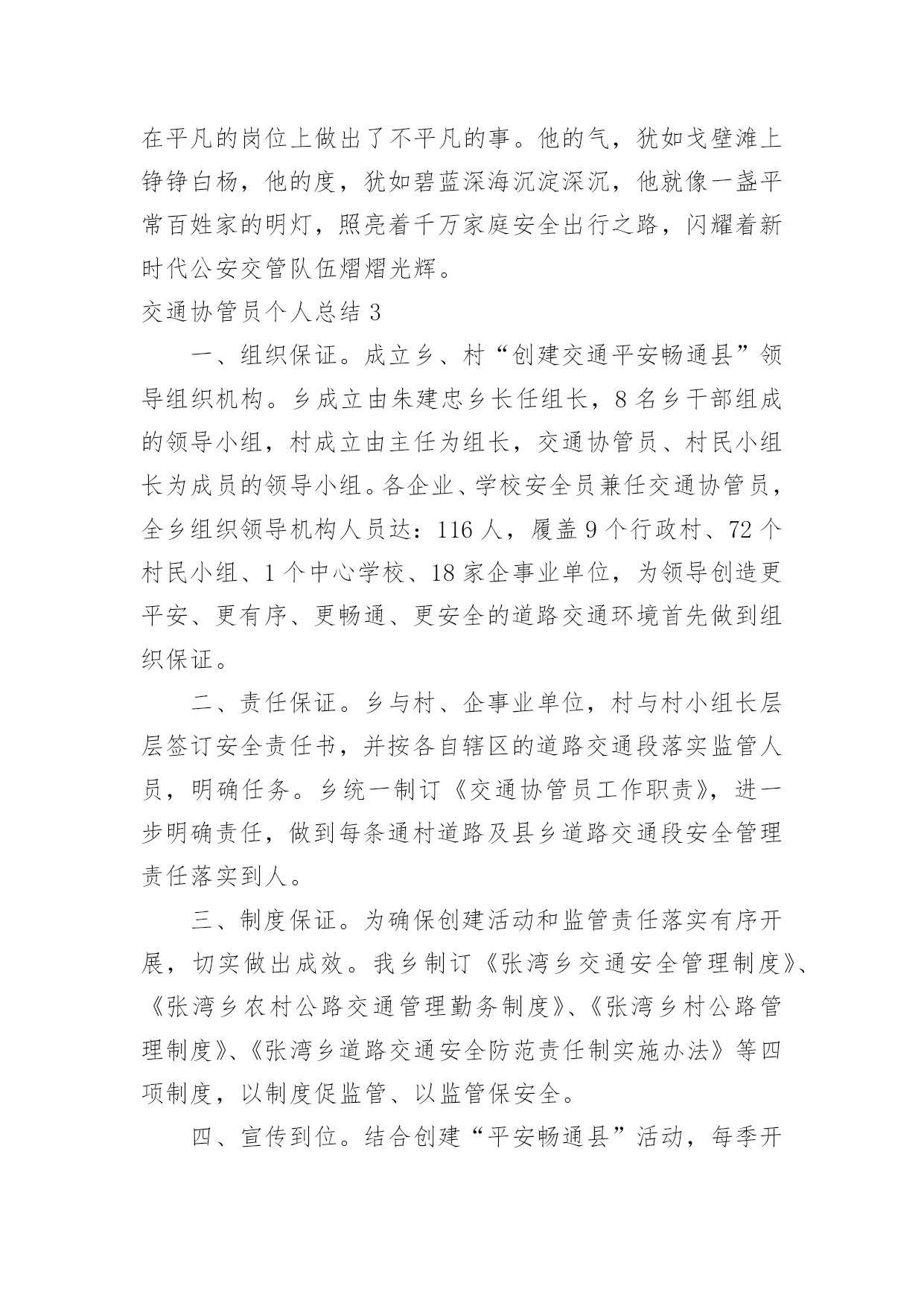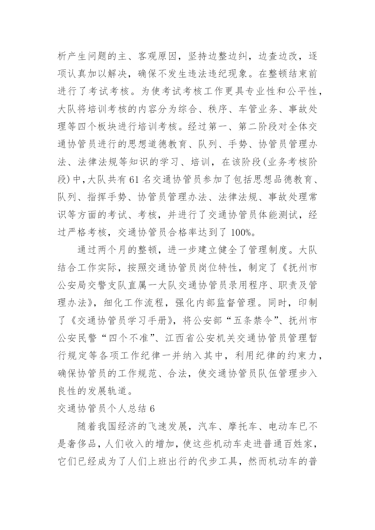 交通协管员个人总结交通协管员个人总结集合11篇总结是事后对某一时期、某一项目或某些工作进行回顾和分析,从而做出带有规律性的结论,它能使我们及时找出错误并改正,让我们抽出时间写写总结吧。那么总结有什么格式呢?以下是小编为大家整理的交通协管员个人总结,供大家参考借鉴,希望可以帮助到有需要的朋友。交通协管员个人总结1眨眼间,任职交通协管员工作已有半年。回首20xx年的工作历程,我经历了许多没有接触的事物和事情,也在实际的工作中,学习到了人与人之间的交流和沟通。这段时间里,在部门领导的带领下取得了一些成绩,具体工作汇报如下:一、工作表现(一)强化形象,提高自身素质。为做好交通协管员的工作,我坚持严格要求自己,注重以身作则,以诚待人,一是爱岗敬业讲奉献。我正确认识自身的工作和价值,正确处理苦与乐,得与失、个人利益和集体利益的关系,坚持甘于奉献、诚实敬业,二是锤炼自身讲提高。经过半年的学习和锻炼,我在岗位上能严格按照交通协管员的水平来衡量自己,遵守各项规章制度,履行好交通协管员的各项职责。细心学习他人长处,改掉自己不足,在不断工作和探索中使自己在工作水平上有所提高。(二)严于律已,不断加强作风建设。半年来我对自身严格要求,始终把耐得平淡、舍得付出、默默无闻作为自己的准则,始终把作风建设的重点放在严谨、细致、扎实、求实脚踏实地埋头苦干上。在工作中,以制度、纪律规范自己的一切言行,严格遵守机关各项规章制度,尊重领导,团结同志,谦虚谨慎,主动接受来自各方面的意见。(三)强化职能,做好服务工作。工作中,我注重把握根本,努力提高服务水平。维护道路交通秩序,劝阻交通安全违法行为;维护交通事故现场秩序,保护事故现场,抢救受伤人员;进行交通安全宣传教育;及时报告道路上的交通、治安情况和其他重要情况;接受群众求助,这是我们的职责。在众多路口的人行道边都有我们的身影,工作中,我们把服务放在第一位,例如:热情告知乘车方式或路线、答复自已所知道的地址,为路人解决难题等等,这就需要耐心、热心、关心,才能使得路人放心、安心。在这半年里,遇到各种各样的`事情,我都积极主动的解决,与同事团结协作,心往一处想,劲往一处使,不会计较干得多,干得少,只希望把工作圆满完成。二、工作中的不足与今后的努力方向半年来的工作虽然取得了一定的成绩,但也存在一些不足,主要是学习、服务上还不够,和有经验的同事比较还有一定差距,在今后工作中,我一定认真总结经验,克服不足,努力把自己交通协管员的岗位站得更好。为了我们的生命安全,为了街道交通的畅通。交通协管员虽然是一个普普通通的工作。在每个城市,都可以见到协管员的身影。在今后的工作中,我将发扬成绩,克服不足,努力工作,保持优点,改正缺点,以对工作、对事业高度负责的态度,脚踏实地,尽职尽责地做好各项工作,充分体现自己的人生价值,为社会美好的明天尽一份力。不辜负领导和同志们对我的期望。交通协管员个人总结2蒋维斌,男,28岁,汉族,中江县公安局交通警察大队二中队x警,打知事起他便立志走进警营。20xx年从陕西省汉中市武警部队退伍后,带着这样的美好憧憬,走进了中江县公安局交警大队二中队。对待工作一丝不苟、对待群众认真负责,谈起蒋维斌,大家都为他吃苦耐劳,爱岗敬业,一心为民所津津乐道。交警工作紧张繁琐、枯燥乏味,耐严寒、顶酷暑、冒风雪,而x警又是长期冲刺在第一线,一年365天,但凡有执勤任务,他总是提前到岗。交警执勤形象是城市形象的一个小缩影,从执勤的一姿一势,到服务的一言一行,蒋维斌都严格要求自己,无论严寒还是酷暑,蒋维斌同志都着装整齐,精神饱满的在自己的岗位上默默的为交通管理事业做贡献,为城市形象和公安队伍形象建设做贡献。作为一名基层交通管理者,和客车货车司机打交道时再正常不过的事情,有时候会听到有些违法违规司机不满x警的执法态度和方式而满口抱怨甚至大打出手,影响了公安交警部门在人民群众的形象。而蒋维斌同志身上,我们却从未听说有此类不和谐声音响起,对于本地交通违法的驾驶员,他总是晓之以理、动之以情。被他纠正过的驾驶员,从来没有一个跟他红过脸。他这个人,将工作也当成乐事,快乐、幽默、诙谐、宽容和大度是该同志的性格,他常常把一脸怒气,甚至准备大打出手的违章驾驶员逗笑,并不好意思地心甘情愿接受处罚。5年来,他协助纠正的道路违法行为不计其数,却从没有发生过一起群众投诉事件。蒋维斌像播撒种子一样播撒着希望、播撒着爱,渐渐地,该同志努力得到了群众的认可。20xx年7月什邡发生群xx事件,蒋维斌在一线执勤维稳时,把群众当作自己的亲人、自己的家人,耐心的为不明真相的群众解释相关政策,有部分寻衅闹事者故意针对其进行人身和武力攻击,但他始终坚持打不还手骂不还口,没有让这部分居心叵测的人得逞,反而真心打动了周围不明真相围观群众,在他的.劝说下,群众相继离开了聚集区。努力
